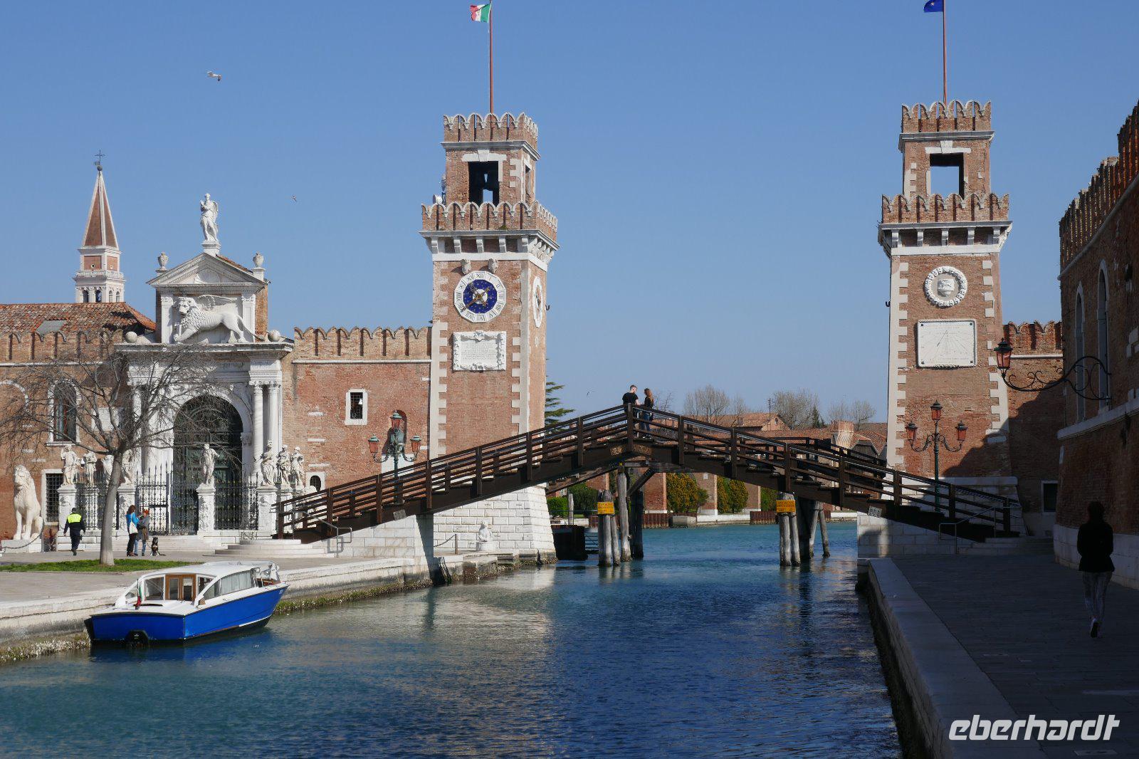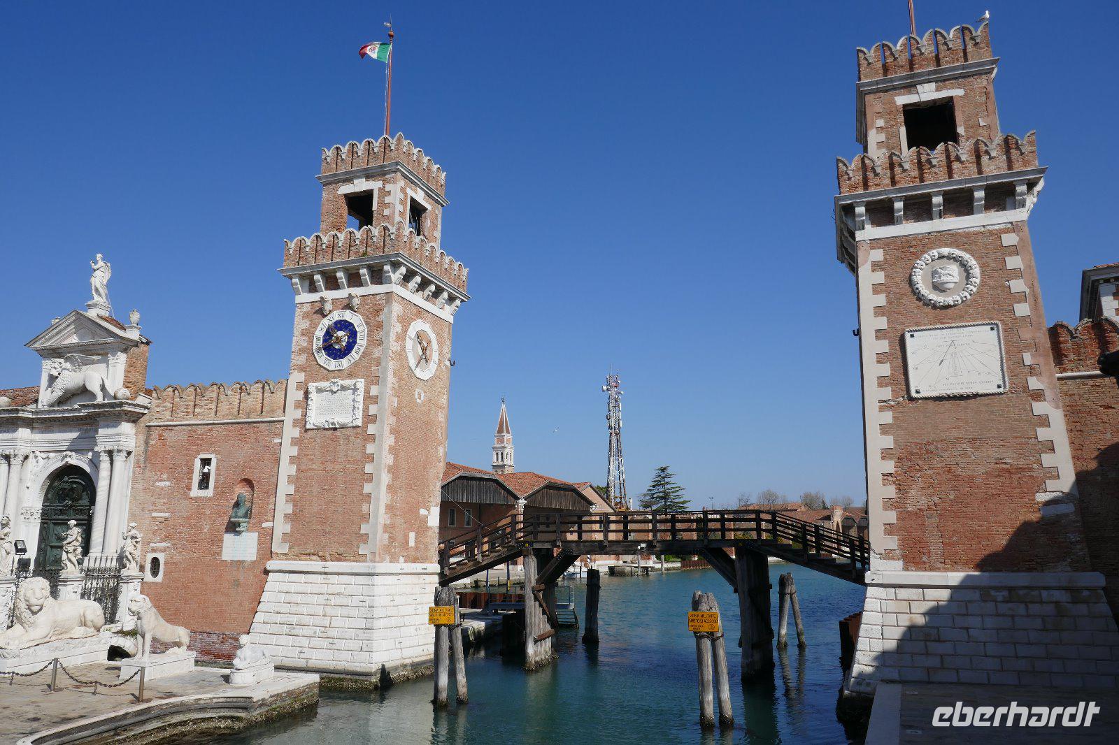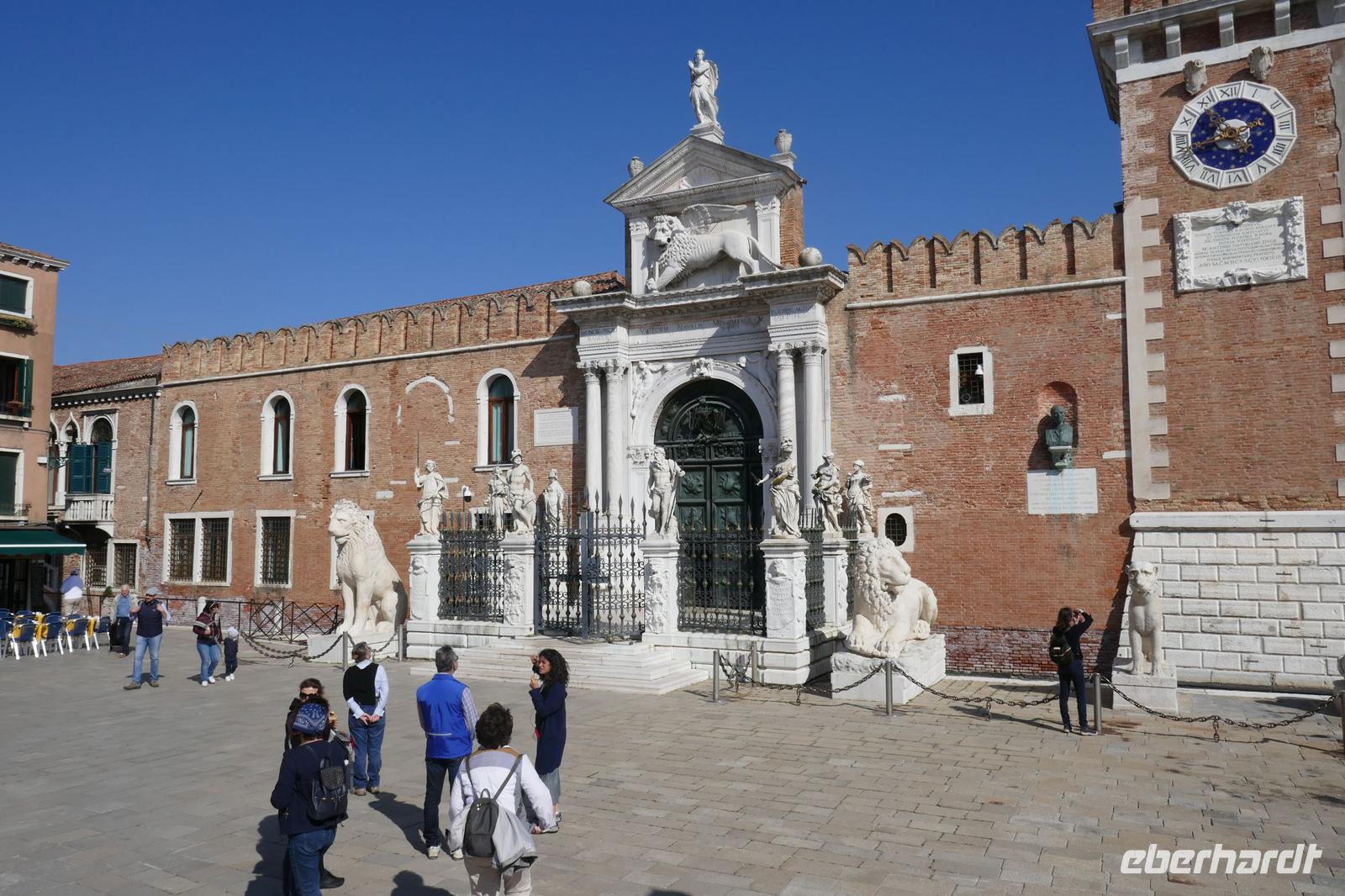 (...)"Heute früh war ich im Arsenal und mir interessant genug, da ich noch kein Seewesen kenne und also auch hier gleichsam die untere Schule besucht habe. Denn freilich sieht es hier sehr nach einer alten Familie aus, die sich noch rührt aber wo die Blüte und die beste Zeit der Früchte vorüber sind" (...). Heute ist es nur zur Biennale oder nach vorheriger Anmeldung zu besichtigen. Dennoch lohnte ein Blick durch das Renaissancetor. Der „Ingresso di Terra" wurde in seiner heutigen Form 1460 erbaut und angelegt. Der antike Triumphbogen wurde in vielfältigen Variationen bei Kirchenportalen u. Dogengräbern aufgenommen. Sichtbar droht in der Attika der venezianische Löwe als großes Relief. Vieles hatte die Seemacht Venedig von ihren Fahrten als Beute zurückgebracht. So auch die beiden Löwen am Eingang, die aus Griechenland stammten. Grandios auch die Kulisse vom Platz aus - Portal u. die zwei Wehrtürme, die zur Kontrolle der Schiffseinfahrt dienten - nachts wurde diese durch schwere, zwischen den Türmen gespannte Ketten gesichert.