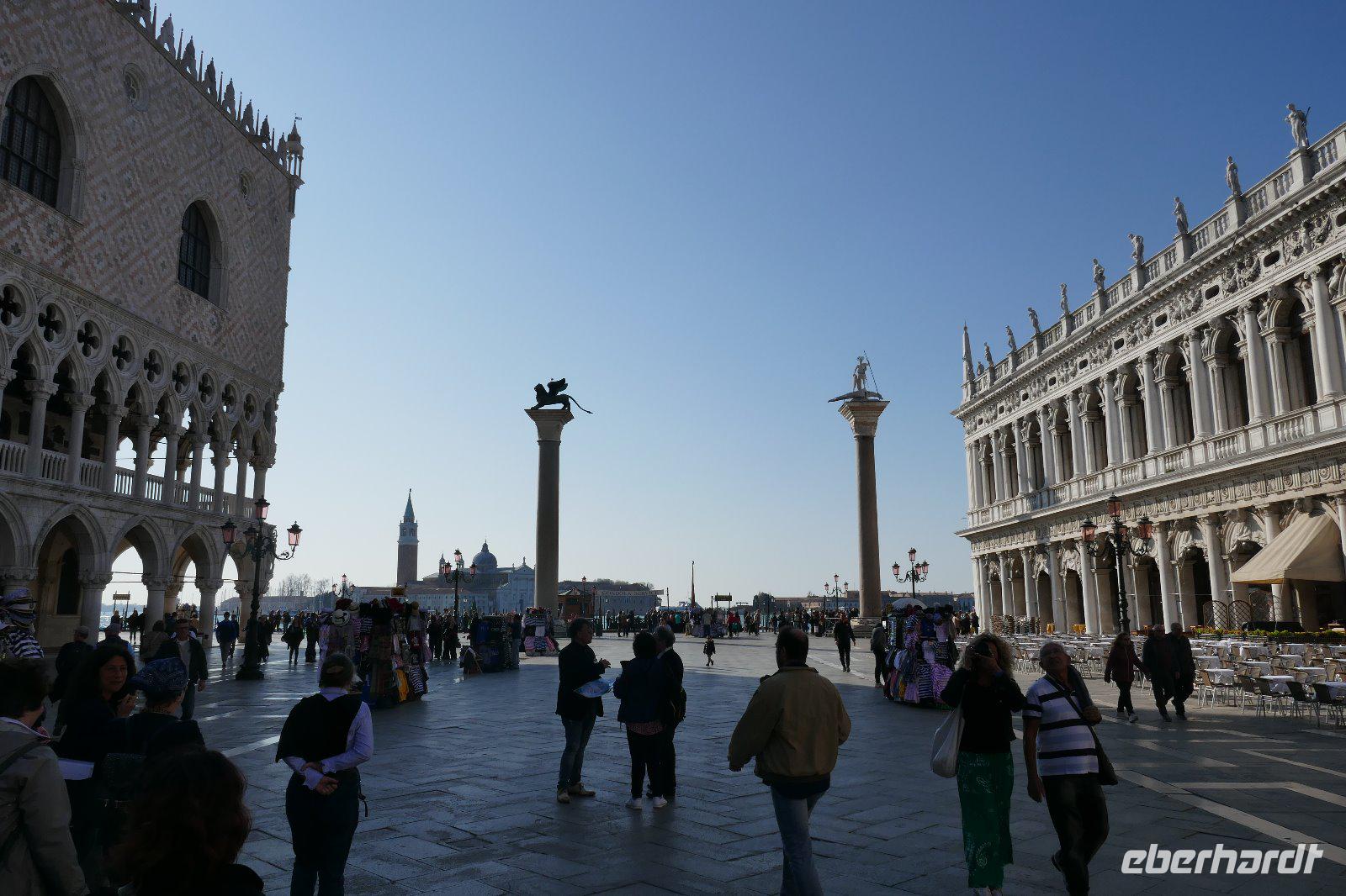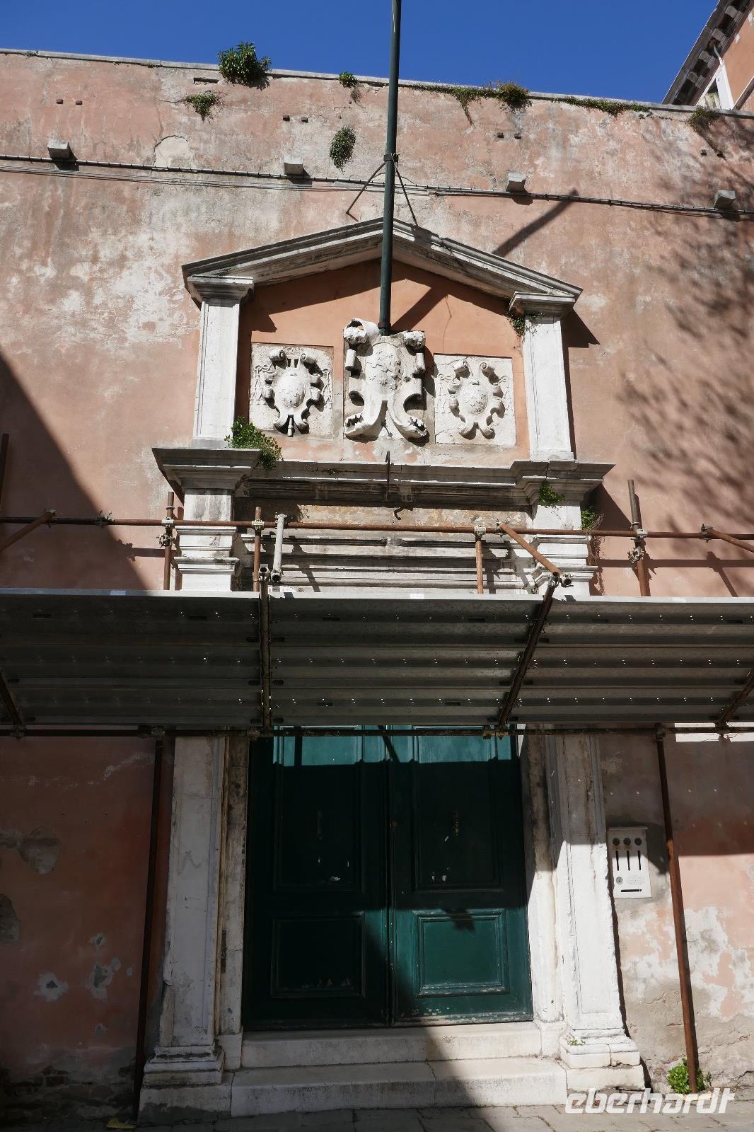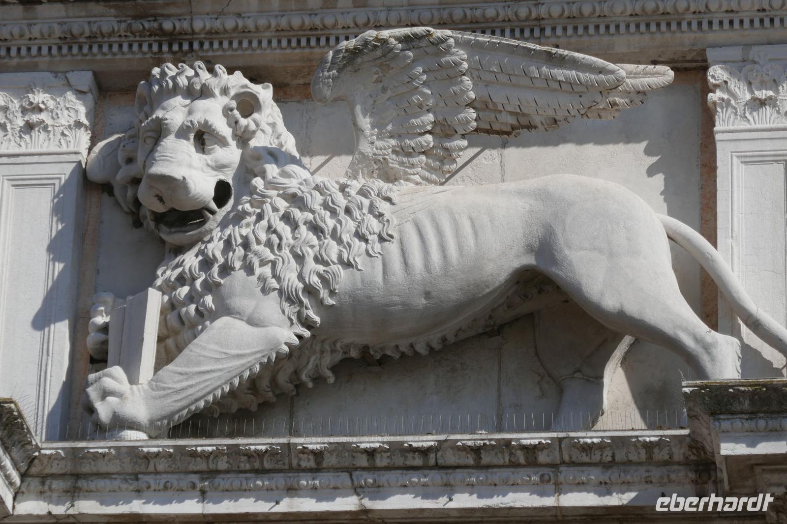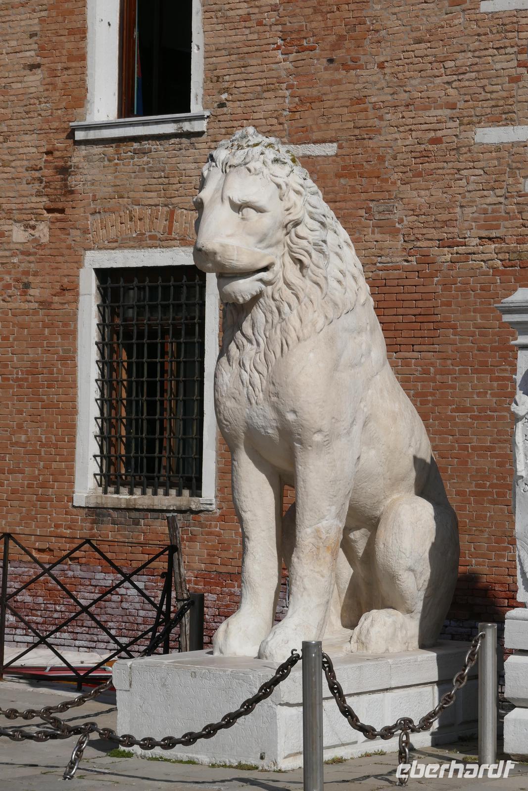 (...)"Heute früh war ich im Arsenal und mir interessant genug, da ich noch kein Seewesen kenne und also auch hier gleichsam die untere Schule besucht habe. Denn freilich sieht es hier sehr nach einer alten Familie aus, die sich noch rührt aber wo die Blüte und die beste Zeit der Früchte vorüber sind" (...). Heute ist es nur zur Biennale oder nach vorheriger Anmeldung zu besichtigen. Dennoch lohnte ein Blick durch das Renaissancetor. Der „Ingresso di Terra" wurde in seiner heutigen Form 1460 erbaut und angelegt. Der antike Triumphbogen wurde in vielfältigen Variationen bei Kirchenportalen u. Dogengräbern aufgenommen. Sichtbar droht in der Attika der venezianische Löwe als großes Relief. Vieles hatte die Seemacht Venedig von ihren Fahrten als Beute zurückgebracht. So auch die beiden Löwen am Eingang, die aus Griechenland stammten. Grandios auch die Kulisse vom Platz aus - Portal u. die zwei Wehrtürme, die zur Kontrolle der Schiffseinfahrt dienten - nachts wurde diese durch schwere, zwischen den Türmen gespannte Ketten gesichert.
