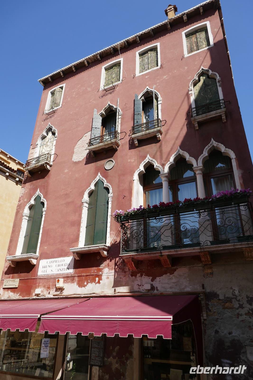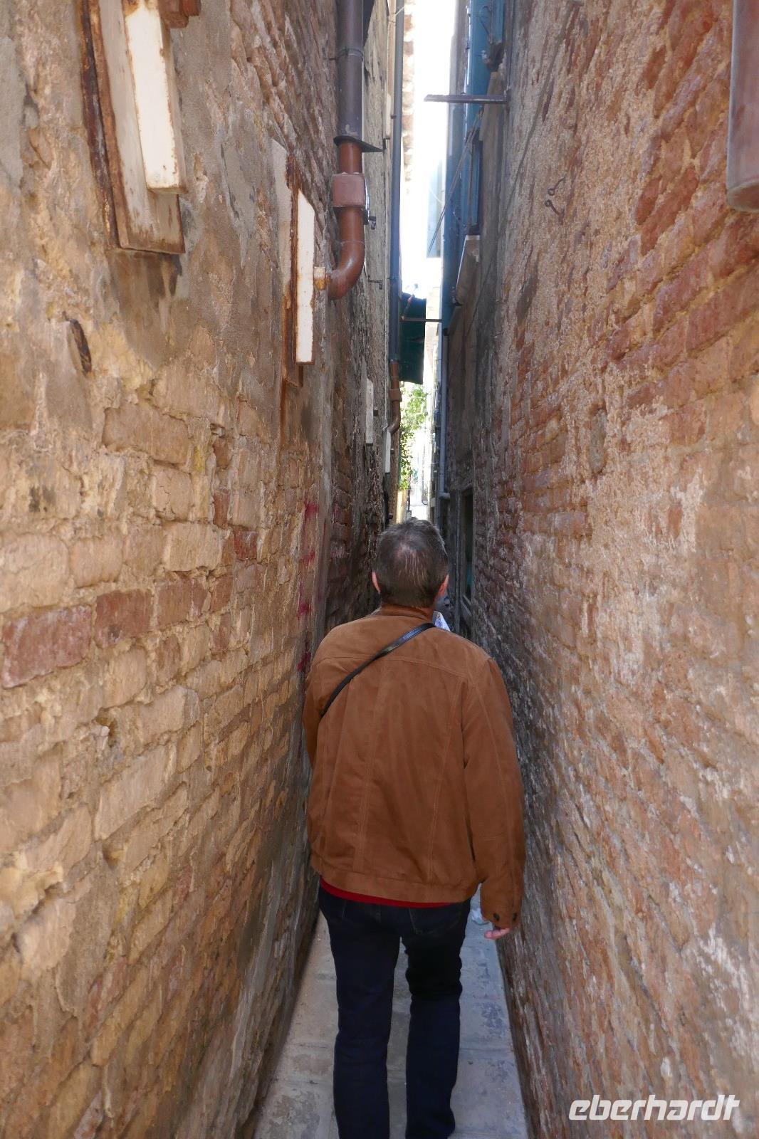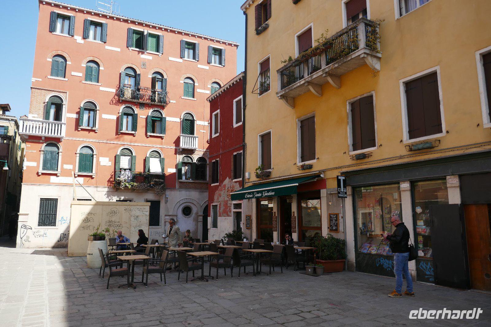 Mittag - Einkehrpause nicht nur für die Touristen. Theken mit unzähligen Leckereien - von belegten Paninis bis zum typischen Tramezzini. Das Brot kunstvoll geschnitten ist nur Halt für die zahlreichen Füllungen. Die obere Scheibe leicht gewölbt: so sieht das kulinarische Kunstwerk fast aus wie eine venezianische Brücke. Gekochter Schinken, angeschmorte Pilze, geschmorter Radicchio in Zwiebelsoße oder die dünnen Spanferkelscheiben - die Auswahl ist fast grenzenlos. Jeder hatte das richtige für sich entdeckt und so war man fit für den zweiten Teil des heutigen Tages, der uns nach Cannaregio führte. Der Stadtteil ist Wohnstätte alteingesessener Venezianer und besticht mit dem Charme verwitterter Paläste. Zunächst entlang der Fondamente Nove zum Campo dei Mori. Dieser schöne Platz ist nach den Skulpturen dreier Mohren benannt, die angrenzende Häuserwände schmücken. Auf diesem häufig überfluteten Platz befindet sich das Geburtshaus des Künstlers Tintoretto, dessen Werke zahlreich in Venedig zu bewundern sind. Wir sind nun im ehemaligen Judenviertel der Stadt. Getto hieß die Gießerei auf venezianisch, die hier einst arbeitete und die Juden, die hierher im 16. Jahrhundert verbannt wurden, nannten ihren Wohnbezirk deshalb Ghetto - das erste der Welt - und viele weitere folgen über die Jahrhunderte. Heute leben nur wenige Juden hier. Doch hinter den gelben und roten schlicht verputzten Fassaden findet man noch jüdische Bäcker, Lebensmittelgeschäften, Buchhandlungen, Museum und die Synagogen. Die Juden der cassidischen Bewegung am Campo des Ghetto Novo gehen offensiv mit ihrer Religion um und bringen etwas Leben in das Viertel. Ansonsten ist es still, obwohl sich immer mehr Touristen hierher verirren. Man sah Namen wie „Gamm Gamm" oder „Auberginen Ghetto Style" beim Schlendern entlang des Weges. Dieser unscheinbare Norden wartet mit einer Überraschung auf. Madonna dell'Orto - schon die Fassade ist ein Juwel für sich und ist ein gutes Beispiel gotischer Kirchenfassaden der Stadt. Die Ausstattung der Kirche erwies sich als ein Schatzhaus venezianischer Malerei mit einer Reihe von großformatigen Tintoretto-Bildern, die der Kirche vom Meister höchstpersönlich als Geschenk gemacht wurden. Der Kunstraub eines Madonnenbildnis von Giovanni Bellini von 1992 spielt sogar im Roman „Trügerisches Licht der Nacht" von Juan Manuel de Prada eine wichtige Rolle. Dies tröstet dennoch nicht über den Verlust eines unschätzbaren Werkes nicht hinweg!