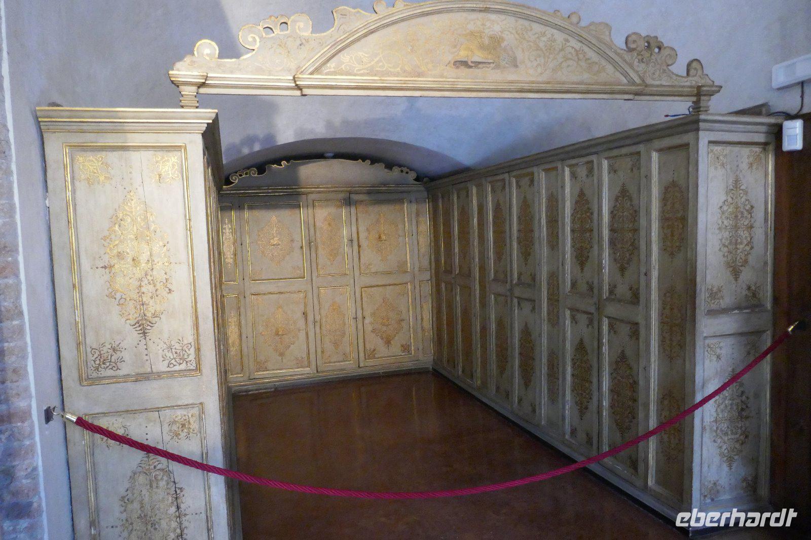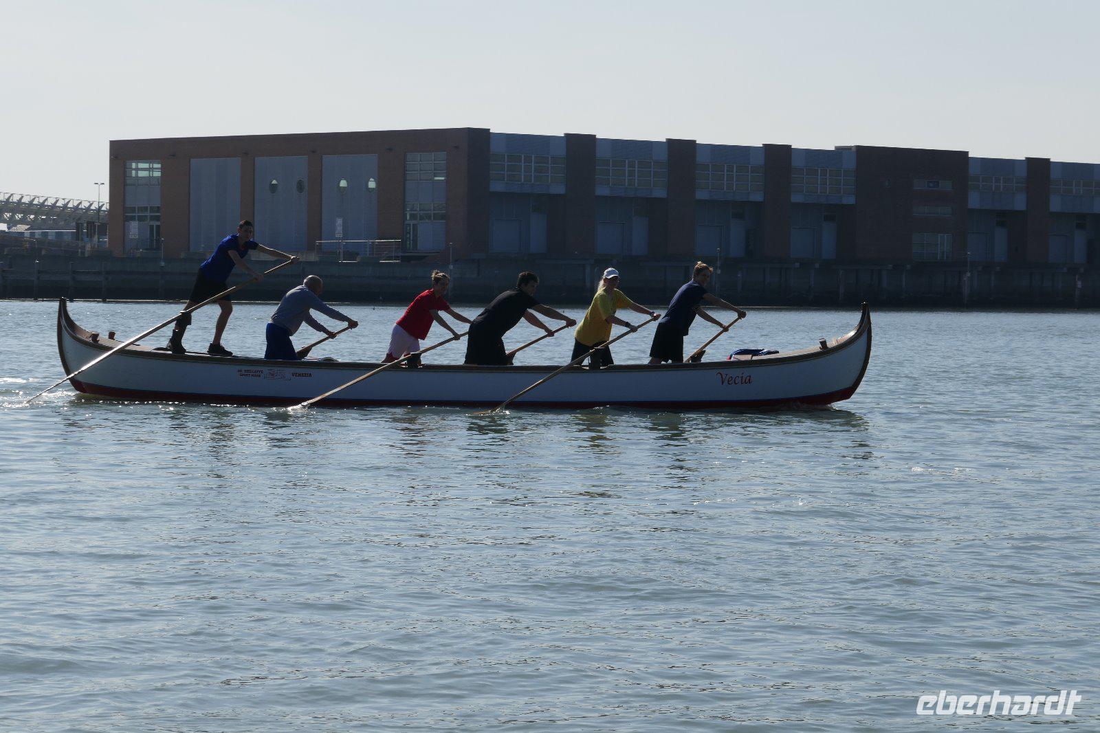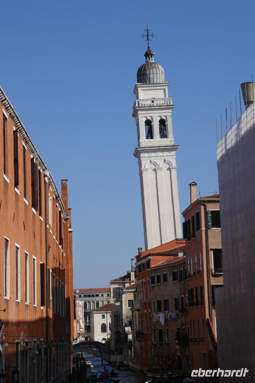Mittag - Einkehrpause nicht nur für die Touristen. Theken mit unzähligen Leckereien - von belegten Paninis bis zum typischen Tramezzini. Das Brot kunstvoll geschnitten ist nur Halt für die zahlreichen Füllungen. Die obere Scheibe leicht gewölbt: so sieht das kulinarische Kunstwerk fast aus wie eine venezianische Brücke. Gekochter Schinken, angeschmorte Pilze, geschmorter Radicchio in Zwiebelsoße oder die dünnen Spanferkelscheiben - die Auswahl ist fast grenzenlos. Jeder hatte das richtige für sich entdeckt und so war man fit für den zweiten Teil des heutigen Tages, der uns nach Cannaregio führte. Der Stadtteil ist Wohnstätte alteingesessener Venezianer und besticht mit dem Charme verwitterter Paläste. Zunächst entlang der Fondamente Nove zum Campo dei Mori. Dieser schöne Platz ist nach den Skulpturen dreier Mohren benannt, die angrenzende Häuserwände schmücken. Auf diesem häufig überfluteten Platz befindet sich das Geburtshaus des Künstlers Tintoretto, dessen Werke zahlreich in Venedig zu bewundern sind. Wir sind nun im ehemaligen Judenviertel der Stadt. Getto hieß die Gießerei auf venezianisch, die hier einst arbeitete und die Juden, die hierher im 16. Jahrhundert verbannt wurden, nannten ihren Wohnbezirk deshalb Ghetto - das erste der Welt - und viele weitere folgen über die Jahrhunderte. Heute leben nur wenige Juden hier. Doch hinter den gelben und roten schlicht verputzten Fassaden findet man noch jüdische Bäcker, Lebensmittelgeschäften, Buchhandlungen, Museum und die Synagogen. Die Juden der cassidischen Bewegung am Campo des Ghetto Novo gehen offensiv mit ihrer Religion um und bringen etwas Leben in das Viertel. Ansonsten ist es still, obwohl sich immer mehr Touristen hierher verirren. Man sah Namen wie „Gamm Gamm" oder „Auberginen Ghetto Style" beim Schlendern entlang des Weges. Dieser unscheinbare Norden wartet mit einer Überraschung auf. Madonna dell'Orto - schon die Fassade ist ein Juwel für sich und ist ein gutes Beispiel gotischer Kirchenfassaden der Stadt. Die Ausstattung der Kirche erwies sich als ein Schatzhaus venezianischer Malerei mit einer Reihe von großformatigen Tintoretto-Bildern, die der Kirche vom Meister höchstpersönlich als Geschenk gemacht wurden. Der Kunstraub eines Madonnenbildnis von Giovanni Bellini von 1992 spielt sogar im Roman „Trügerisches Licht der Nacht" von Juan Manuel de Prada eine wichtige Rolle. Dies tröstet dennoch nicht über den Verlust eines unschätzbaren Werkes nicht hinweg!