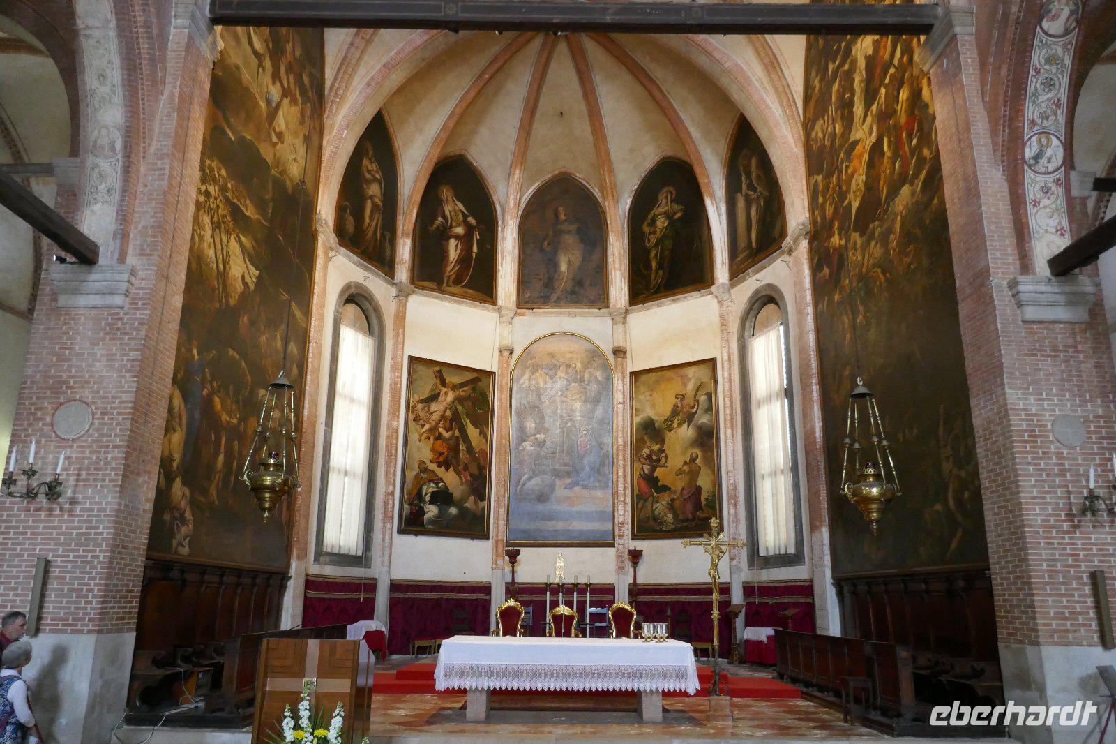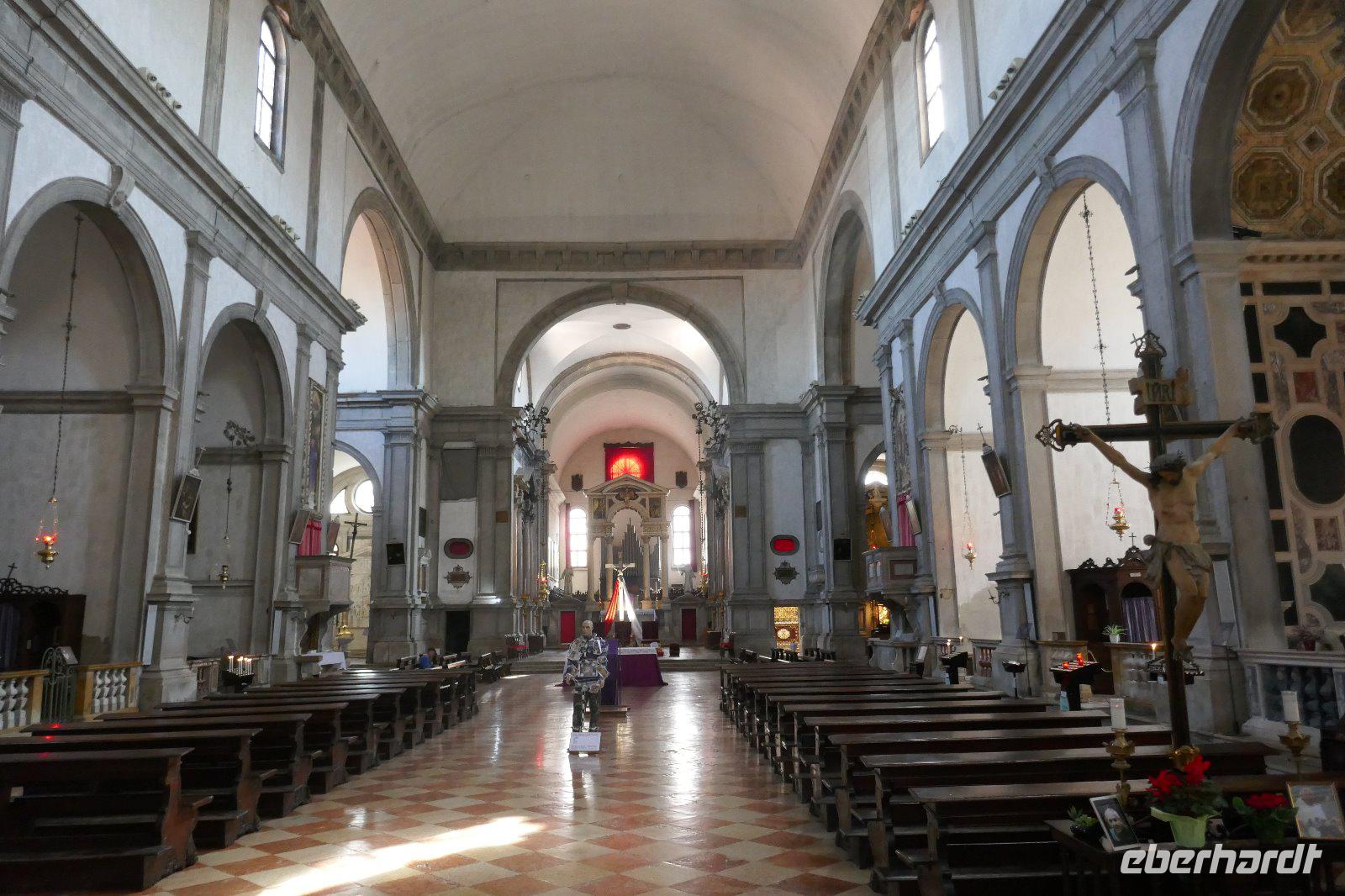Unbeschreiblich schön, wie sich die Kanäle von Castello an üppig grünen Parks und Kirchen vorbeischlängeln. Über die Wasserstraßen des Viertels sind manchmal Wäscheleinen gespannt, auf denen die Wäsche der Bewohner in der Sonne trocknen - und dieser Anblick trägt zudem zum Zauber von Castello bei. Zwischen Bootsrampen und winzigen Geschäften oft an verspielten Plätzen versorgen sich hier die Einheimischen noch mit dem Bedarf des täglichen Lebens. Verstummt ist die Hektik des nahegelegen Markusplatzes. So gelangen wir zum größten Sakralbau Venedigs der Dominikanerklosterkirche SS. Giovanni e Paolo mit seinen umliegenden Bauten u.a. der Scuola Grande die S. Marco sowie dem Ospidale Civile. Trotz einer Länge von über 101 Meter ist das Äußere dennoch ein steingewordenes Abbild des dominikanischen Armutsideals - die schlichte Fassade verzichtet auf jede Form plastischen Dekors. Dennoch diente sie dem Konkurrenzkampf der am anderen Ufer des Canale Grande liegenden Frari-Kirche, die zum Bettelorden der Franziskaner gehört. Innen ist sie deutlich der Gotik verbunden - dennoch sind auch Elemente der Renaissance erkennbar.
