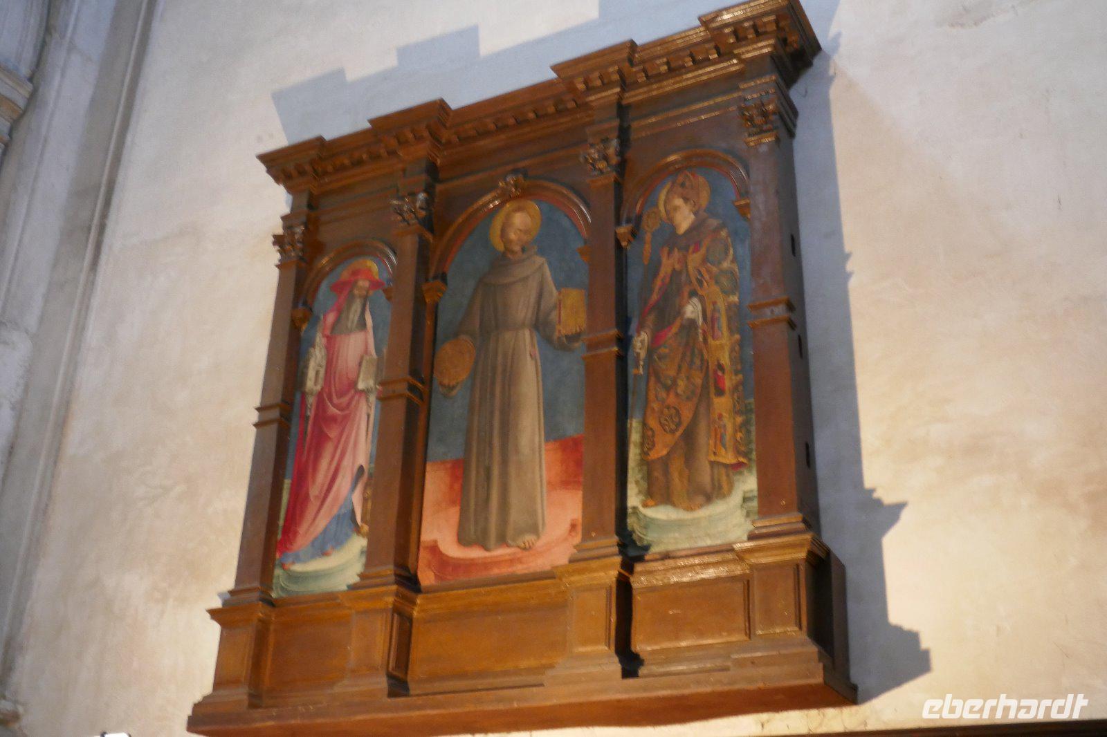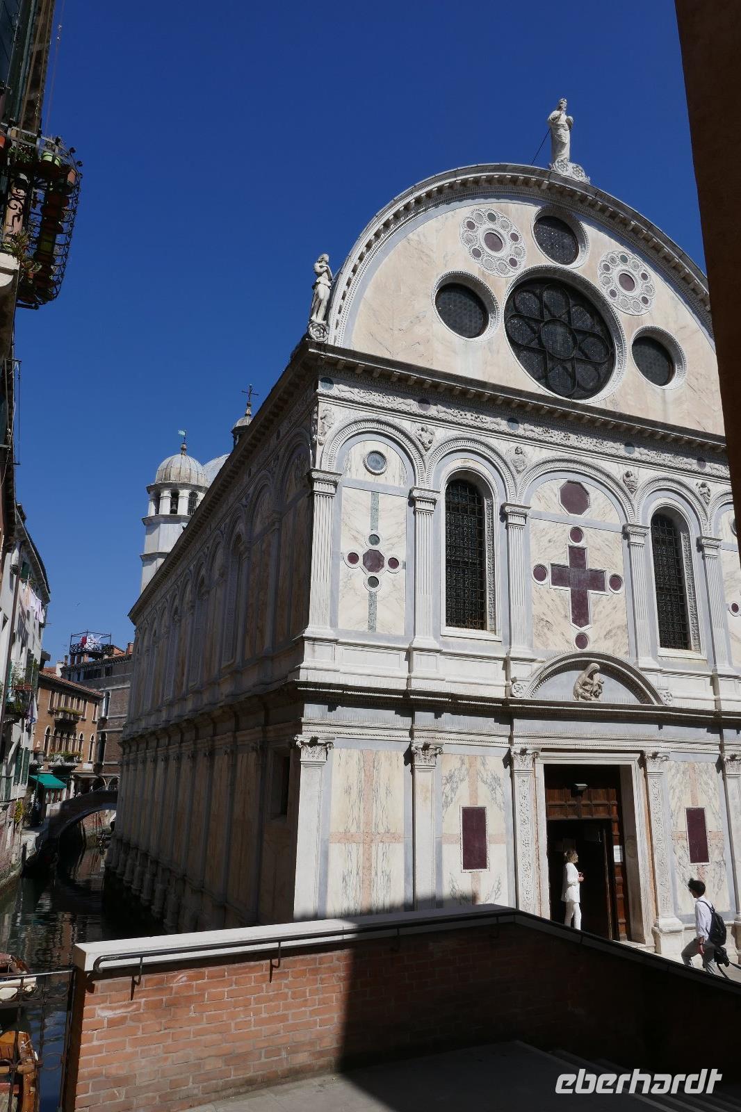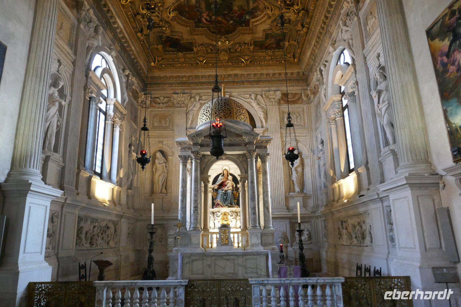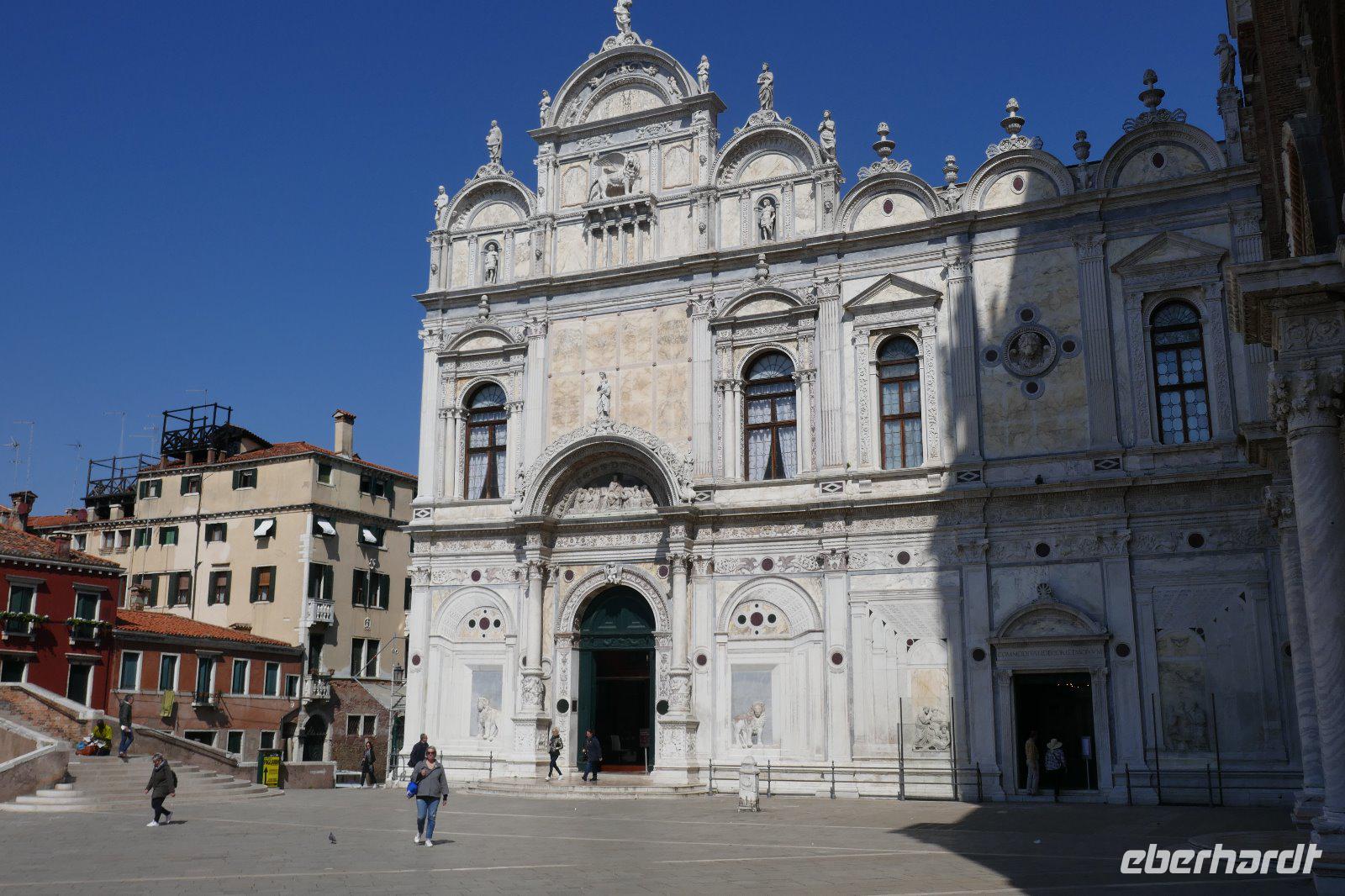 Gleich nebenan besticht die Fassade der Scuola Grande di S. Marco, die u. a. neben der Miarcoli-Kirche zu den frühesten Äußerungen der Renaissance in der Lagunenstadt gehört. Auf unserem Spaziergang kamen wir auch zur zweiten Franziskanerkirche in Venedig. Errichtet wurde sie im späten 14. Jahrhundert. Ihre heutige Gestalt erhielt das Gebäude im 16. Jahrhundert. Keinem Anderen als Palladio gelang einem schwierigen Raumkonzept (einschiffig mit angrenzenden Kapellen) eine ausgewogene Renaissancefassade zu verleihen. Dies und die bemerkenswerte Ausstattung rechtfertigten diesen Besuch. San Francesco della Vigna ist schon durch den gut sichtbaren Campanile erkennbar. Der Turm gleicht dem von San Giorgio Maggiore auf der gleichnamigen Insel - seine Spitze hat Ähnlichkeit mit dem Campanile am Markusplatz. Das Kloster besitzt zwei Innenhöfe, die jeweils mit Kreuzgängen ausgestattet sind. Der erste Innenhof ist am Boden mit Platten bedeckt. In der Mitte dieses Hofes befindet sich ein Brunnen. Der andere, weitaus prächtigere ist ein kleines Paradies. Hier fanden wir einen gepflegten Klostergarten mit mehreren Säulenzypressen, Blumenbeeten und Grasflächen. Im Zentrum die Skulptur des heiligen Franziskus. Nun weiter, denn es gibt noch einiges zu entdecken!