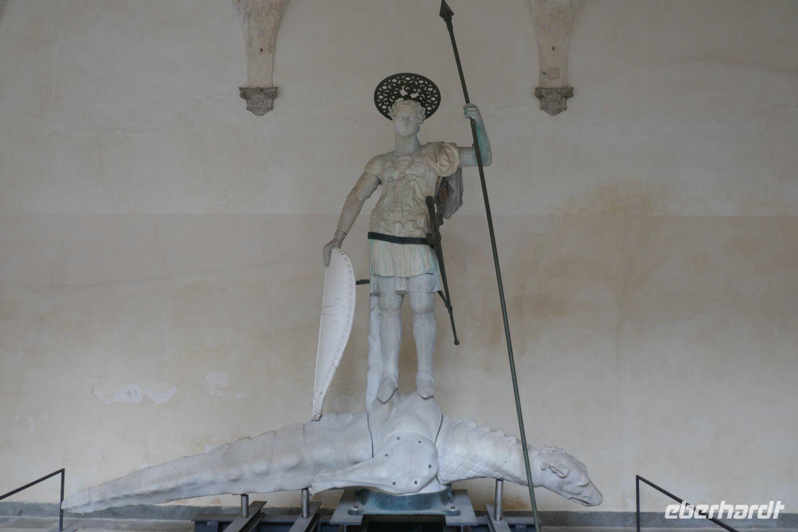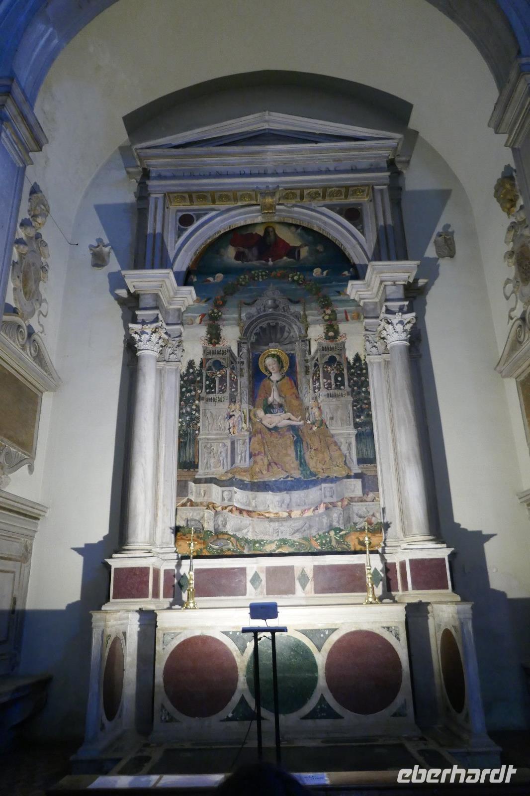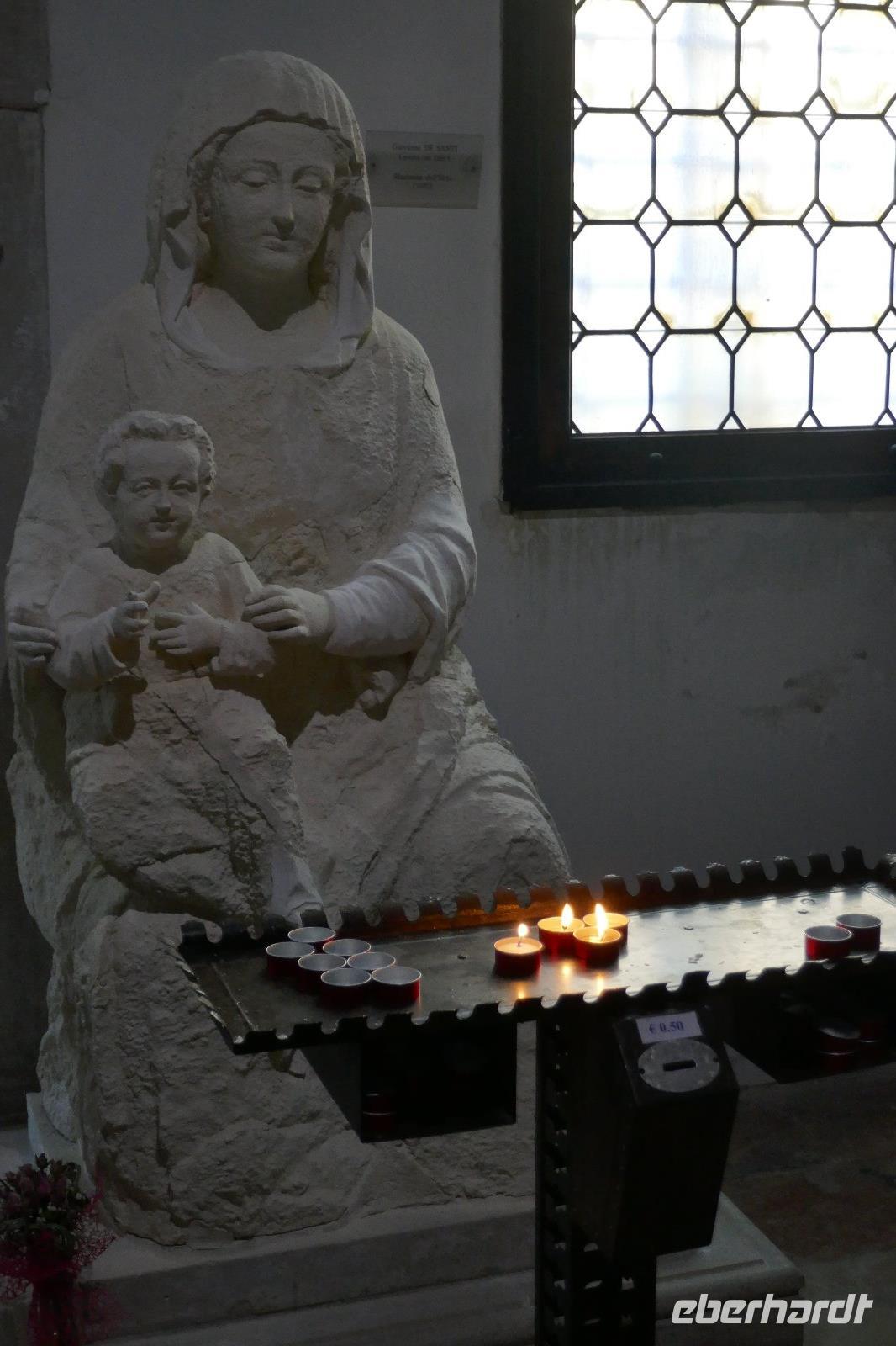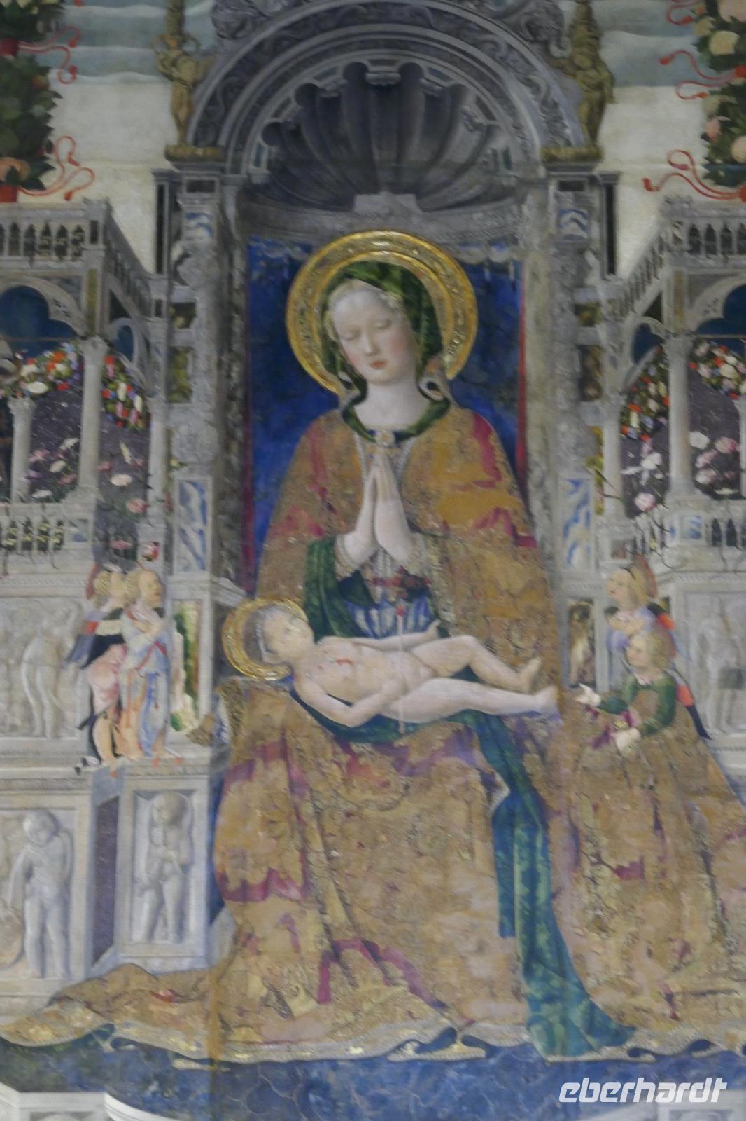 Gleich nebenan besticht die Fassade der Scuola Grande di S. Marco, die u. a. neben der Miarcoli-Kirche zu den frühesten Äußerungen der Renaissance in der Lagunenstadt gehört. Auf unserem Spaziergang kamen wir auch zur zweiten Franziskanerkirche in Venedig. Errichtet wurde sie im späten 14. Jahrhundert. Ihre heutige Gestalt erhielt das Gebäude im 16. Jahrhundert. Keinem Anderen als Palladio gelang einem schwierigen Raumkonzept (einschiffig mit angrenzenden Kapellen) eine ausgewogene Renaissancefassade zu verleihen. Dies und die bemerkenswerte Ausstattung rechtfertigten diesen Besuch. San Francesco della Vigna ist schon durch den gut sichtbaren Campanile erkennbar. Der Turm gleicht dem von San Giorgio Maggiore auf der gleichnamigen Insel - seine Spitze hat Ähnlichkeit mit dem Campanile am Markusplatz. Das Kloster besitzt zwei Innenhöfe, die jeweils mit Kreuzgängen ausgestattet sind. Der erste Innenhof ist am Boden mit Platten bedeckt. In der Mitte dieses Hofes befindet sich ein Brunnen. Der andere, weitaus prächtigere ist ein kleines Paradies. Hier fanden wir einen gepflegten Klostergarten mit mehreren Säulenzypressen, Blumenbeeten und Grasflächen. Im Zentrum die Skulptur des heiligen Franziskus. Nun weiter, denn es gibt noch einiges zu entdecken!
