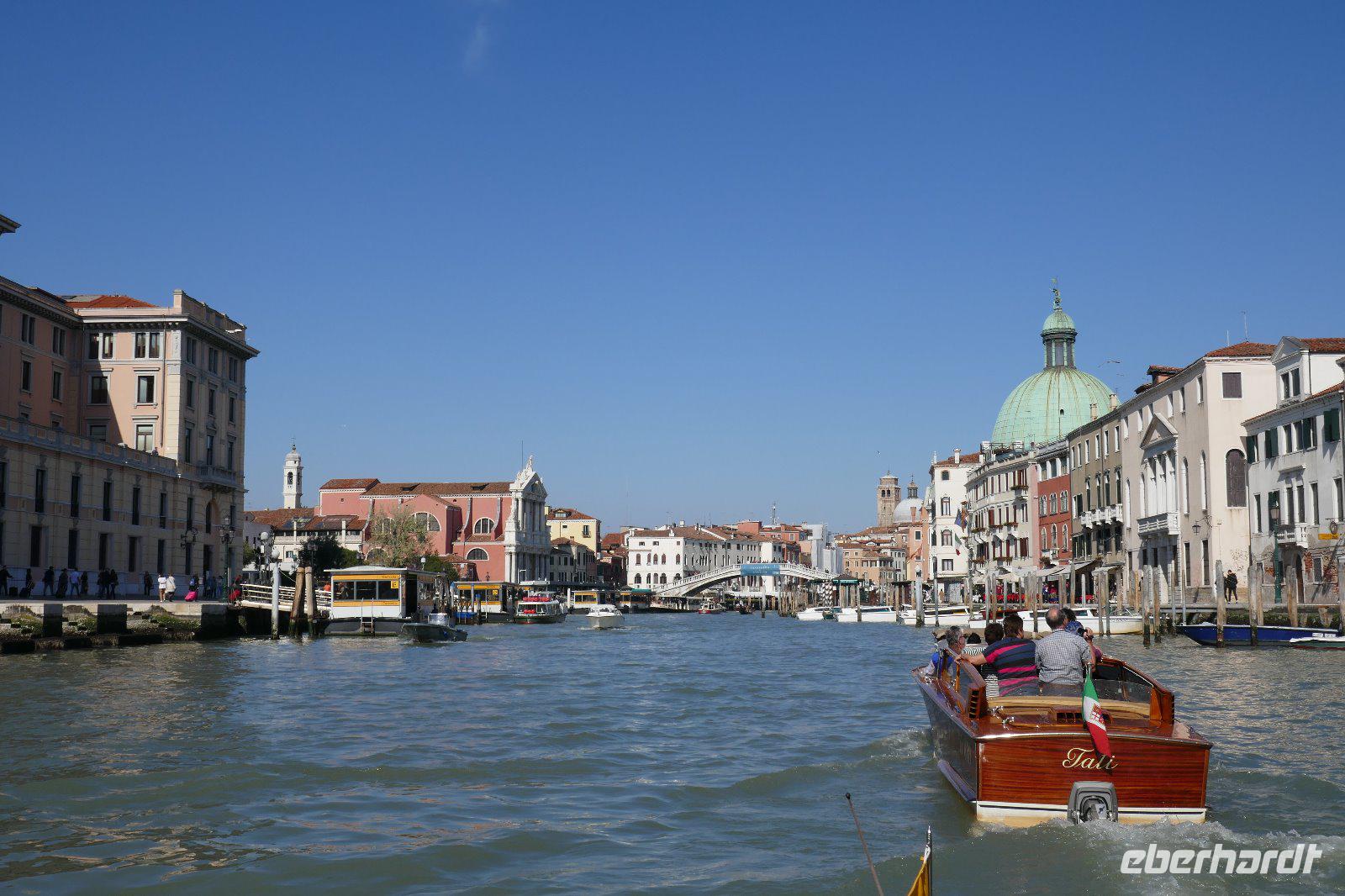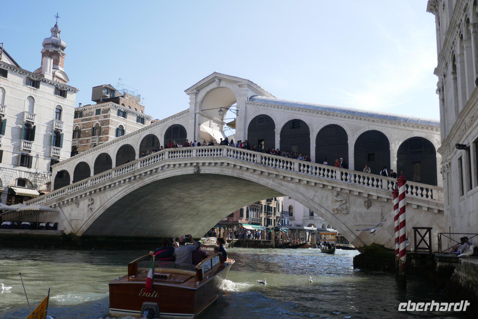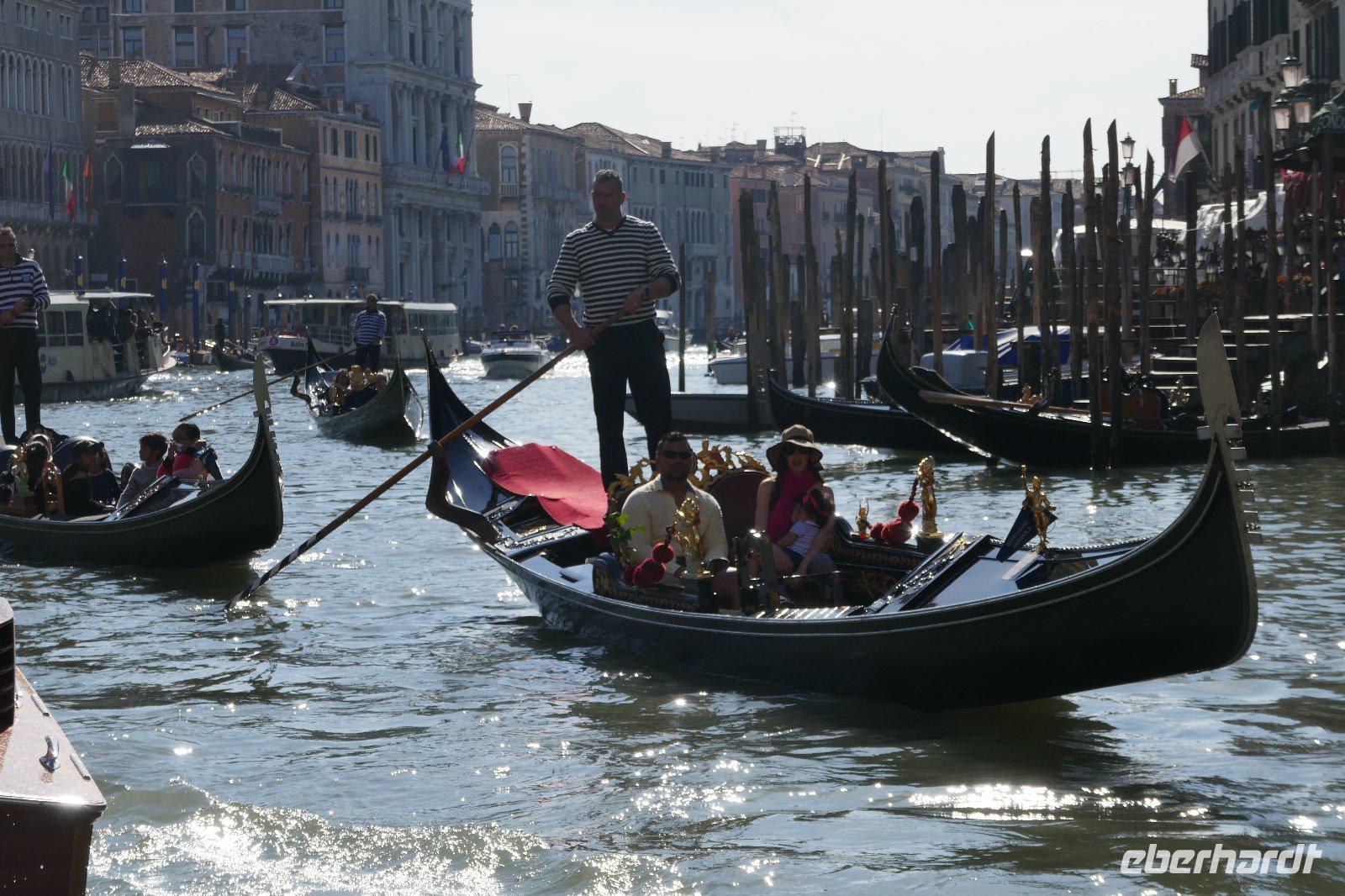 In Gondeln, heute eher ein touristisches Requisit, steigen die Venezianer nur noch ein, wenn sie Gäste oder Freunde begleiten. Zudem wollen sie nicht erkannt werden. Peinlich wird es nur, wenn dazu noch „O sole mio" getrillert wird, das hier fehl am Platze ist, denn es kommt ja aus Neapel. So tuen wir es den Einheimischen gleich und benutzen die übrigen zulässigen Verkehrsmittel - Vaporetto oder Boottaxi. Heute wollen wir es bequem haben und entscheiden uns für das Boottaxi. Es ging vorbei am Casino, einst Wohnsitz von Richard Wagner und unzähligen Palazzi zurück zum Markusplatz. Natürlich durfte die Durchfahrt durch die bekannteste Brücke am Canale Grande der Rialtobrücke nicht fehlen. Bis zum Abendessen blieb noch Zeit für eigene Erkundungen - heimlich stieg vielleicht doch noch einer in die Gondel o der auf den Campenille um einen traumhaften Sonnenuntergang zu erleben? Heute Abende in einer typischen Trattoria ließen wir den Tag ausklingen