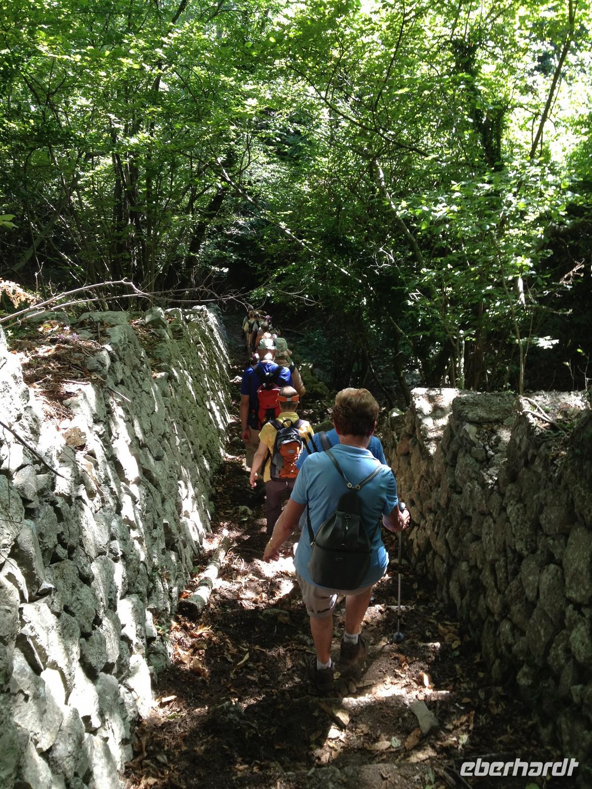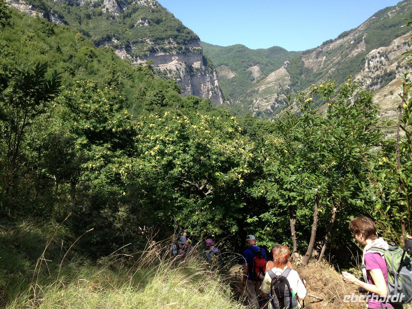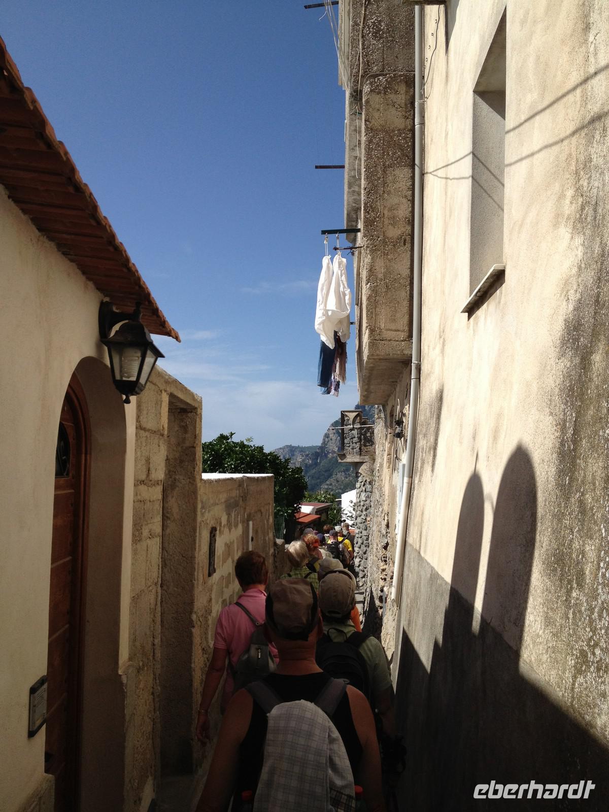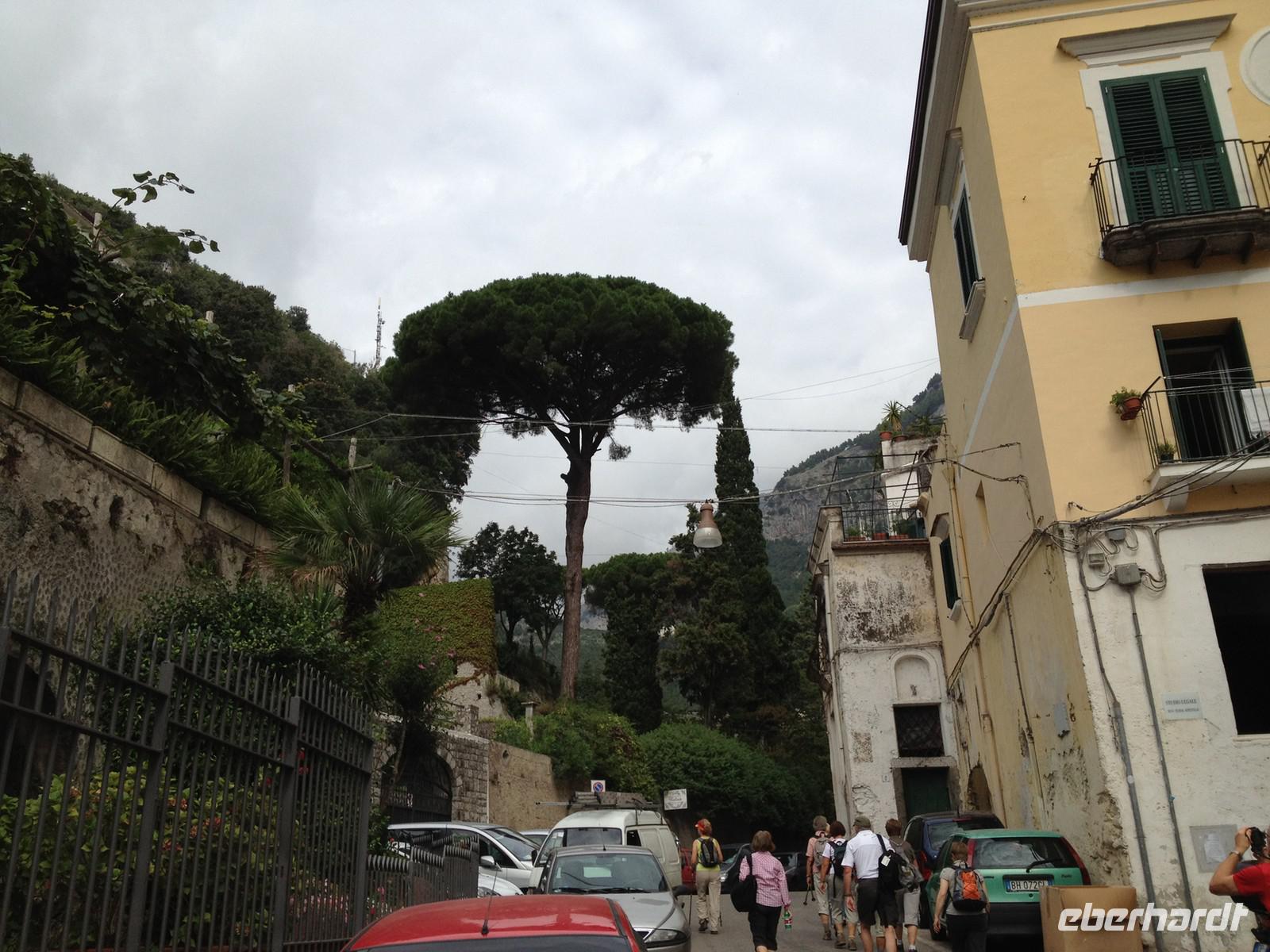 Kaum zu glaube, dass das winzige, malerische Amalfi einst das Zentrum einer alten und mächtigen Mittelmeerrepublik Italiens war. Im 9. Jahrhundert dominierte dieser kleine Hafen den Handel mit dem Orient, was den maurischen Einfluss auf den Dom Sant'Andrea erklärt. Zunächst schlenderten wir durch das Gewirr der Gässchen bis zum Dom. Anschließend verließen wir die von Touristen überfüllte Stadt und wanderten gemütlich in das Hinterland. Die Touristen wurden weniger, wir waren bald ganz allein. Im Schatten spendenden Wald des wild-romantischen Mühlentals wanderten wir vorbei an alten Papiermühlen. Jetzt waren wir in der freien Natur. Das kleine Flüsschen Canneto zeigte sich in seiner vollen Pracht und ein Wasserfall folgte dem anderen. Der Weg führte uns hoch zum Dorf Pontone, in dem wir die kleine Mittagspause einlegten. Über Minuta erreichten wir die Ortschaft Scala, die in einer Höhe von 360 Metern direkt gegenüber von Ravello liegt. Die Blütezeit des Ortes war im Mittelalter, als es noch ein Teil der mächtigen Seerepublik von Amalfi war. Aus Scala stammt Fra Gerardo Sasso, der um 1100 in Jerusalem den Johanniterorden zur Pflege kranker Kreuzfahrer und Reisender gründete. Aus ihm ging später der souveräne Malteserorden hervor. Auf dem kleinen Hauptplatz rasteten wir und unser Hotelier Stefano lies als kleine Entschädigung für die misslungenen Lunchpakete eine Runde selbstgebackenen Apfelkuchen springen.