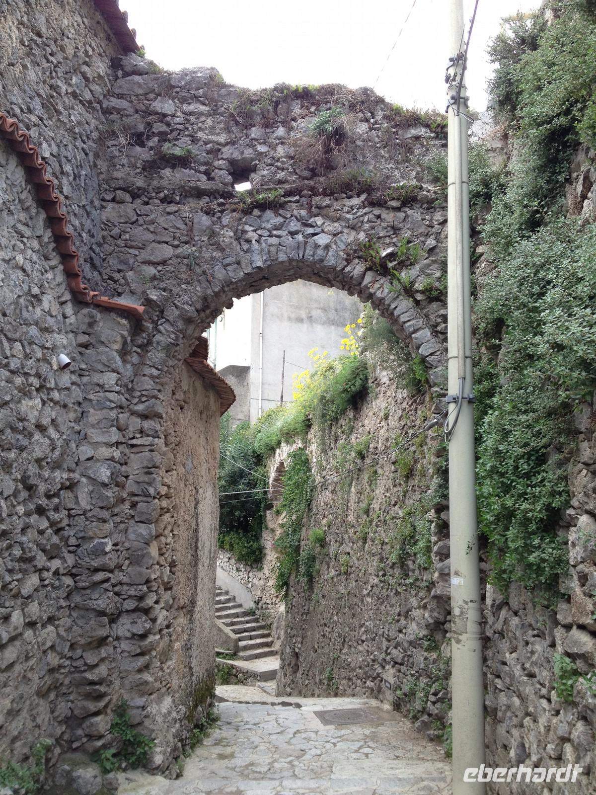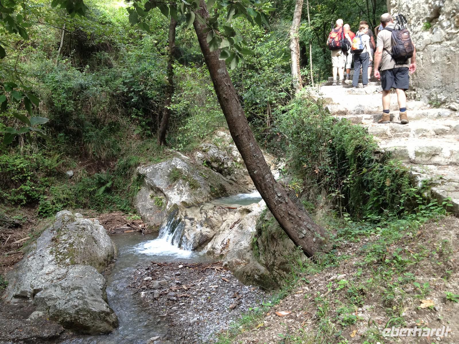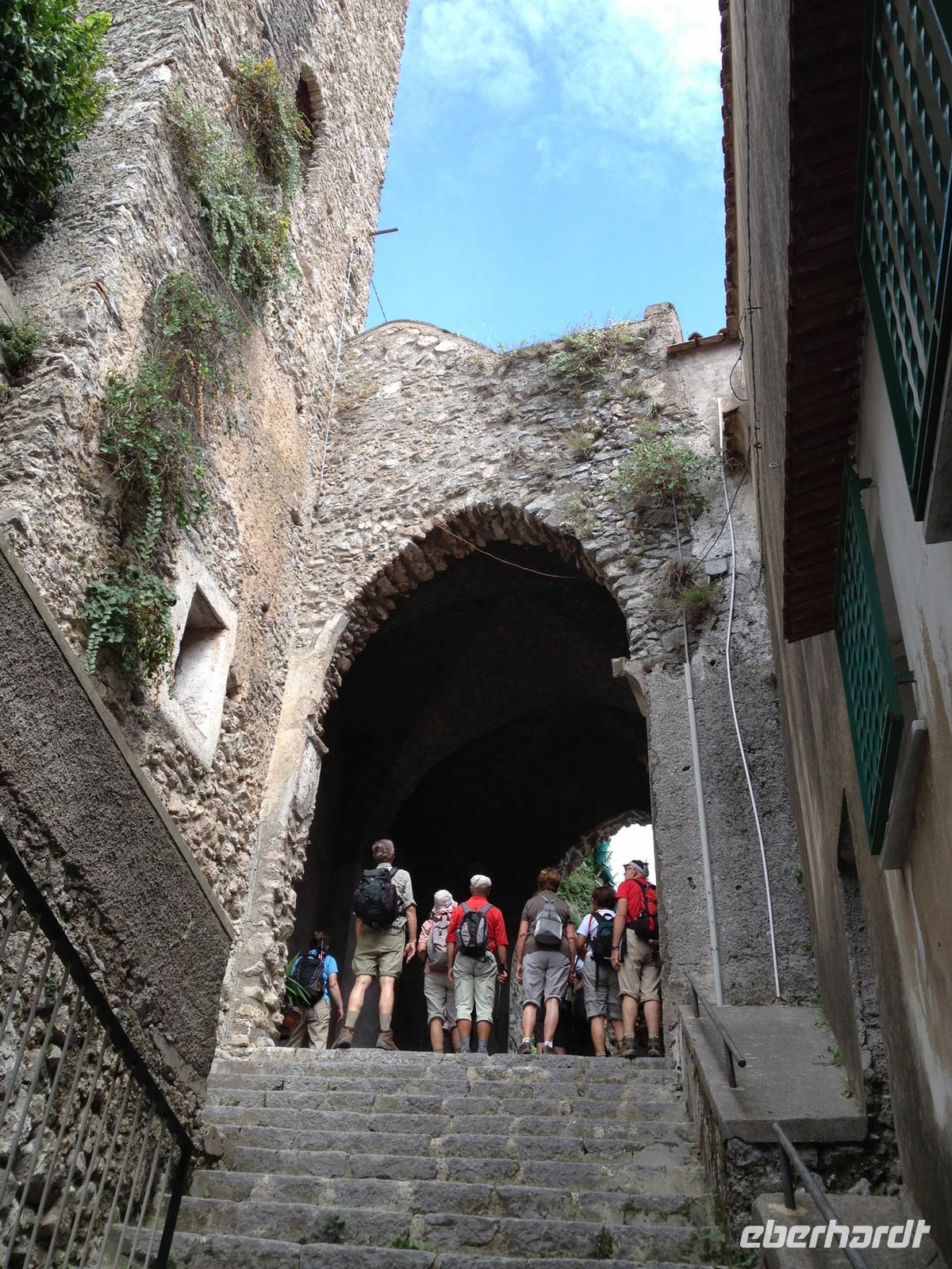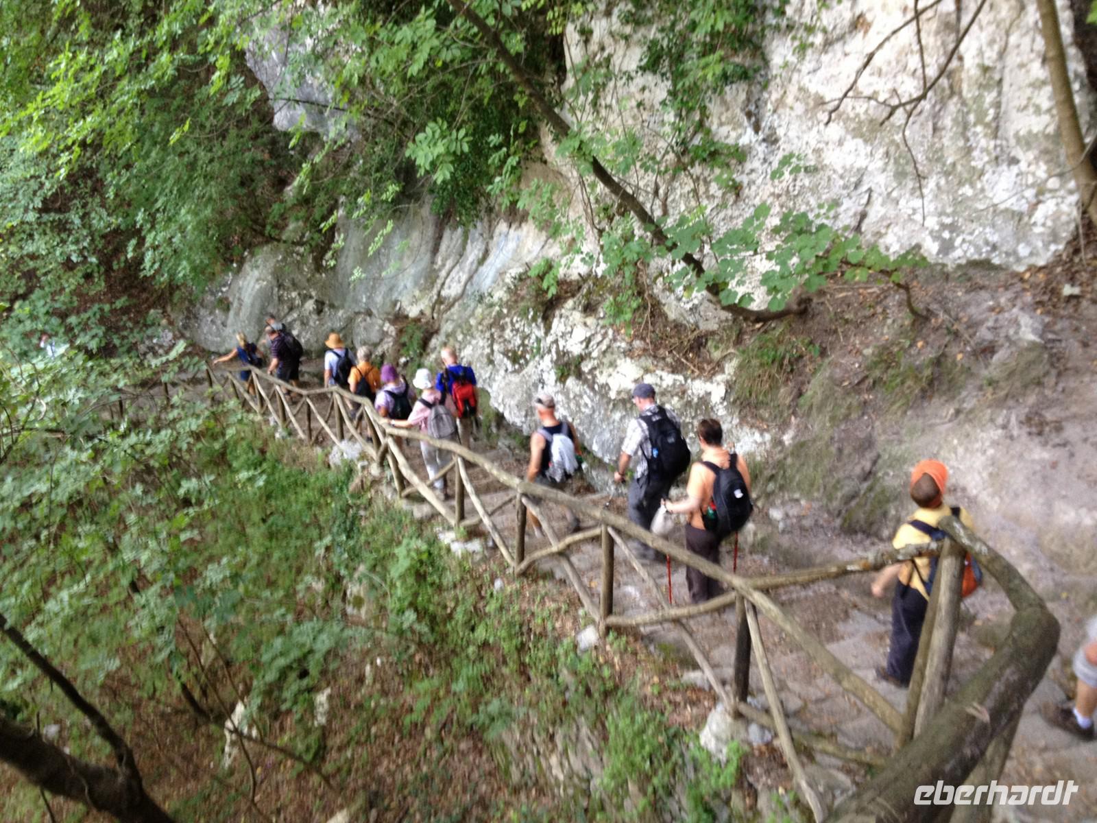 Kaum zu glaube, dass das winzige, malerische Amalfi einst das Zentrum einer alten und mächtigen Mittelmeerrepublik Italiens war. Im 9. Jahrhundert dominierte dieser kleine Hafen den Handel mit dem Orient, was den maurischen Einfluss auf den Dom Sant'Andrea erklärt. Zunächst schlenderten wir durch das Gewirr der Gässchen bis zum Dom. Anschließend verließen wir die von Touristen überfüllte Stadt und wanderten gemütlich in das Hinterland. Die Touristen wurden weniger, wir waren bald ganz allein. Im Schatten spendenden Wald des wild-romantischen Mühlentals wanderten wir vorbei an alten Papiermühlen. Jetzt waren wir in der freien Natur. Das kleine Flüsschen Canneto zeigte sich in seiner vollen Pracht und ein Wasserfall folgte dem anderen. Der Weg führte uns hoch zum Dorf Pontone, in dem wir die kleine Mittagspause einlegten. Über Minuta erreichten wir die Ortschaft Scala, die in einer Höhe von 360 Metern direkt gegenüber von Ravello liegt. Die Blütezeit des Ortes war im Mittelalter, als es noch ein Teil der mächtigen Seerepublik von Amalfi war. Aus Scala stammt Fra Gerardo Sasso, der um 1100 in Jerusalem den Johanniterorden zur Pflege kranker Kreuzfahrer und Reisender gründete. Aus ihm ging später der souveräne Malteserorden hervor. Auf dem kleinen Hauptplatz rasteten wir und unser Hotelier Stefano lies als kleine Entschädigung für die misslungenen Lunchpakete eine Runde selbstgebackenen Apfelkuchen springen.
