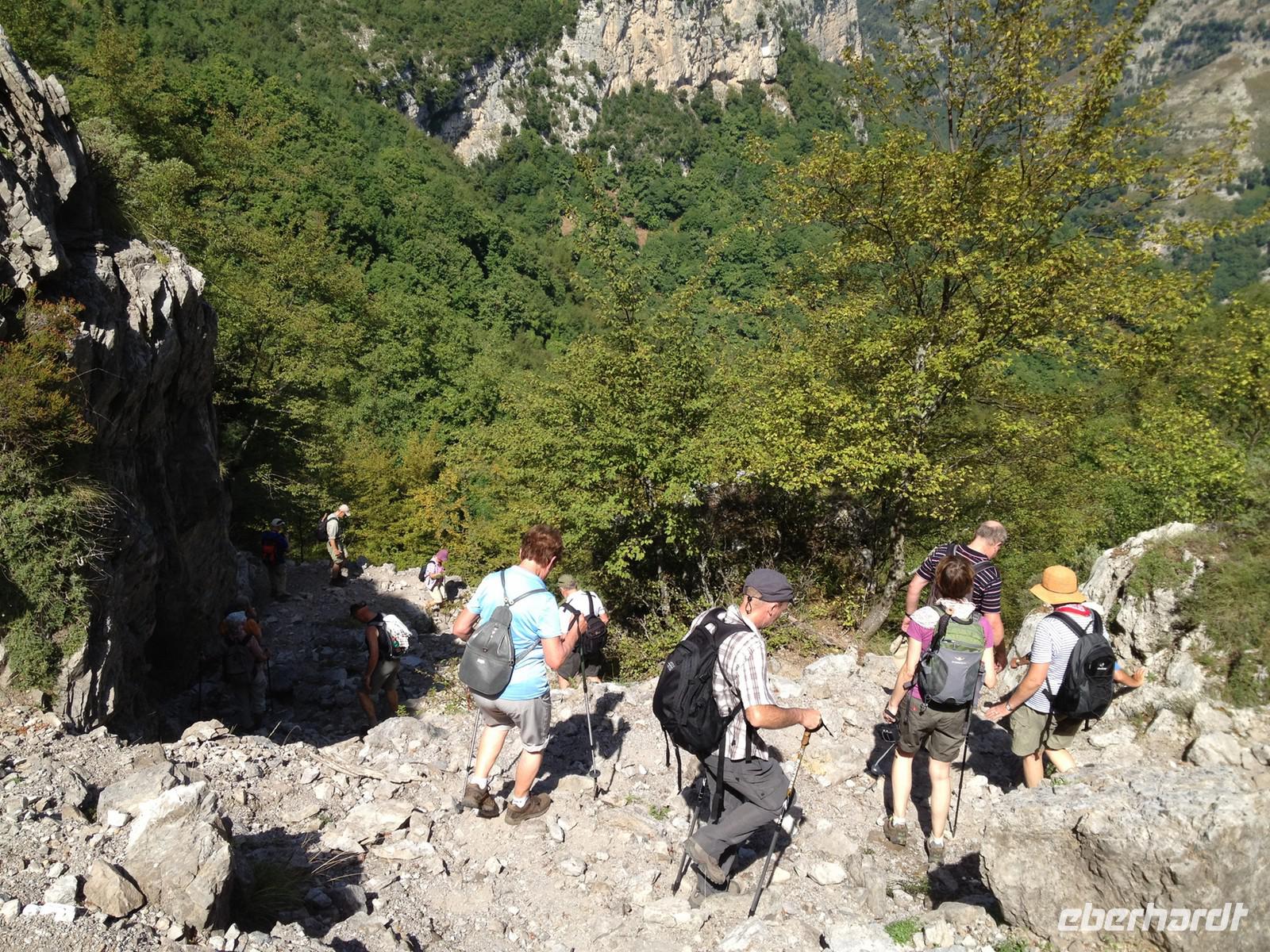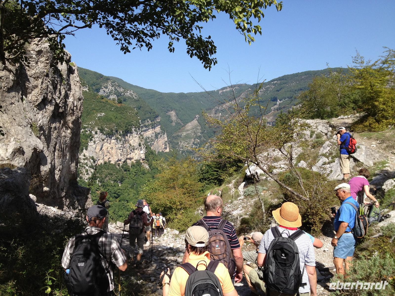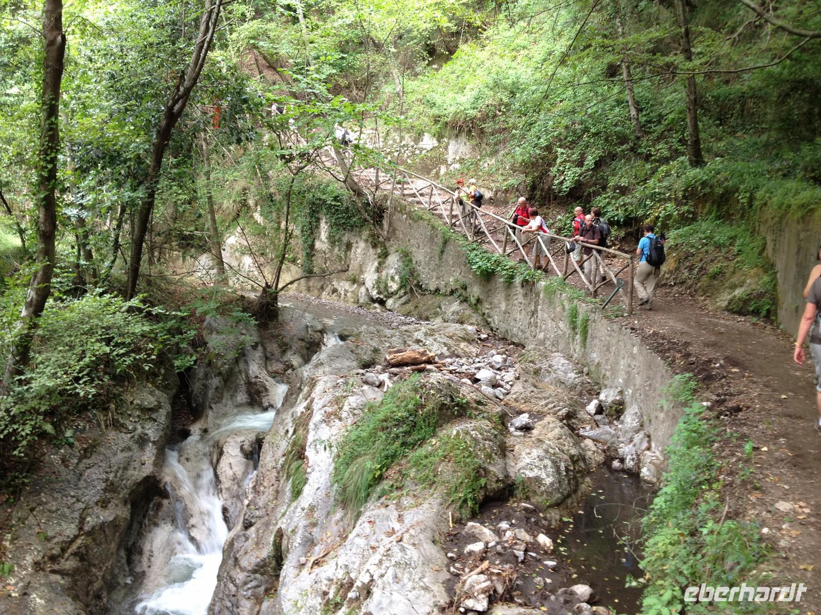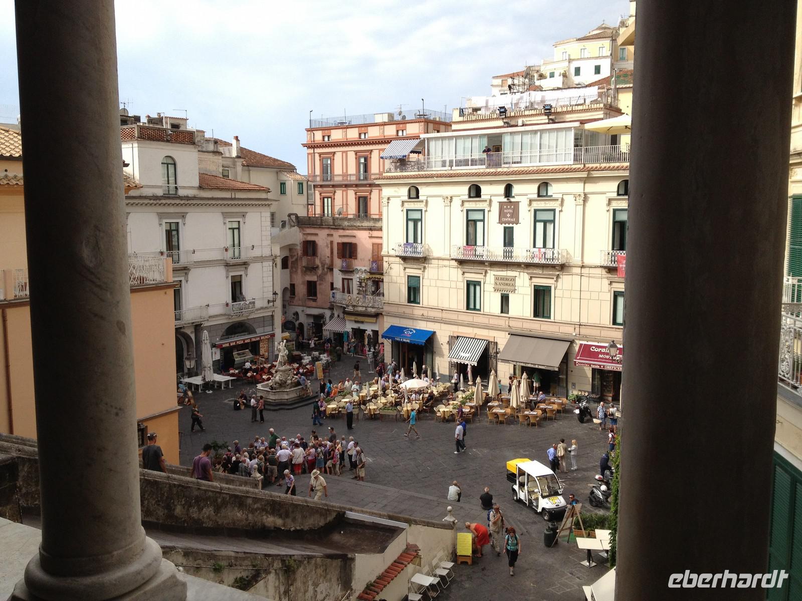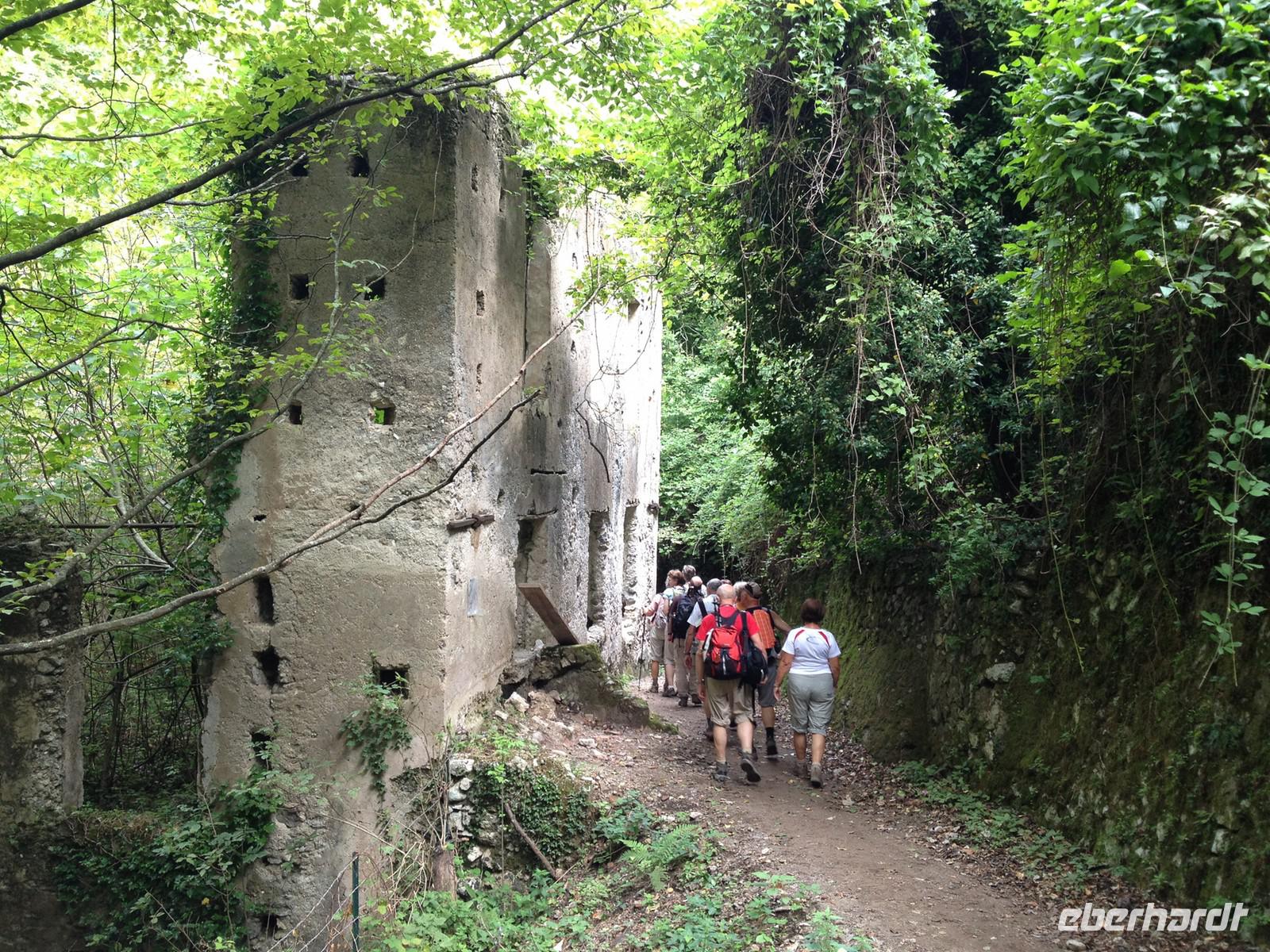 Kaum zu glaube, dass das winzige, malerische Amalfi einst das Zentrum einer alten und mächtigen Mittelmeerrepublik Italiens war. Im 9. Jahrhundert dominierte dieser kleine Hafen den Handel mit dem Orient, was den maurischen Einfluss auf den Dom Sant'Andrea erklärt. Zunächst schlenderten wir durch das Gewirr der Gässchen bis zum Dom. Anschließend verließen wir die von Touristen überfüllte Stadt und wanderten gemütlich in das Hinterland. Die Touristen wurden weniger, wir waren bald ganz allein. Im Schatten spendenden Wald des wild-romantischen Mühlentals wanderten wir vorbei an alten Papiermühlen. Jetzt waren wir in der freien Natur. Das kleine Flüsschen Canneto zeigte sich in seiner vollen Pracht und ein Wasserfall folgte dem anderen. Der Weg führte uns hoch zum Dorf Pontone, in dem wir die kleine Mittagspause einlegten. Über Minuta erreichten wir die Ortschaft Scala, die in einer Höhe von 360 Metern direkt gegenüber von Ravello liegt. Die Blütezeit des Ortes war im Mittelalter, als es noch ein Teil der mächtigen Seerepublik von Amalfi war. Aus Scala stammt Fra Gerardo Sasso, der um 1100 in Jerusalem den Johanniterorden zur Pflege kranker Kreuzfahrer und Reisender gründete. Aus ihm ging später der souveräne Malteserorden hervor. Auf dem kleinen Hauptplatz rasteten wir und unser Hotelier Stefano lies als kleine Entschädigung für die misslungenen Lunchpakete eine Runde selbstgebackenen Apfelkuchen springen.