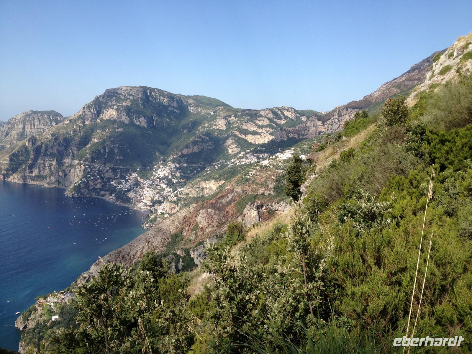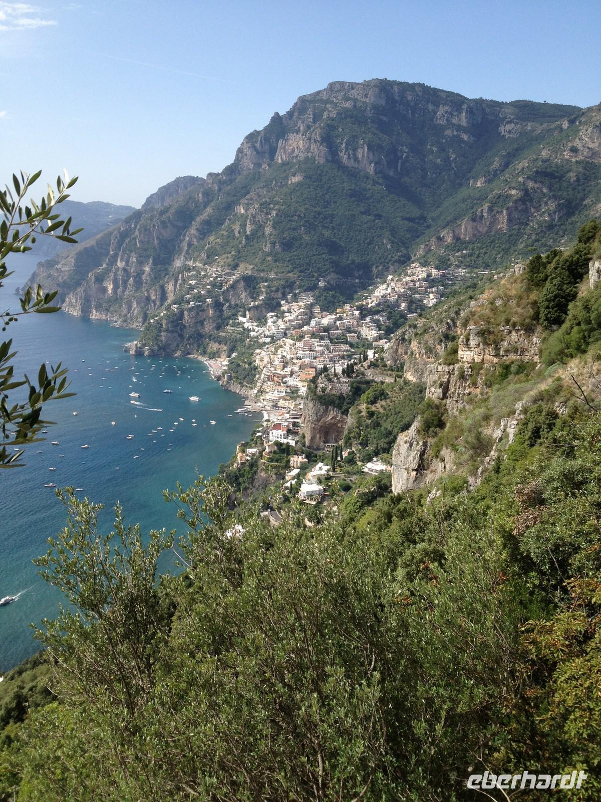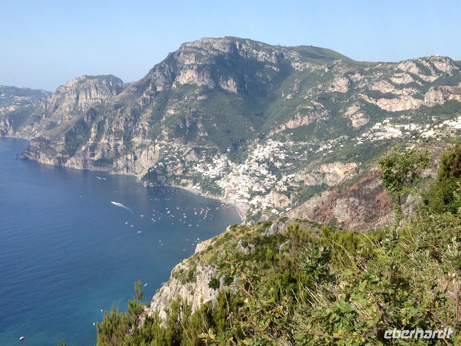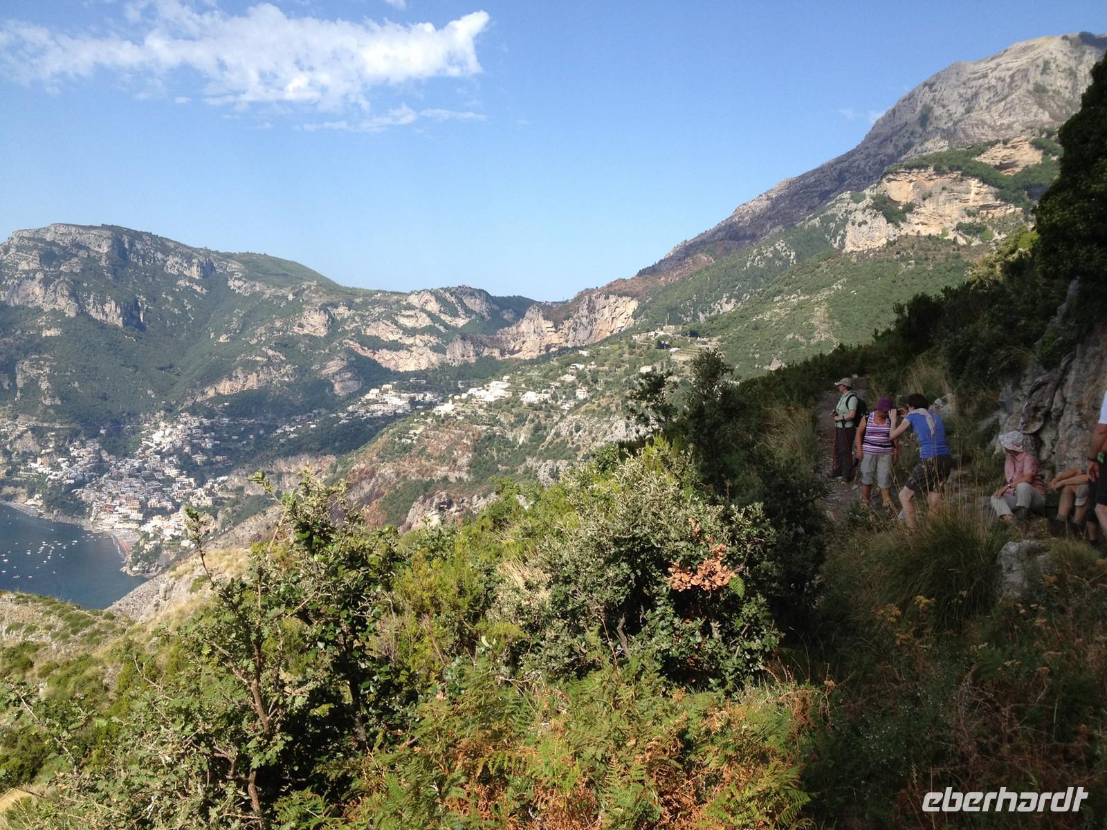 Wir merkten schnell, dass wir heute nicht so einsam unterwegs sein werden. Viktoria nannte diesen weltbekannten Weg liebevoll die „Autobahn der Amalfiküste". Der Weg ist sehr gut zu laufen. Stets hatten wir einen traumhaften Blick auf die Berge und das Meer. Ein begeisterter André Gide schrieb in seinem Roman „Der Immoralist" (1902), man könne auf dieser Erde nichts Schöneres sehen. Und so empfanden wir es auch. Es scheint, als wäre man im Paradies angekommen. Senkrechte Klippen ragen aus dem tiefblauen Wasser empor, eine Küste mit zahlreichen Einbuchtungen erstreckt sich zwischen terrassenartigen Oliven- und Zitronenhainen, Eichen und Pinien. Ziel unserer heutigen Etappe ist die Klippenstadt Positano. Die Sonne brannte und wir waren über jedes schattige Plätzchen froh. Im Dörfchen Nocelle, hoch über dem Meer, machten wir auf dem gemütlichen Platz vor der Kirche eine Mittagspause und schmunzelten beim Öffnen der Lunchpakete. Nunja, die Italiener kochen dann doch besser Pasta und backen die beste Pizza.
