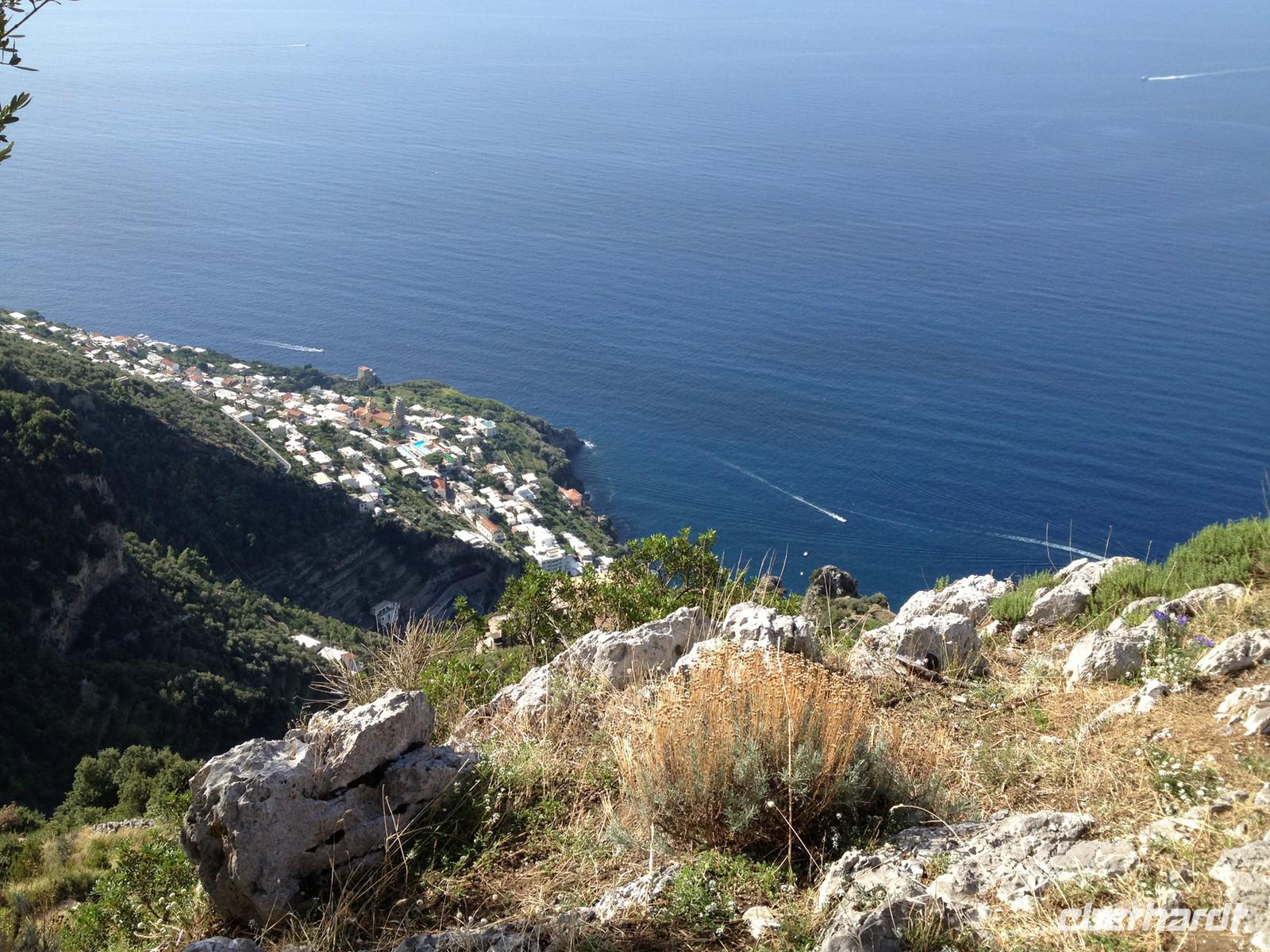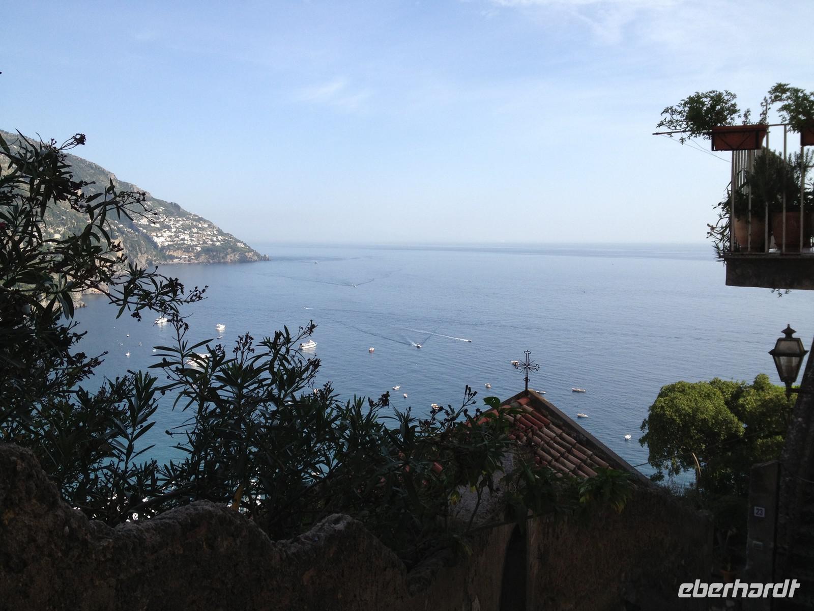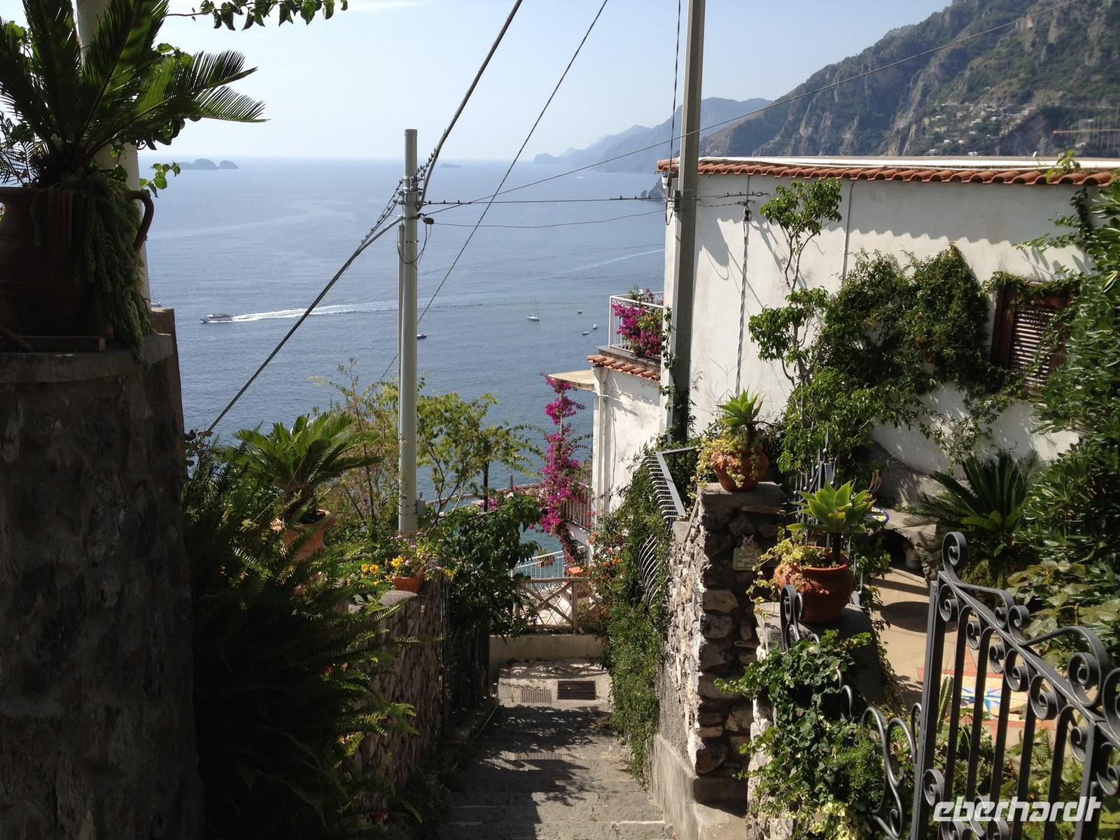 Wir merkten schnell, dass wir heute nicht so einsam unterwegs sein werden. Viktoria nannte diesen weltbekannten Weg liebevoll die „Autobahn der Amalfiküste". Der Weg ist sehr gut zu laufen. Stets hatten wir einen traumhaften Blick auf die Berge und das Meer. Ein begeisterter André Gide schrieb in seinem Roman „Der Immoralist" (1902), man könne auf dieser Erde nichts Schöneres sehen. Und so empfanden wir es auch. Es scheint, als wäre man im Paradies angekommen. Senkrechte Klippen ragen aus dem tiefblauen Wasser empor, eine Küste mit zahlreichen Einbuchtungen erstreckt sich zwischen terrassenartigen Oliven- und Zitronenhainen, Eichen und Pinien. Ziel unserer heutigen Etappe ist die Klippenstadt Positano. Die Sonne brannte und wir waren über jedes schattige Plätzchen froh. Im Dörfchen Nocelle, hoch über dem Meer, machten wir auf dem gemütlichen Platz vor der Kirche eine Mittagspause und schmunzelten beim Öffnen der Lunchpakete. Nunja, die Italiener kochen dann doch besser Pasta und backen die beste Pizza.
