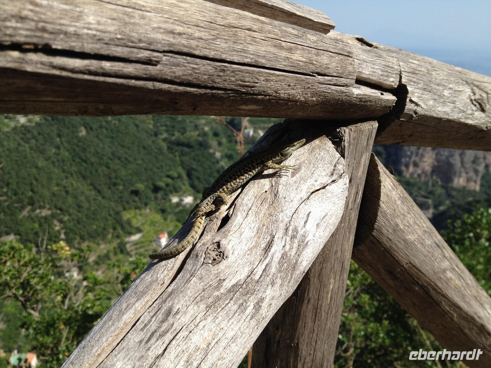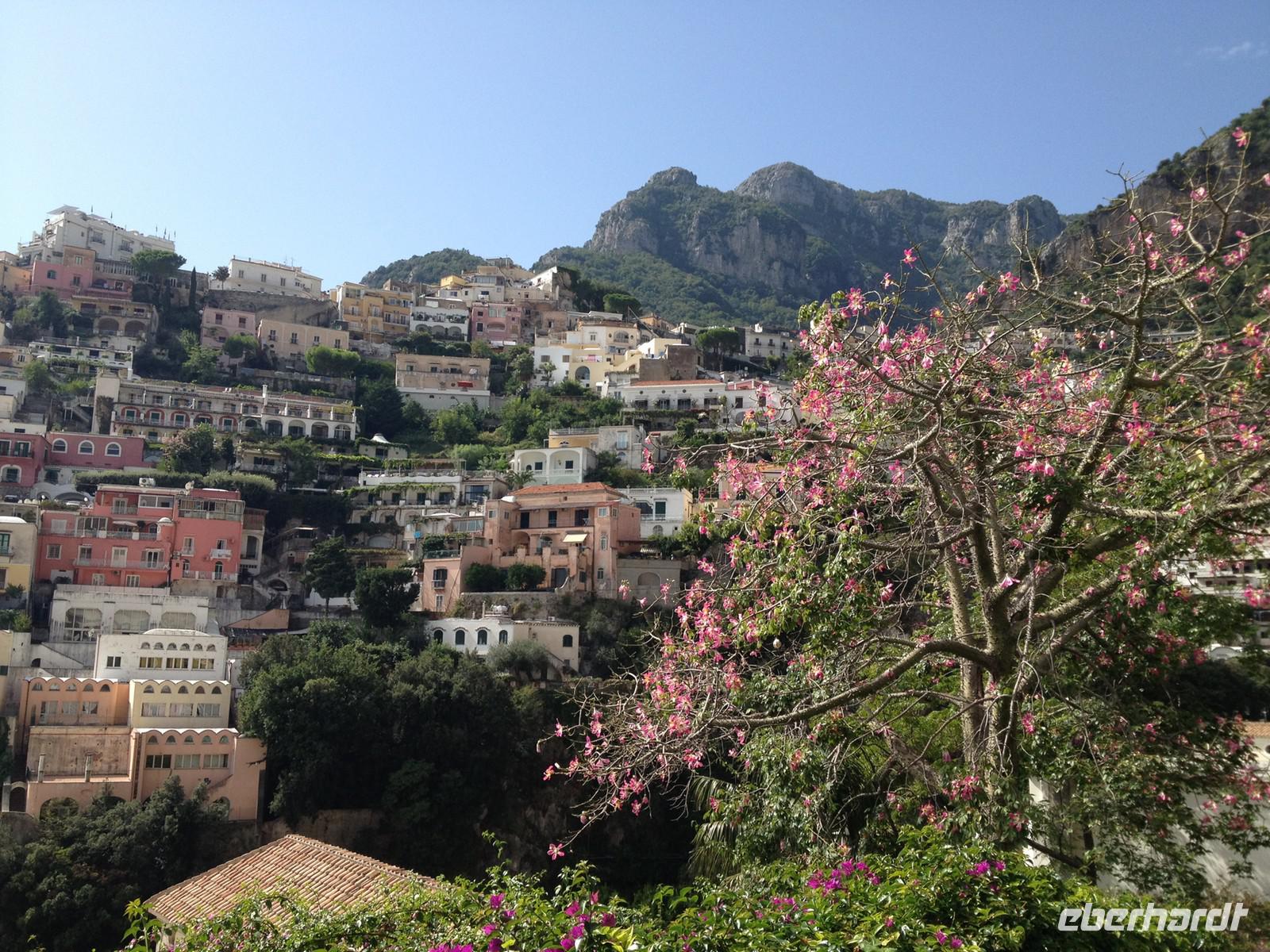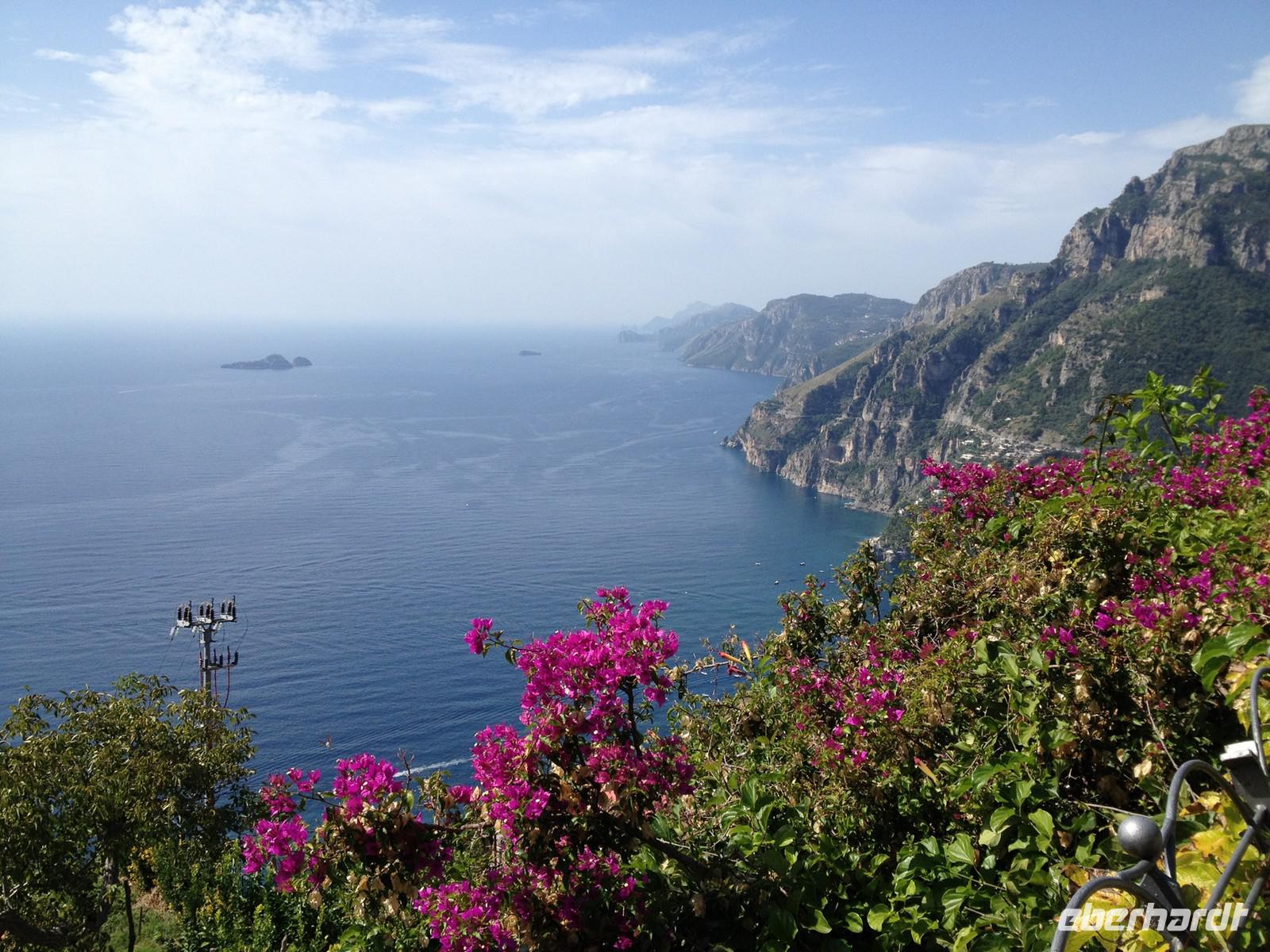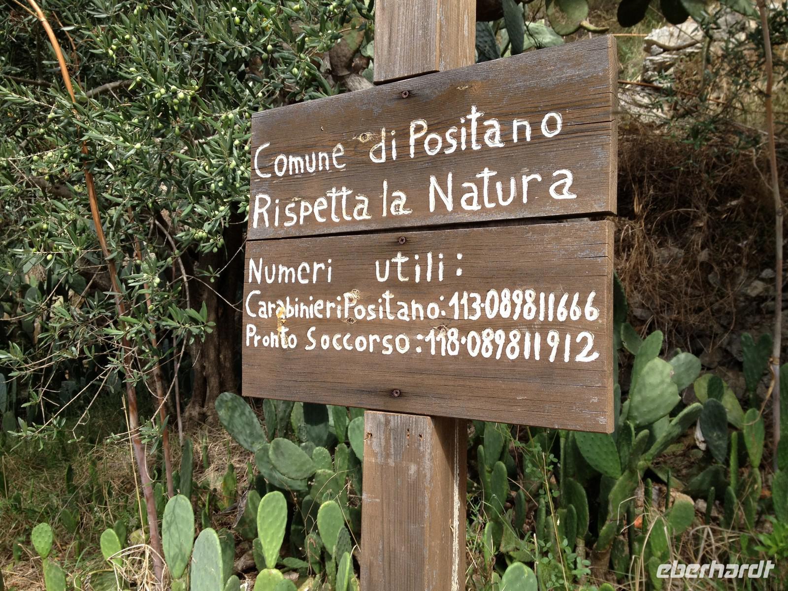 Wir merkten schnell, dass wir heute nicht so einsam unterwegs sein werden. Viktoria nannte diesen weltbekannten Weg liebevoll die „Autobahn der Amalfiküste". Der Weg ist sehr gut zu laufen. Stets hatten wir einen traumhaften Blick auf die Berge und das Meer. Ein begeisterter André Gide schrieb in seinem Roman „Der Immoralist" (1902), man könne auf dieser Erde nichts Schöneres sehen. Und so empfanden wir es auch. Es scheint, als wäre man im Paradies angekommen. Senkrechte Klippen ragen aus dem tiefblauen Wasser empor, eine Küste mit zahlreichen Einbuchtungen erstreckt sich zwischen terrassenartigen Oliven- und Zitronenhainen, Eichen und Pinien. Ziel unserer heutigen Etappe ist die Klippenstadt Positano. Die Sonne brannte und wir waren über jedes schattige Plätzchen froh. Im Dörfchen Nocelle, hoch über dem Meer, machten wir auf dem gemütlichen Platz vor der Kirche eine Mittagspause und schmunzelten beim Öffnen der Lunchpakete. Nunja, die Italiener kochen dann doch besser Pasta und backen die beste Pizza.