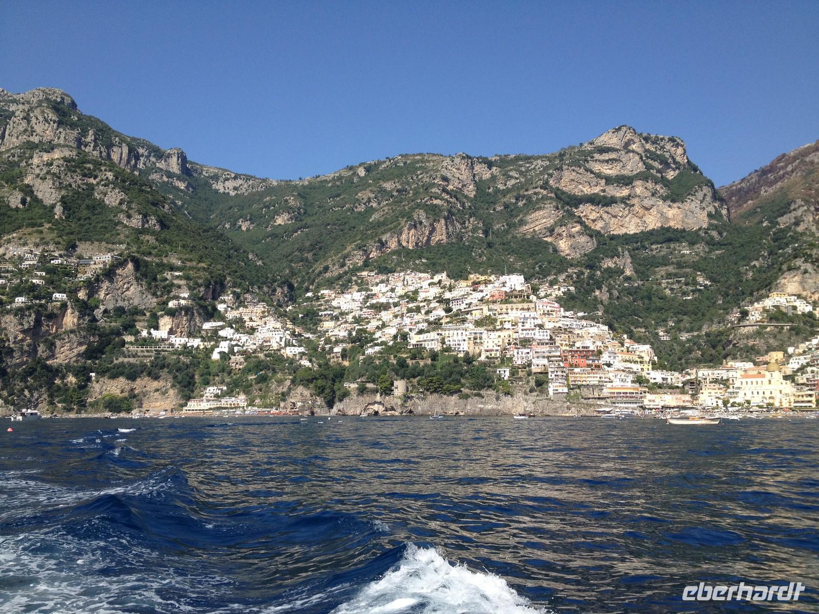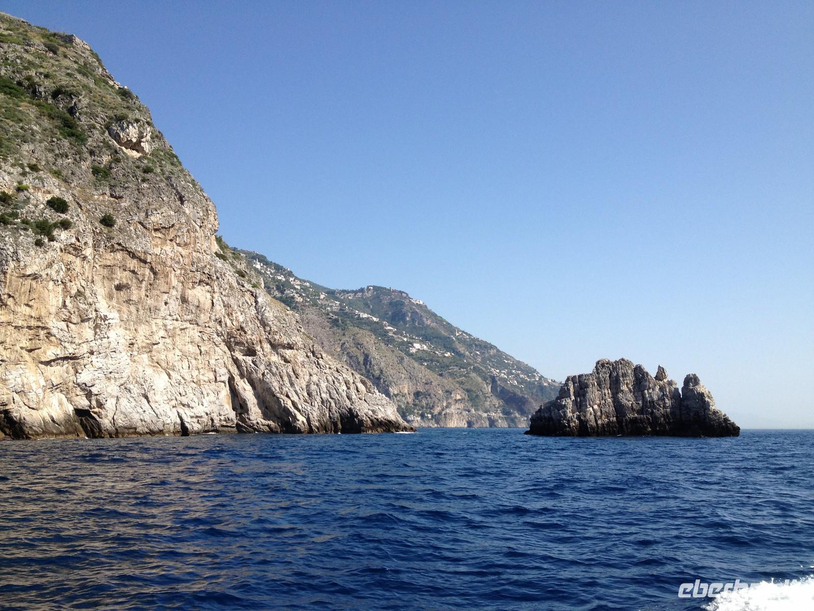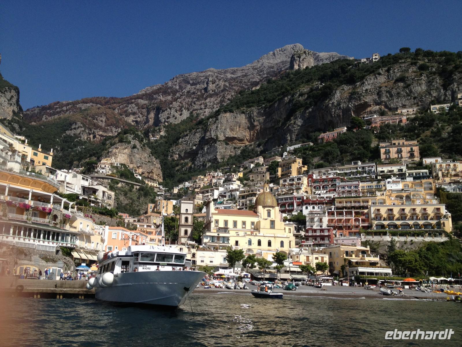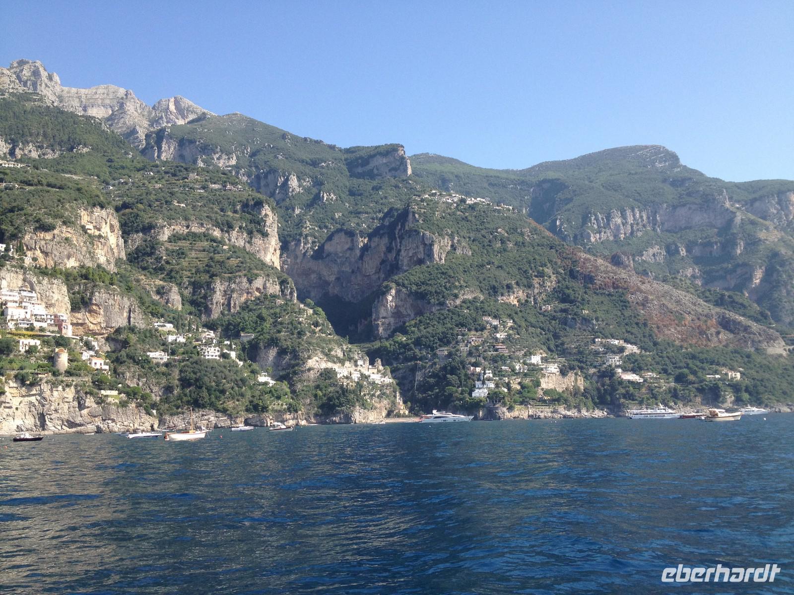 Den letzten Tag unserer Wanderwoche an Italiens Traumküste ließen wir gemütlich ausklingen. Ein letztes Mal schlängelten wir uns mit dem örtlichen Bus die engen Straßen hinunter ans Meer. Über Furore (Furore bedeutet im Italienischen übrigens „rasenden Beifall" oder „Leidenschaftlichkeit"), Conca dei Marini erreichten wir Praiano, den sonnenverwöhntesten Ort an der Amalfiküste durch die vorgelagerte kleine Halbinsel. Schon die Dogen von Amalfi ließen sich von der Schönheit des Küstendorfes verzaubern und legten ihre Sommerresidenz hierher. Die herrliche Majolikakuppel der Kirche S. Gennaro im Nachbardorf Vettica Maggiore ist weithin sichtbar. Nach weiteren Kurven uns traumhaften Blicken auf die Küste und die steilen Felsen erreichten wir Positano. Durch die engen Gässchen führte uns der Weg zunächst an den kleinen Strand und zum Hafen. Unser privates Boot holte uns (fast) pünktlich ab und wir gingen an Bord. Unsere Fahrt führte uns dann entlang der malerischen Küste. Nun sahen wir die wahre Schönheit der Amalfitana von einem ganz anderen Blickwinkel. Positano - oder auch das Schwalbennest genannt - präsentierte sich bei herrlichstem Wetter. Die pastellfarbenen Häuser schmiegen sich eins über dem anderen an den Berghang und bilden zusammen mit dem türkisblauen Meer eine traumhafte Kulisse. Während unserer Fahrt in Richtung Süden erblickten wir zahlreiche schmucke Villen, berühmte Hotels und elegante Nachtclubs. Vom Boot aus erblickten wir auch unser Hotel hoch über der Küste und natürlich den Götterweg!
