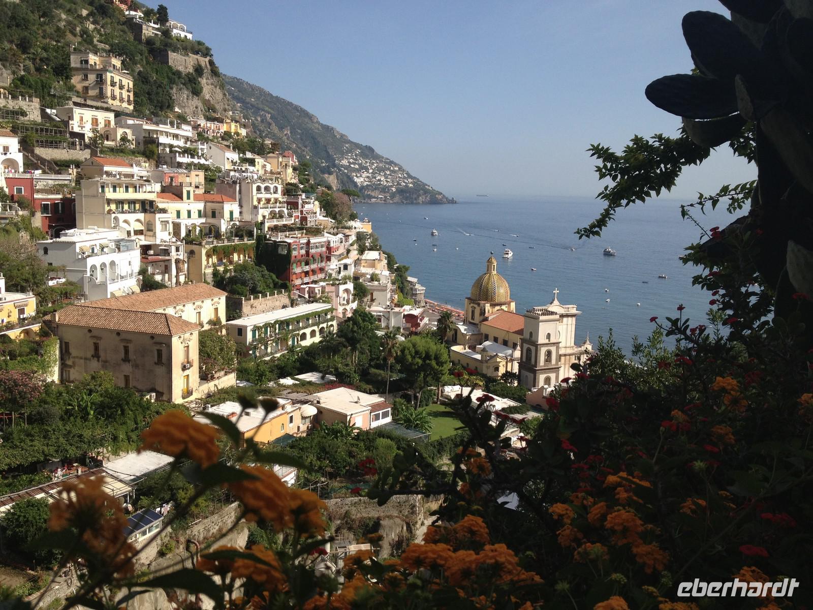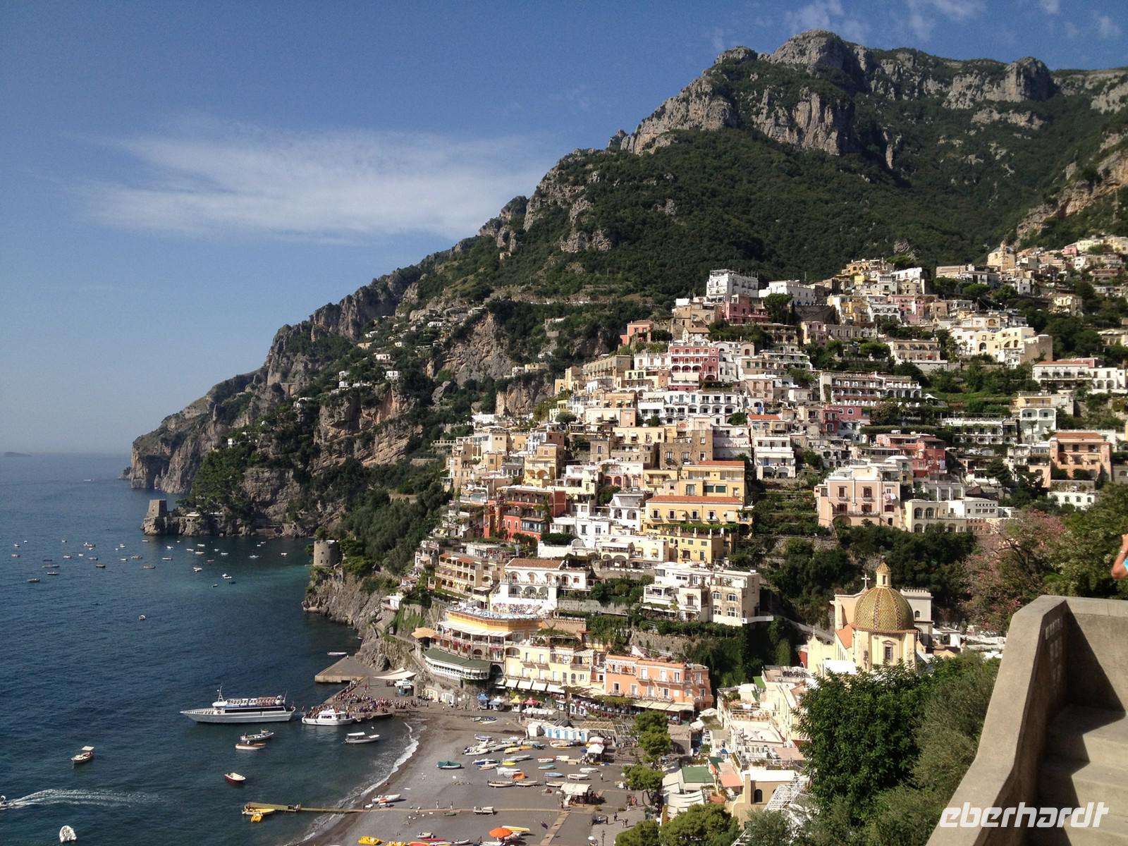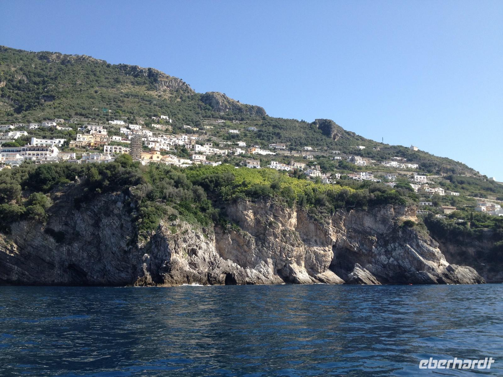 Den letzten Tag unserer Wanderwoche an Italiens Traumküste ließen wir gemütlich ausklingen. Ein letztes Mal schlängelten wir uns mit dem örtlichen Bus die engen Straßen hinunter ans Meer. Über Furore (Furore bedeutet im Italienischen übrigens „rasenden Beifall" oder „Leidenschaftlichkeit"), Conca dei Marini erreichten wir Praiano, den sonnenverwöhntesten Ort an der Amalfiküste durch die vorgelagerte kleine Halbinsel. Schon die Dogen von Amalfi ließen sich von der Schönheit des Küstendorfes verzaubern und legten ihre Sommerresidenz hierher. Die herrliche Majolikakuppel der Kirche S. Gennaro im Nachbardorf Vettica Maggiore ist weithin sichtbar. Nach weiteren Kurven uns traumhaften Blicken auf die Küste und die steilen Felsen erreichten wir Positano. Durch die engen Gässchen führte uns der Weg zunächst an den kleinen Strand und zum Hafen. Unser privates Boot holte uns (fast) pünktlich ab und wir gingen an Bord. Unsere Fahrt führte uns dann entlang der malerischen Küste. Nun sahen wir die wahre Schönheit der Amalfitana von einem ganz anderen Blickwinkel. Positano - oder auch das Schwalbennest genannt - präsentierte sich bei herrlichstem Wetter. Die pastellfarbenen Häuser schmiegen sich eins über dem anderen an den Berghang und bilden zusammen mit dem türkisblauen Meer eine traumhafte Kulisse. Während unserer Fahrt in Richtung Süden erblickten wir zahlreiche schmucke Villen, berühmte Hotels und elegante Nachtclubs. Vom Boot aus erblickten wir auch unser Hotel hoch über der Küste und natürlich den Götterweg!