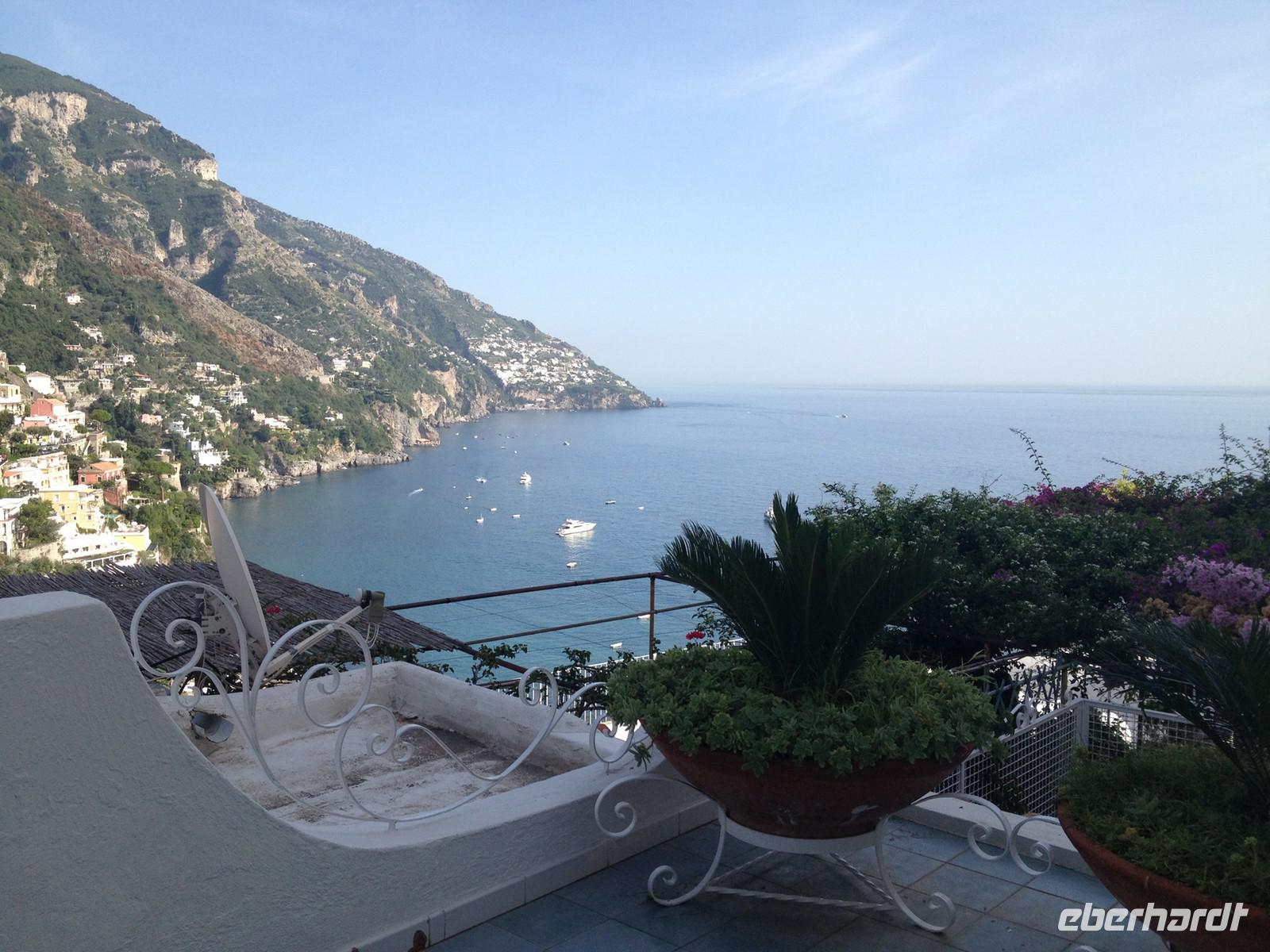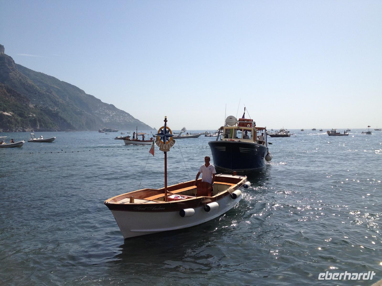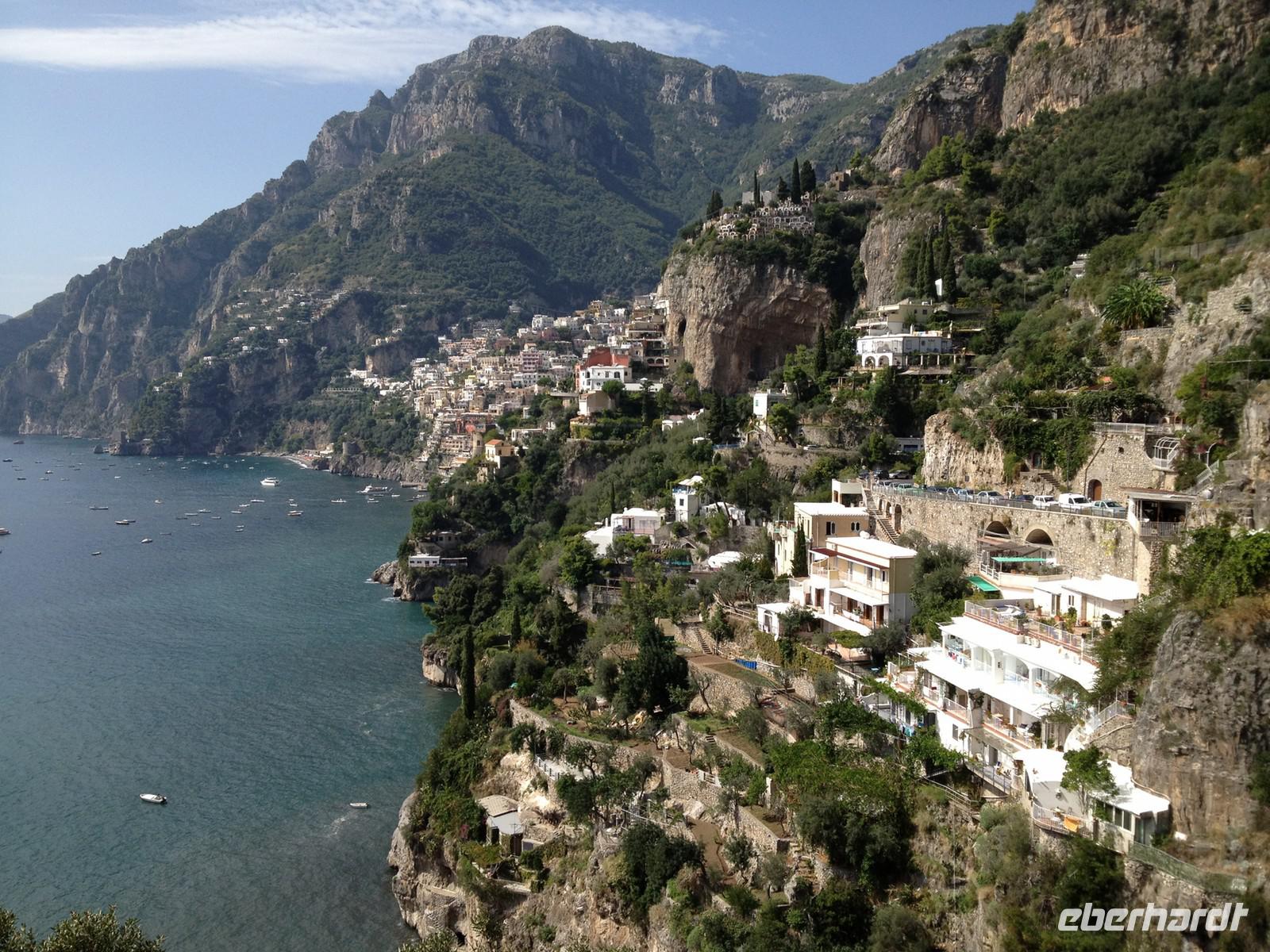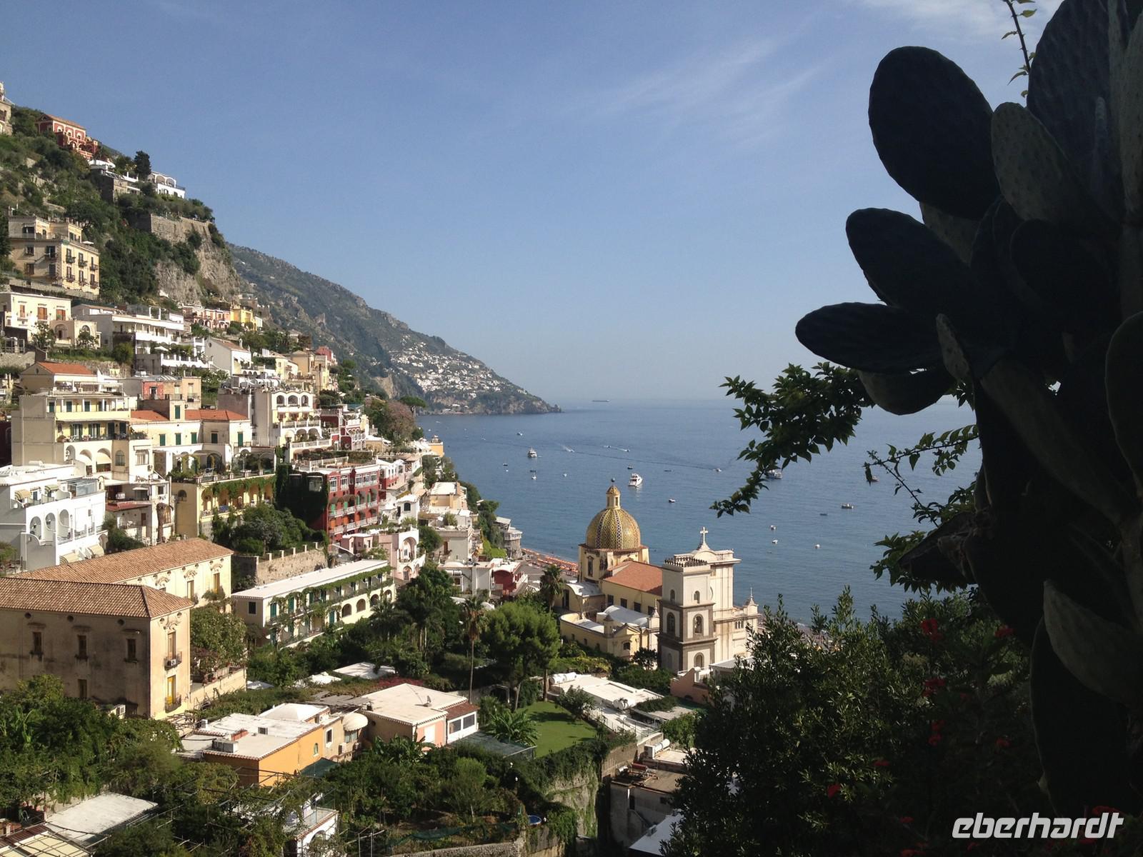 Den letzten Tag unserer Wanderwoche an Italiens Traumküste ließen wir gemütlich ausklingen. Ein letztes Mal schlängelten wir uns mit dem örtlichen Bus die engen Straßen hinunter ans Meer. Über Furore (Furore bedeutet im Italienischen übrigens „rasenden Beifall" oder „Leidenschaftlichkeit"), Conca dei Marini erreichten wir Praiano, den sonnenverwöhntesten Ort an der Amalfiküste durch die vorgelagerte kleine Halbinsel. Schon die Dogen von Amalfi ließen sich von der Schönheit des Küstendorfes verzaubern und legten ihre Sommerresidenz hierher. Die herrliche Majolikakuppel der Kirche S. Gennaro im Nachbardorf Vettica Maggiore ist weithin sichtbar. Nach weiteren Kurven uns traumhaften Blicken auf die Küste und die steilen Felsen erreichten wir Positano. Durch die engen Gässchen führte uns der Weg zunächst an den kleinen Strand und zum Hafen. Unser privates Boot holte uns (fast) pünktlich ab und wir gingen an Bord. Unsere Fahrt führte uns dann entlang der malerischen Küste. Nun sahen wir die wahre Schönheit der Amalfitana von einem ganz anderen Blickwinkel. Positano - oder auch das Schwalbennest genannt - präsentierte sich bei herrlichstem Wetter. Die pastellfarbenen Häuser schmiegen sich eins über dem anderen an den Berghang und bilden zusammen mit dem türkisblauen Meer eine traumhafte Kulisse. Während unserer Fahrt in Richtung Süden erblickten wir zahlreiche schmucke Villen, berühmte Hotels und elegante Nachtclubs. Vom Boot aus erblickten wir auch unser Hotel hoch über der Küste und natürlich den Götterweg!