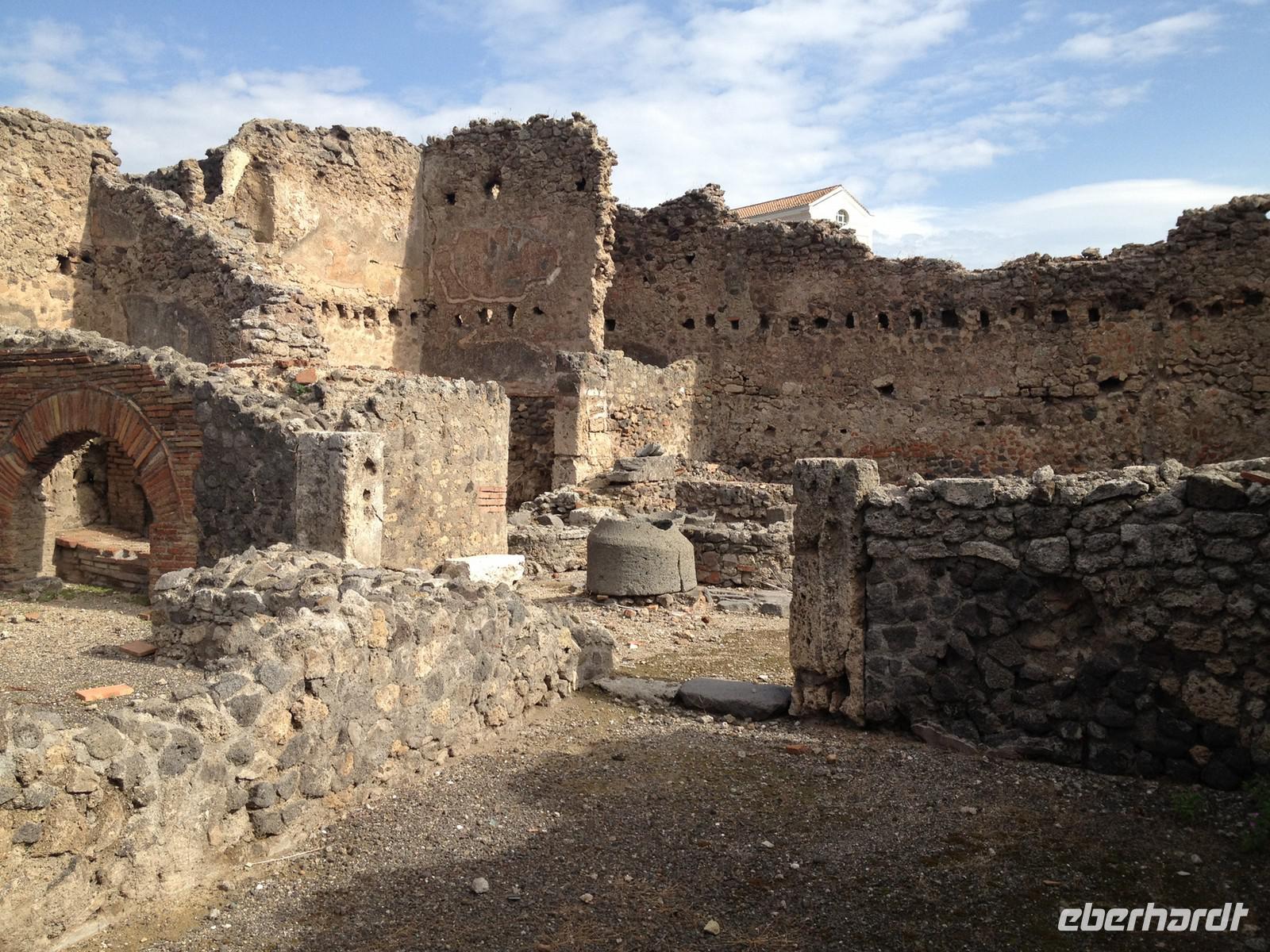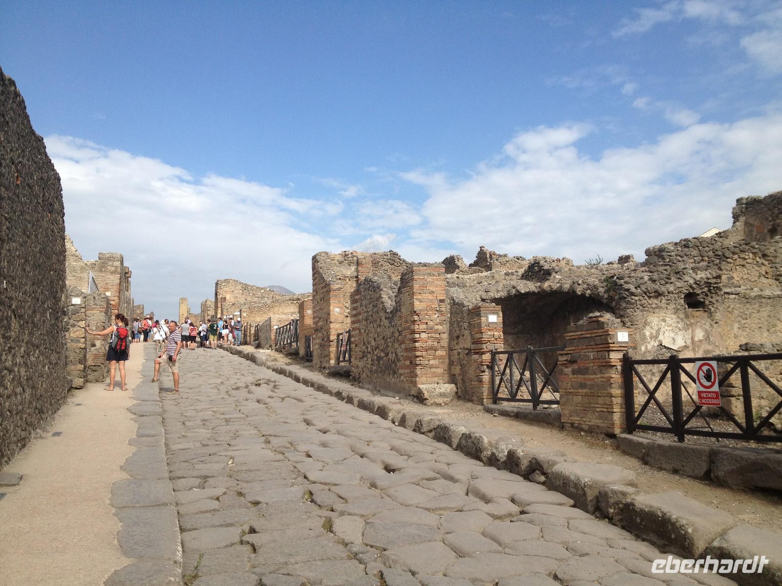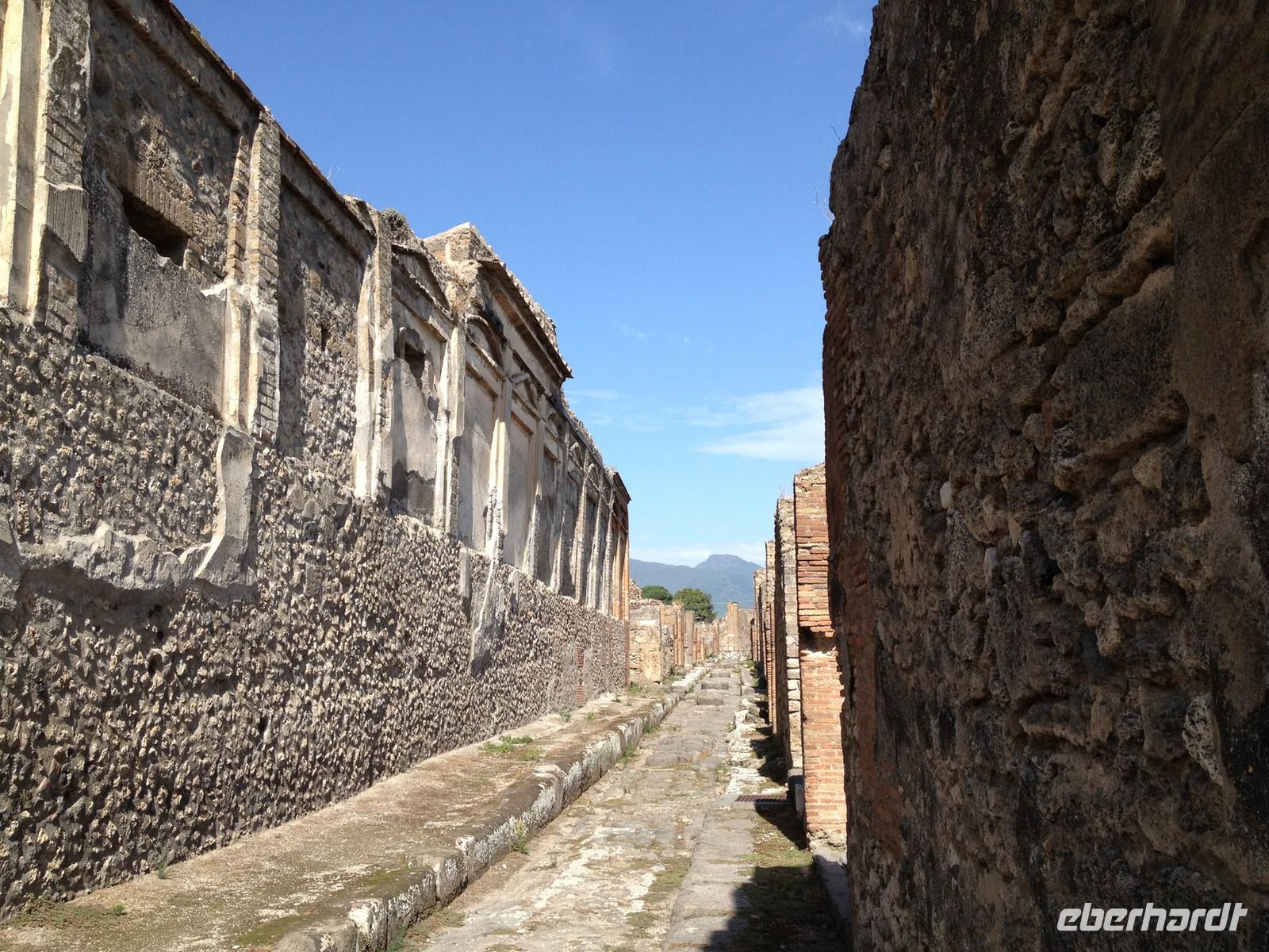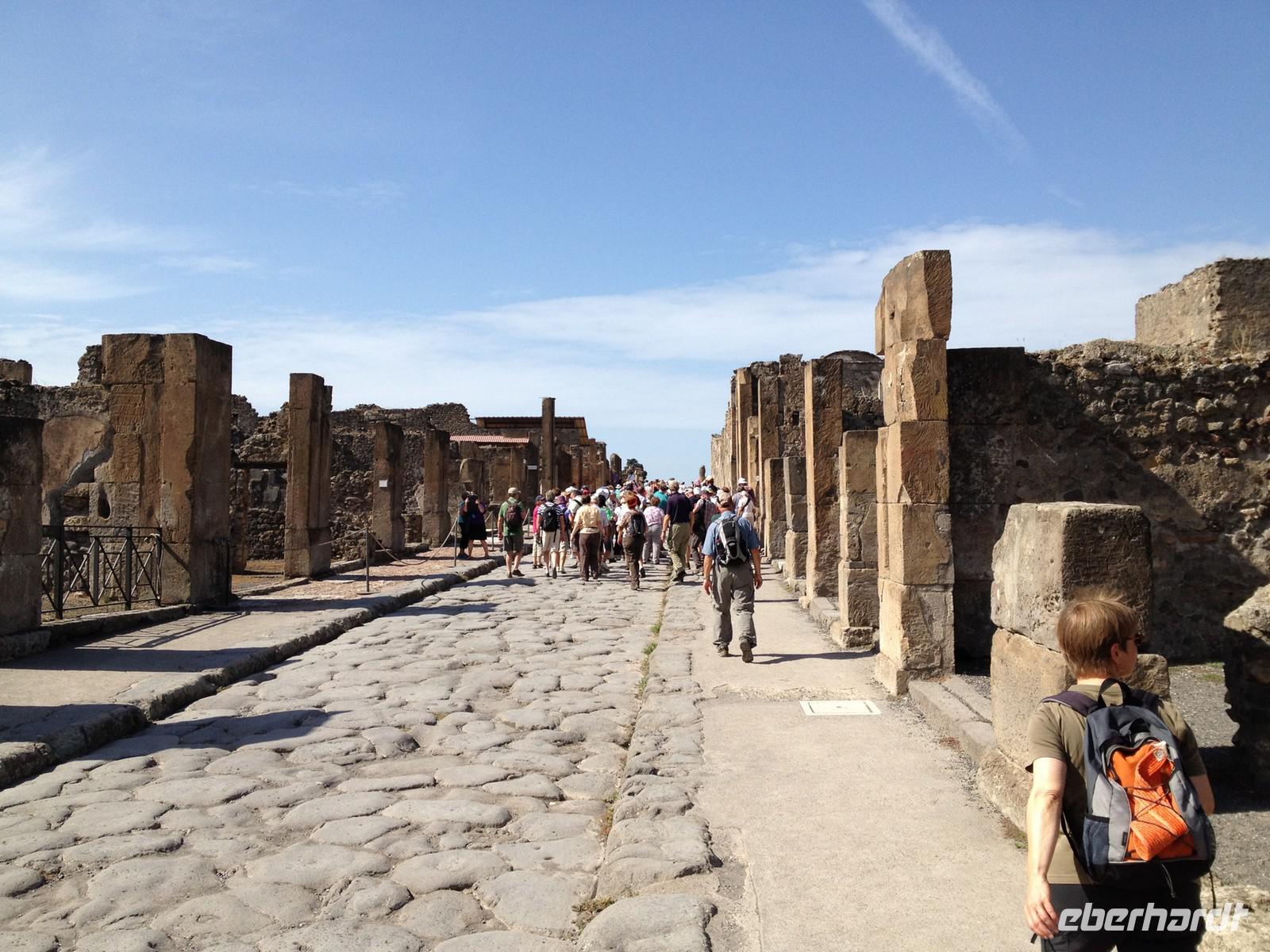 Eine größere Wanderung stand heute nicht auf dem Programm. Viel mehr widmeten wir uns heute dem Vesuv - dem Schicksalsberg am Golf von Neapel. Zunächst führte uns der Weg mit dem Bus durch die Milchberge wieder hinunter in Richtung Neapel. Pompeji war das erste Ziel. Vor den Ausgrabungsstätten trafen wir unsere örtliche Reiseleiterin Adriana. Bei herrlichstem Sonnenschein und Temperaturen um die 25°C starteten wir unseren Rundgang. Pompeji ist ohne Zweifel eine Geisterstadt einer untergegangenen Zivilisation. Es ist, als wären die alten Römer erst gestern abgereist. Häuser, Weinläden, öffentliche Bäder und Bordelle sind Zeugen eines Lebens, das in dieser geschäftigen Hafenstadt am Fuße des mächtigen Vesuvs zur Zeit Caesars herrschte. Im Jahr 79 n. Chr. begrub einer der schwersten Ausbrüche der Geschichte die Stadt unter einer fast 7 Meter dicken Ascheschicht. Gut geschützt lag sie dort bis zu ihrer Entdeckung im 16. Jahrhundert. Und erst Mitte des 18. Jahrhunderts wurde mit den Ausgrabungen begonnen. Bis heute sind aber noch gut zwei Drittel der Stadt verschüttet. Während unseres Rundganges erfuhren wir viel über das damalige Leben, den Reichtum der Stadt und waren sichtlich beeindruckt. Pompeji birgt so viele Geheimnisse, dass der Ort immer ein Rätsel bleibt!