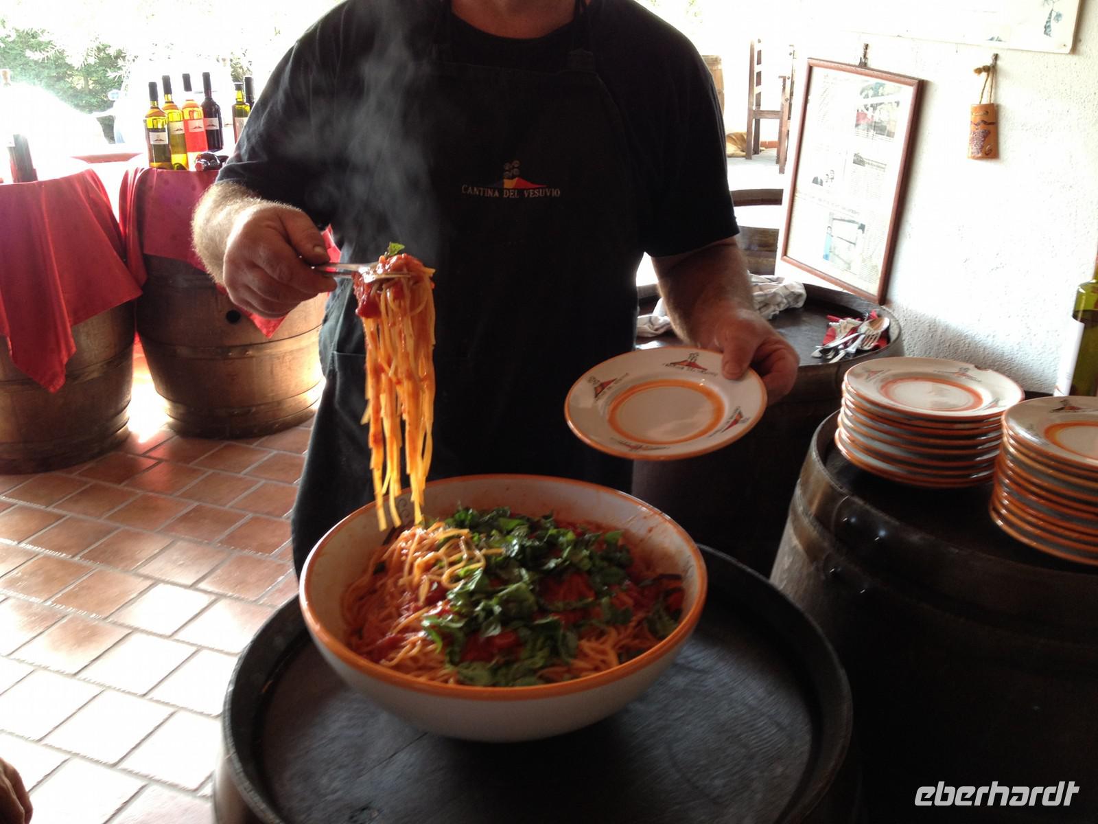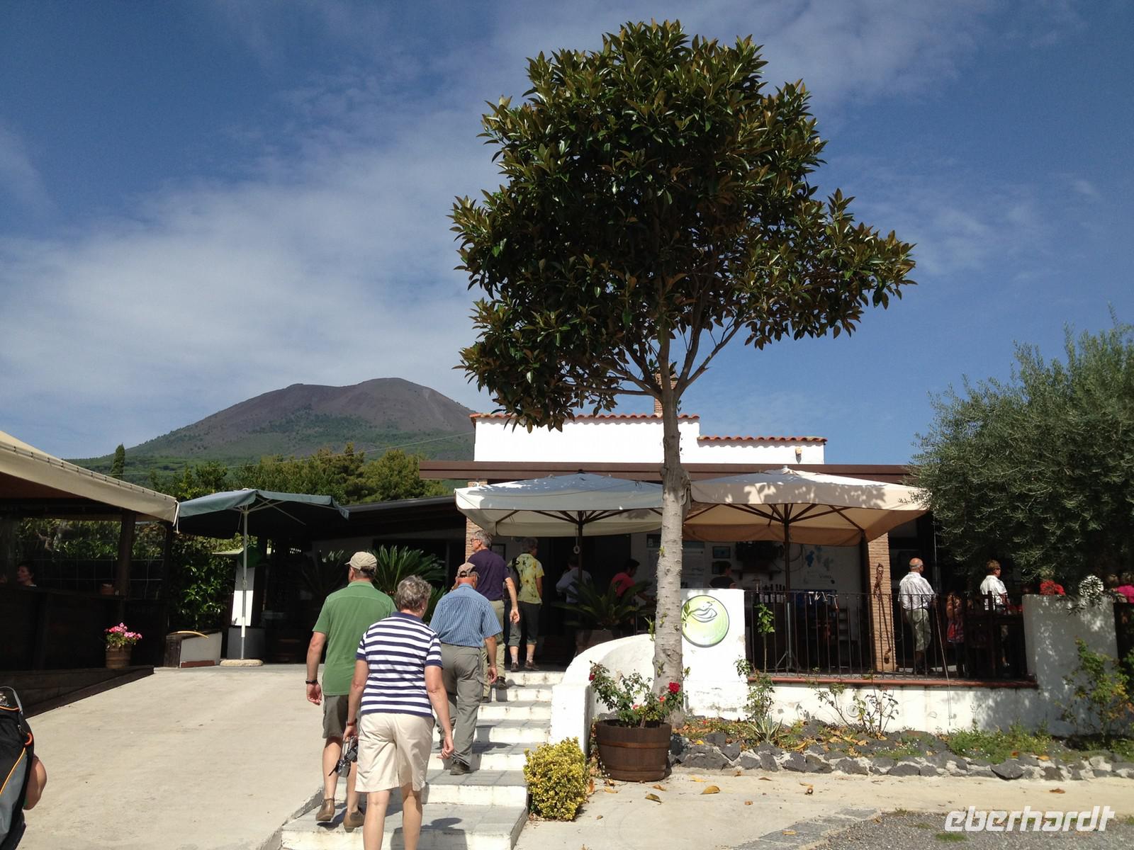 Erschöpft von der Führung erreichten wir die „Cantina del Vesuvio" - ein Weingut am Fuße des Vesuvs inmitten von Weinbergen und Olivenhainen. Wir wurden vom Chef Maurizio herzlich begrüßt. Auf der Terrasse speisten wir im rustikalen Ambiente und bekamen beste Weine zum Probieren. Der Vorspeisenteller mit selbstgebackenem Brot, feinem Olivenöl, Käse und Salami sowie die frische Pasta waren ein besonderer Genuss. Nach einigen Gläsern Wein und einem leckeren Dessert schlenderten wir noch ein wenig durch die Weinberge, bevor wir uns auf dem Weg zum Vesuv machten.