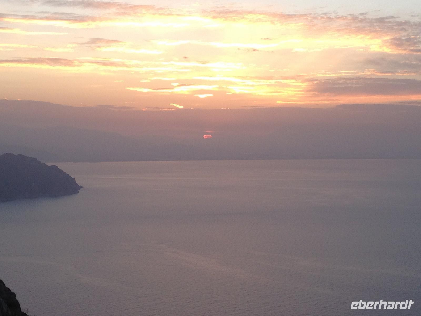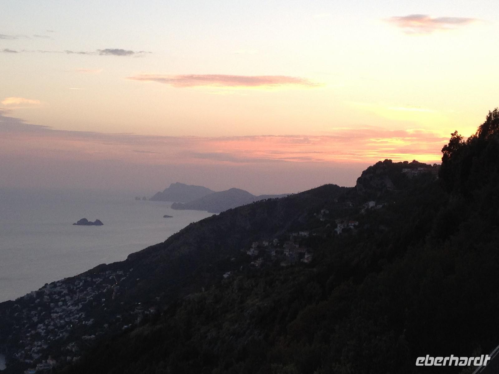 Nach einem stärkenden Frühstück starteten wir unsere heutige Wanderung mit unserer Wanderführerin Vittoria direkt am Hotel. Die Hitze machte die ersten Anstiege bis zur Hochebene von Agerola zu einem anstrengenden Unterfangen. Doch endlich oben angekommen, wurden wir schon mit einem herrlichen Ausblick belohnt. Nun ging der Weg relativ eben durch Schatten spendende Wälder, offene Flächen mit traumhaften Blicken auf das unten liegende Meer und die schroffe Küste. Vittoria lockerte die Wanderung stets mit interessanten Geschichten und Informationen über Land und Leute auf. Nun begannen wir mit dem Abstieg zum Örtchen Pogerola. Über kleine Geröllpfade und Treppenstufen erreichten wir diese kleine Ansiedlung mitten in den Bergen und kehrten in der Trattoria „La Capannina" zum Mittagessen ein. Hier wurden wir herzlich begrüßt und mit einem leckeren Essen (gemischter Salat, Antipasti oder Pasta) und schmackhaftem Wein kulinarisch verwöhnt. Auf dem Hauptplatz füllten wir unsere Wasserflaschen mit frischem Wassre auf und es begann nun der Abstieg zum wohl berühmtesten Ort und Namensgeber der Küste - nach Amalfi! Berühmt ist die ehemalige Seerepublik Amalfi durch das hier hergestellte Papier (im Valle dei Mulini) und den wunderschönen Dom. Wir erreichten den Hauptplatz in der Ortsmitte und hatten nun noch Zeit zum Baden, Bummeln, Eis essen - jeder wie er es mochte! Vincenzo holte uns (fast) pünktlich wieder mit dem Bus ab und wir schlängelten uns die Serpentinen wieder hoch zum Hotel in San Lazzaro. Somit ging der erste aktive Tag an der Amalfiküste leider schon zu Ende und wir konnten einen grandiosen Sonnenuntergang beobachten.