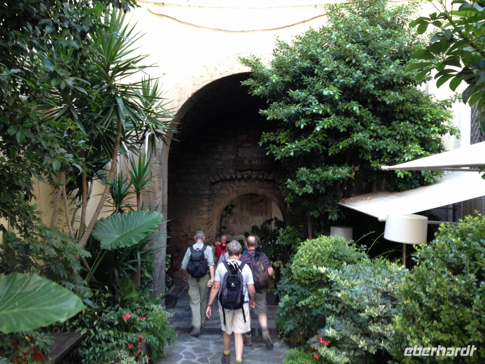 Positano war von hier aus zum Greifen nah. „Die einzige, senkrecht gebaute Stadt der Welt" erreichten wir jedoch nur über unzählige Treppenstufen. Doch diese meisterten alle Wanderfreunde mit Bravour. Nach gefühlten 1.500 Stufen erreichten wir schließlich die Amalfitana-Küstenstraße und Positano. Hier haben wir uns dann eine Erfrischung in einem der zahlreichen Cafés redlich verdient! Nach einer Verschnaufpause oder auch einer kleinen Abkühlung im Meer brachte uns der Bus zurück zum Hotel. Am Abend fand im Hotel ein Gala-Dinner statt. An der Grotte des Hotels genehmigten wir uns einen Limoncello bevor wir das Tanzbein schwingen konnten. Exzellenter Büffelmozarella mit Schinken und andere Leckereien rundeten den Abend kulinarisch ab.