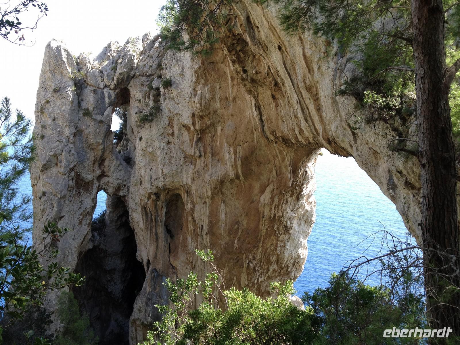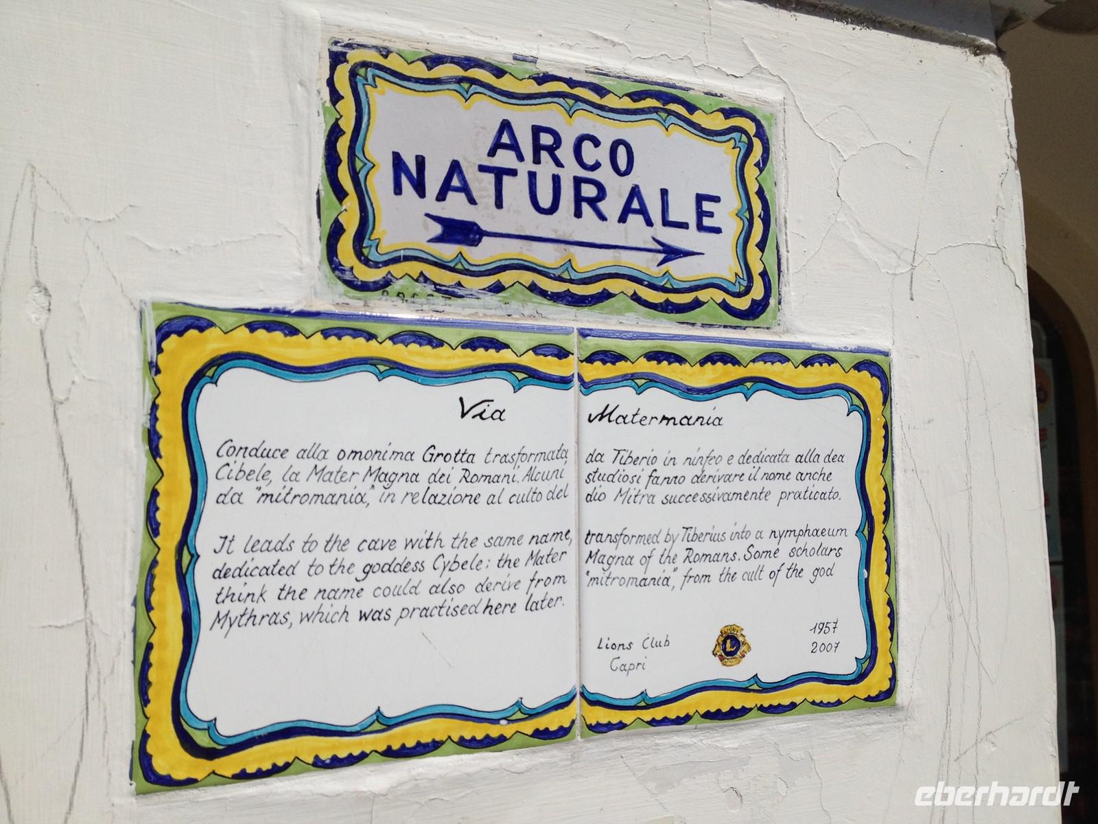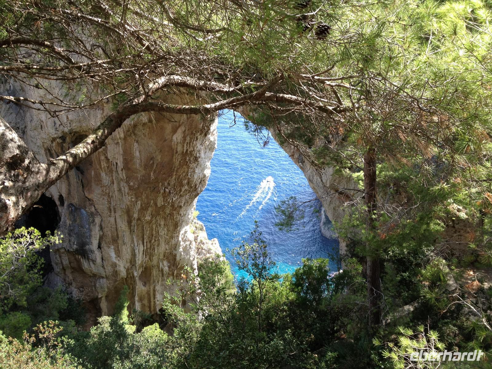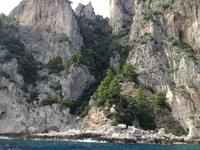 Unser Ziel war zunächst die Villa Jovis. Durch die schmalen Wege, vorbei an blühenden Gärten und edlen Villen erreichten wir die Ruinen der Villa auf dem Felssporn des Monte Tiberio. In einer aussichtsreichen, strategisch besten Lage blickt die Villa auf den Golf von Neapel, auf den Punta Campanella, auf die Stadt Capri und auf den Hafen Marina Grande. Nach einem kurzen Rundgang legten wir unter den großen Pinien das Picknick ein und kosteten so manche Leckereien und saftige Pflaumen. Ein weiteres Highlight und sehenswertes Naturschauspiel ist der Arco Naturale, den wir im Anschluss erwanderten. Dieser gewaltige Bogen bildet den Überrest einer großen Grotte, die sich in den Berg hineingefressen hat. Die Wellen des Meeres haben die Öffnung erweitert und das Geröll weggespült. Nachdem sich in der Altsteinzeit die Insel gehoben hatte, war die Grotte nicht länger der Erosionswirkung der Wellen ausgesetzt und unter dem Einfluss von Wind und Regen hat sich ihre Oberfläche verändert. Zurück auf der kleinen Piazza, fernab des Touristentrubels, legten wir eine kleine Pause ein. Nun konnte jeder den Nachmittag verbringen, wie er mochte. Mit einigen Gästen ging ich gemeinsam mit Viktoria zurück zum Hafen um eine Bootsfahrt um die Insel zu machen. Hierbei sahen wir das Wahrzeichen der Insel - die Faraglioni-Felsen, viele Grotten, den Arco Naturale von der Wasserseite aus, den Hafen Marina Piccola und die Via Krupp, ein historischer Serpentinenpfad an der Südküste der Insel.