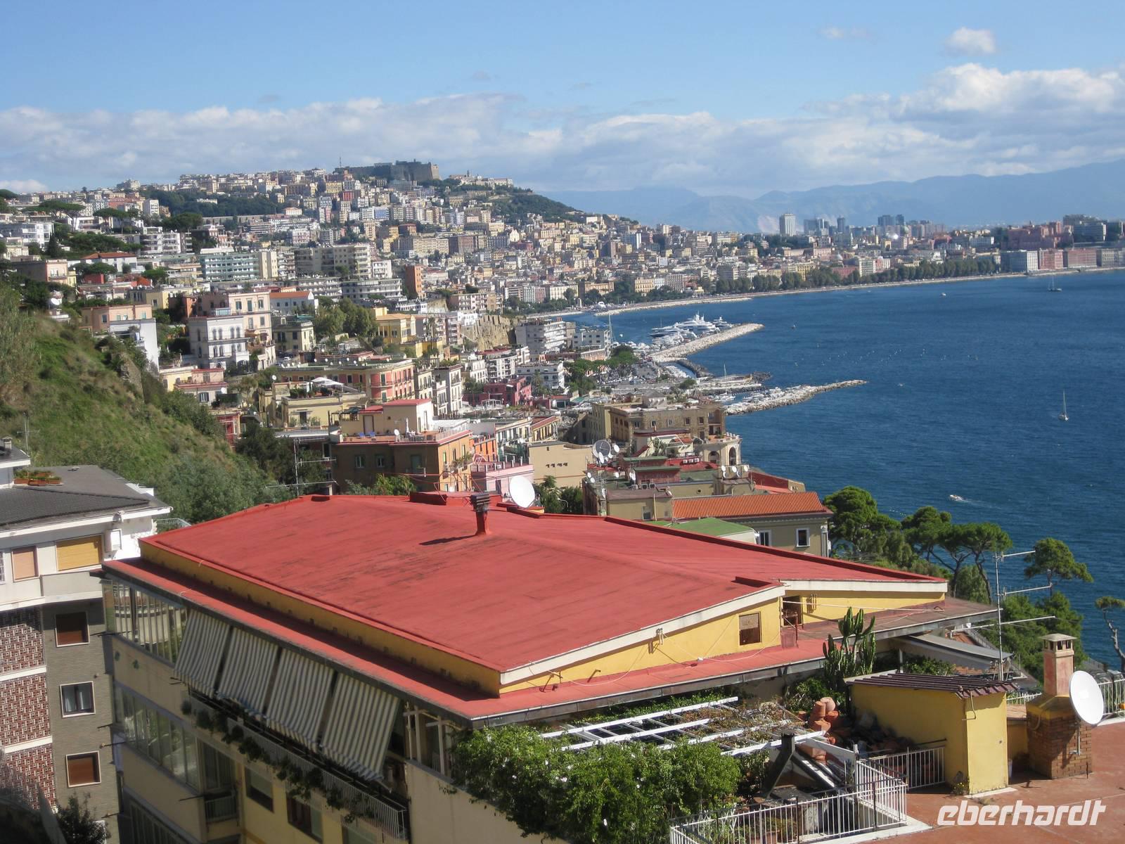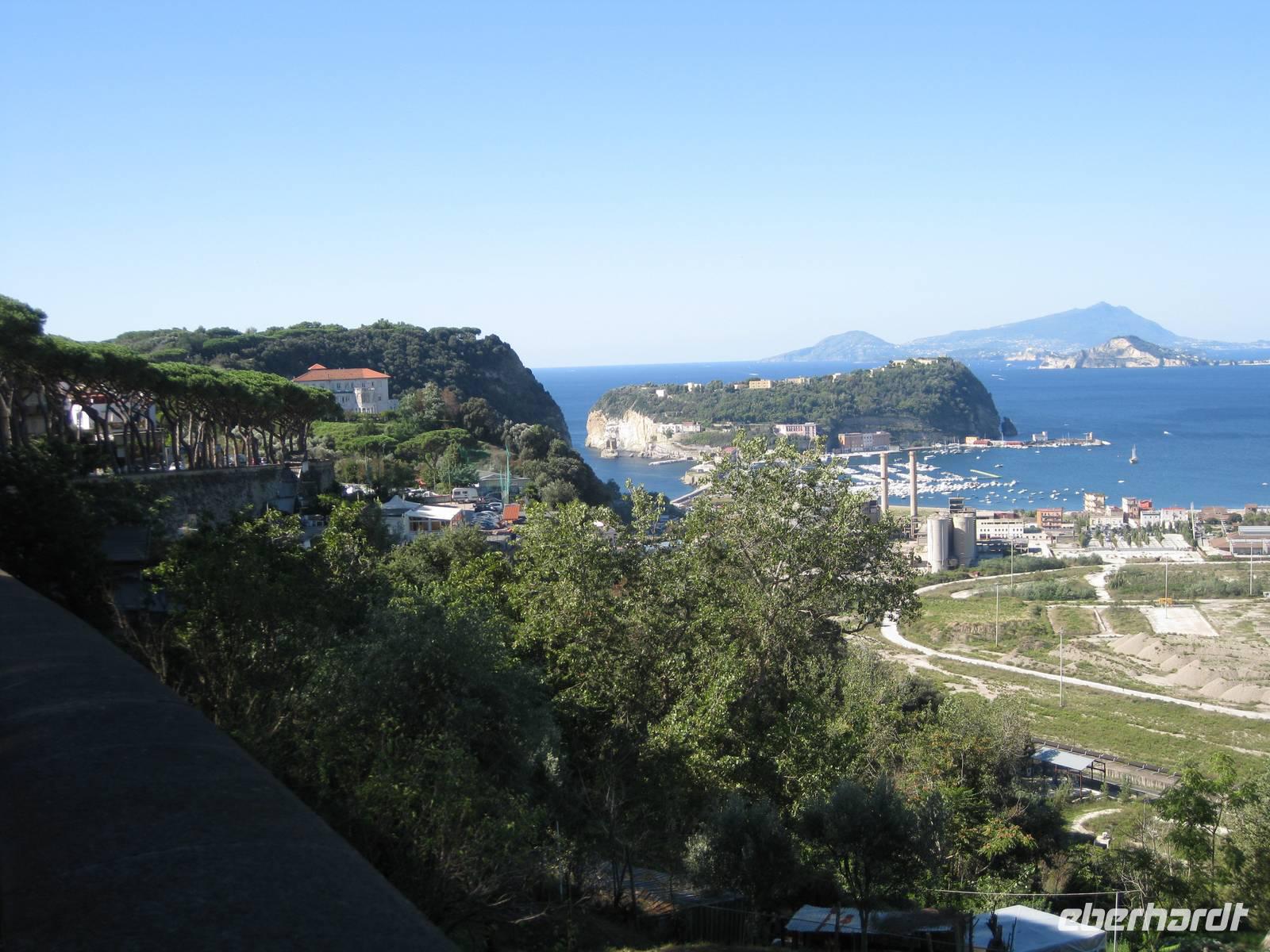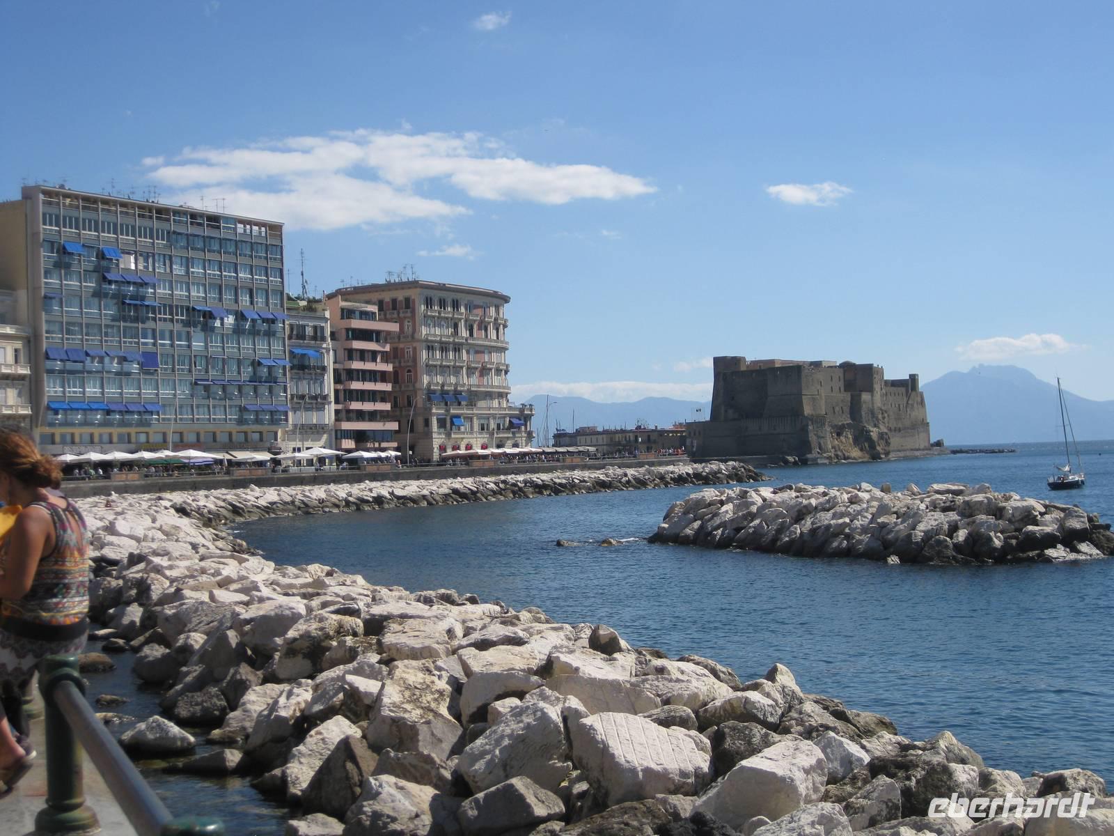 uns unsere Reiseleiterin, die mit uns den Tag in Neapel verbringt. Sie ruft den Bus, wir verstauen unser Gepäck und starten zur Stadtbesichtigung. Vom Flughafen bis in die Stadt ist es nur ein kurzes Stück. Sie zeigt und erklärt uns die wichtigsten Sehenswürdigkeiten. Wir sehen den Vesuv, das Wahrzeichen von Neapel, den Golf von Neapel mit den Inseln Ischia und Capri. Dann haben wir noch etwas Zeit für selbständige Erkundungen und einen kleinen Imbiss. 13.30 Uhr fahren wir zum Flughafen zurück und holen noch zwei Reisegäste ab. Sie kommen von Stuttgart geflogen. Nun sind wir komplett - 15 Gäste und ich als Reisebegleitung.