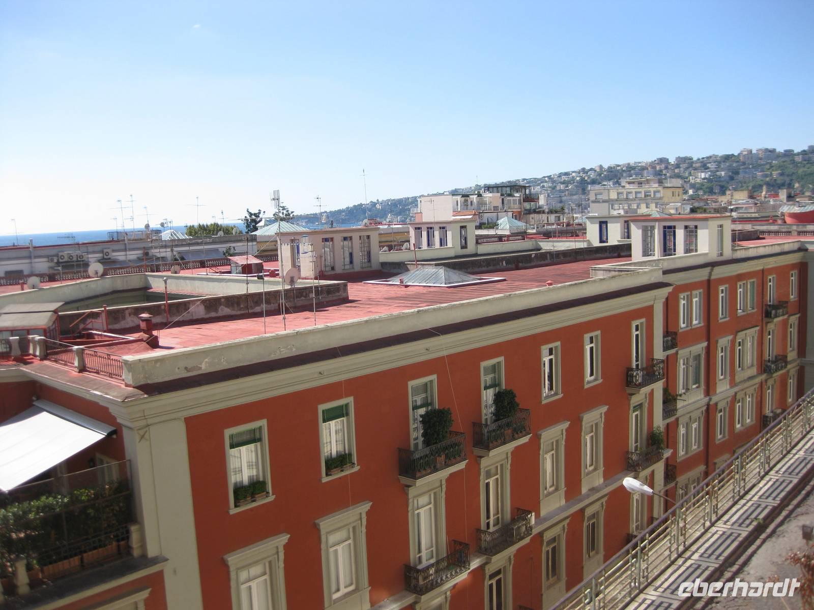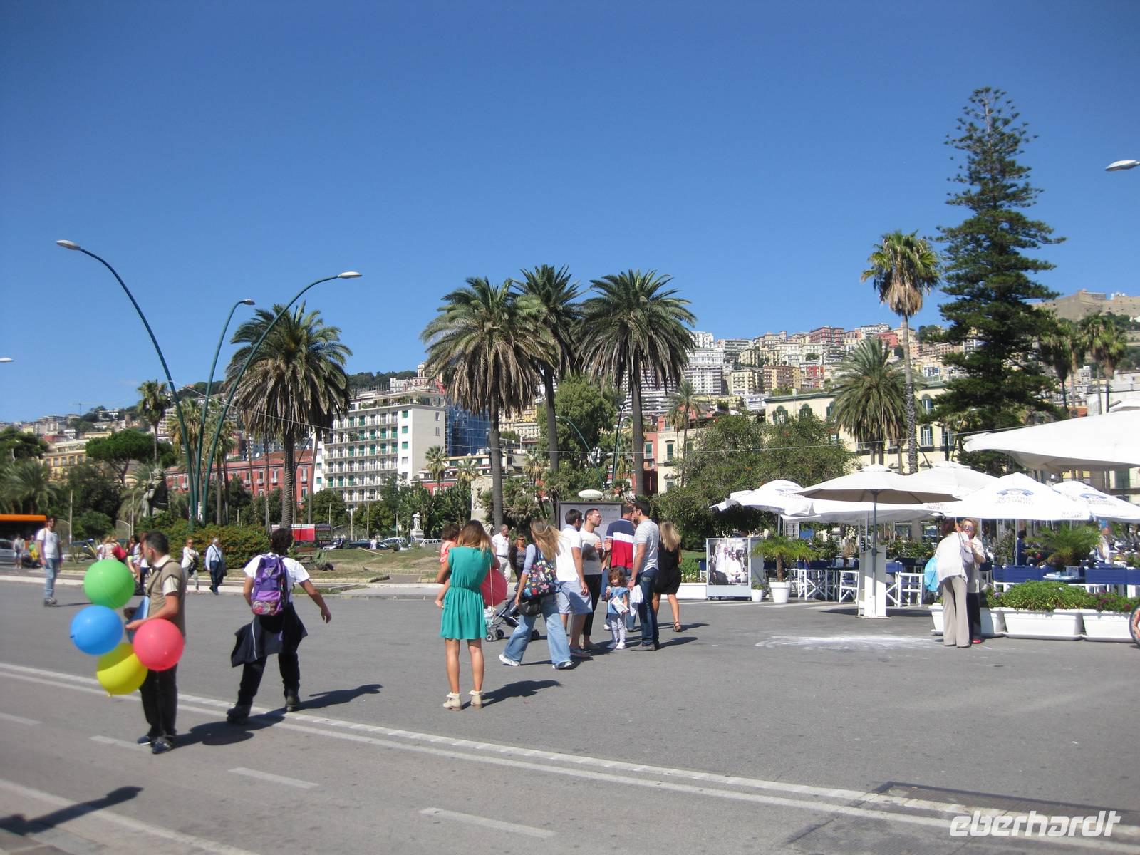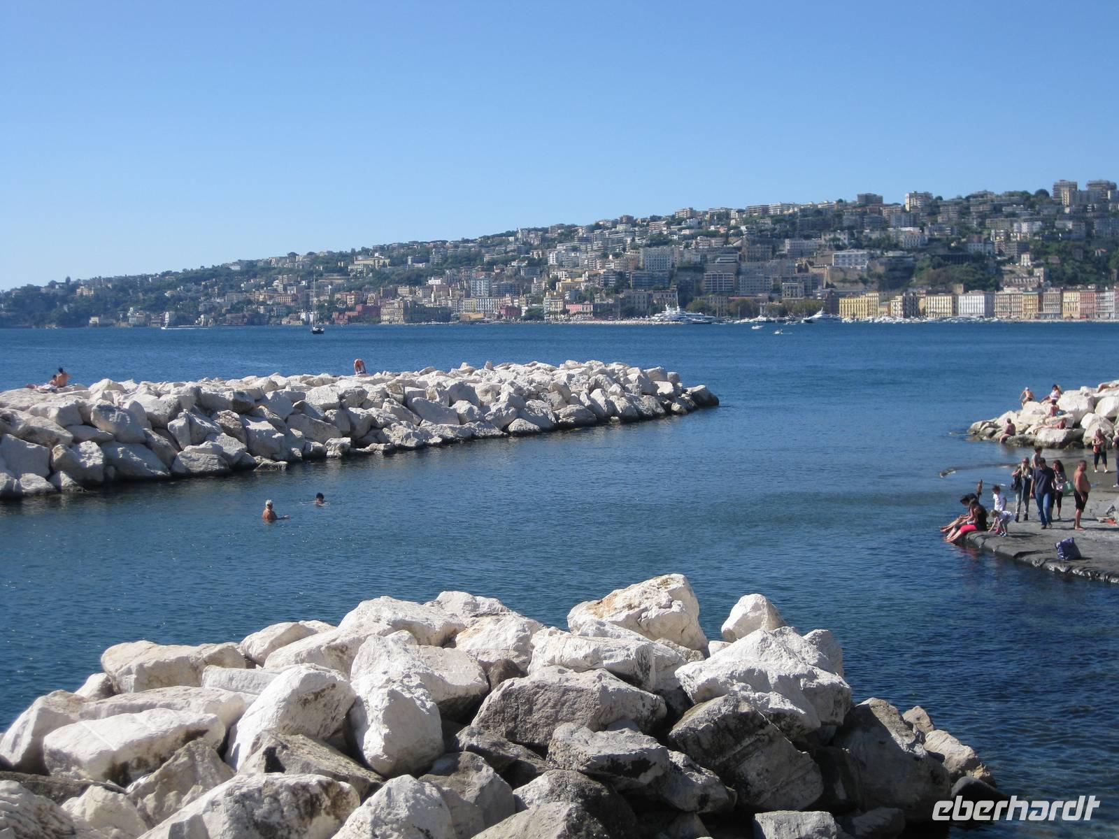 uns unsere Reiseleiterin, die mit uns den Tag in Neapel verbringt. Sie ruft den Bus, wir verstauen unser Gepäck und starten zur Stadtbesichtigung. Vom Flughafen bis in die Stadt ist es nur ein kurzes Stück. Sie zeigt und erklärt uns die wichtigsten Sehenswürdigkeiten. Wir sehen den Vesuv, das Wahrzeichen von Neapel, den Golf von Neapel mit den Inseln Ischia und Capri. Dann haben wir noch etwas Zeit für selbständige Erkundungen und einen kleinen Imbiss. 13.30 Uhr fahren wir zum Flughafen zurück und holen noch zwei Reisegäste ab. Sie kommen von Stuttgart geflogen. Nun sind wir komplett - 15 Gäste und ich als Reisebegleitung.