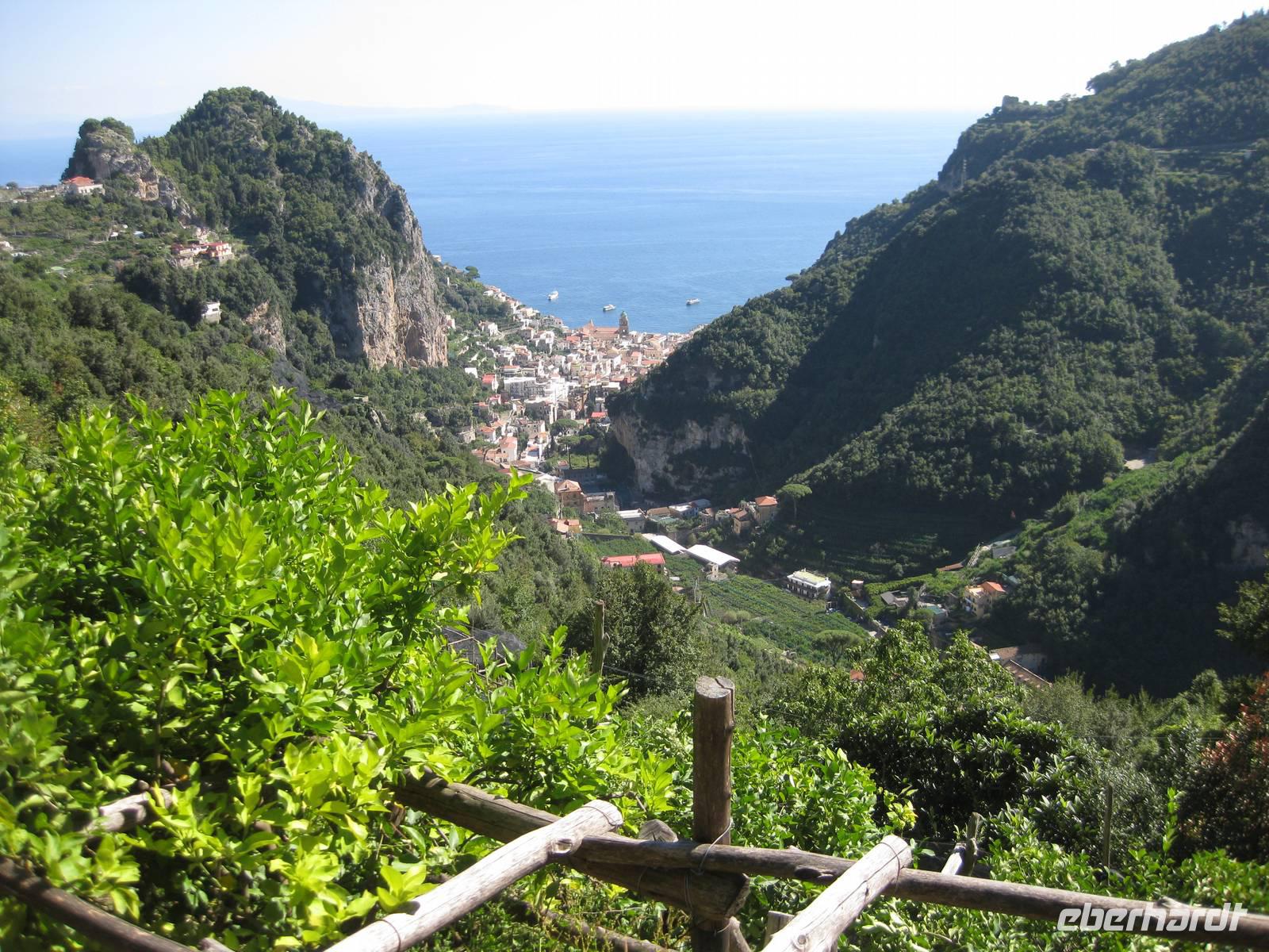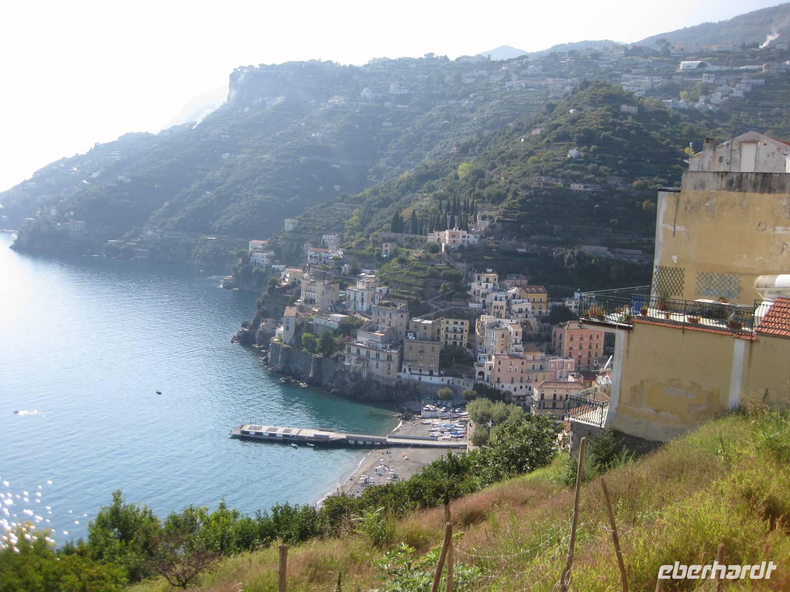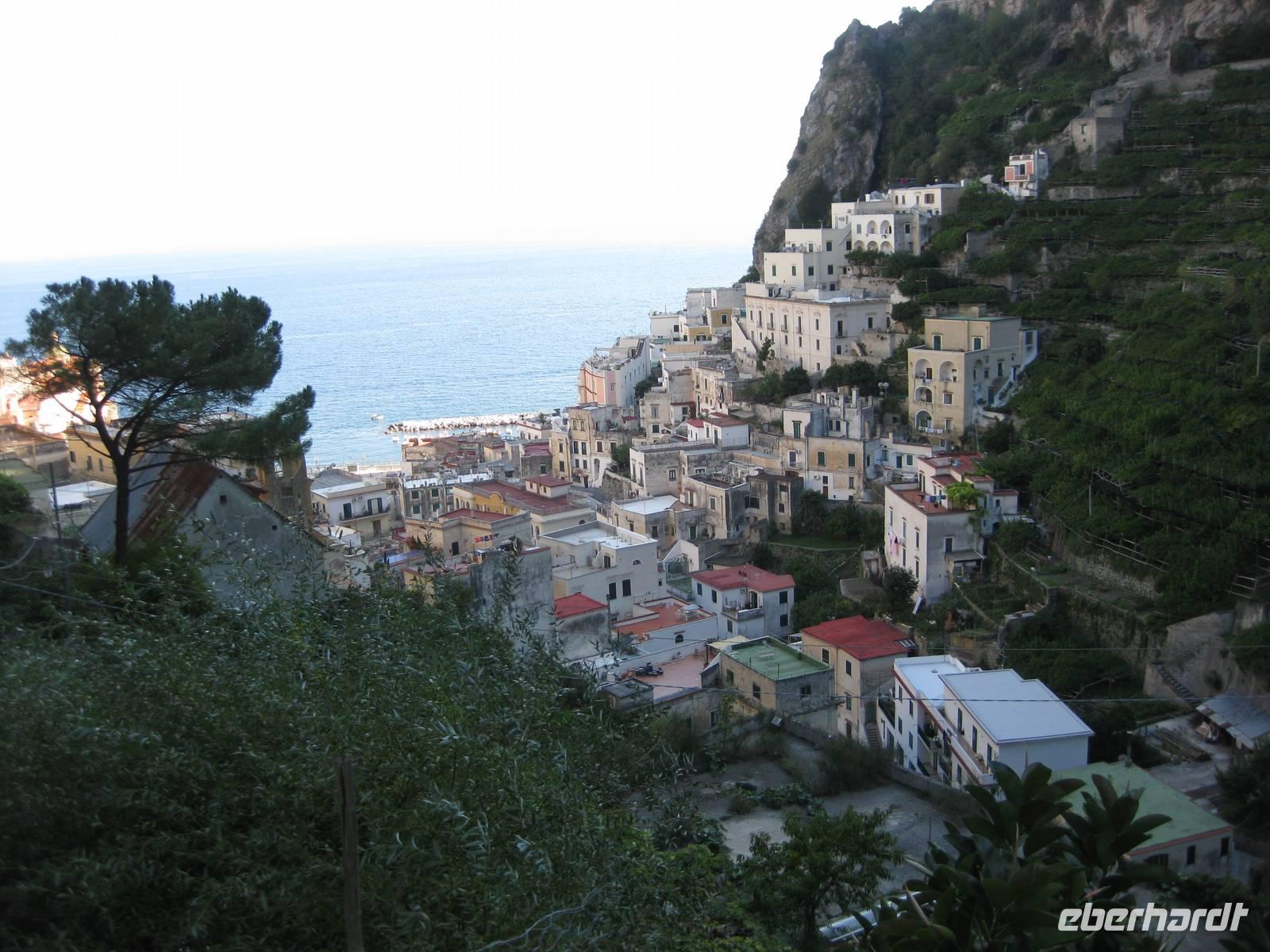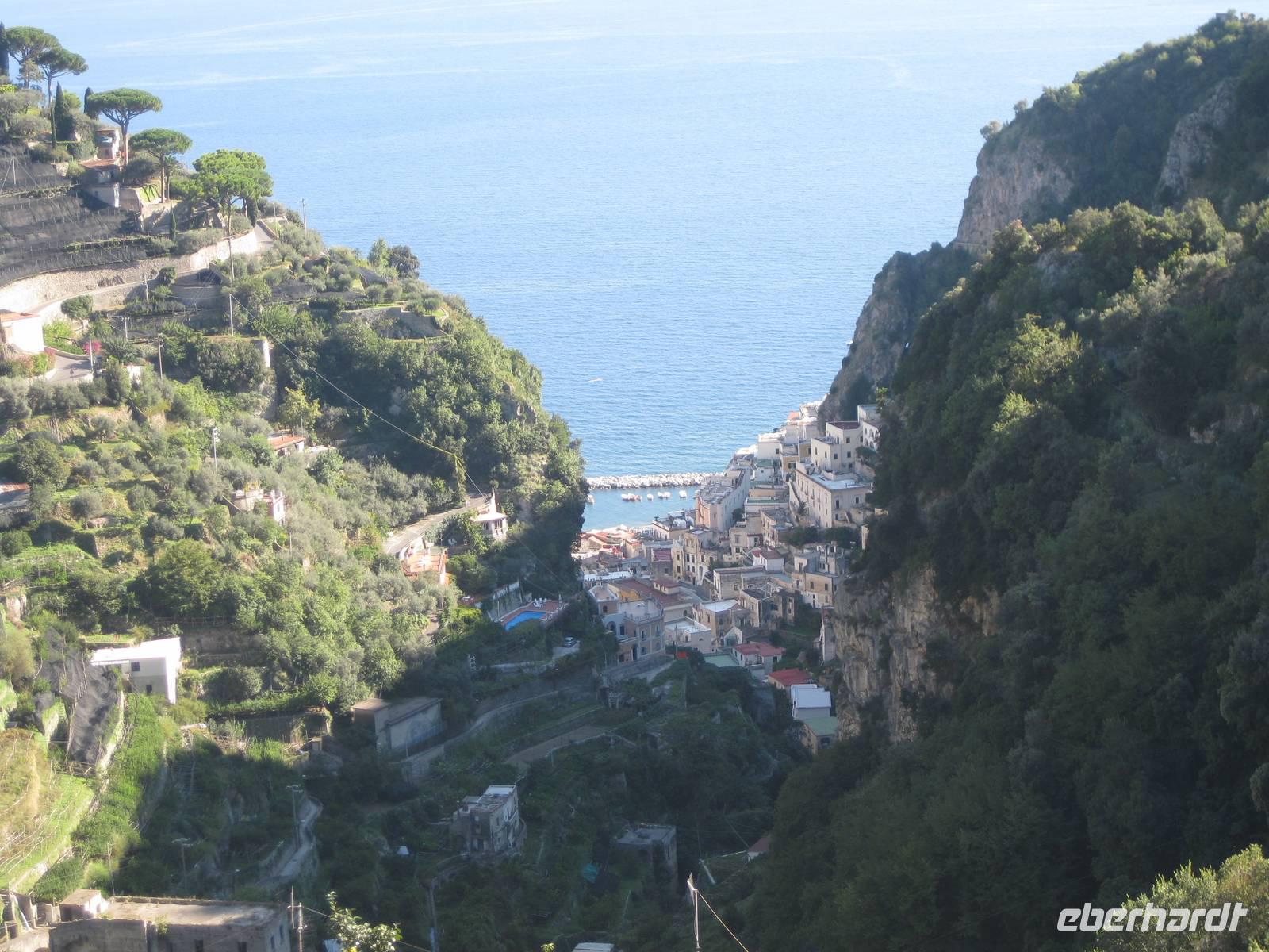 Nachdem wir ein Weilchen gerastet haben, nehmen wir den Abstieg nach Atrani, dem kleinsten Ort Italiens in Angriff. Der Abstieg ist gemäßigt. Am Nachmittag so gegen halb Fünf Uhr erreichen wir Atrani. Unser Bus holt uns ab und wir fahren zurück nach Minori.