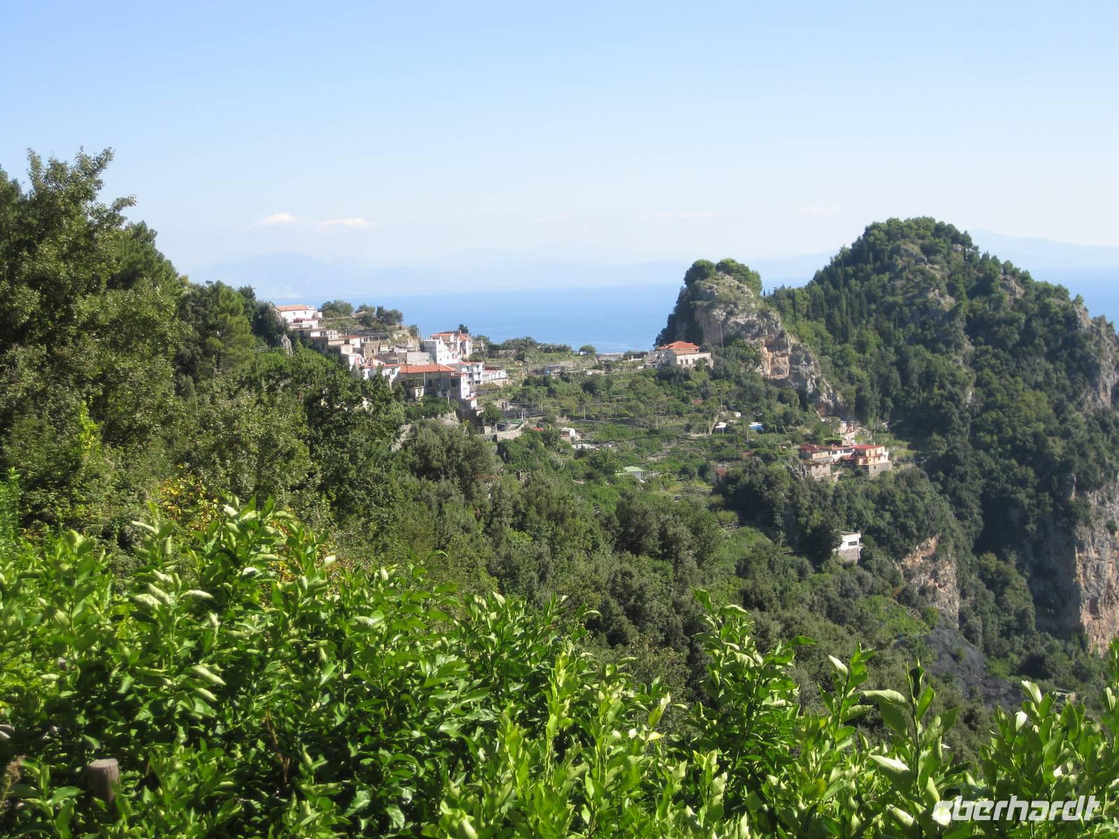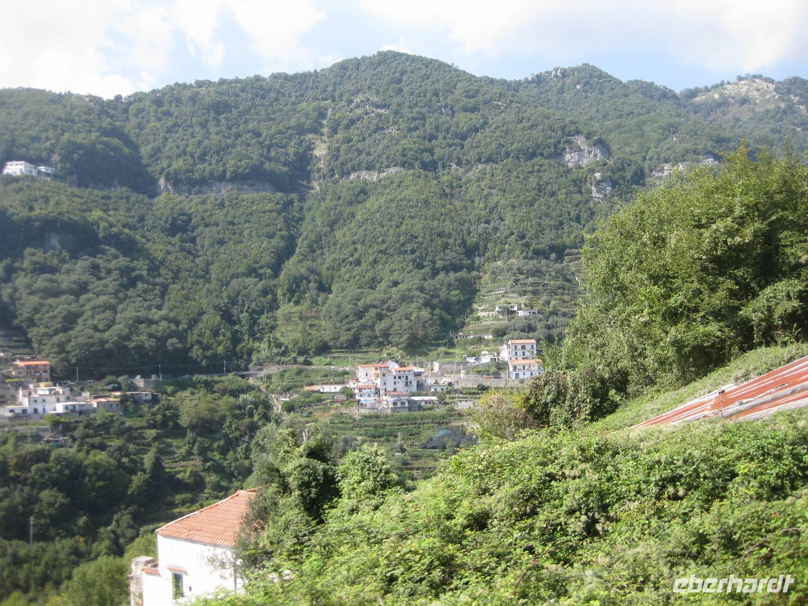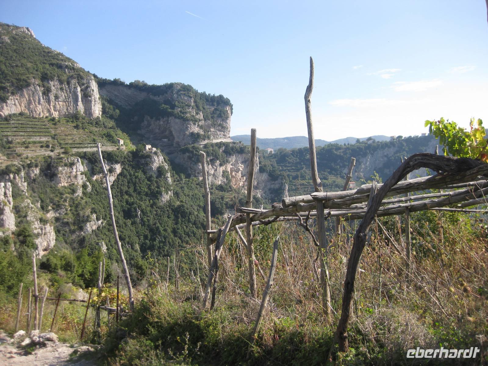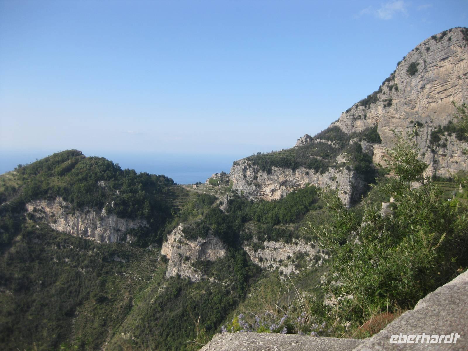 Dann geht es weiter hinauf in Richtung Pontone. Der Weg wird wieder lichter, es gibt wunderbare Blicke in das Tal und auch hinauf zu den Felsen. Schließlich erreichen wir Pontone, wo sich uns atembauraubende Aussichten auf Amalfi bieten. In Pontone rasten wir, essen von den in Amalfi gekauften Leckereien und genehmigen uns einen Becher Rotwein dazu.
