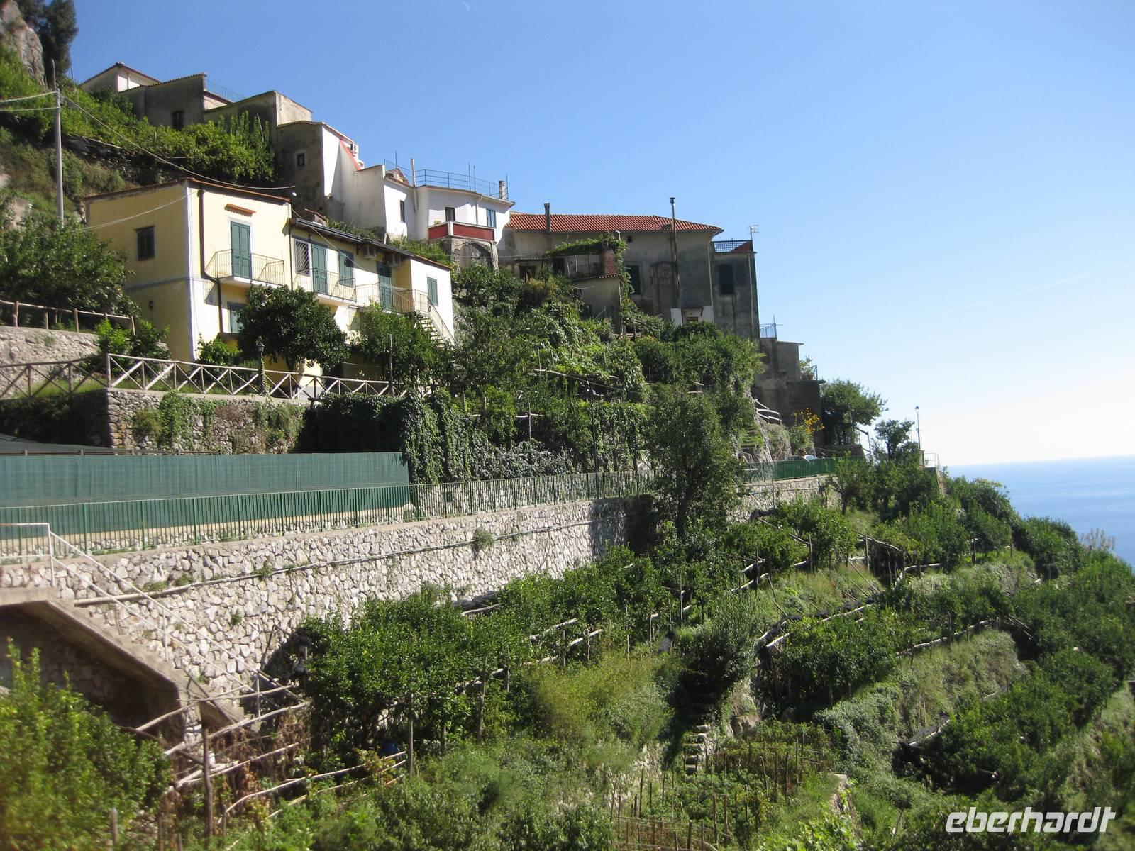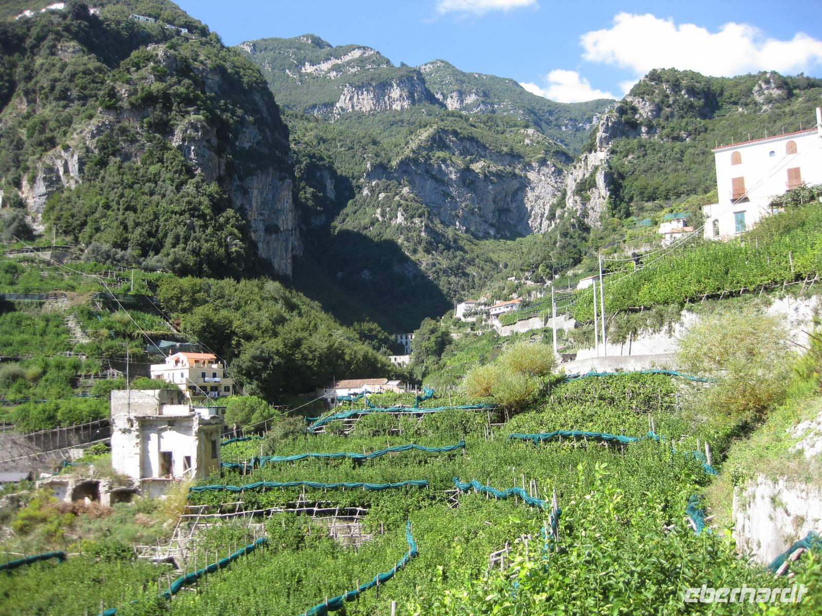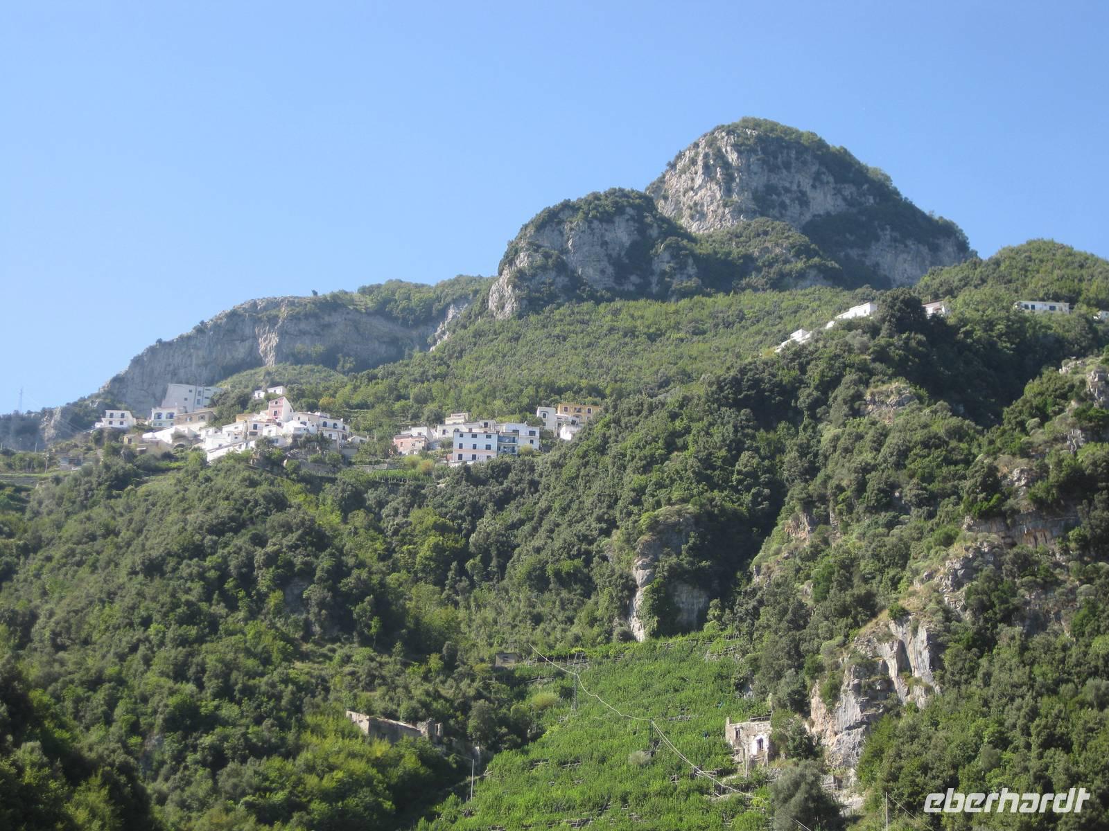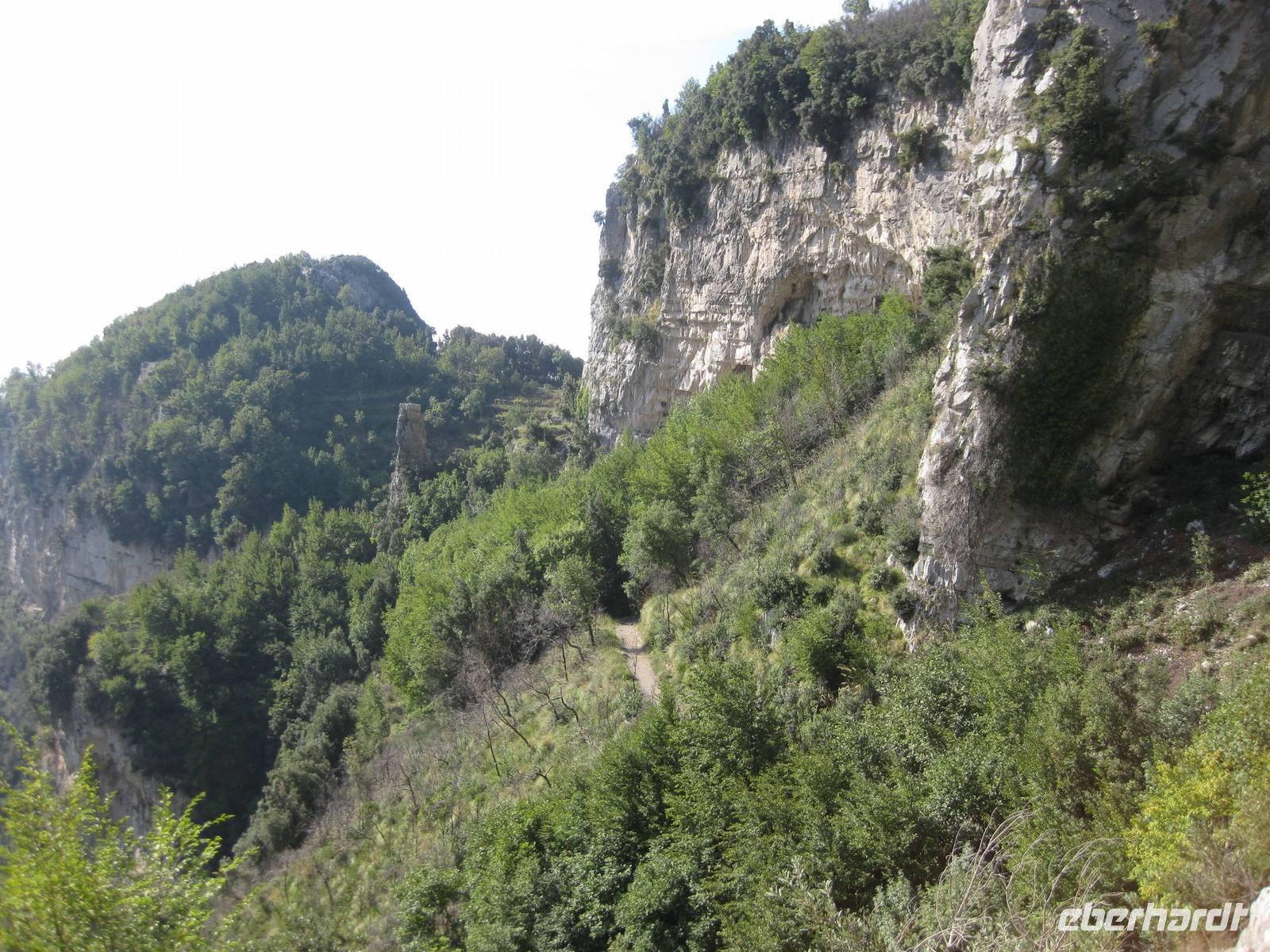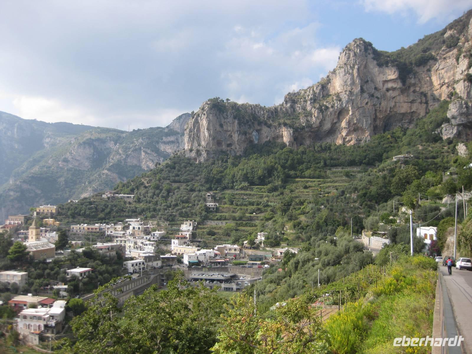 Dann geht es weiter hinauf in Richtung Pontone. Der Weg wird wieder lichter, es gibt wunderbare Blicke in das Tal und auch hinauf zu den Felsen. Schließlich erreichen wir Pontone, wo sich uns atembauraubende Aussichten auf Amalfi bieten. In Pontone rasten wir, essen von den in Amalfi gekauften Leckereien und genehmigen uns einen Becher Rotwein dazu.