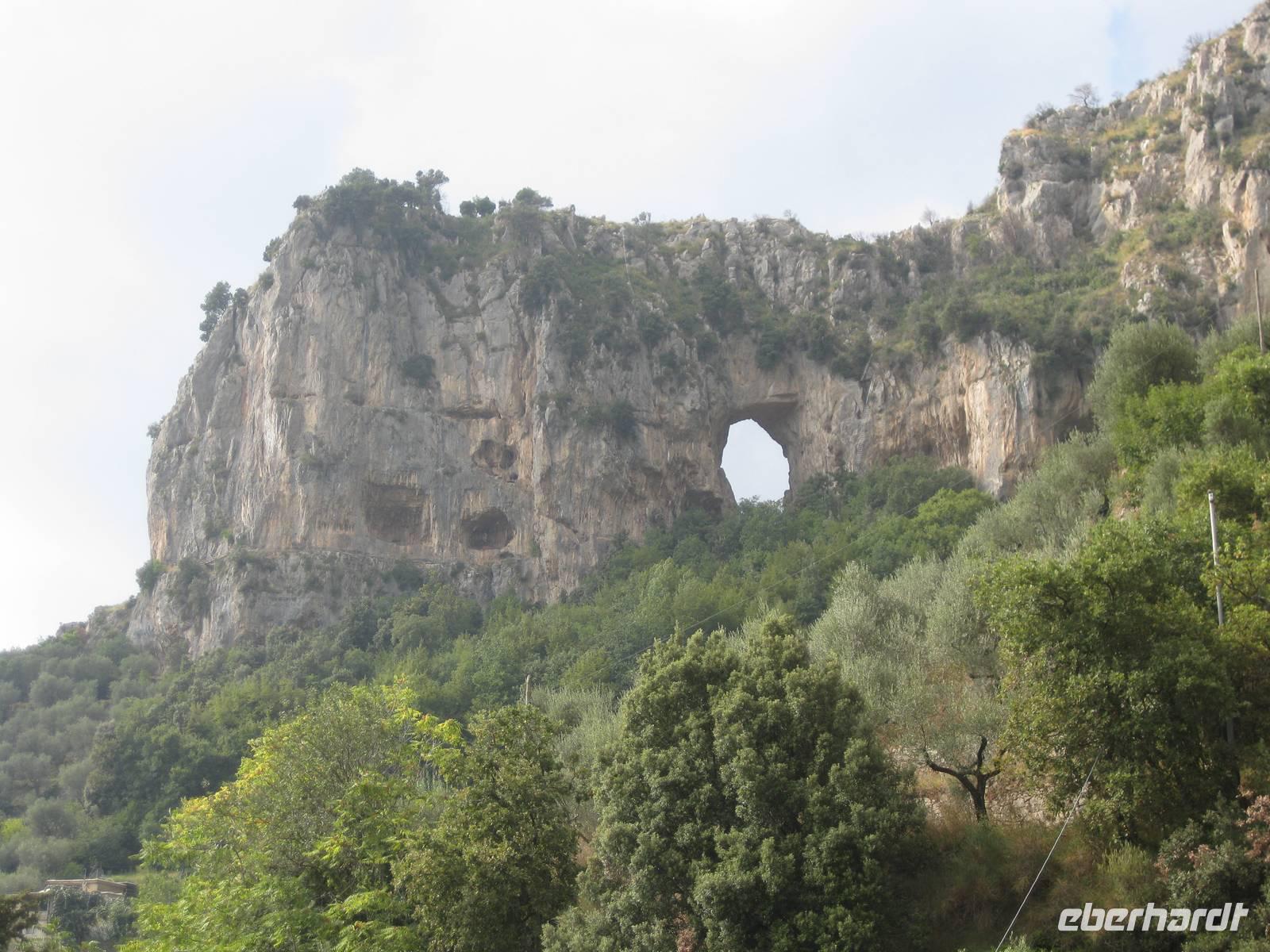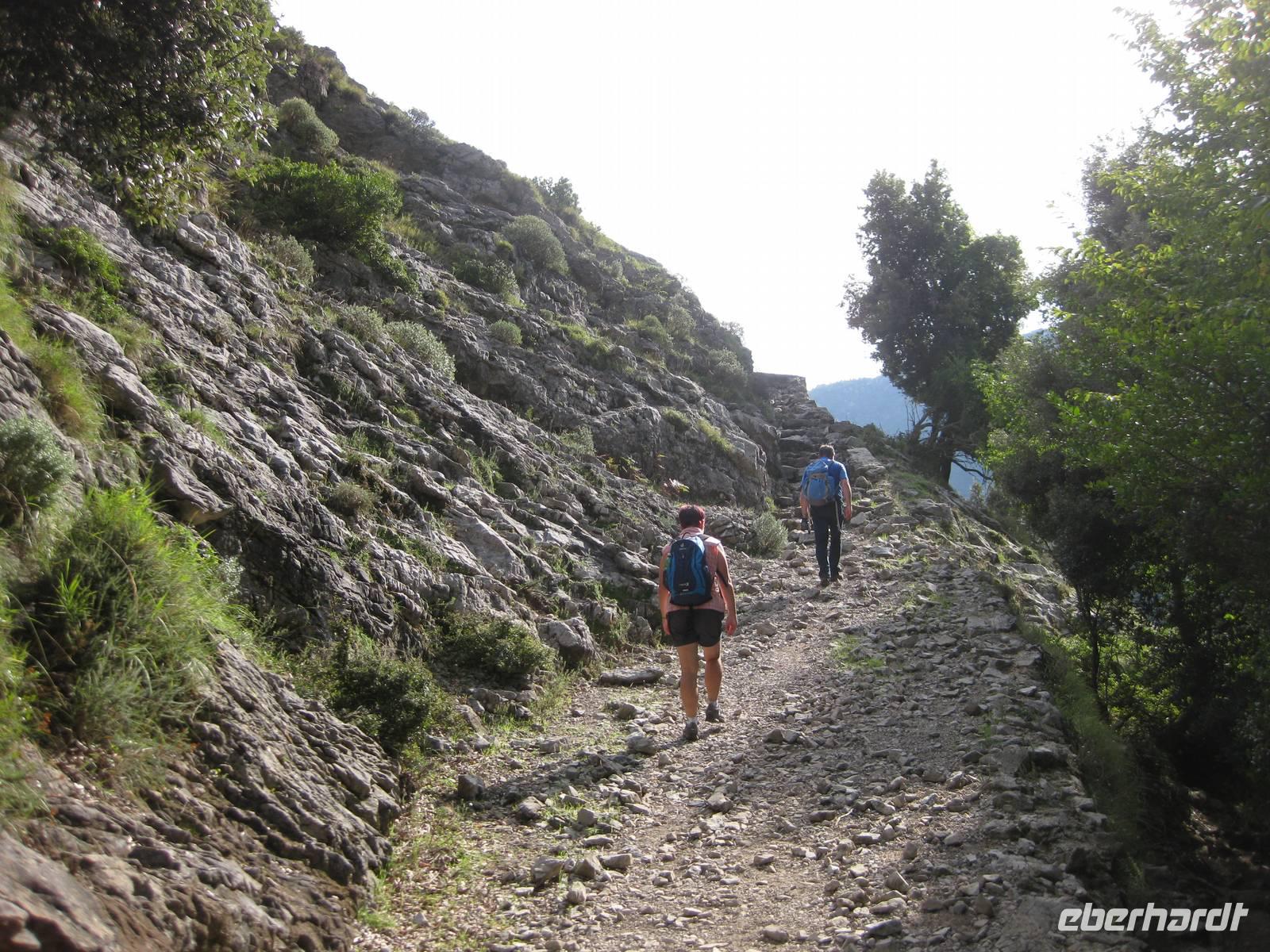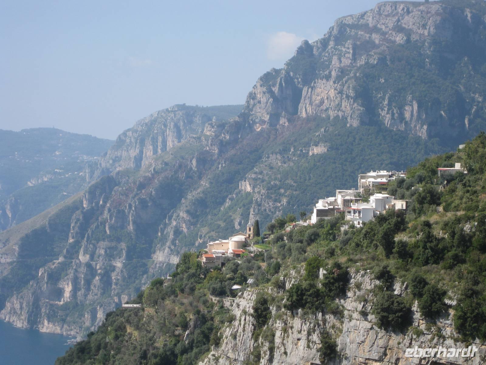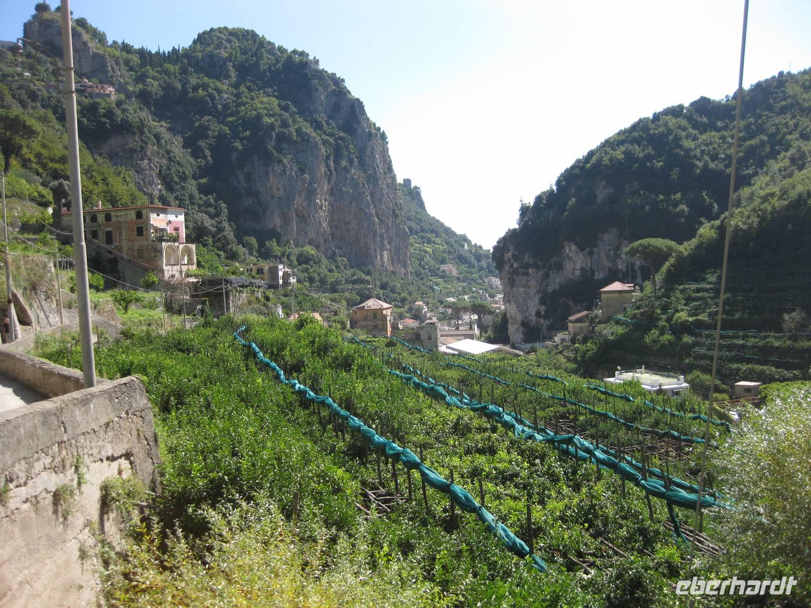 Dann geht es weiter hinauf in Richtung Pontone. Der Weg wird wieder lichter, es gibt wunderbare Blicke in das Tal und auch hinauf zu den Felsen. Schließlich erreichen wir Pontone, wo sich uns atembauraubende Aussichten auf Amalfi bieten. In Pontone rasten wir, essen von den in Amalfi gekauften Leckereien und genehmigen uns einen Becher Rotwein dazu.