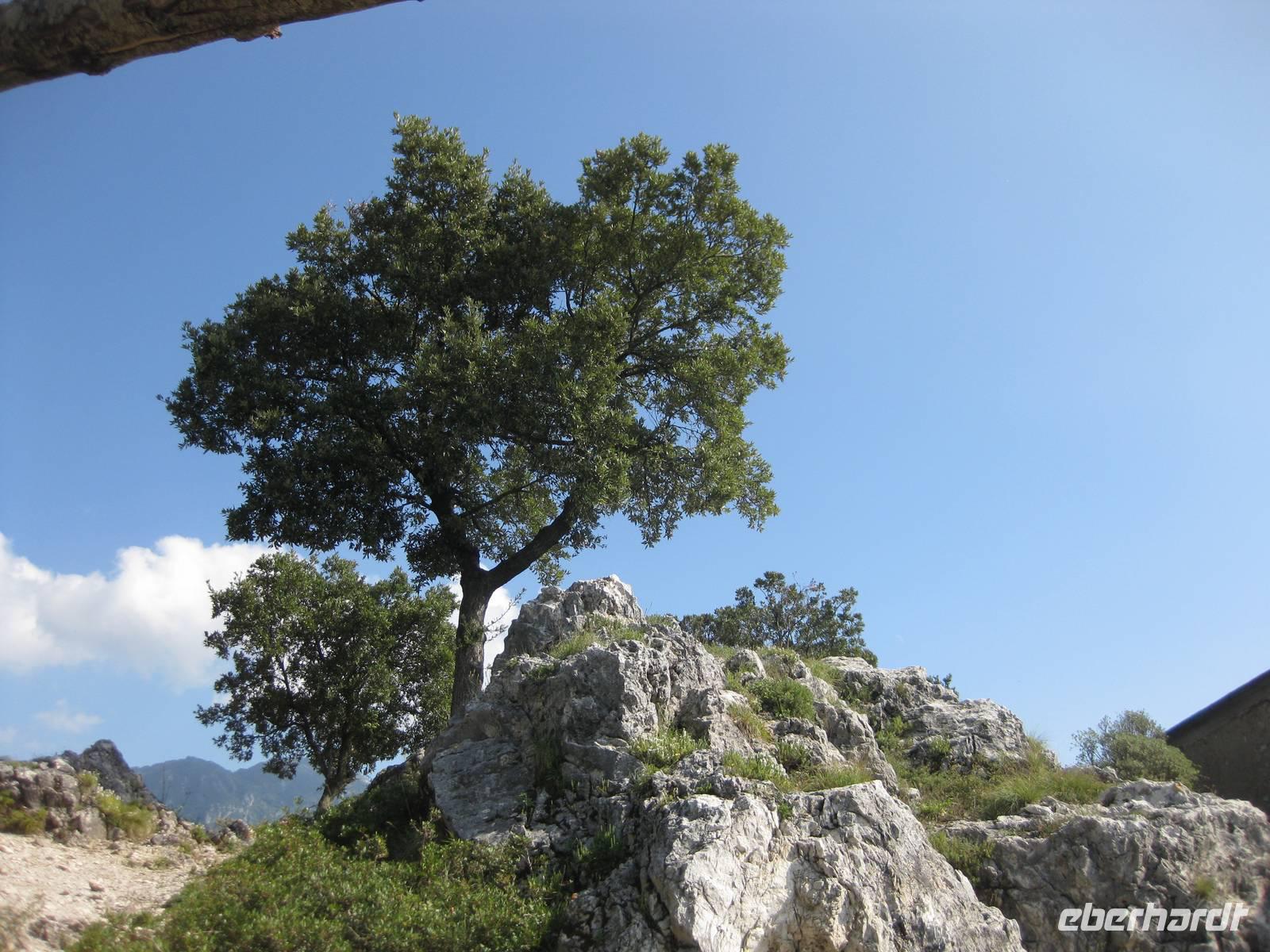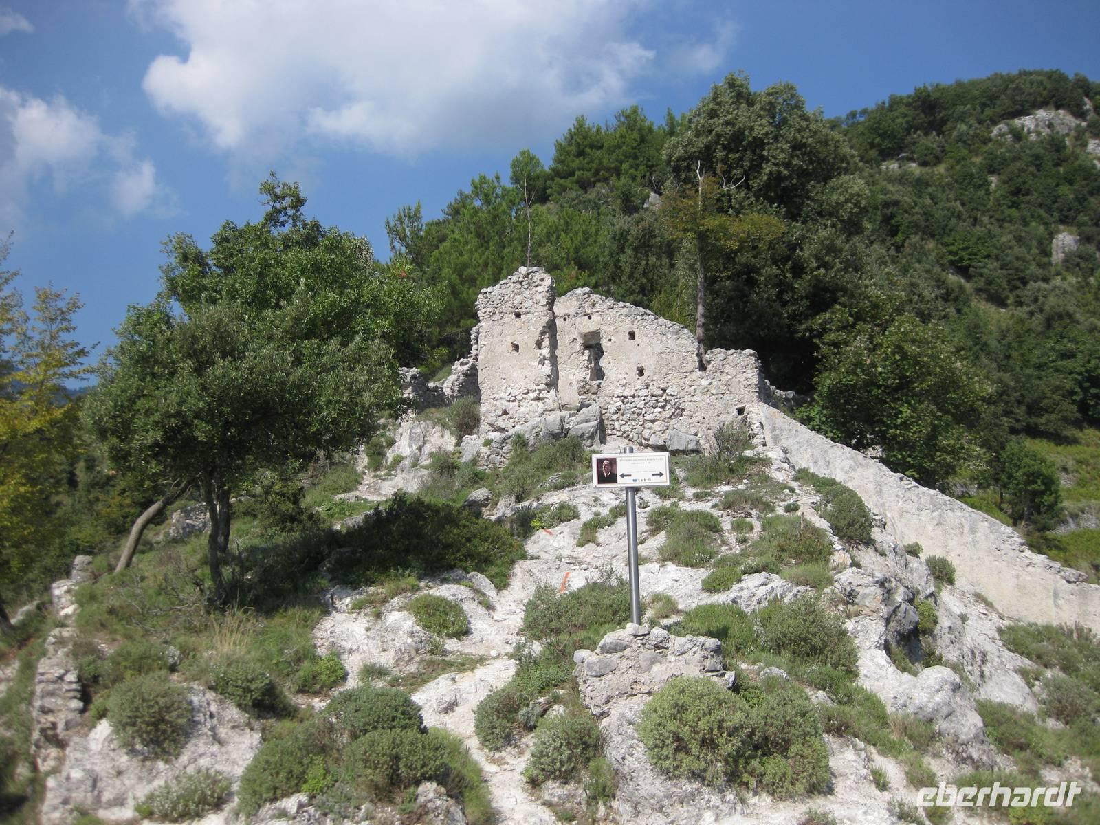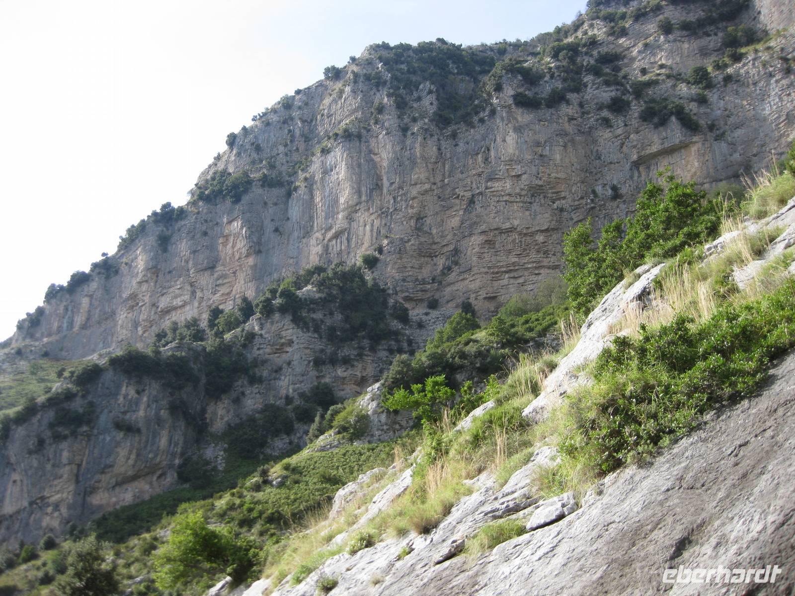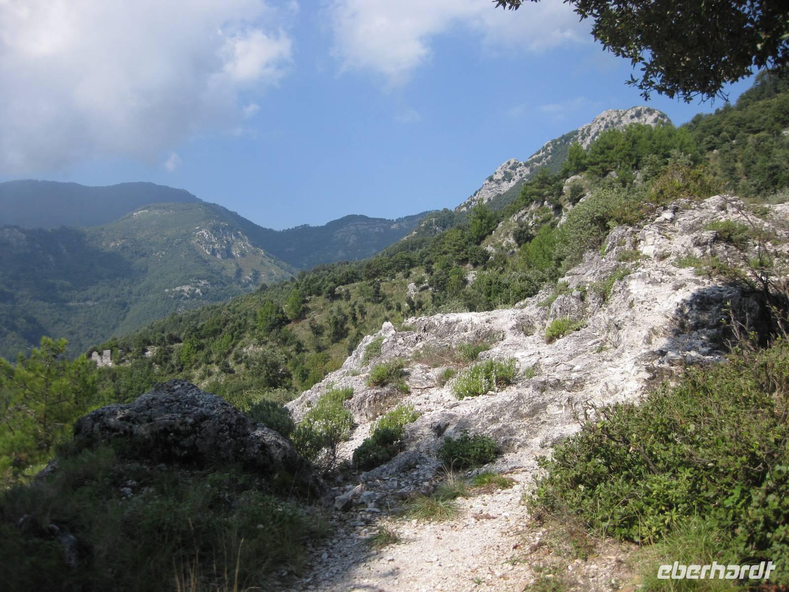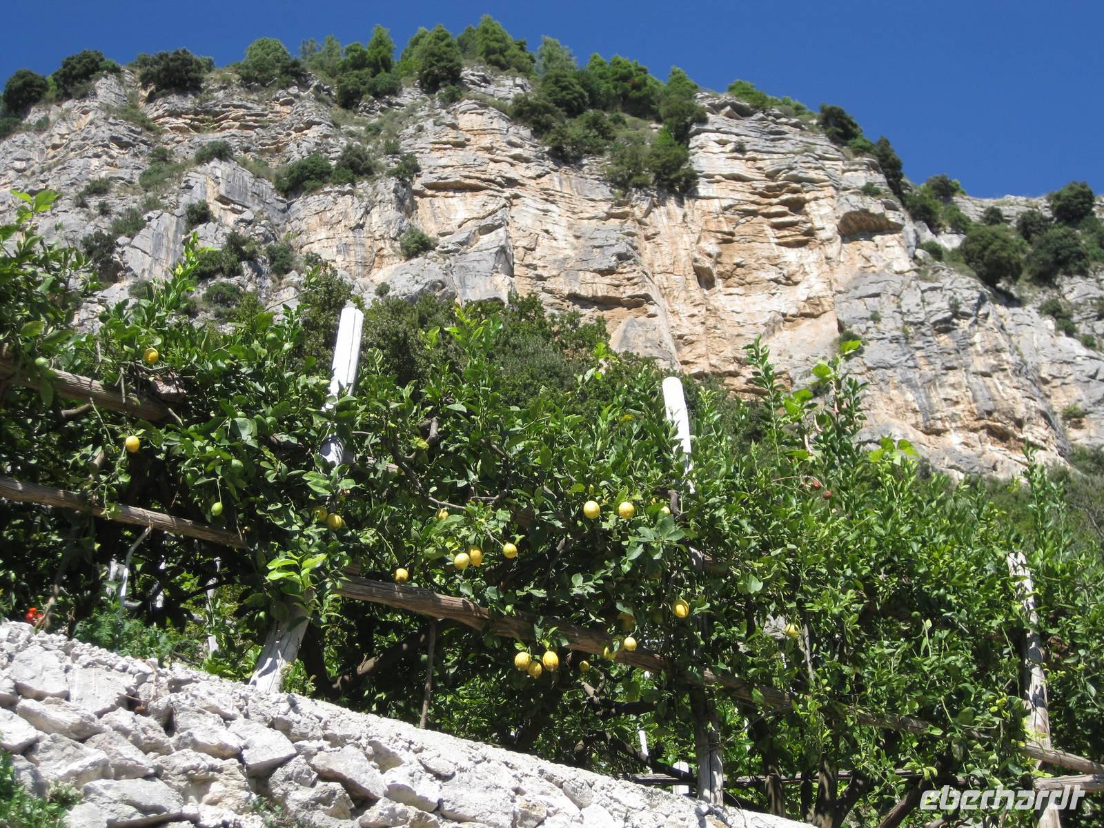 Dann geht es weiter hinauf in Richtung Pontone. Der Weg wird wieder lichter, es gibt wunderbare Blicke in das Tal und auch hinauf zu den Felsen. Schließlich erreichen wir Pontone, wo sich uns atembauraubende Aussichten auf Amalfi bieten. In Pontone rasten wir, essen von den in Amalfi gekauften Leckereien und genehmigen uns einen Becher Rotwein dazu.