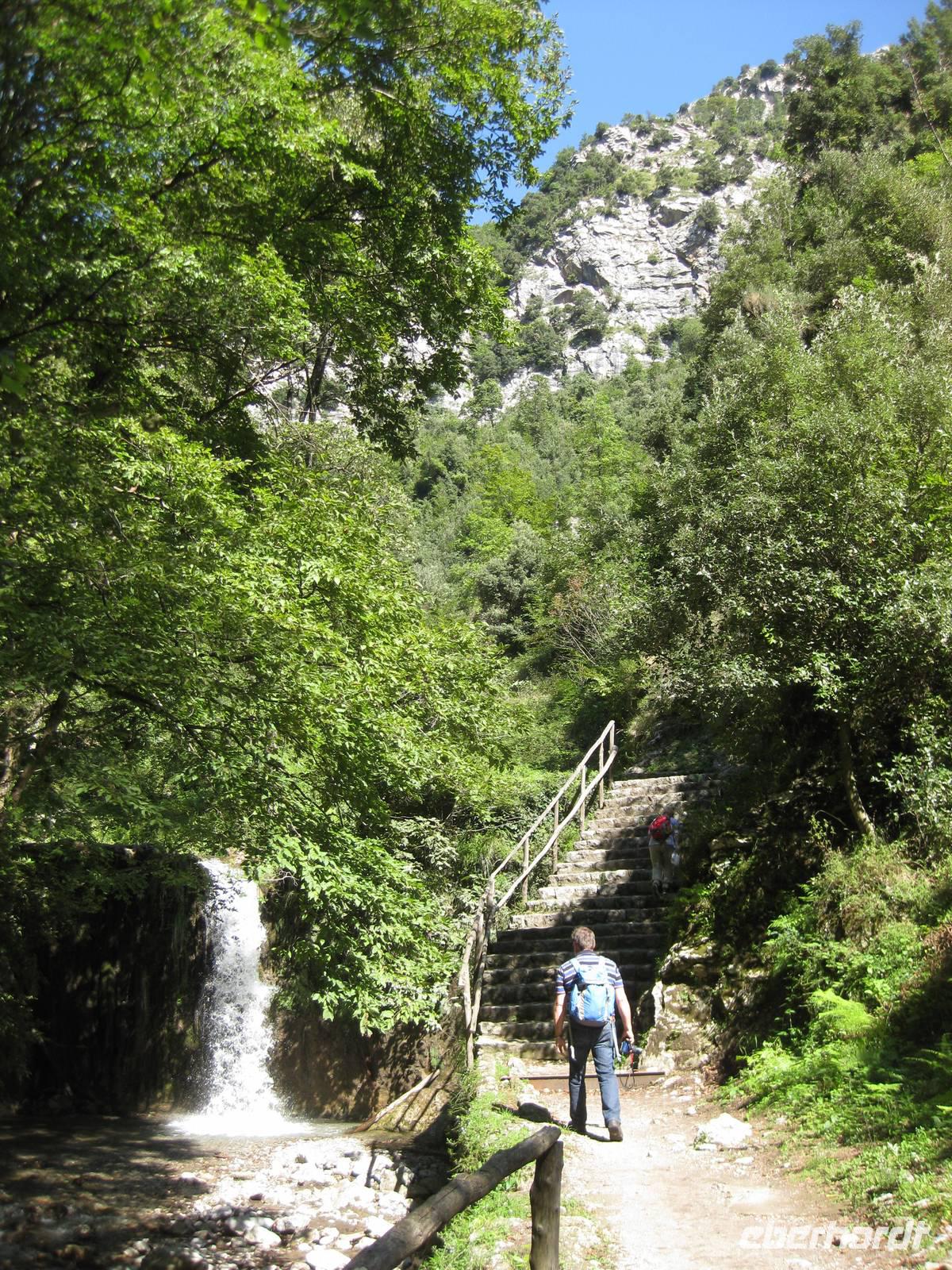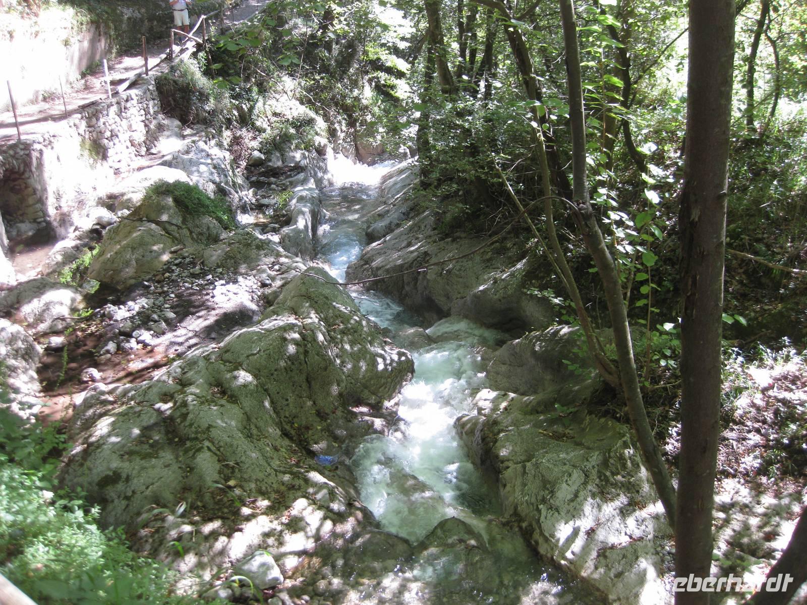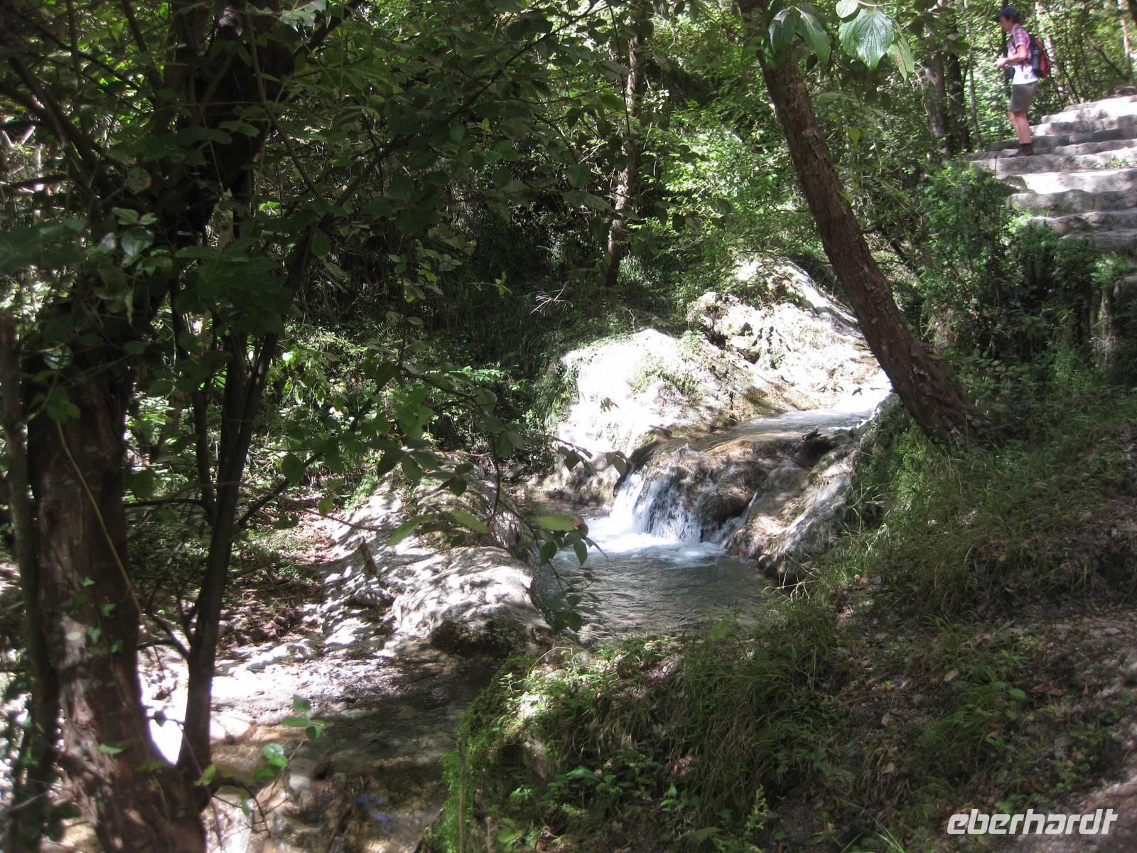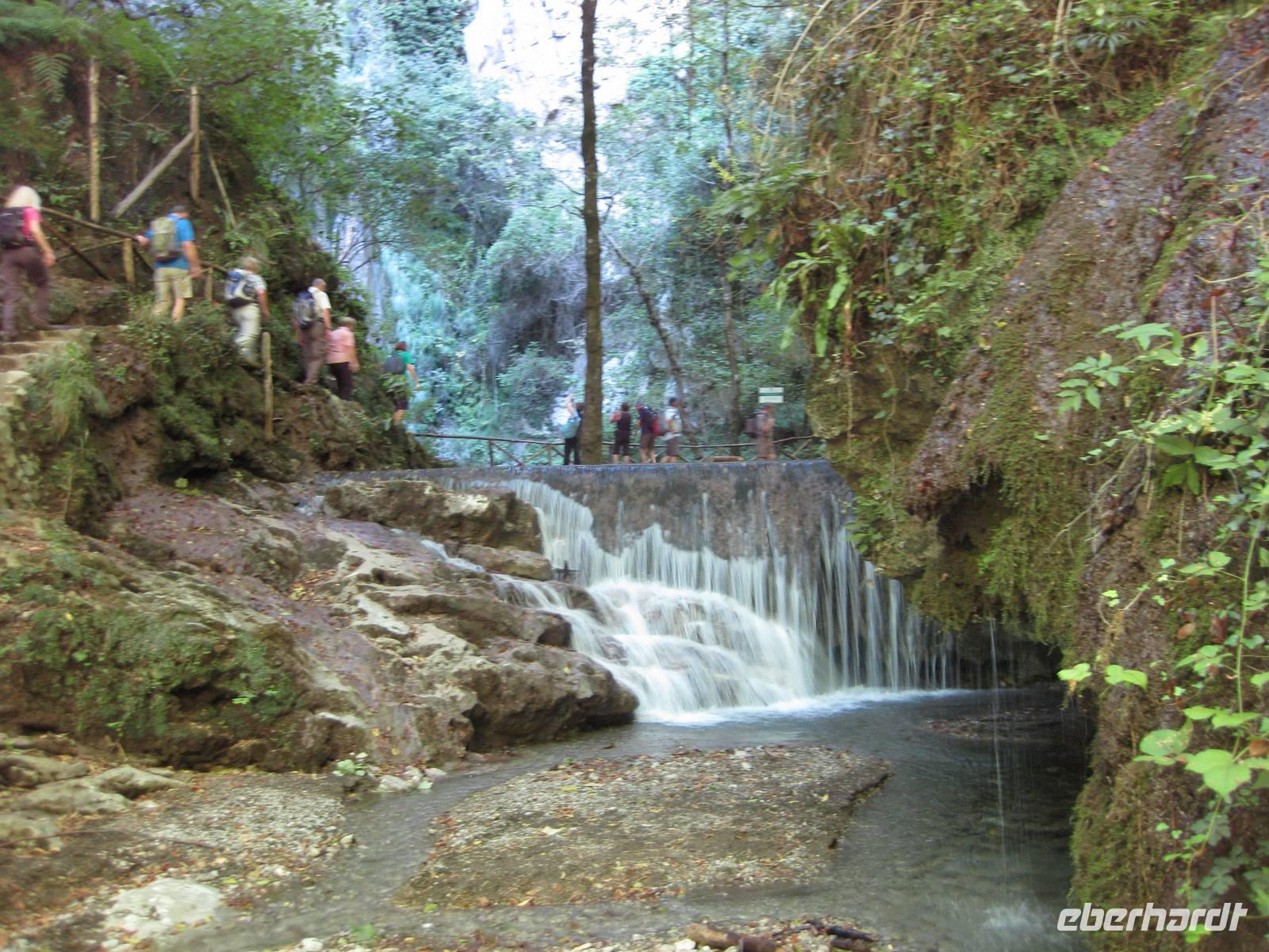 Nach dem Besuch des Papiermuseums starten wir nun unsere Wanderung durch das Mühlental. Es ist der untere Teil des Eisenhüttentals, in dem auch Amalfi liegt. Der Weg führt uns erst einmal oberhalb von Zitronenplantagen bis in's Tal. Dort geht der Weg unter Bäumen direkt am Flüsschen Canneto entlang, immer ganz leicht bergauf. Am Wegesrand können wir kleine Alpenveilchen bewundern. Am Ende des Tales erreichen wir ein Naturreservat mit vielen Wasserfällen. Hier ist es angenehm kühl. Und es gibt hier auch ein Farnkraut aus der Steinzeit zu bewundern.