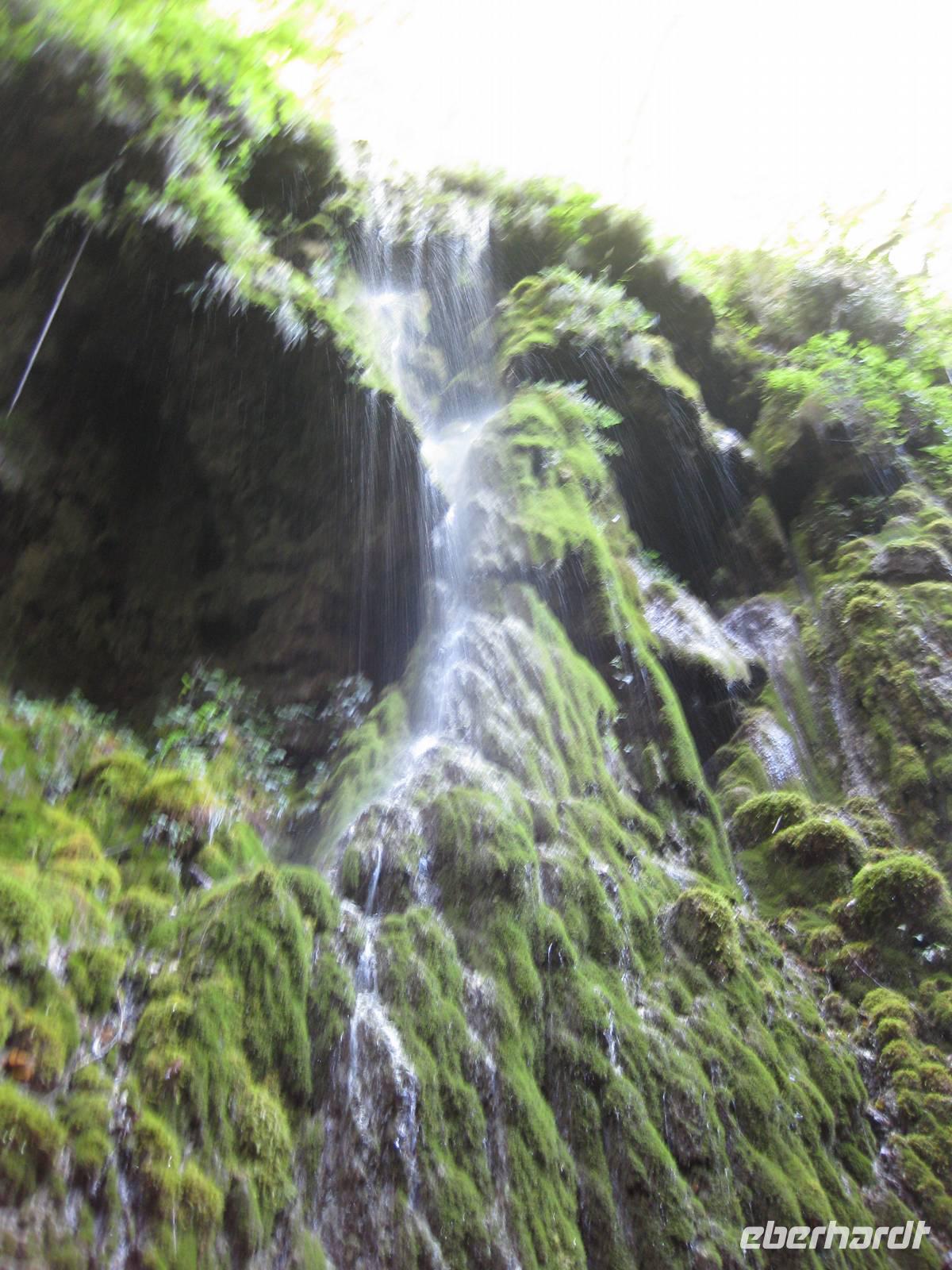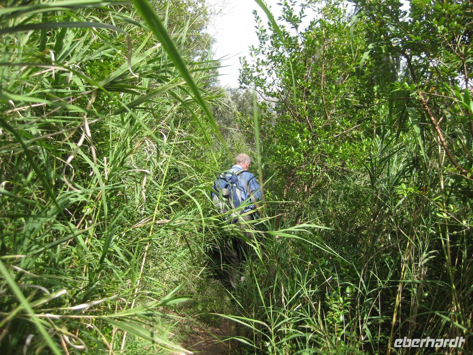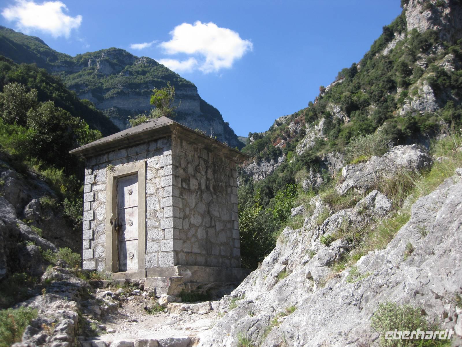 Nach dem Besuch des Papiermuseums starten wir nun unsere Wanderung durch das Mühlental. Es ist der untere Teil des Eisenhüttentals, in dem auch Amalfi liegt. Der Weg führt uns erst einmal oberhalb von Zitronenplantagen bis in's Tal. Dort geht der Weg unter Bäumen direkt am Flüsschen Canneto entlang, immer ganz leicht bergauf. Am Wegesrand können wir kleine Alpenveilchen bewundern. Am Ende des Tales erreichen wir ein Naturreservat mit vielen Wasserfällen. Hier ist es angenehm kühl. Und es gibt hier auch ein Farnkraut aus der Steinzeit zu bewundern.