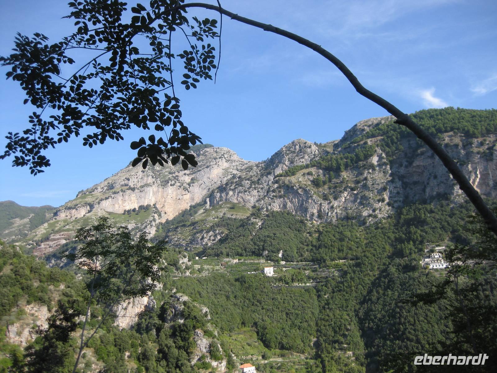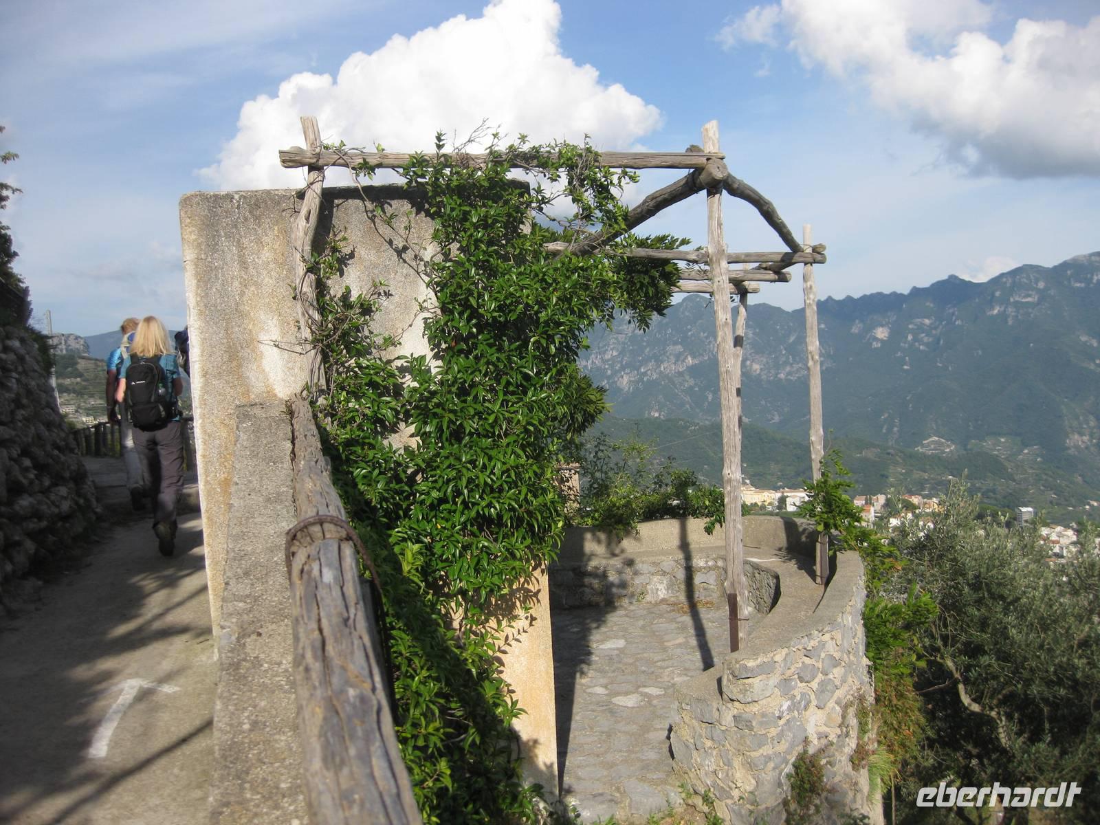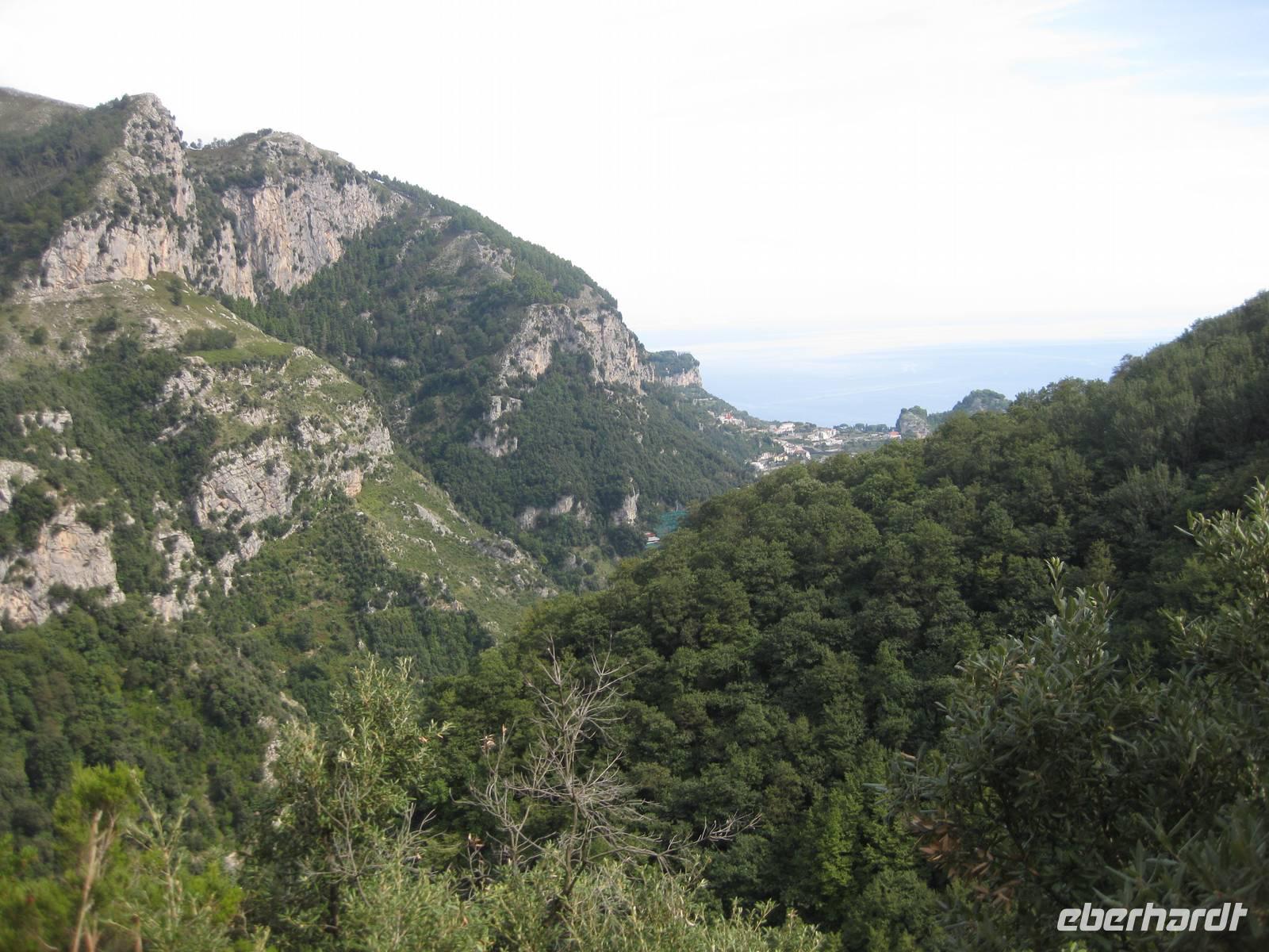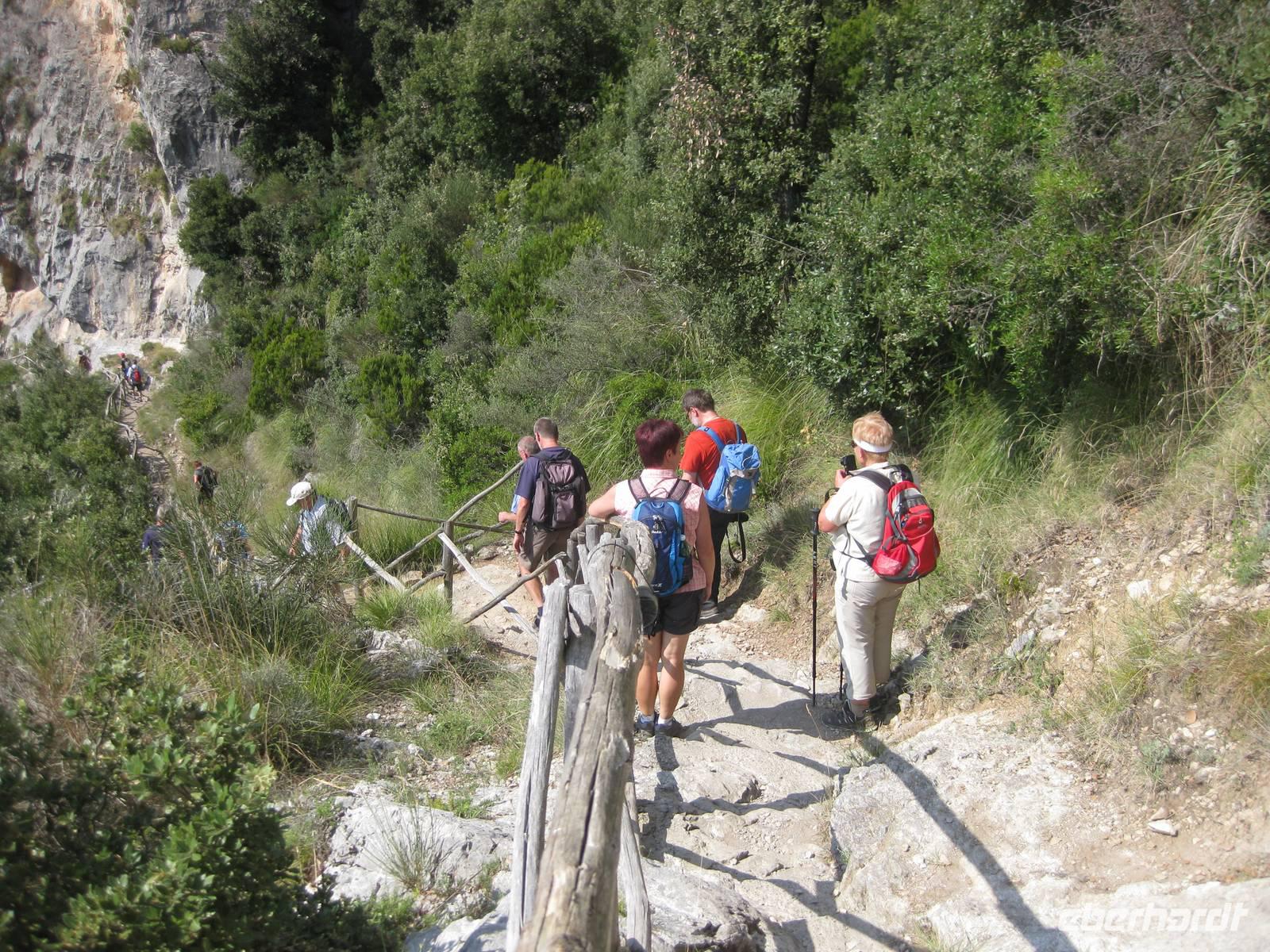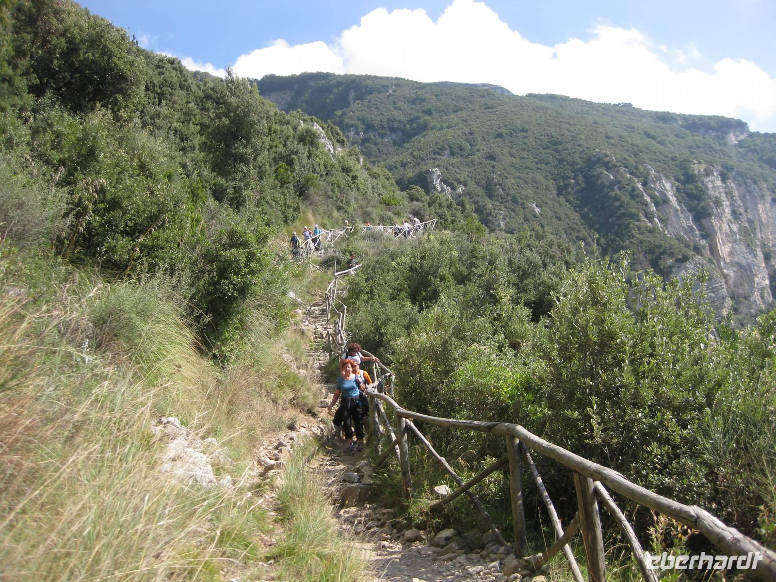 Nach dem Mittagessen verabschieden sich noch zwei Gäste, ihre Frauen sind in Amalfi geblieben. Wir anderen begeben uns auf die Wanderung in's obere Eisenhüttental. Der Weg, oft auch nur ein schmaler Pfad, ist charakteristisch für die Monti Lattari. Er führt uns durch Wälder mit einer z.T. sehr üppigen Vegetation, an Bächen entlang und an steilen zerklüfteten Felswänden vorbei. Wir erreichen Campidoglio. Von hier aus können wir einen letzten Blick auf Amalfi werfen. Dann geht es weiter bis nach Scala. Von dort aus haben wir noch mal einen fantastischen Blick auf Ravello und die Amalfiküste. Hier holt uns der Bus wieder ab und wir fahren zurück nach Minori.