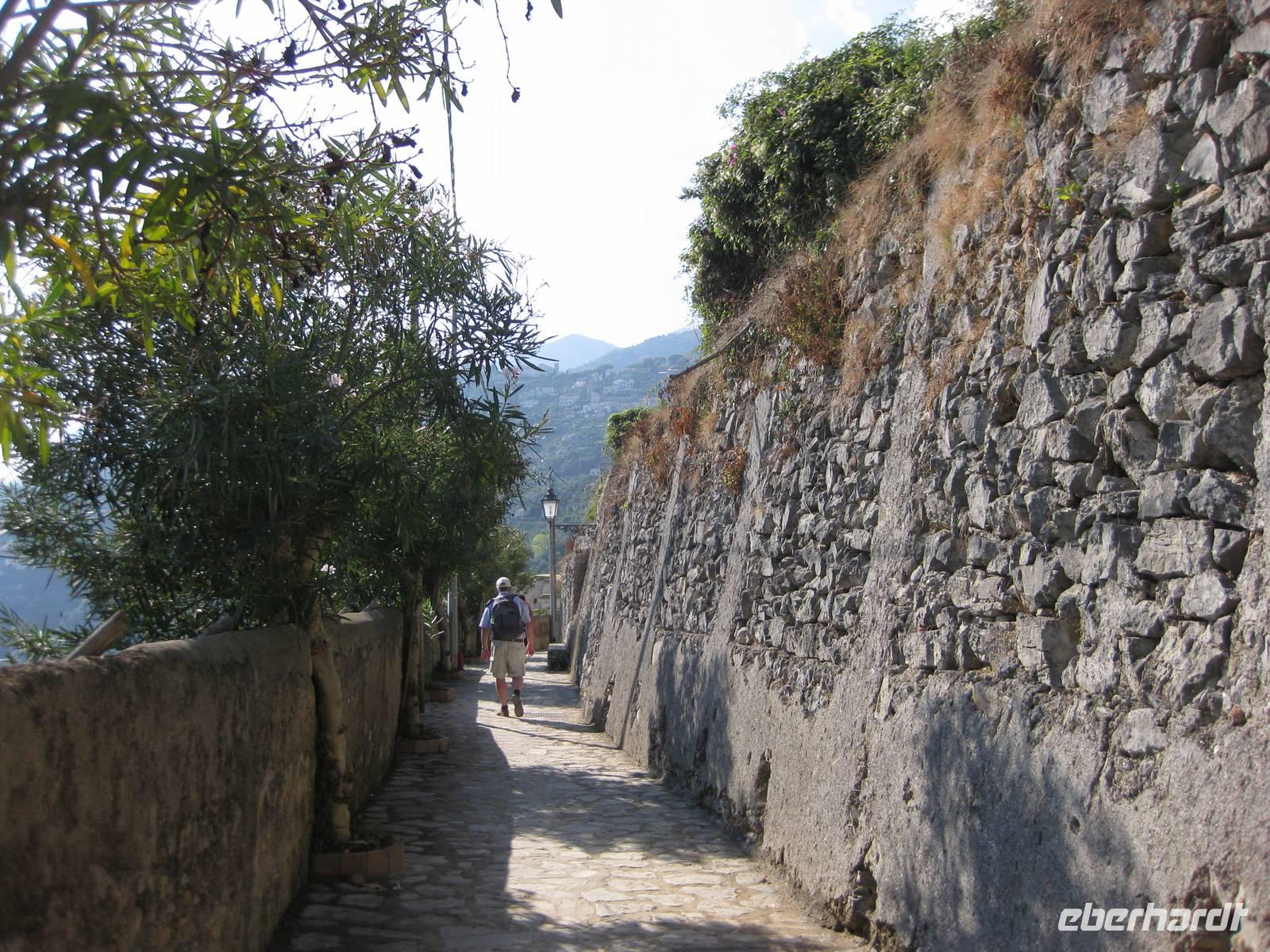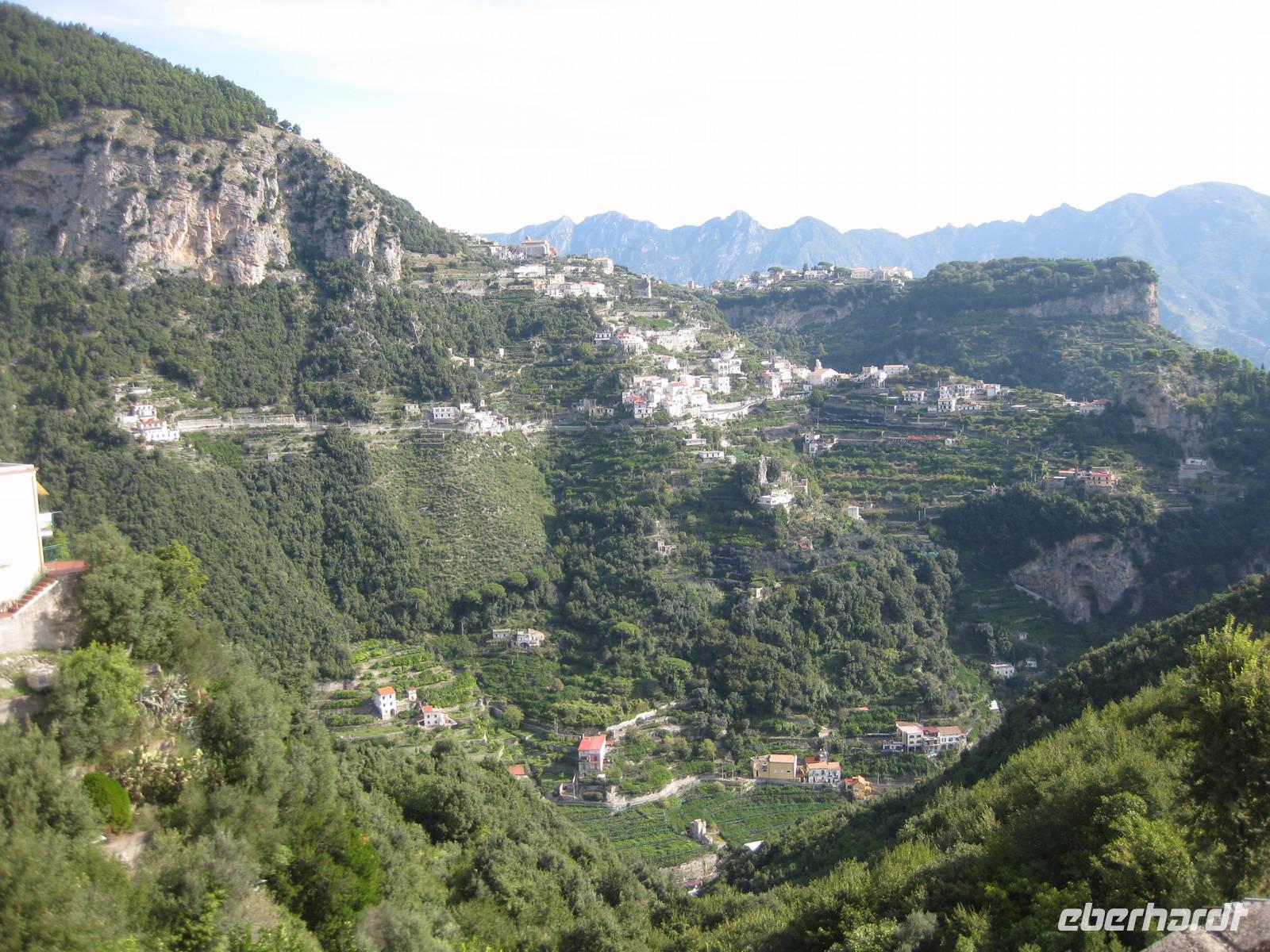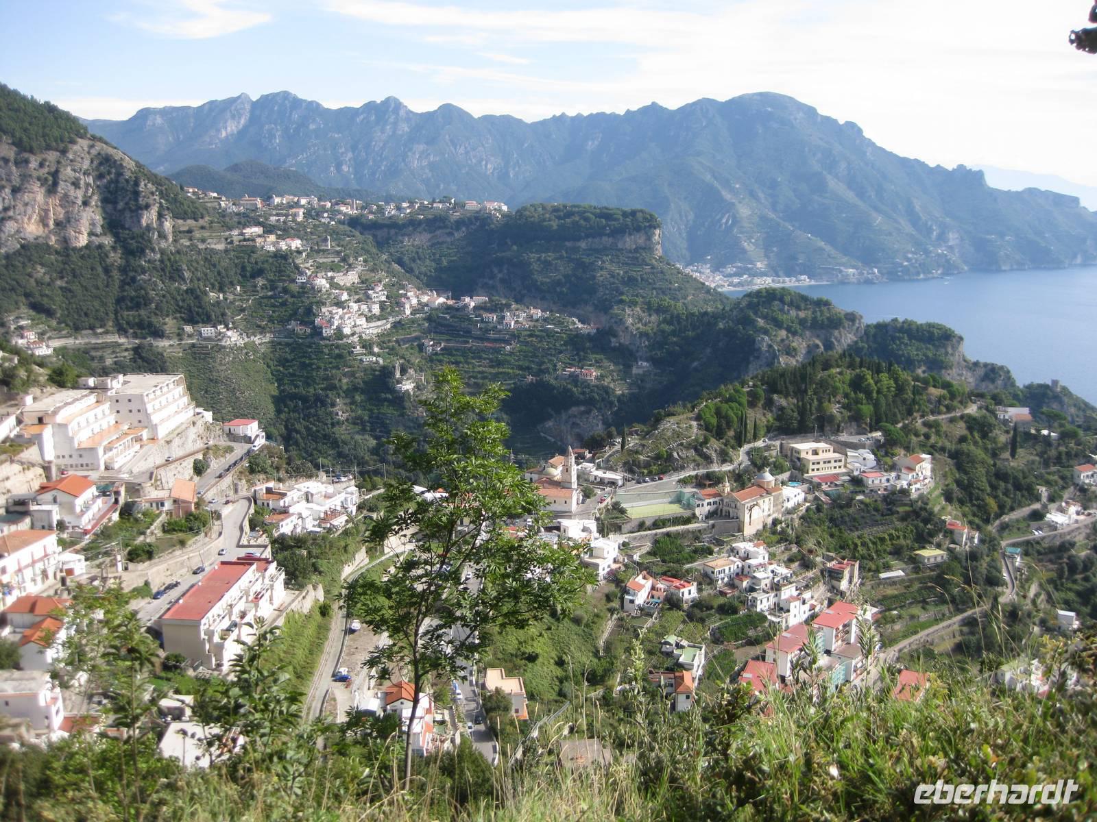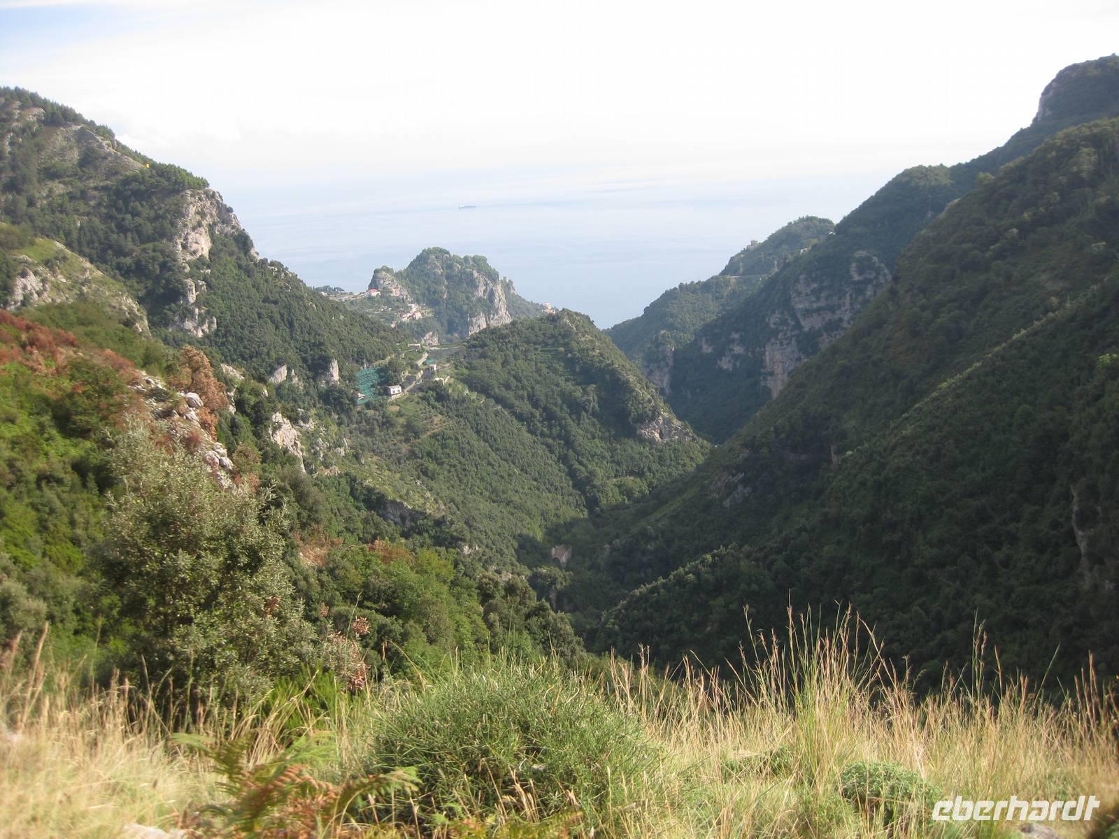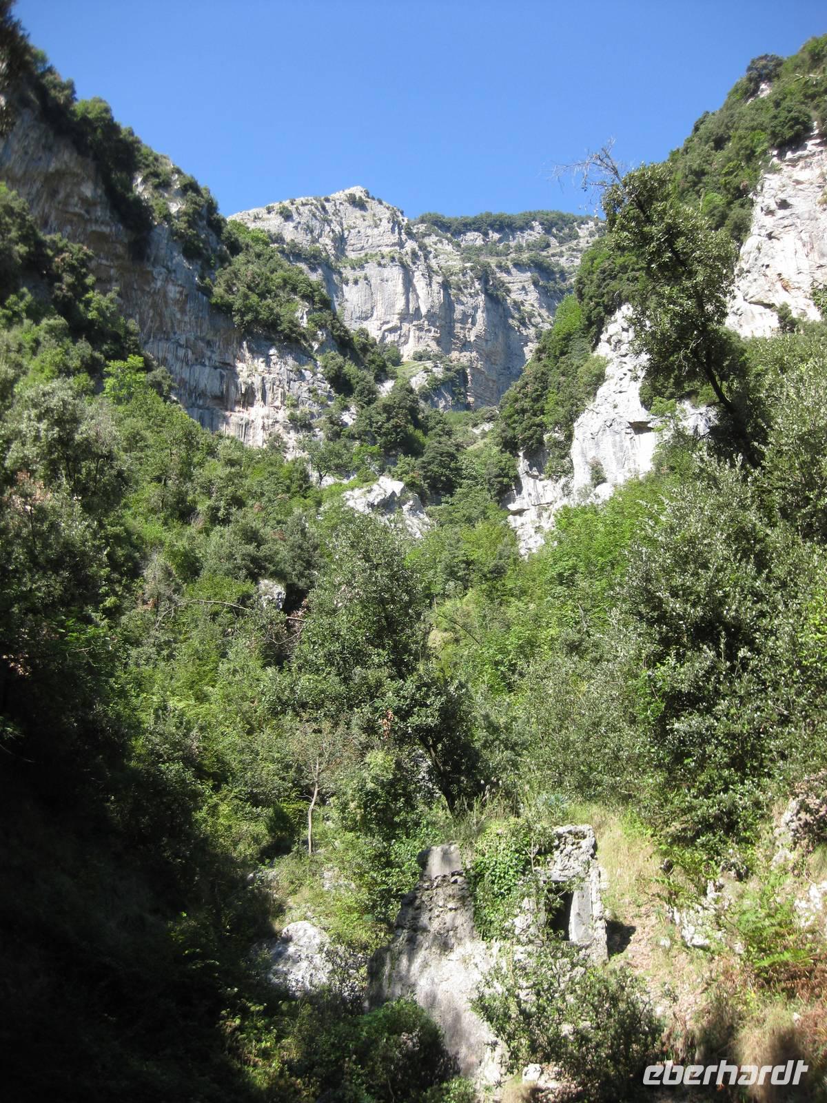 Nach dem Mittagessen verabschieden sich noch zwei Gäste, ihre Frauen sind in Amalfi geblieben. Wir anderen begeben uns auf die Wanderung in's obere Eisenhüttental. Der Weg, oft auch nur ein schmaler Pfad, ist charakteristisch für die Monti Lattari. Er führt uns durch Wälder mit einer z.T. sehr üppigen Vegetation, an Bächen entlang und an steilen zerklüfteten Felswänden vorbei. Wir erreichen Campidoglio. Von hier aus können wir einen letzten Blick auf Amalfi werfen. Dann geht es weiter bis nach Scala. Von dort aus haben wir noch mal einen fantastischen Blick auf Ravello und die Amalfiküste. Hier holt uns der Bus wieder ab und wir fahren zurück nach Minori.