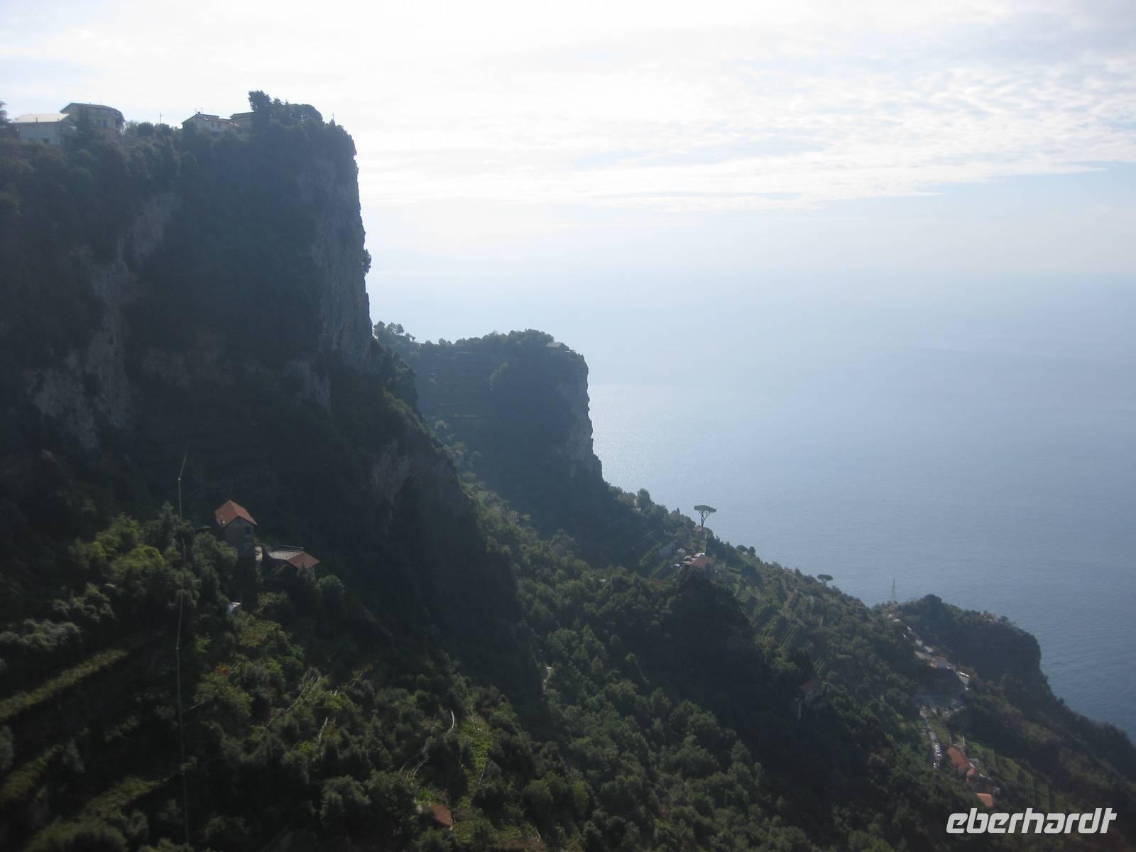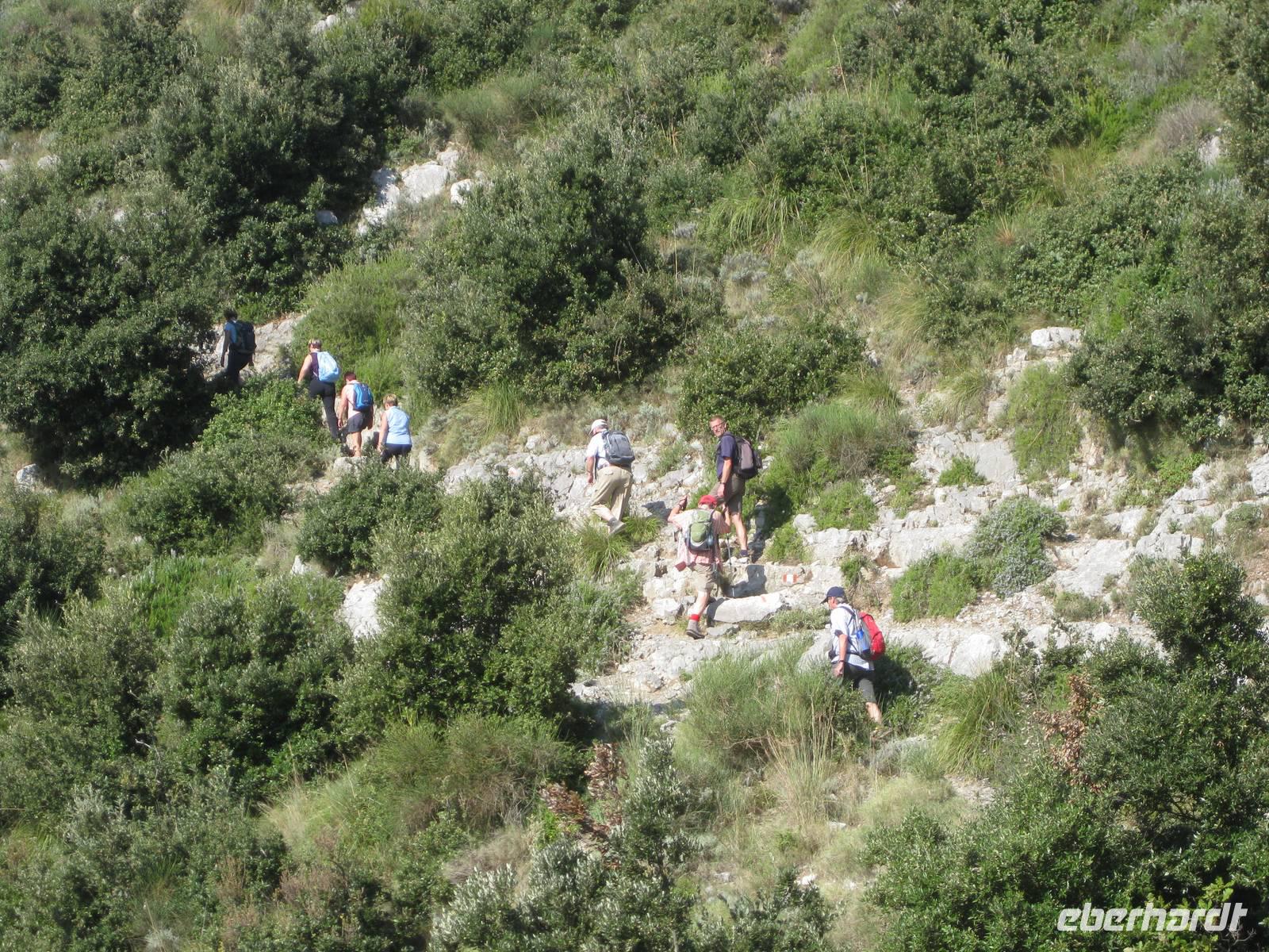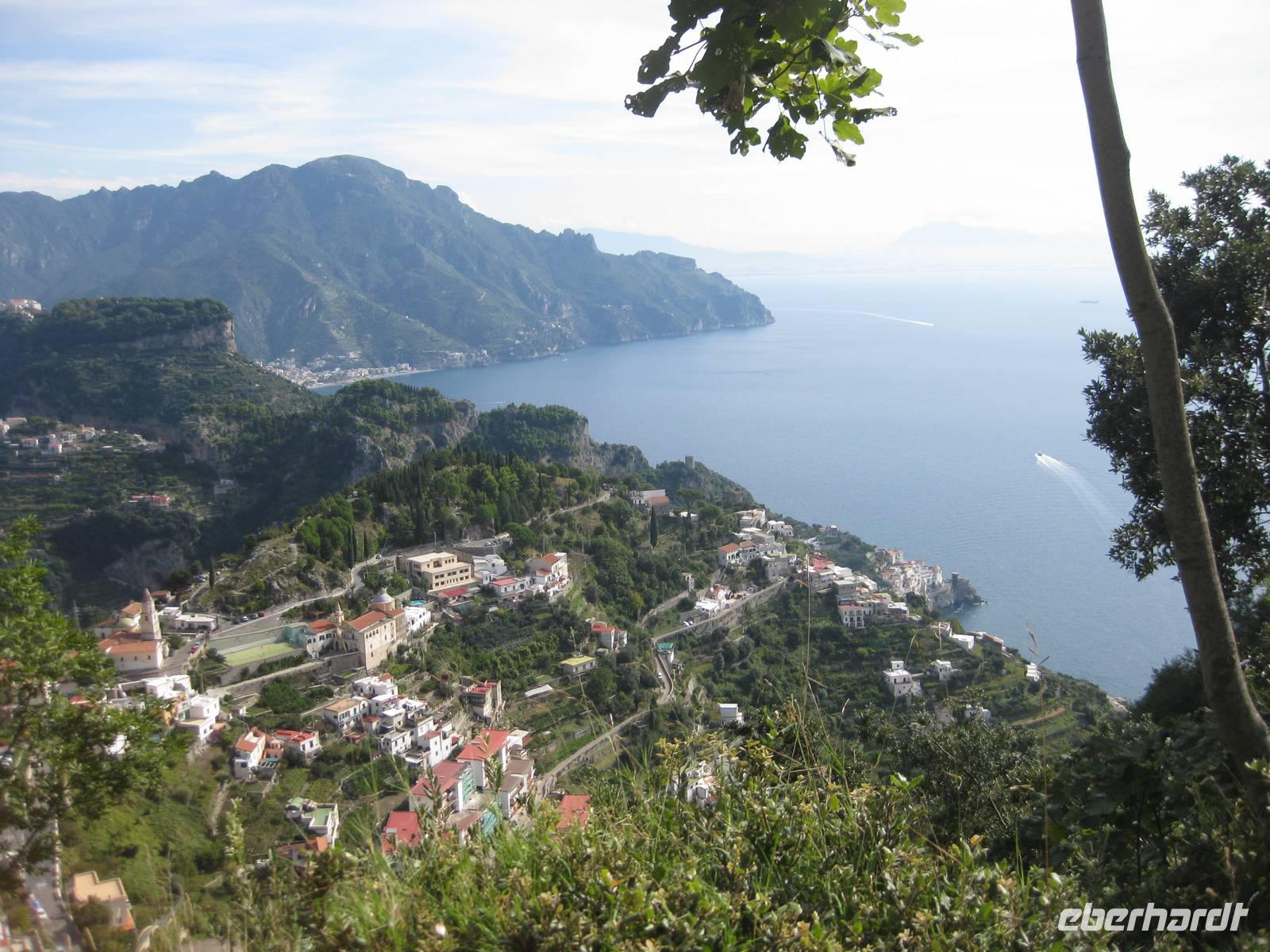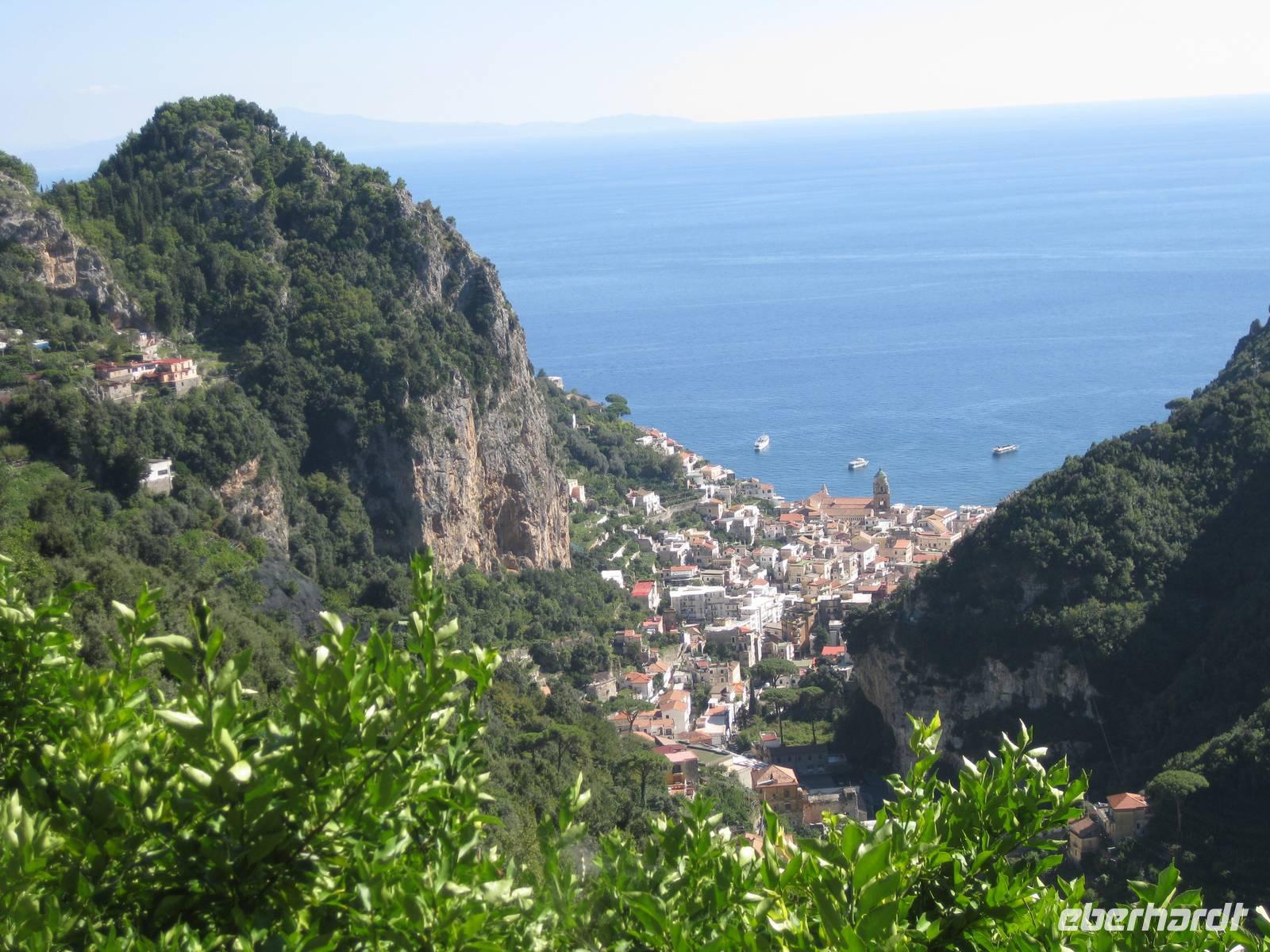 Nach dem Mittagessen verabschieden sich noch zwei Gäste, ihre Frauen sind in Amalfi geblieben. Wir anderen begeben uns auf die Wanderung in's obere Eisenhüttental. Der Weg, oft auch nur ein schmaler Pfad, ist charakteristisch für die Monti Lattari. Er führt uns durch Wälder mit einer z.T. sehr üppigen Vegetation, an Bächen entlang und an steilen zerklüfteten Felswänden vorbei. Wir erreichen Campidoglio. Von hier aus können wir einen letzten Blick auf Amalfi werfen. Dann geht es weiter bis nach Scala. Von dort aus haben wir noch mal einen fantastischen Blick auf Ravello und die Amalfiküste. Hier holt uns der Bus wieder ab und wir fahren zurück nach Minori.