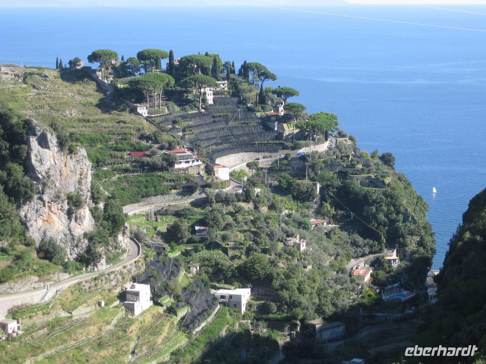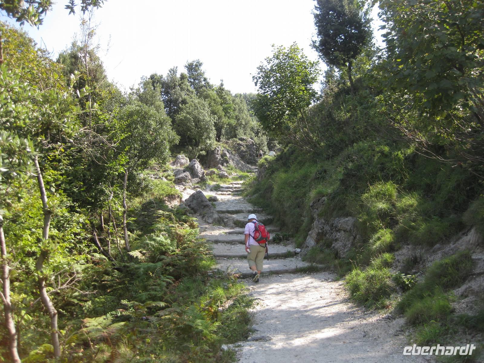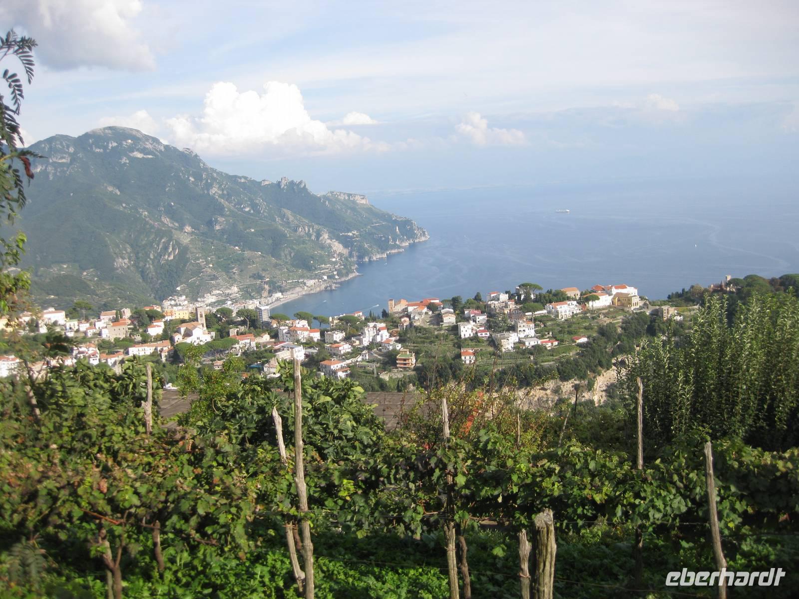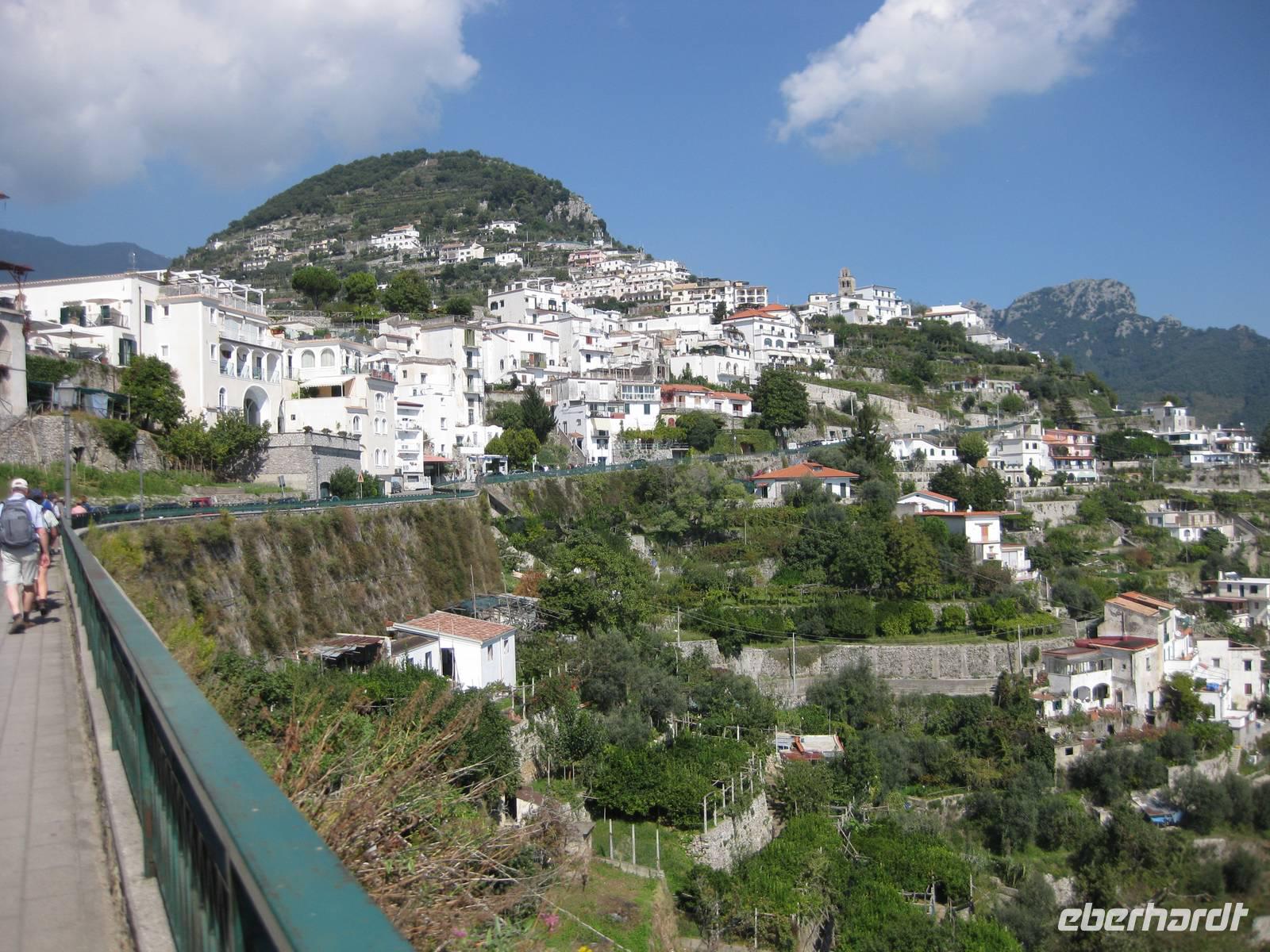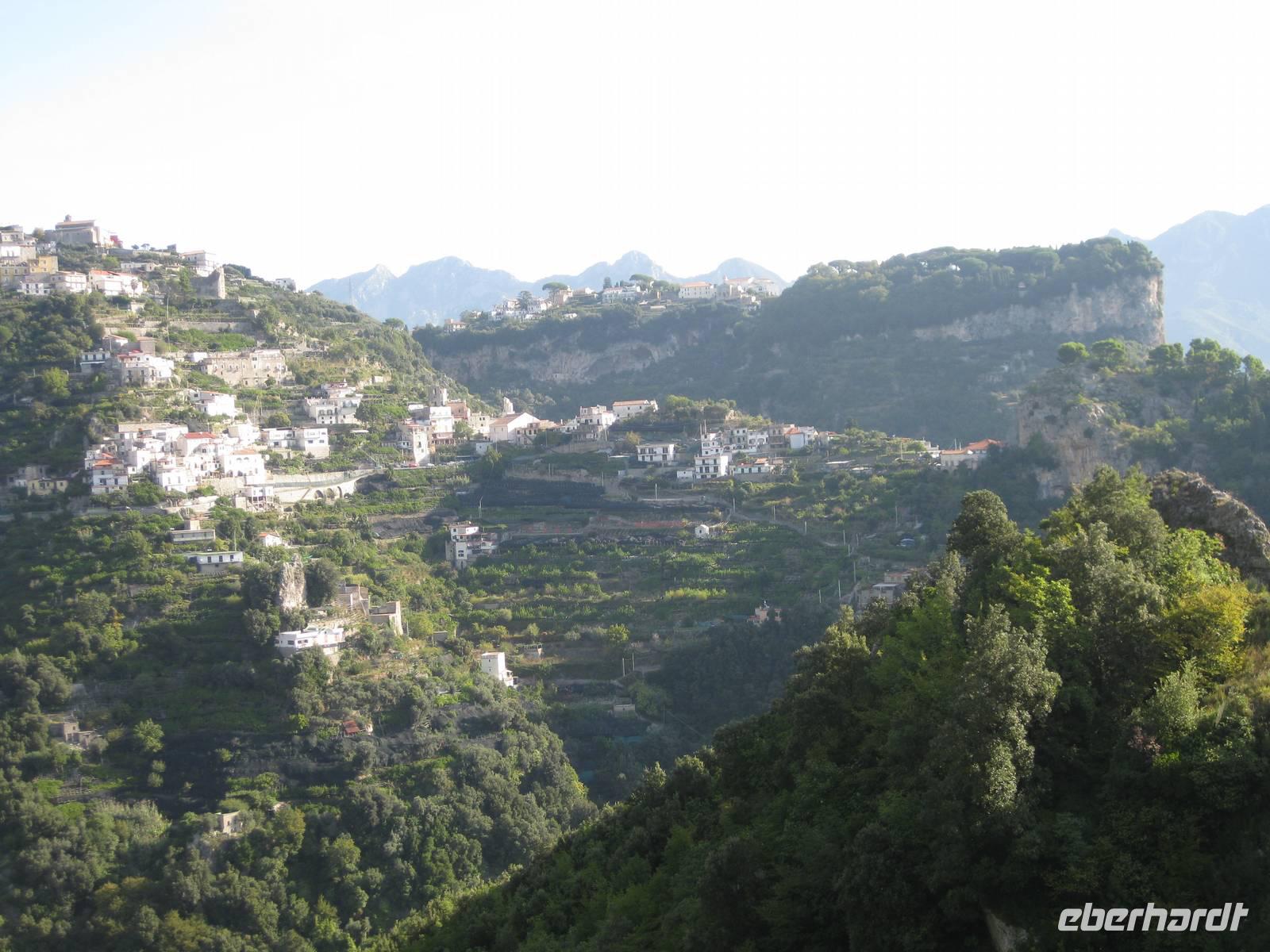 Nach dem Mittagessen verabschieden sich noch zwei Gäste, ihre Frauen sind in Amalfi geblieben. Wir anderen begeben uns auf die Wanderung in's obere Eisenhüttental. Der Weg, oft auch nur ein schmaler Pfad, ist charakteristisch für die Monti Lattari. Er führt uns durch Wälder mit einer z.T. sehr üppigen Vegetation, an Bächen entlang und an steilen zerklüfteten Felswänden vorbei. Wir erreichen Campidoglio. Von hier aus können wir einen letzten Blick auf Amalfi werfen. Dann geht es weiter bis nach Scala. Von dort aus haben wir noch mal einen fantastischen Blick auf Ravello und die Amalfiküste. Hier holt uns der Bus wieder ab und wir fahren zurück nach Minori.