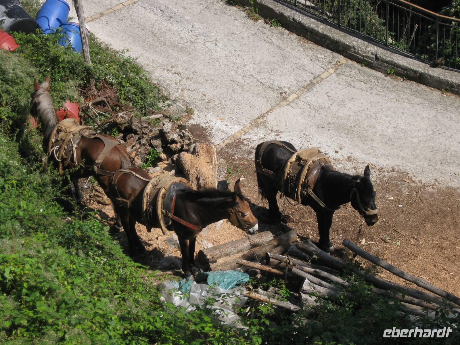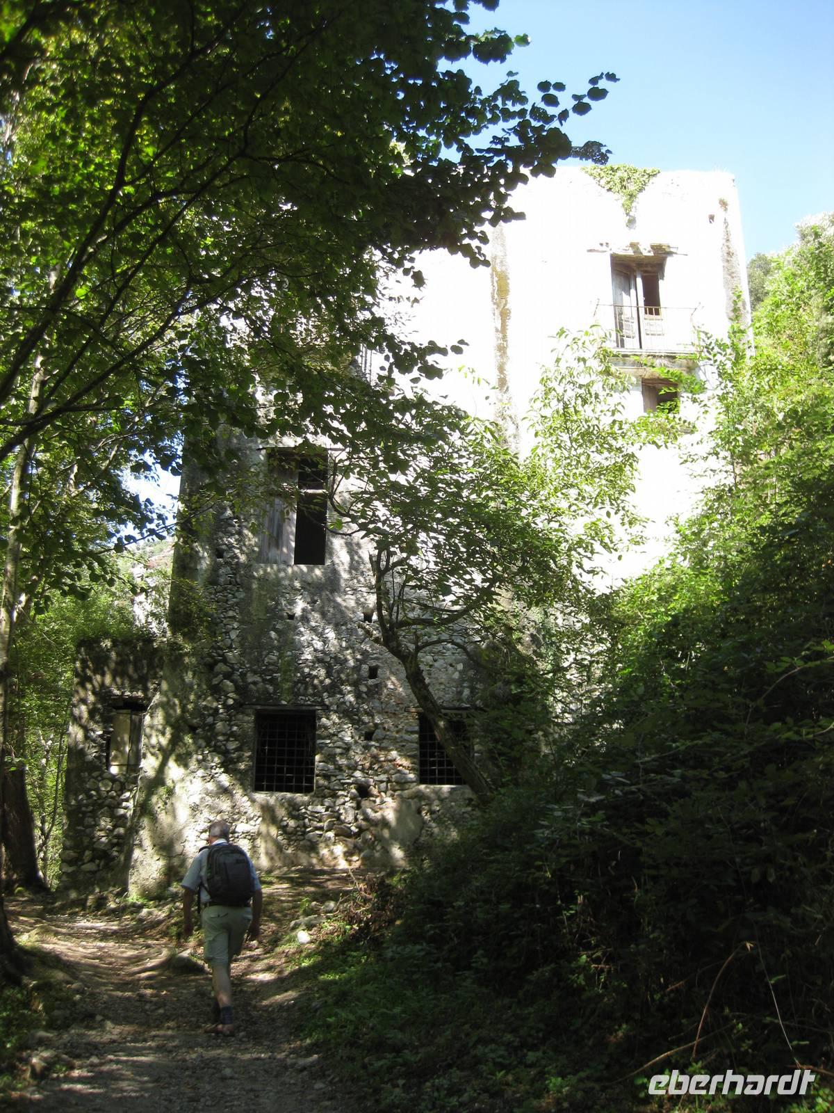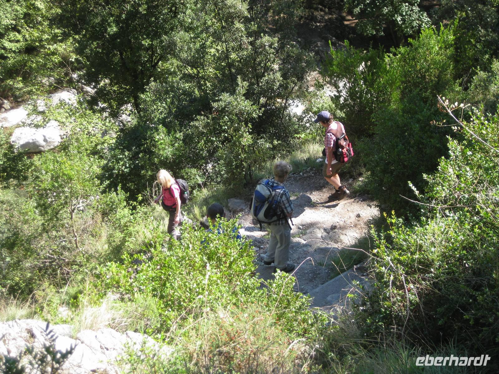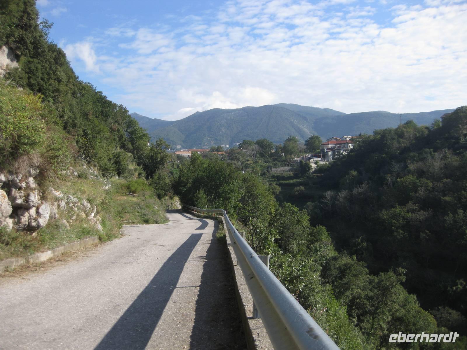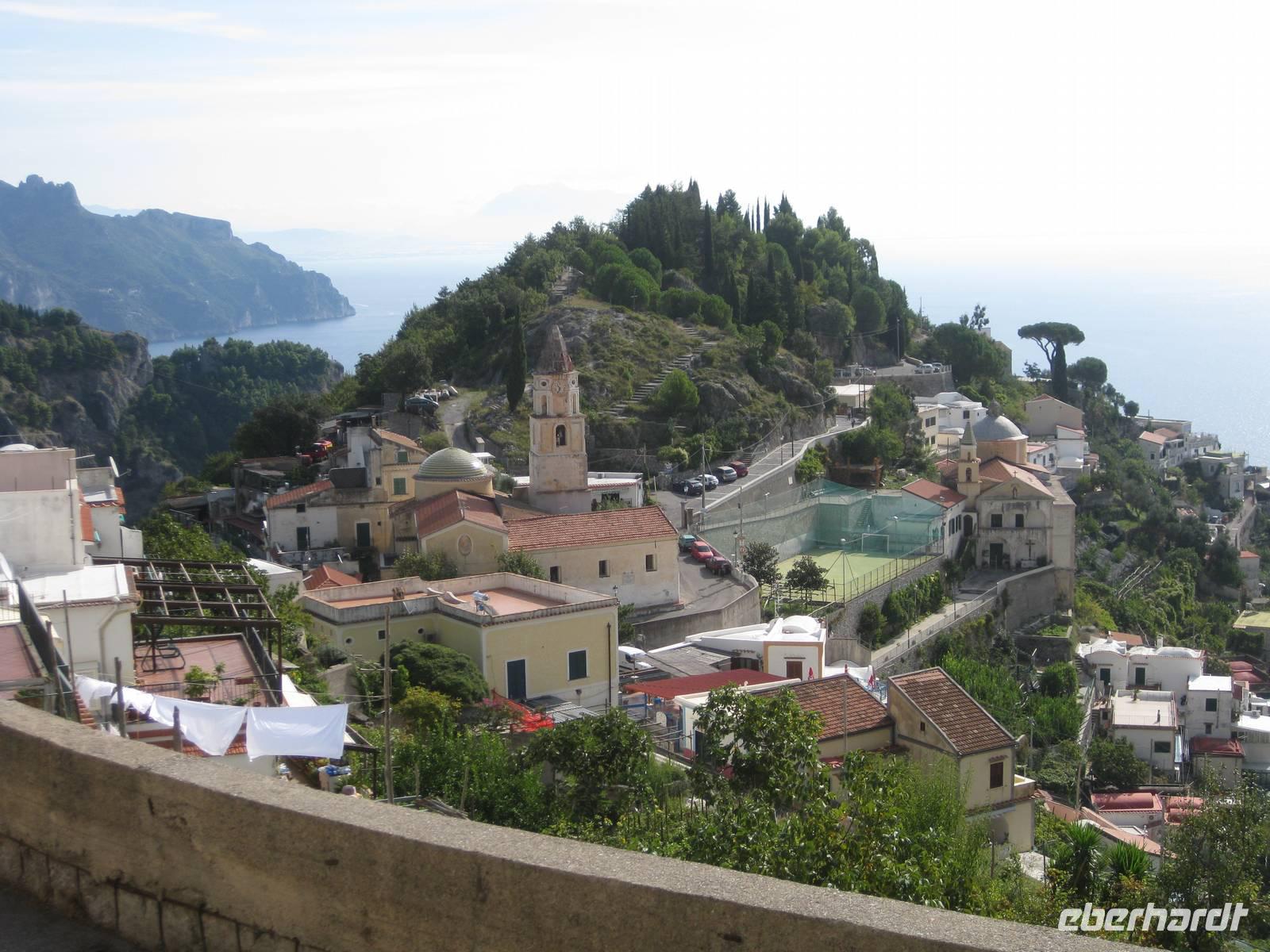 Nach dem Mittagessen verabschieden sich noch zwei Gäste, ihre Frauen sind in Amalfi geblieben. Wir anderen begeben uns auf die Wanderung in's obere Eisenhüttental. Der Weg, oft auch nur ein schmaler Pfad, ist charakteristisch für die Monti Lattari. Er führt uns durch Wälder mit einer z.T. sehr üppigen Vegetation, an Bächen entlang und an steilen zerklüfteten Felswänden vorbei. Wir erreichen Campidoglio. Von hier aus können wir einen letzten Blick auf Amalfi werfen. Dann geht es weiter bis nach Scala. Von dort aus haben wir noch mal einen fantastischen Blick auf Ravello und die Amalfiküste. Hier holt uns der Bus wieder ab und wir fahren zurück nach Minori.