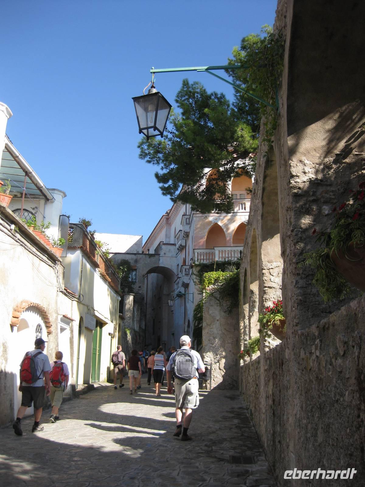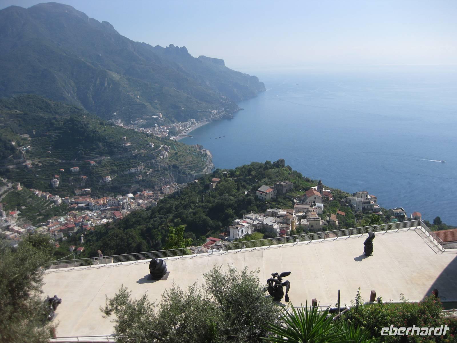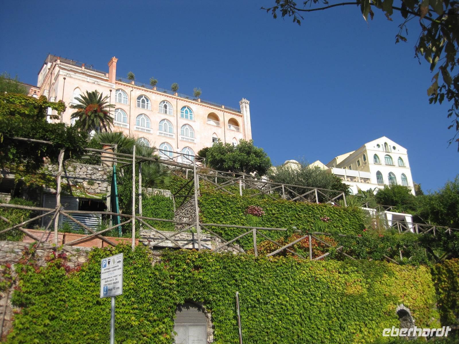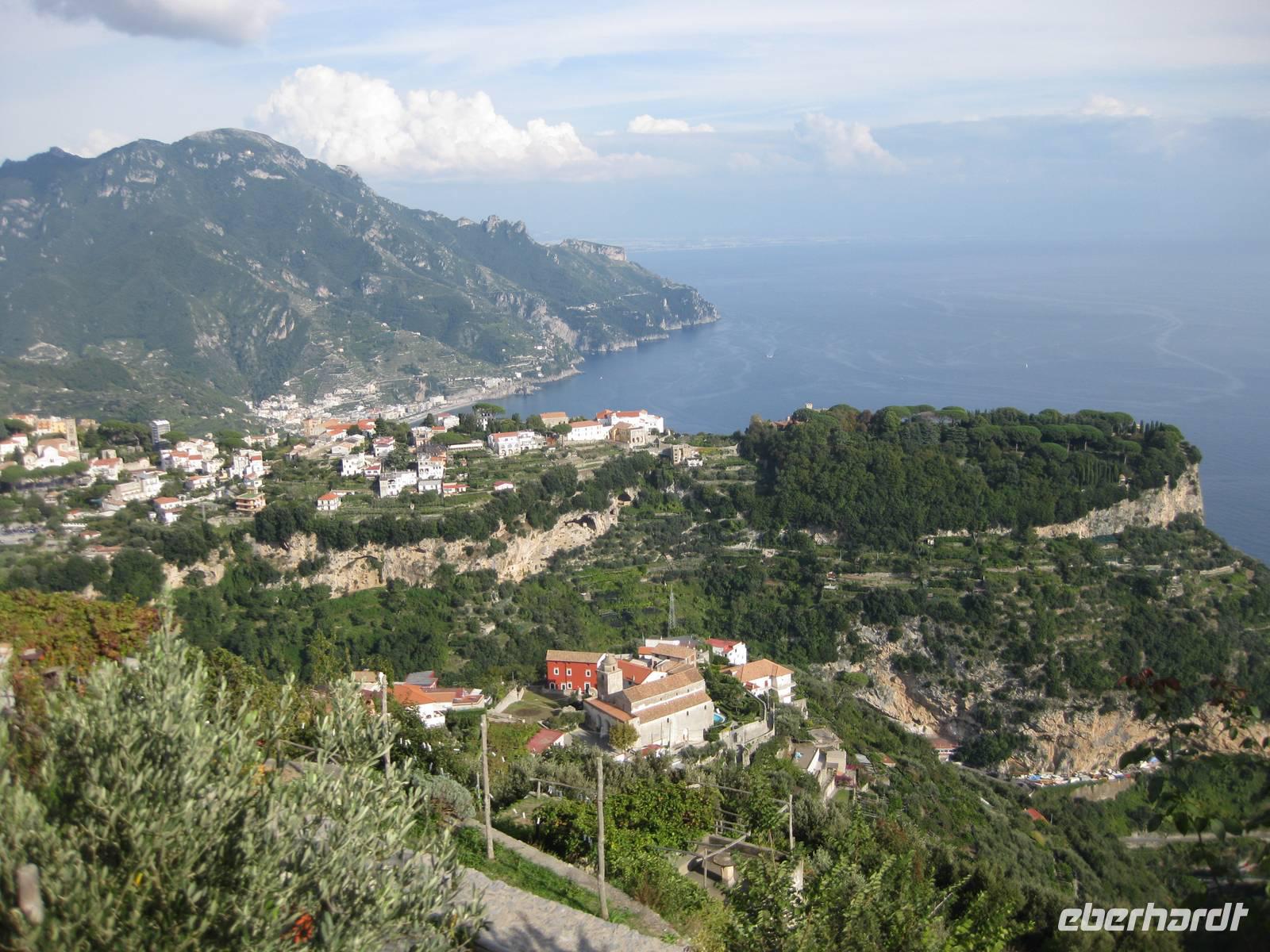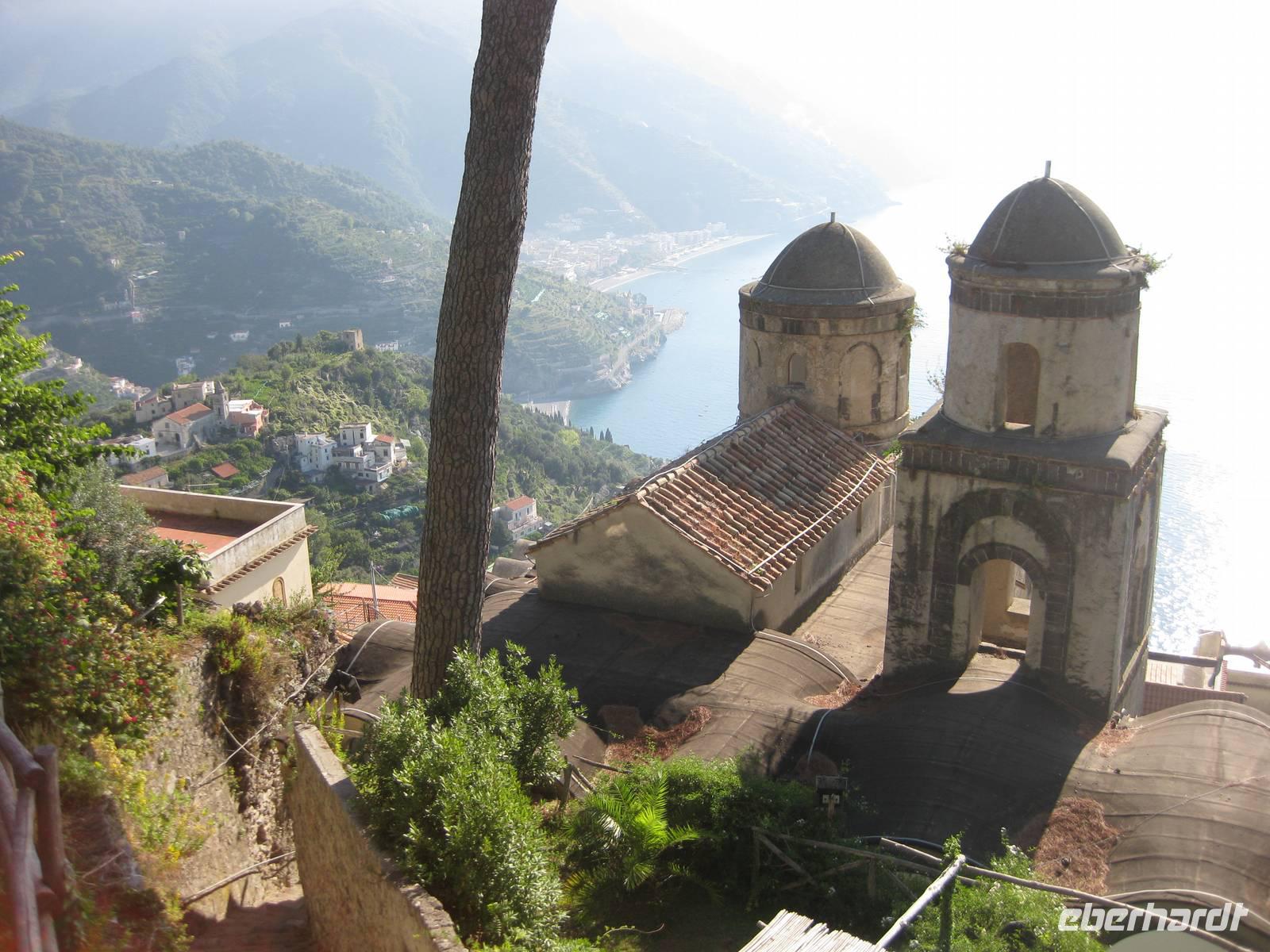 Auch heute holt uns der Bus nach dem Frühstück in Minori ab. Es ist wieder bestes Wanderwetter. Wir fahren erst ein Stück auf der "Amalfitana" bis kurz vor Atrani, wo wir nach rechts abbiegen und hinauf nach Ravello fahren. Das Städtchen Ravello liegt in luftiger Höhe am Monte Cerreto. Früher war Ravello eine reiche Handelsstadt und heute ist es ein Ort mit vielen Luxushotels, in denen es an nichts fehlt. Highlights in Ravello sind der Dom San Pantaloene und die Villa Rufolo. Beiden statten wir einen Besuch ab. In der Villa Rufolo weilte auch Richard Wagner und komponierte hier den zweiten Akt seine Oper "Parsifal". Heute finden deshalb hier jedes Jahr im Juni die "Wagner-Fstspiele" statt, ein grandioses Spektakel unter freiem Himmel zu dem berühmte Künstler, Orchester und Gäste aus aller Welt kommen. Besonders beeindruckend ist der Garten der Villa Rufolo. Von der Terrasse aus bietet sich ein traumhafter Blick über die Amalfiküste. Und der Palast der Villa Rufolo ist eine Schatzkammer maurischer Architektur.