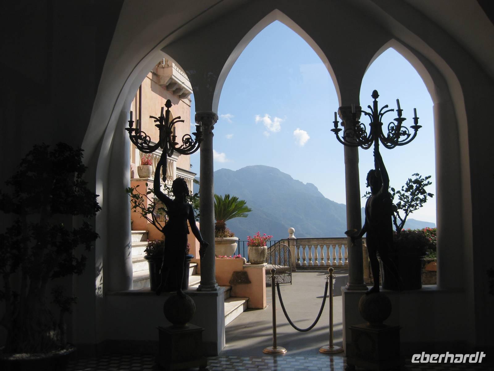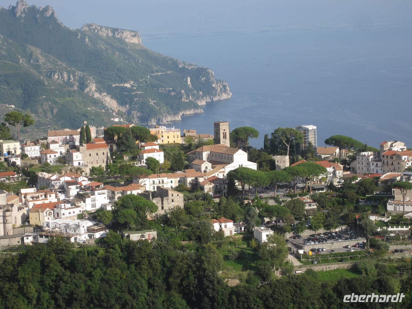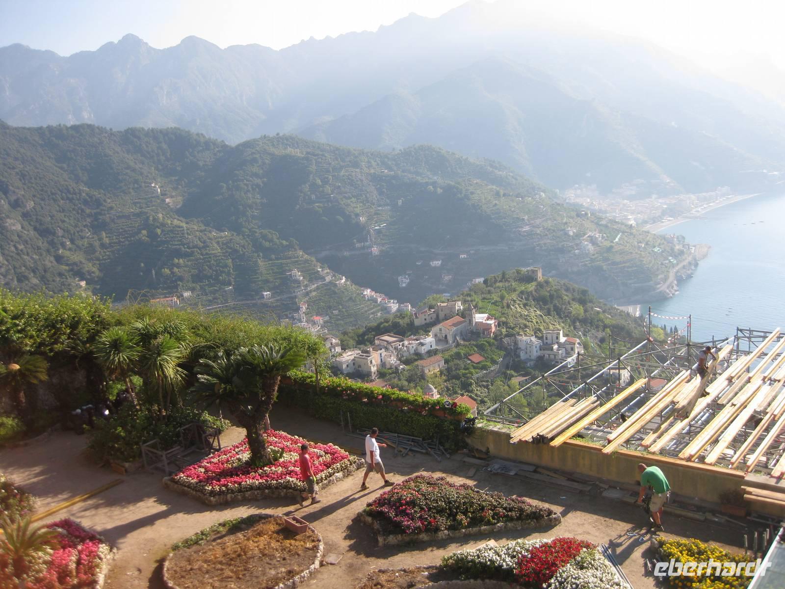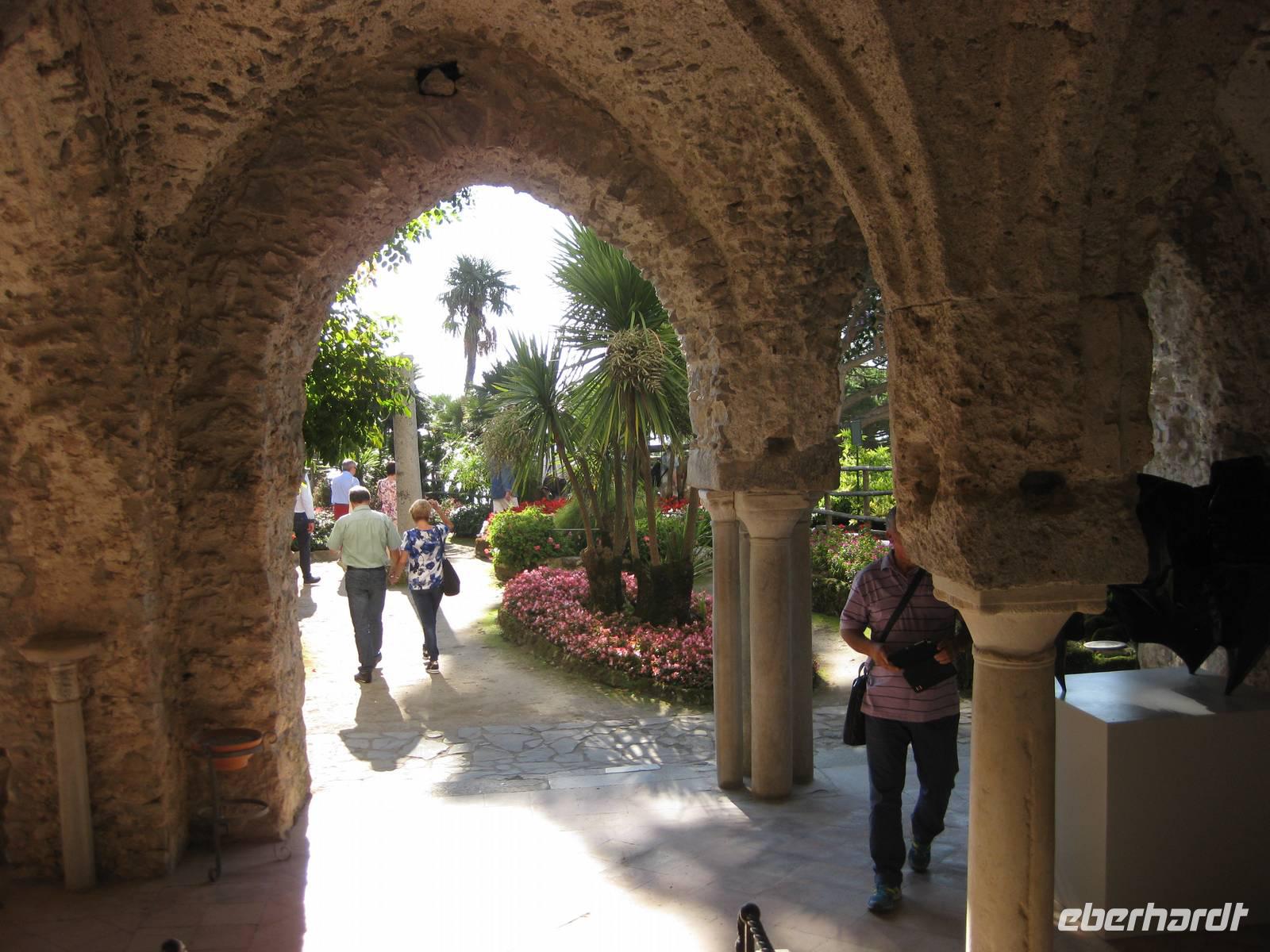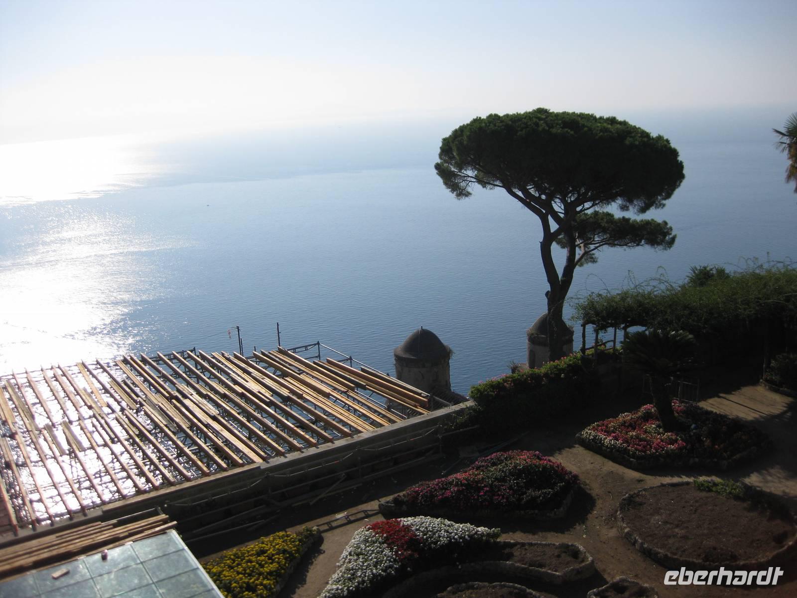 Auch heute holt uns der Bus nach dem Frühstück in Minori ab. Es ist wieder bestes Wanderwetter. Wir fahren erst ein Stück auf der "Amalfitana" bis kurz vor Atrani, wo wir nach rechts abbiegen und hinauf nach Ravello fahren. Das Städtchen Ravello liegt in luftiger Höhe am Monte Cerreto. Früher war Ravello eine reiche Handelsstadt und heute ist es ein Ort mit vielen Luxushotels, in denen es an nichts fehlt. Highlights in Ravello sind der Dom San Pantaloene und die Villa Rufolo. Beiden statten wir einen Besuch ab. In der Villa Rufolo weilte auch Richard Wagner und komponierte hier den zweiten Akt seine Oper "Parsifal". Heute finden deshalb hier jedes Jahr im Juni die "Wagner-Fstspiele" statt, ein grandioses Spektakel unter freiem Himmel zu dem berühmte Künstler, Orchester und Gäste aus aller Welt kommen. Besonders beeindruckend ist der Garten der Villa Rufolo. Von der Terrasse aus bietet sich ein traumhafter Blick über die Amalfiküste. Und der Palast der Villa Rufolo ist eine Schatzkammer maurischer Architektur.