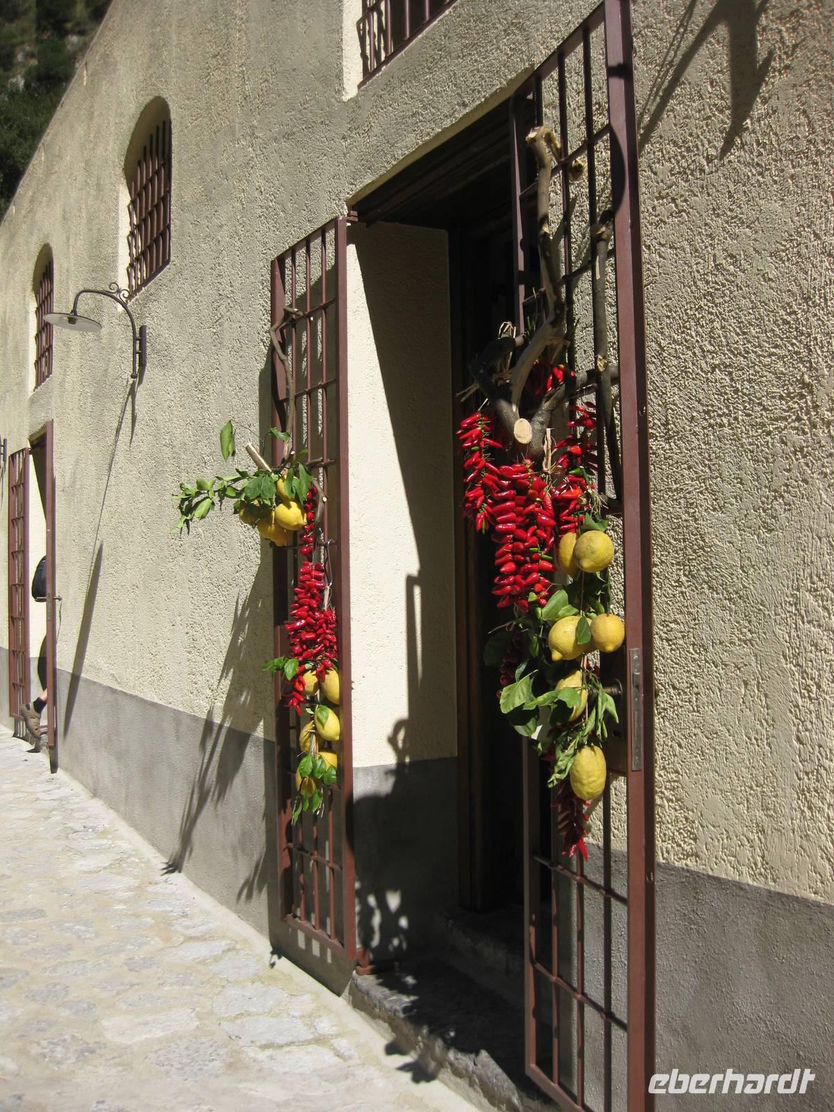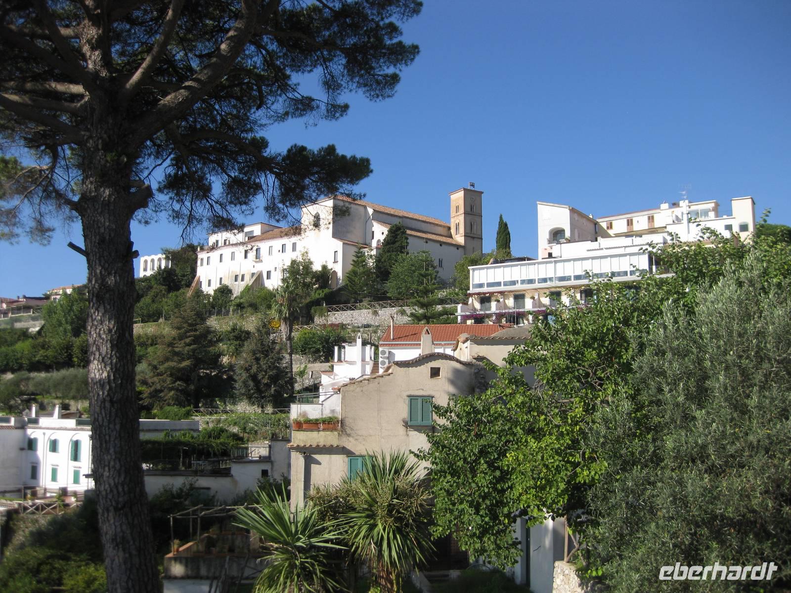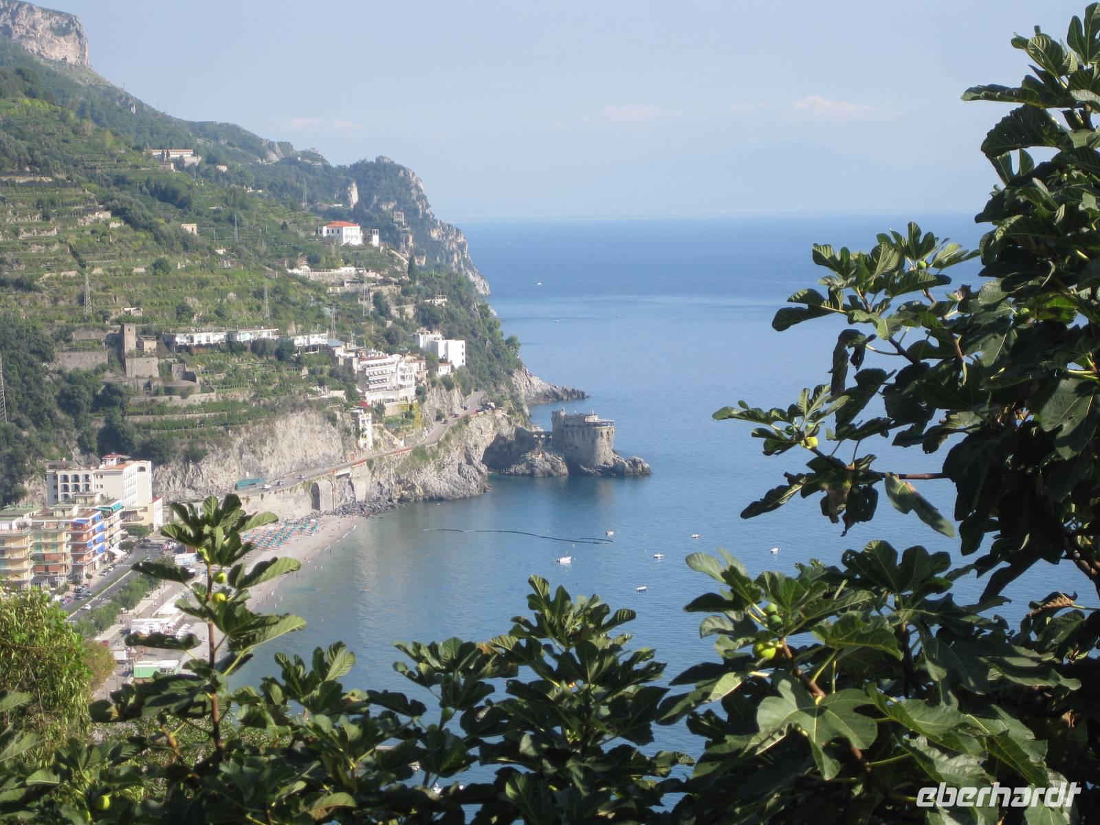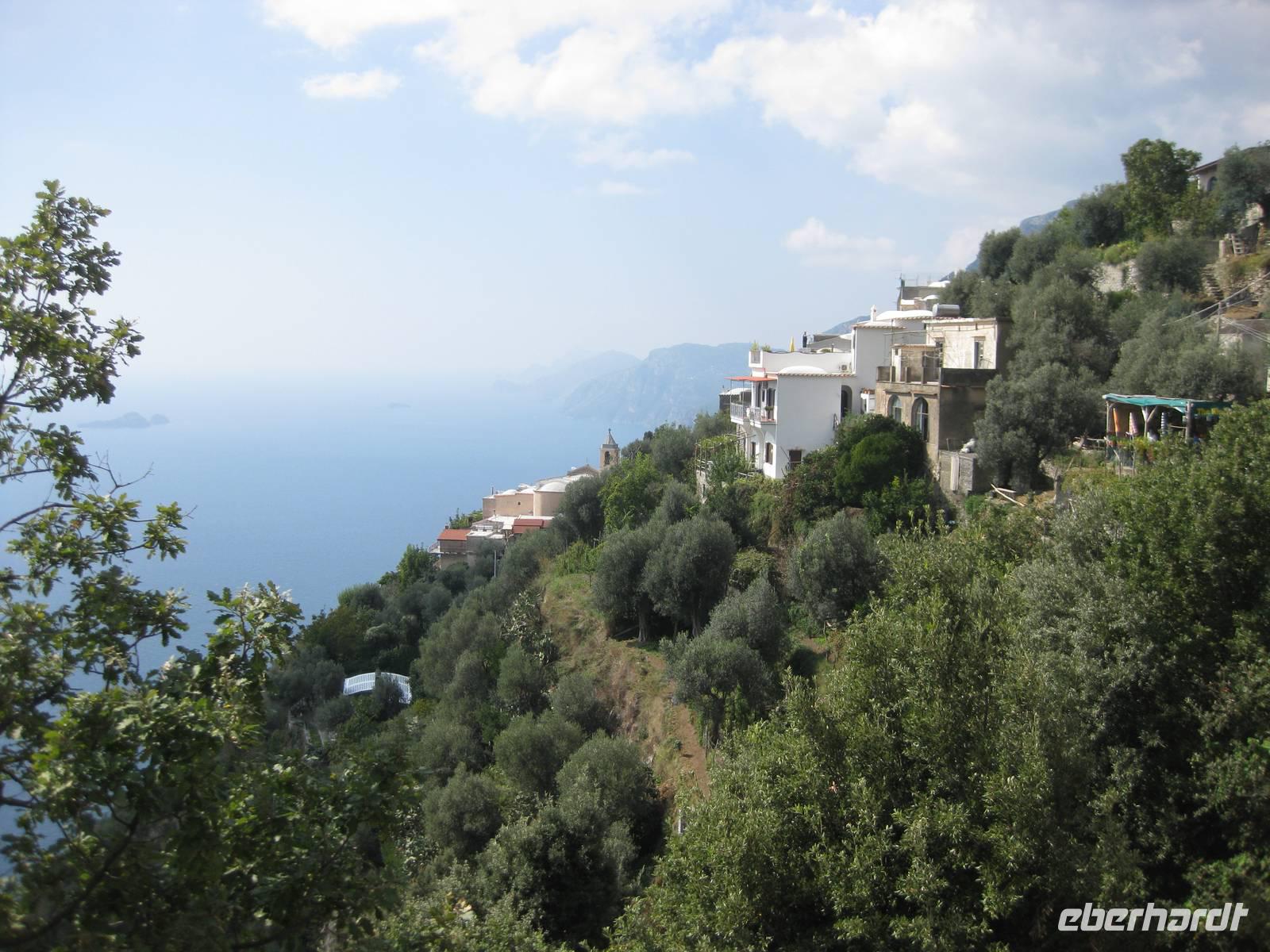 Nachdem wir alles besichtigt, den berühmten Limoncello gekostet und uns einen Espresso gegönnt haben, starten wir zu unserer Wanderung. Wir wandern ein Stück auf der Straße bis zu dem kleinen Dörfchen Sambuco. Dort schwenken wir ab und laufen einen recht gemütlichen Weg, der allerdings immer etwas bergauf geht, bis zum Kloster San Nicola. Dort machen wir eine längere Rast und genießen die Natur. Hier oben wachsen sogar Steineichenbäume. Dann machen wir uns wieder auf den Weg und steigen hinab in Richtung Minori. Über unzählig viele Stufen gelangen wir nach unten. Immer wieder bieten sich atemberaubende Blicke auf die Städte Maiori und Minori und auf die Küste.