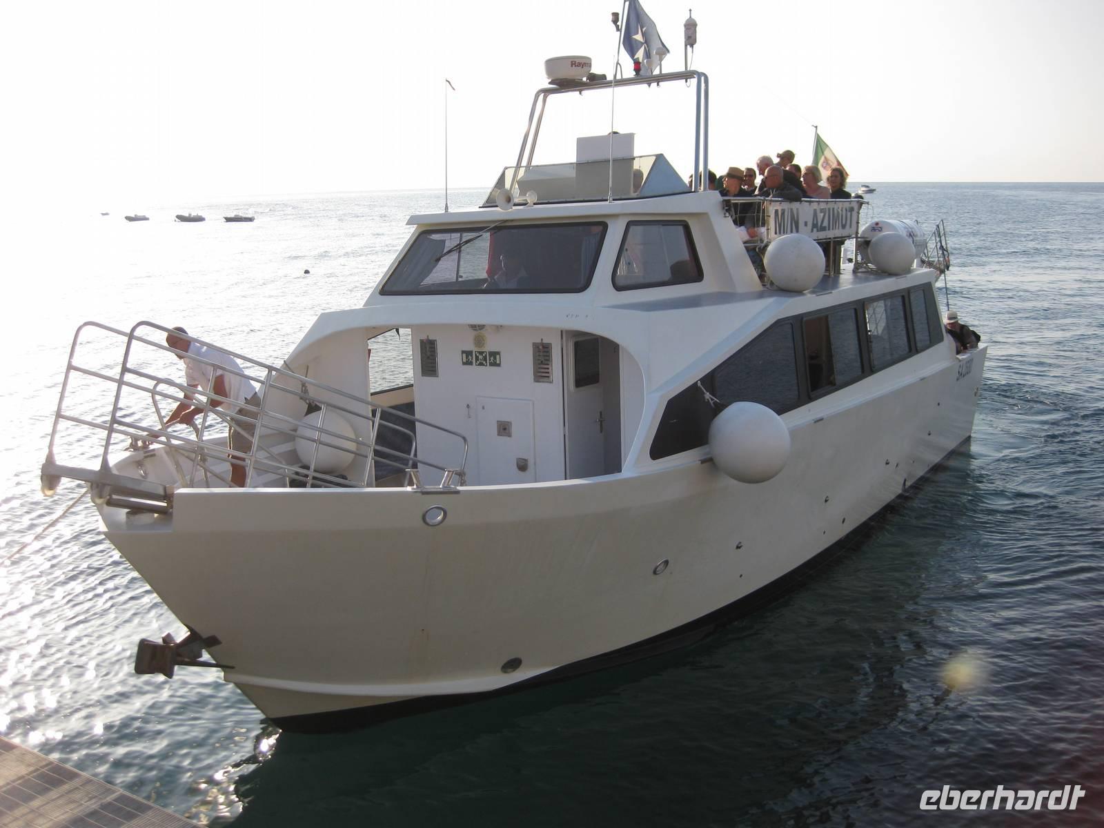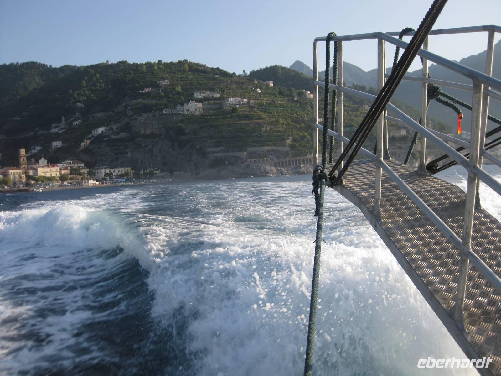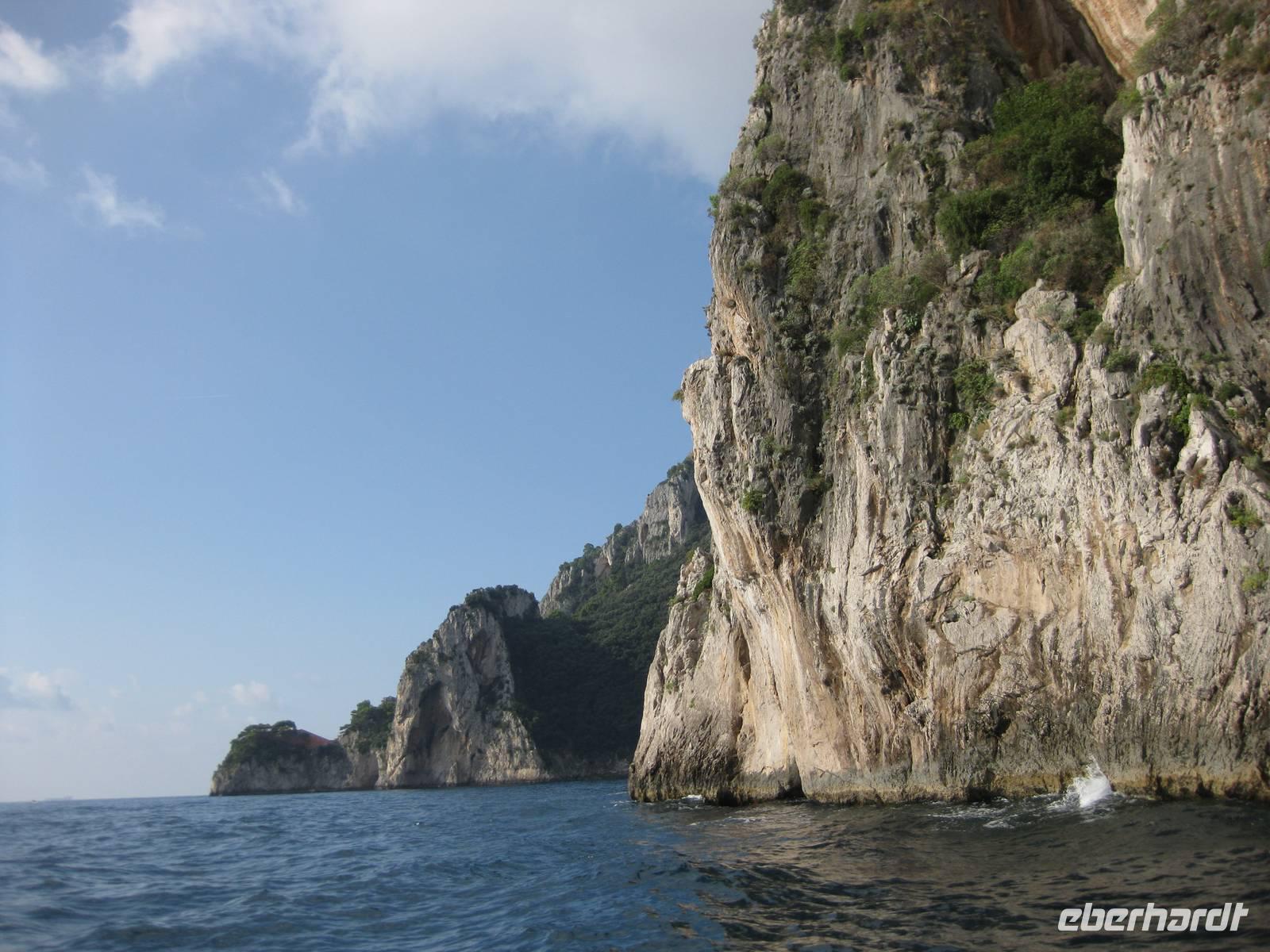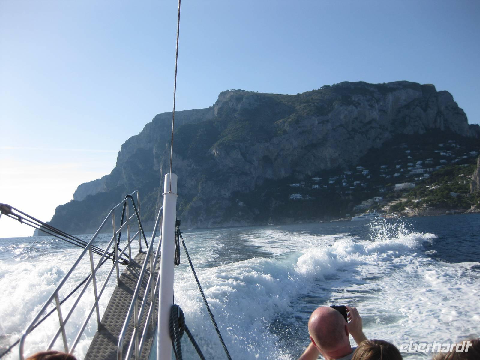 Wir starten in Minori pünktlich mit dem Boot, stoppen noch mal in Amalfi, nehmen noch Gäste auf und fahren dann immer an der Küste entlang bis zur Insel Capri. Die Fahrt mit dem Boot bietet eine interessante Perspektive auf die Amalfiküste. Nach ein einhalb Stunden