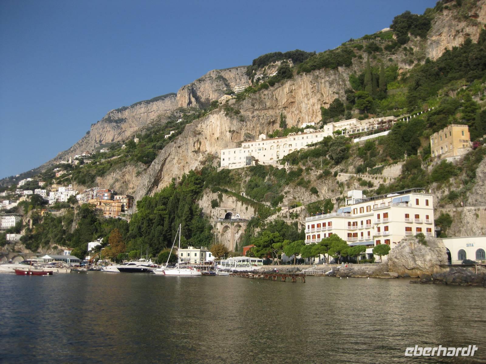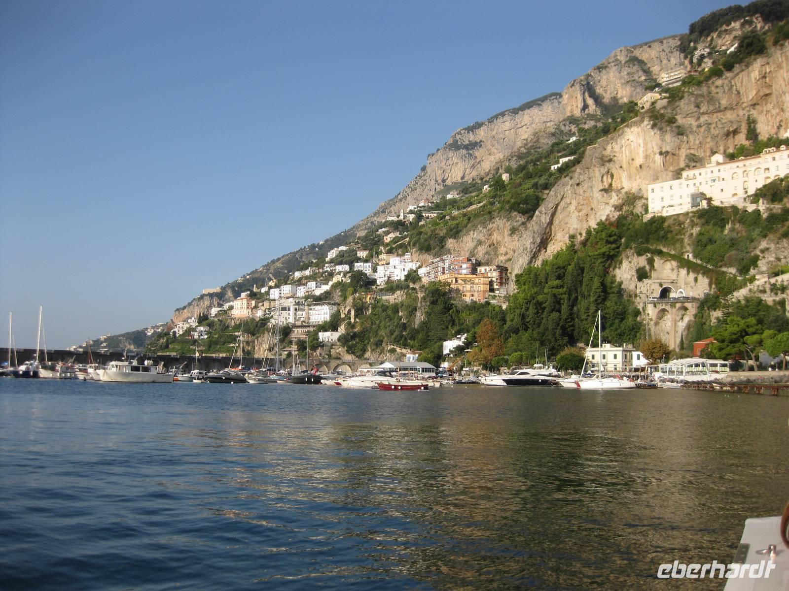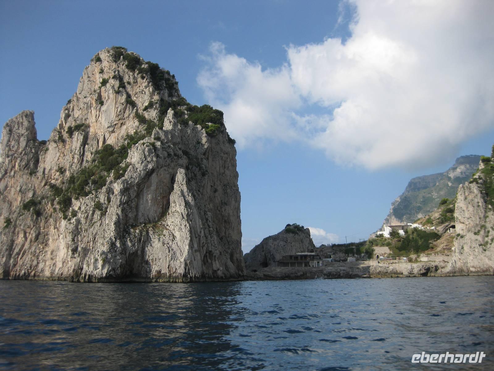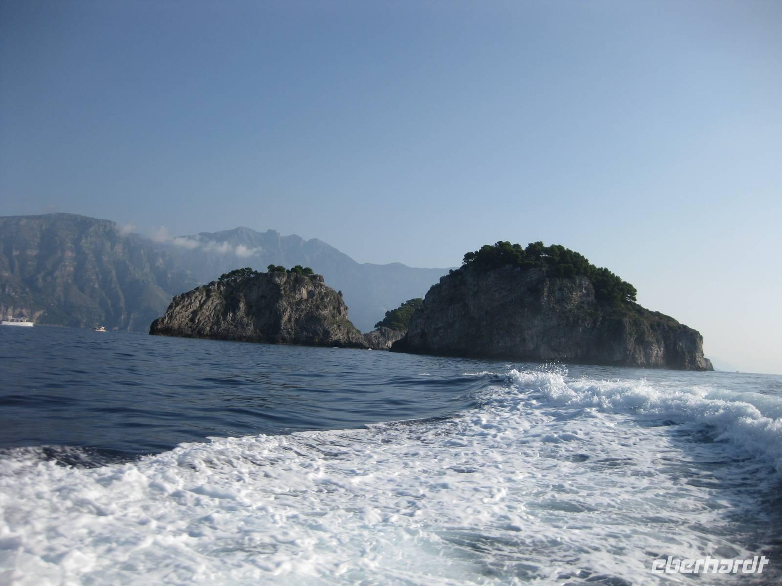 Wir starten in Minori pünktlich mit dem Boot, stoppen noch mal in Amalfi, nehmen noch Gäste auf und fahren dann immer an der Küste entlang bis zur Insel Capri. Die Fahrt mit dem Boot bietet eine interessante Perspektive auf die Amalfiküste. Nach ein einhalb Stunden