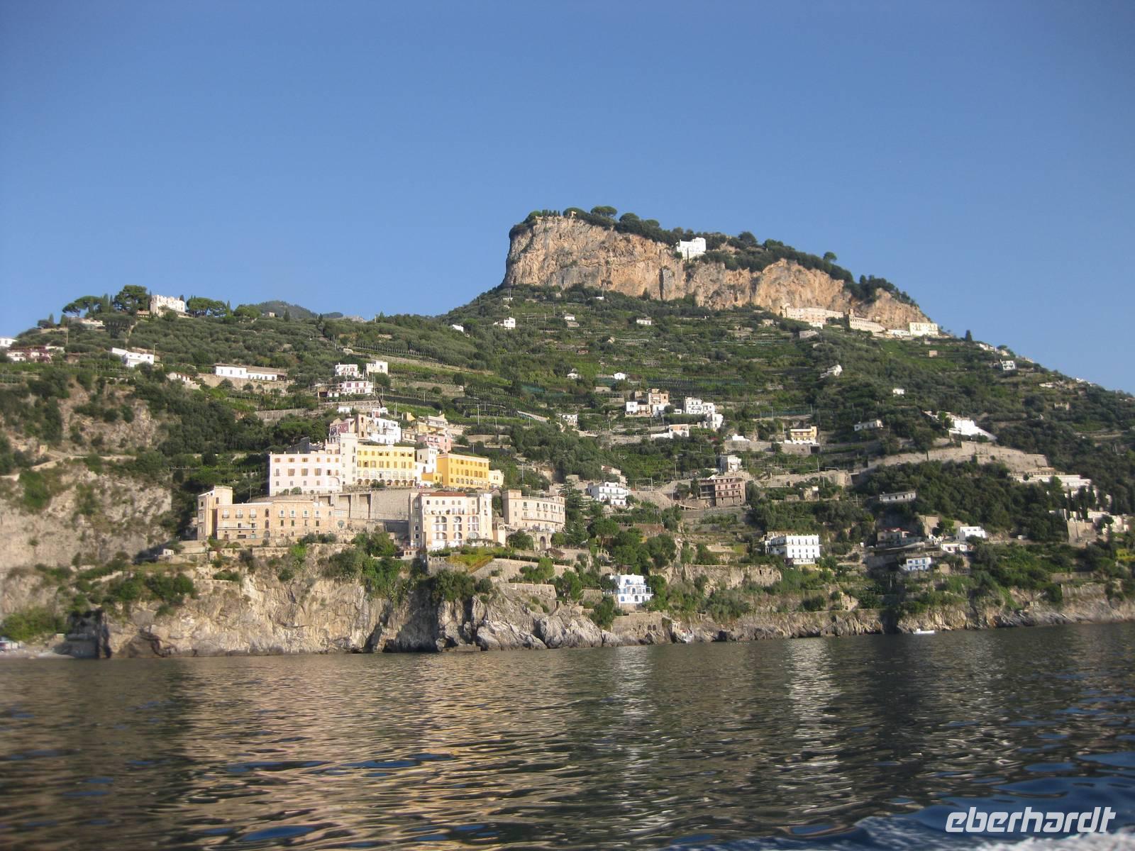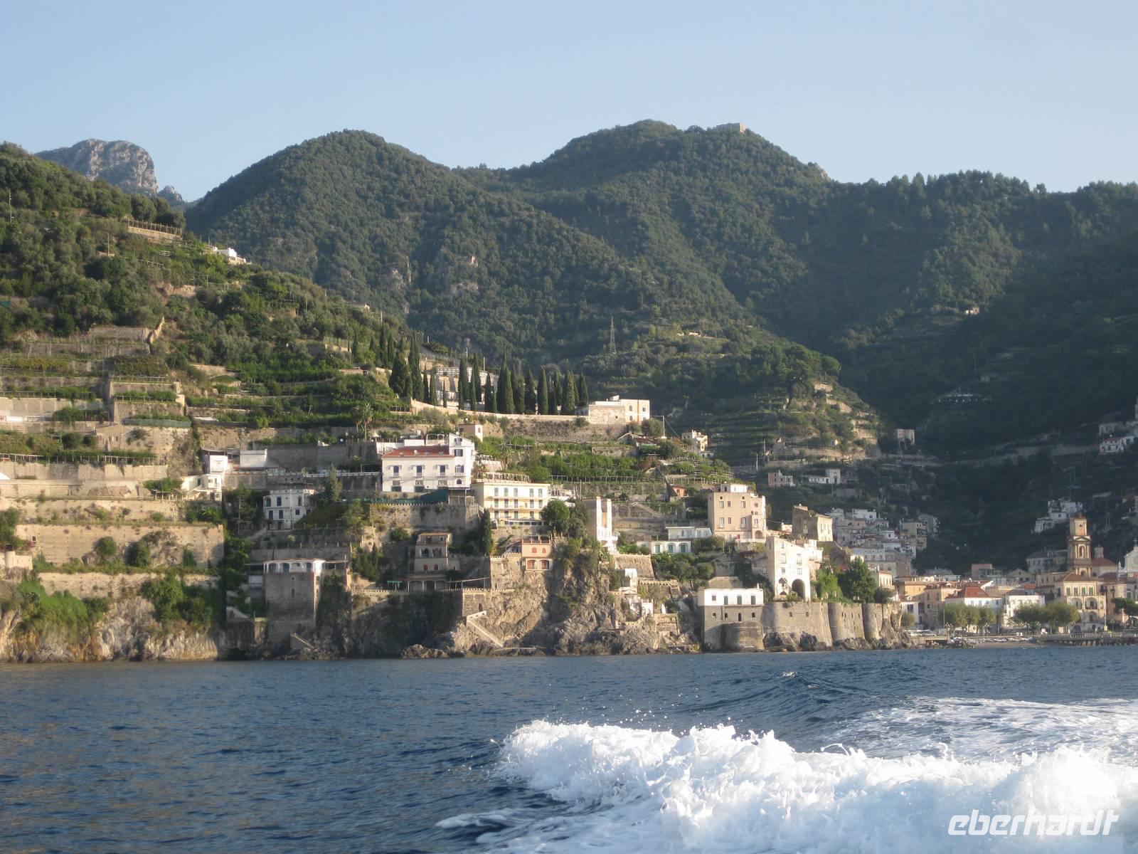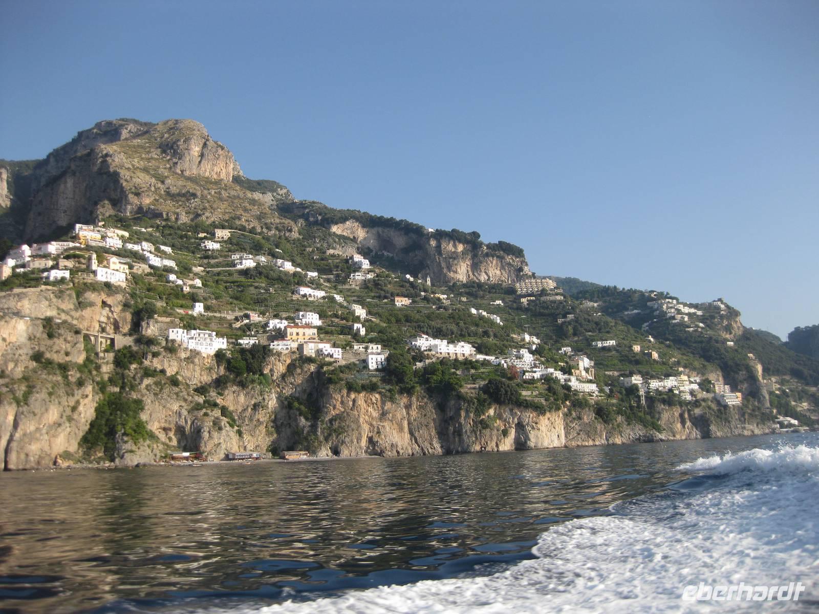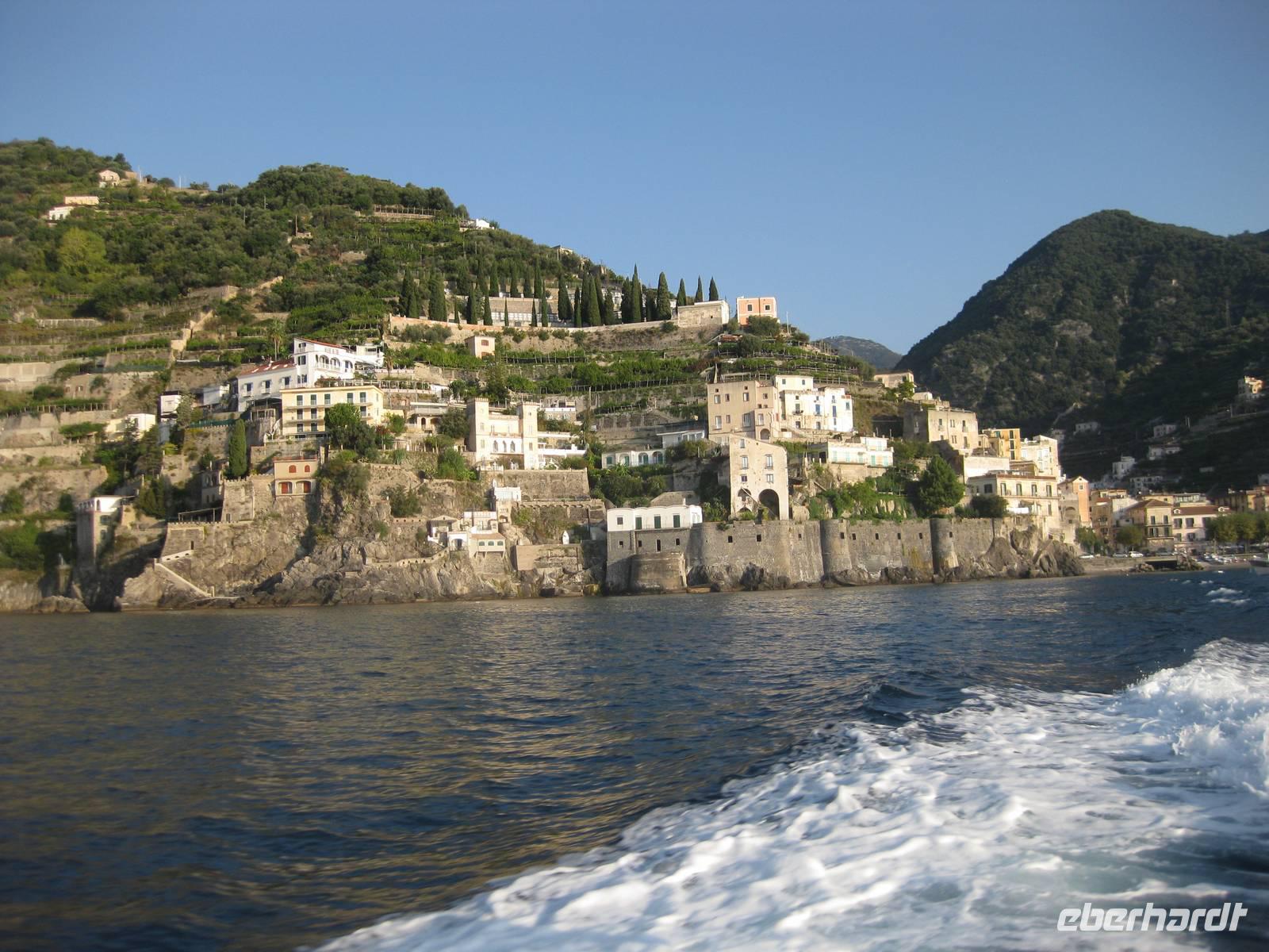 Wir starten in Minori pünktlich mit dem Boot, stoppen noch mal in Amalfi, nehmen noch Gäste auf und fahren dann immer an der Küste entlang bis zur Insel Capri. Die Fahrt mit dem Boot bietet eine interessante Perspektive auf die Amalfiküste. Nach ein einhalb Stunden