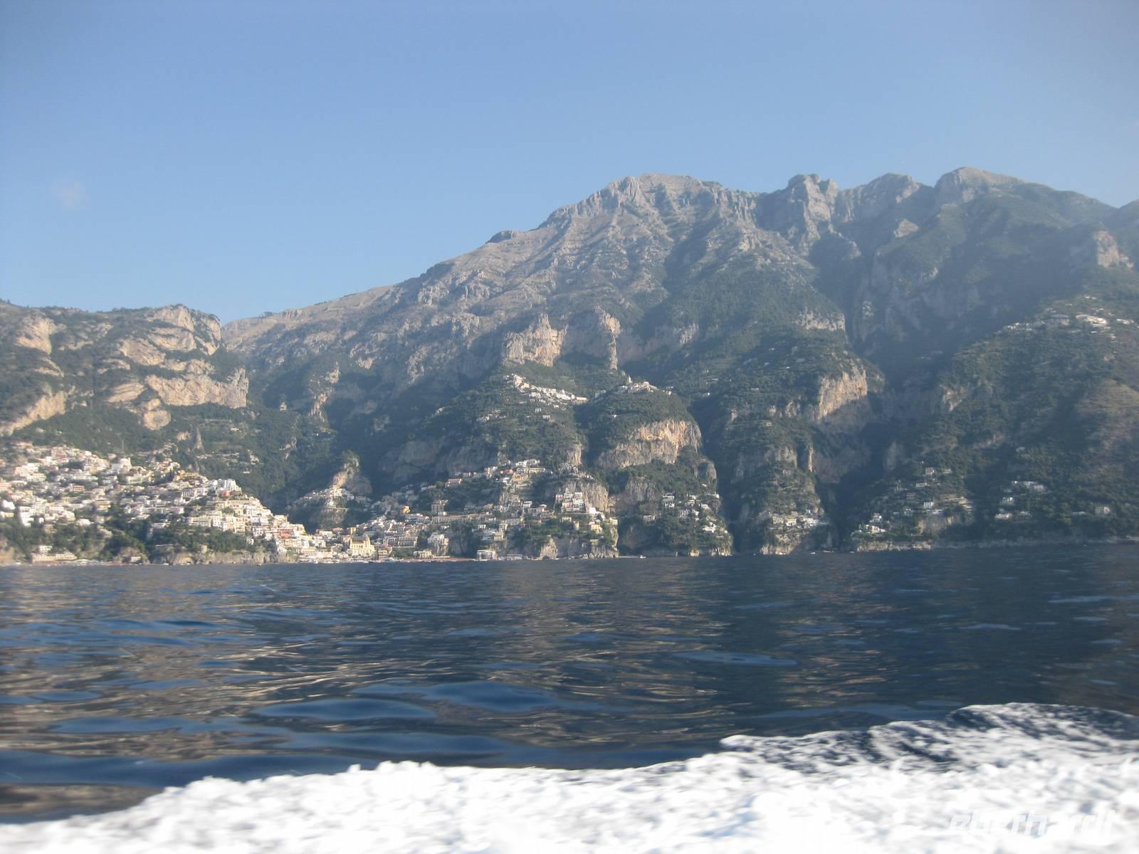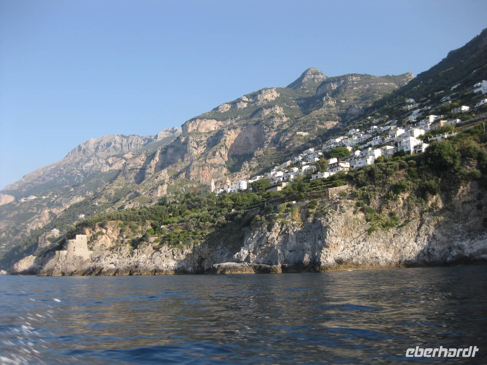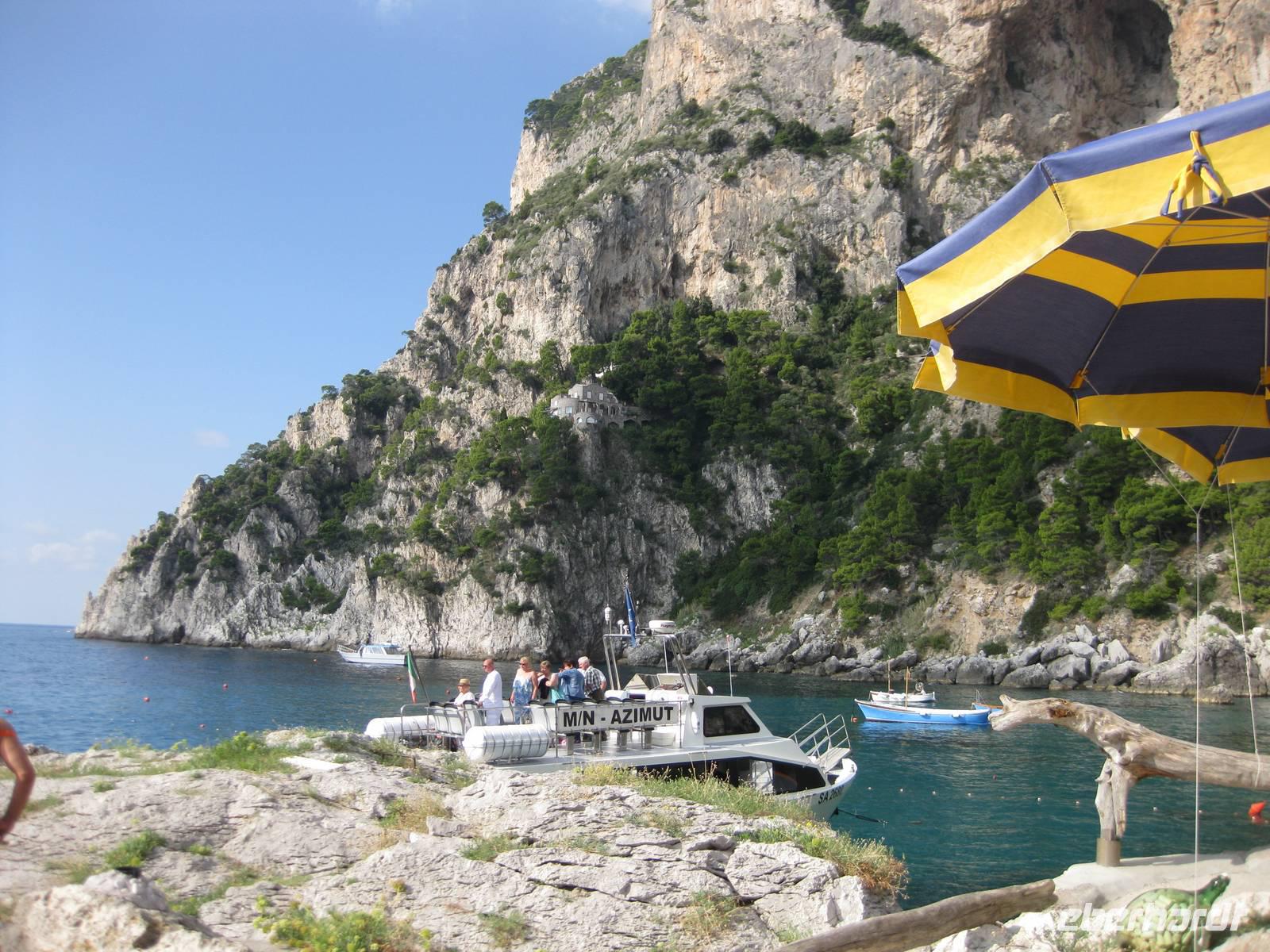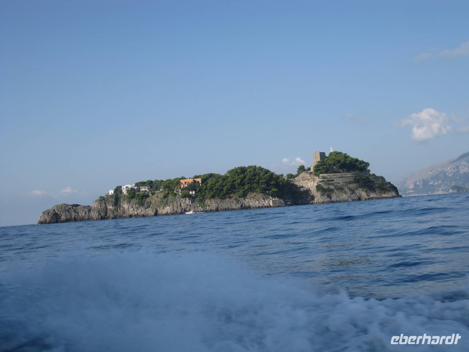 Wir starten in Minori pünktlich mit dem Boot, stoppen noch mal in Amalfi, nehmen noch Gäste auf und fahren dann immer an der Küste entlang bis zur Insel Capri. Die Fahrt mit dem Boot bietet eine interessante Perspektive auf die Amalfiküste. Nach ein einhalb Stunden