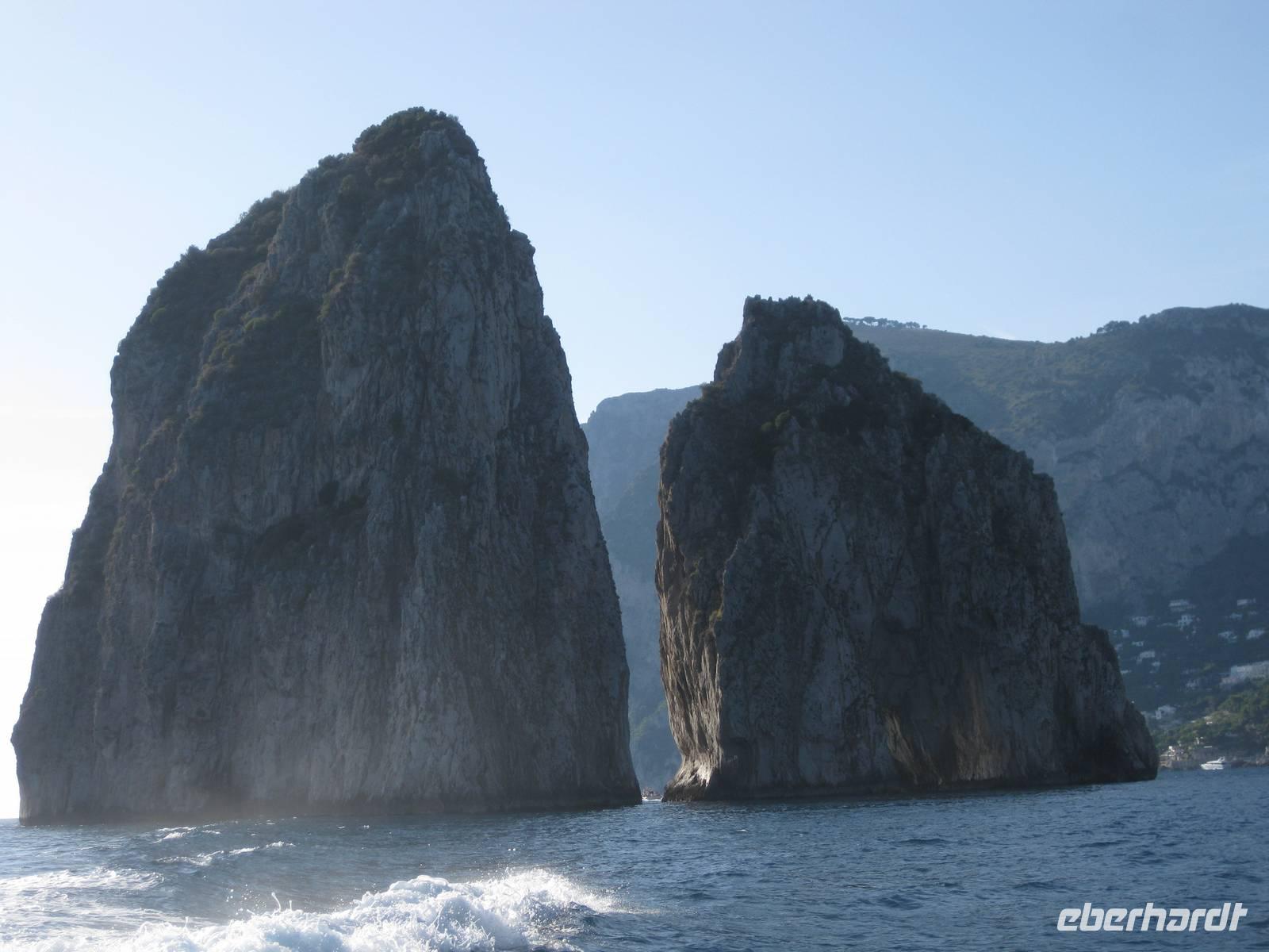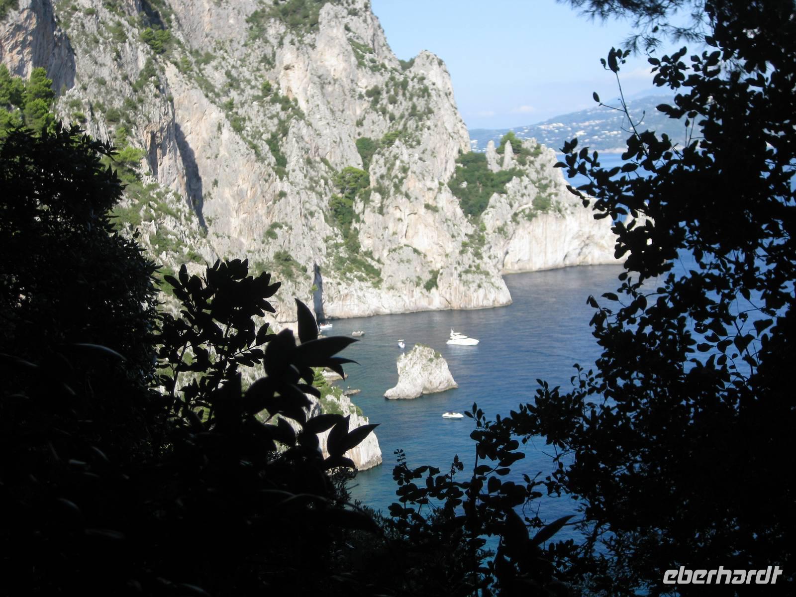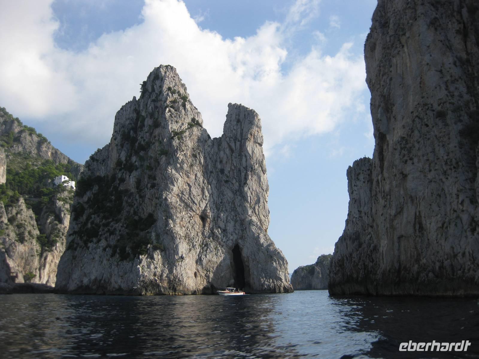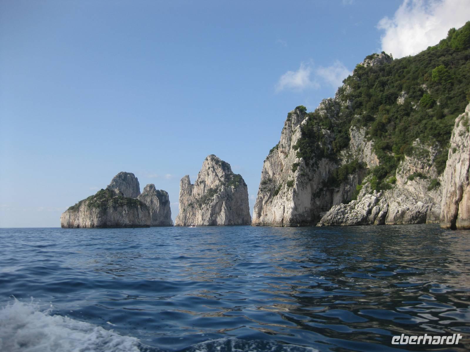Fahrt erreichen wir die Ostküste von Capri. Der Reiseleiter auf dem Boot gibt ein paar Erklärungen und wir fahren auch ganz dicht zu den Höhlen, die es auf Capri sehr zahlreich gibt, heran. Wir fahren unmittelbar an den berühmten Faraglioni-Felsen vorbei, bei einem sogar durch das Felsloch hindurch. Das soll Glück bringen. Dann legen wir in Marina Piccolo an der Südküste Capris an. Hier ist es nicht ganz so überlaufen wie in Marina Grande.