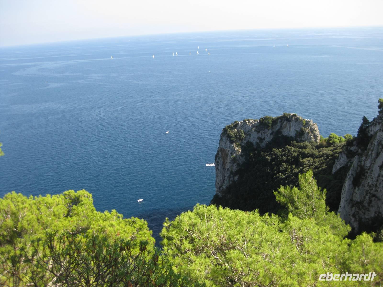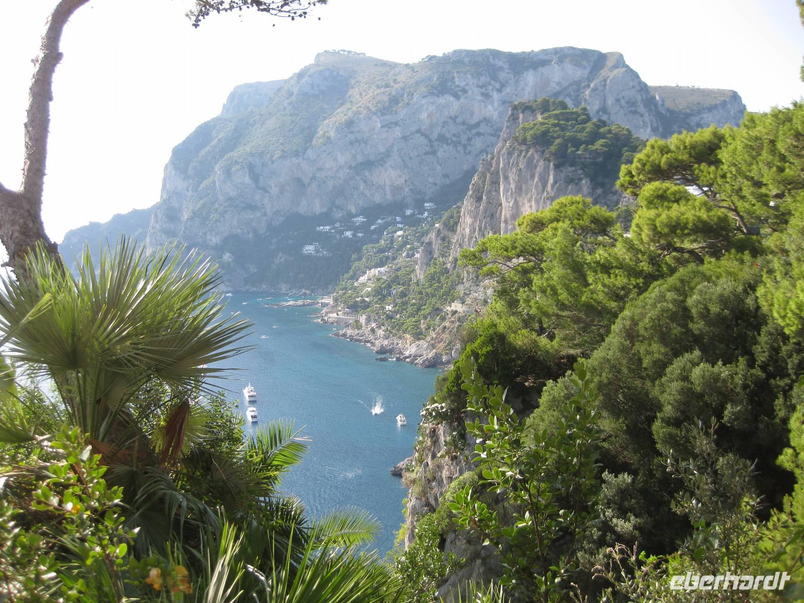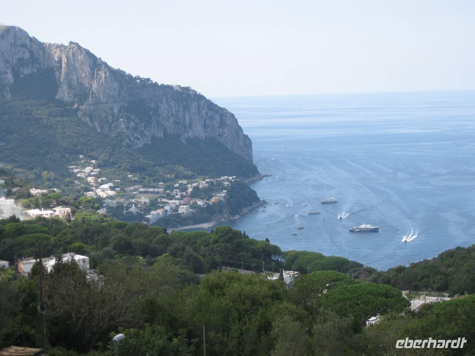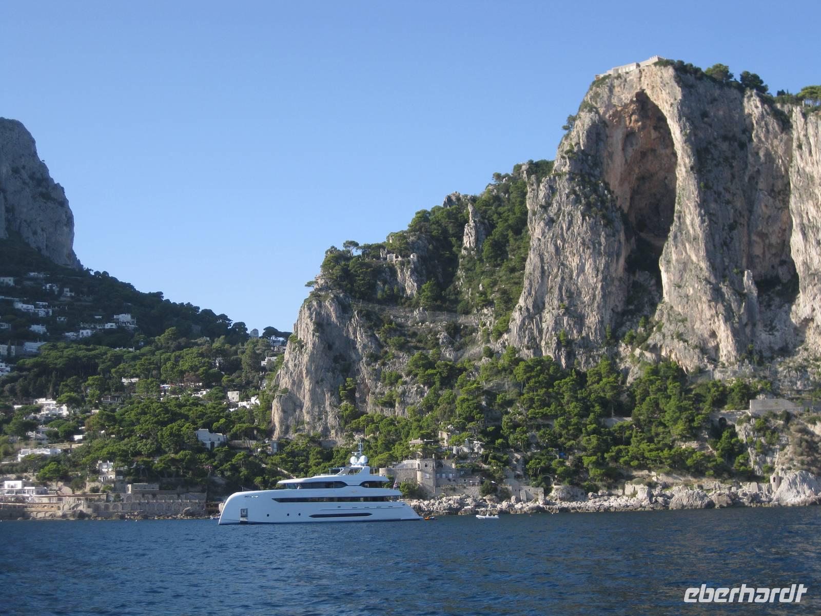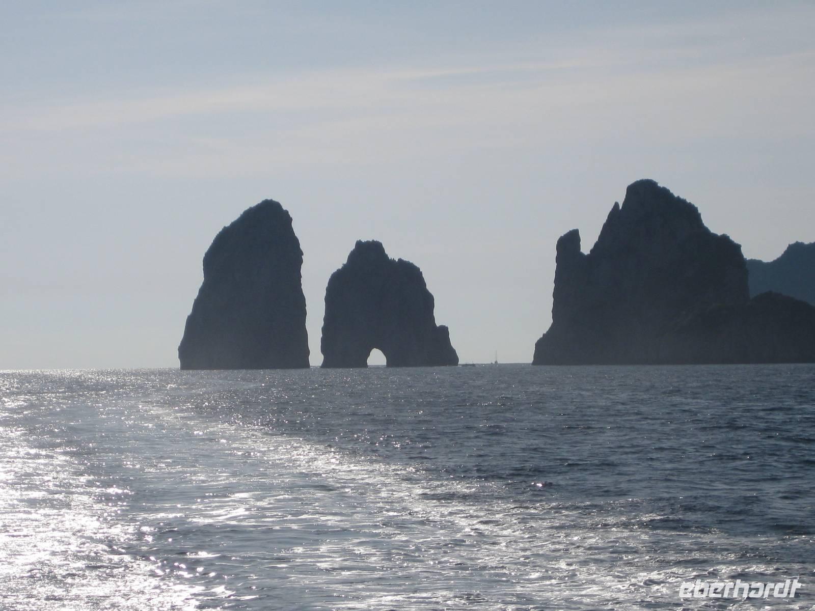 Fahrt erreichen wir die Ostküste von Capri. Der Reiseleiter auf dem Boot gibt ein paar Erklärungen und wir fahren auch ganz dicht zu den Höhlen, die es auf Capri sehr zahlreich gibt, heran. Wir fahren unmittelbar an den berühmten Faraglioni-Felsen vorbei, bei einem sogar durch das Felsloch hindurch. Das soll Glück bringen. Dann legen wir in Marina Piccolo an der Südküste Capris an. Hier ist es nicht ganz so überlaufen wie in Marina Grande.