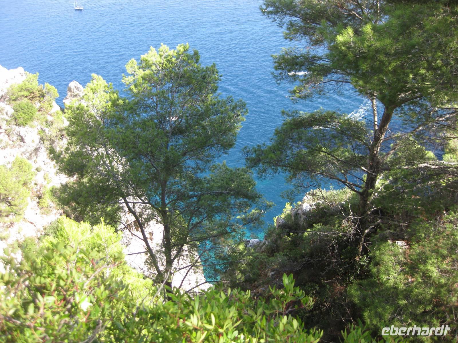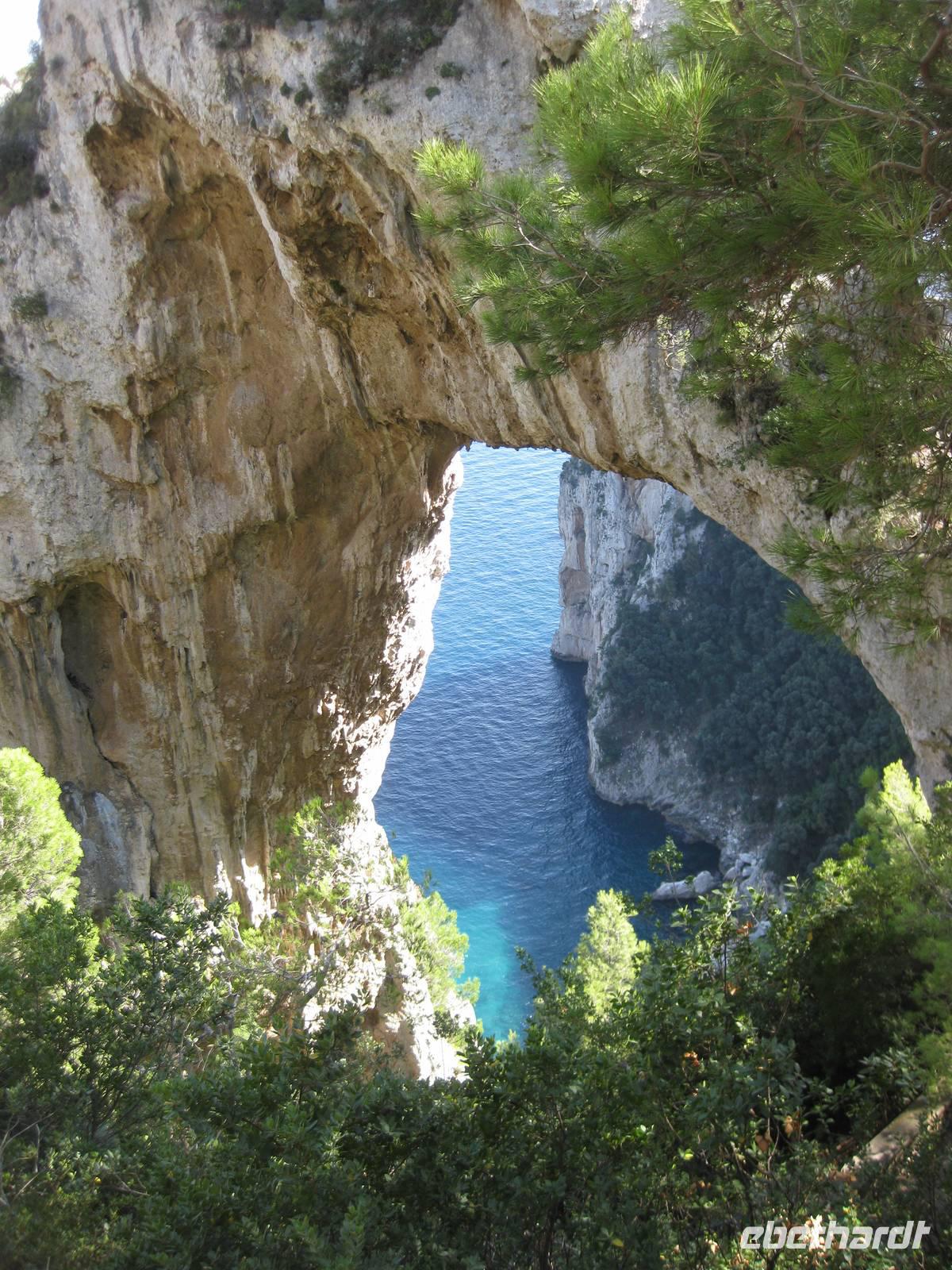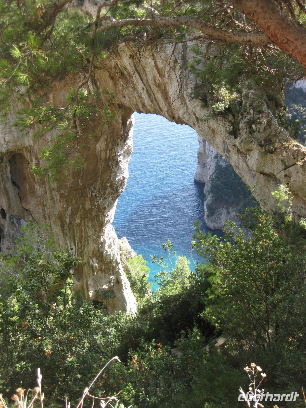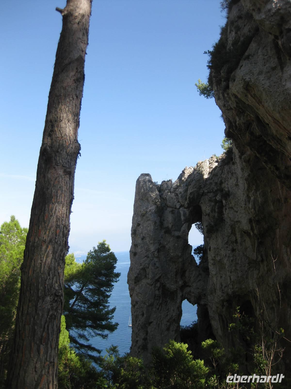 Fahrt erreichen wir die Ostküste von Capri. Der Reiseleiter auf dem Boot gibt ein paar Erklärungen und wir fahren auch ganz dicht zu den Höhlen, die es auf Capri sehr zahlreich gibt, heran. Wir fahren unmittelbar an den berühmten Faraglioni-Felsen vorbei, bei einem sogar durch das Felsloch hindurch. Das soll Glück bringen. Dann legen wir in Marina Piccolo an der Südküste Capris an. Hier ist es nicht ganz so überlaufen wie in Marina Grande.