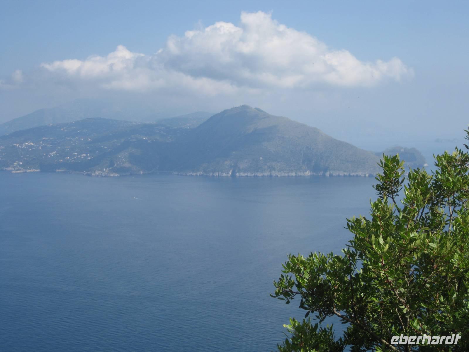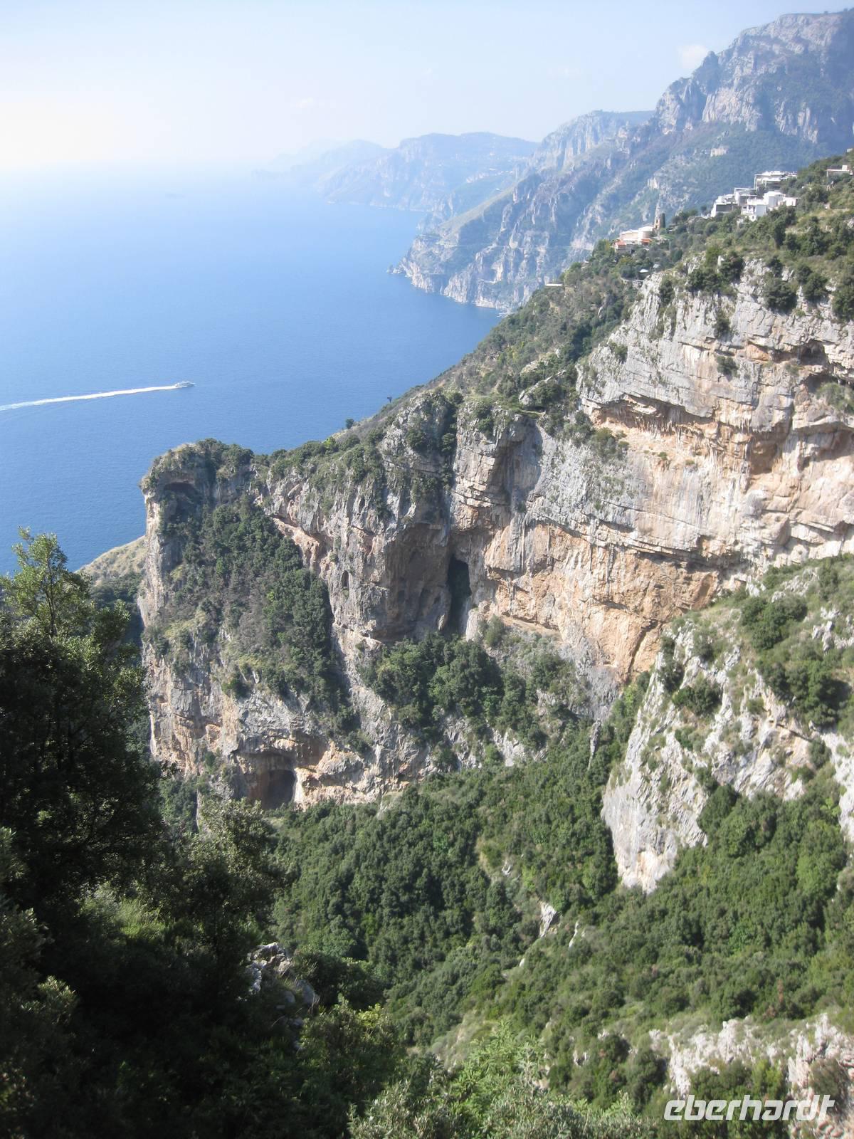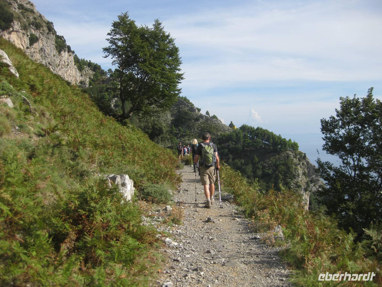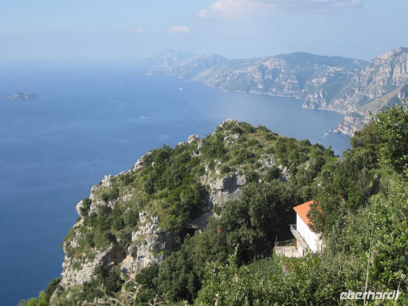 Hier in Bomerano beginnt der Wanderweg und führt uns bis nach Positano. Der Weg, manchmal auch nur ein schmaler Pfad, ist relativ eben und führt uns durch eine ursprünglich mediterrane Landschaft, Küstenwälder, an Höhlen vorbei und bietet traumhafte Ausblicke auf das Meer und die Küste. Immer wieder bleiben wir stehen, bewundern die Pflanzenwelt oder Annette erklärt uns die Landschaft oder wir genießen einfach die tollen Ausblicke. In Nocelle, einem kleinen Dorf, treffen wir am Wegesrand auf ein kleines rustikales, rundum offenes "Restaurant", in dem wir unsere Mittagsrast machen. Es wird von einem älteren Paar bewirtschaftet. Sie bereiten ganz frisch Tomaten-Mozarella-Chiabata-Brote, Espresso, Kaffee,