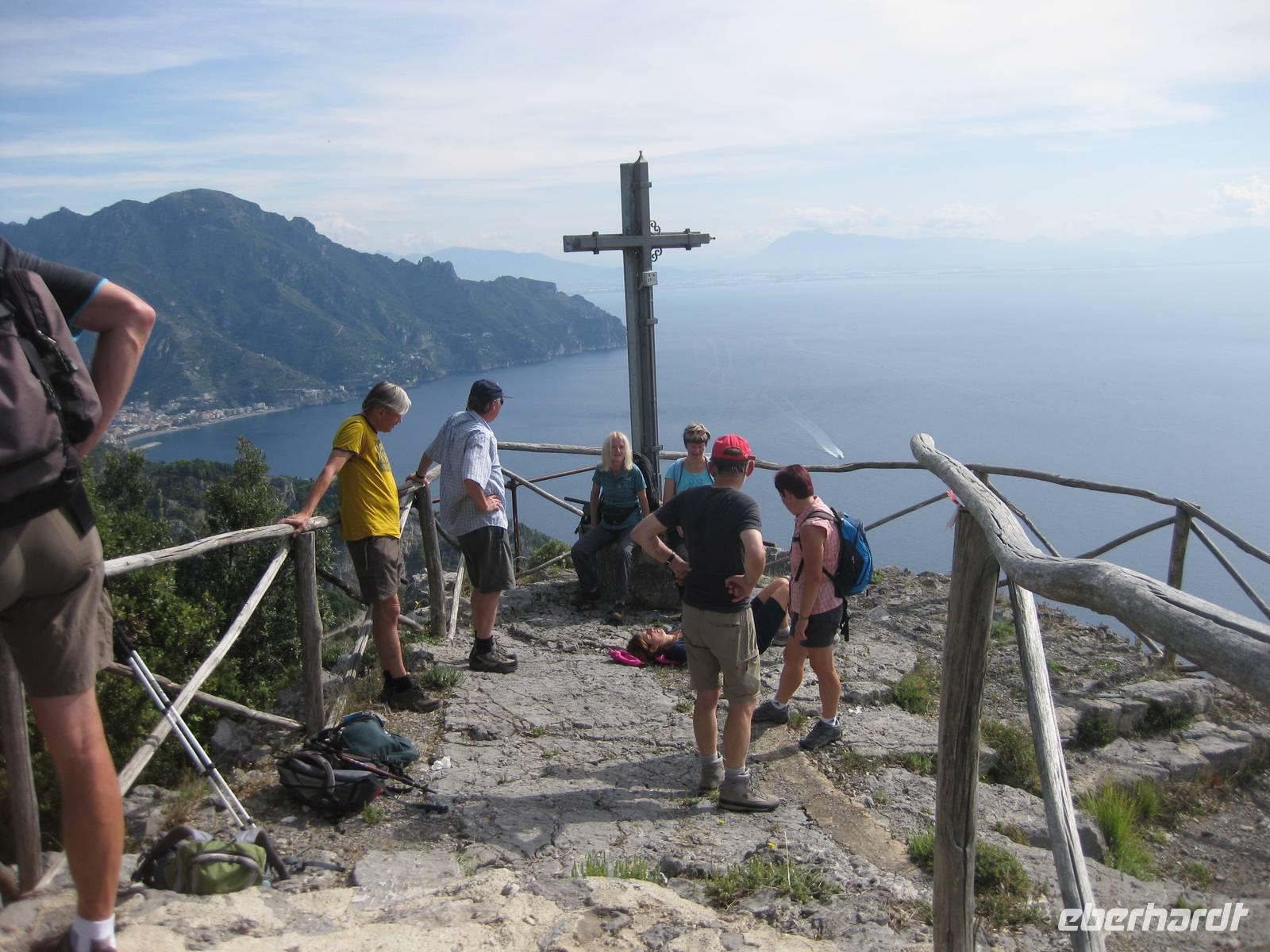 Wir haben noch etwas Zeit bis zum Mittagessen und steigen deshalb noch etwas höher bis zu einem Aussichtpunkt über der Küste. Hier haben wir einen spektakulären Blick über die Amalfiküste. Wir genießen die Aussicht und steigen dann wieder hinab nach Pogerola. In der Trattoria "La Capaninna" ist heute für uns Mittagessen bestellt. Es gibt einen gemischten Salat, Antipasti, Pasta und Wein.