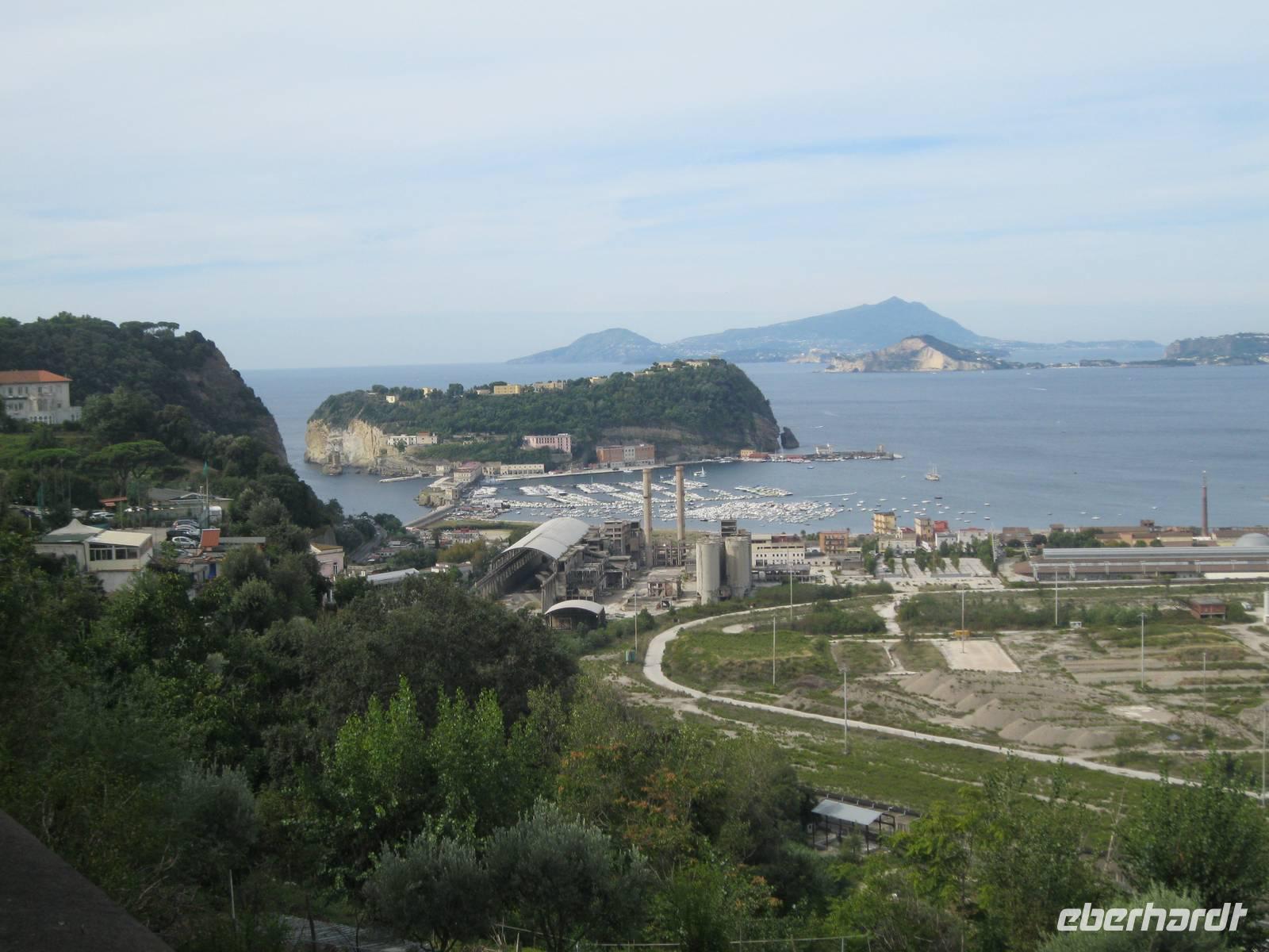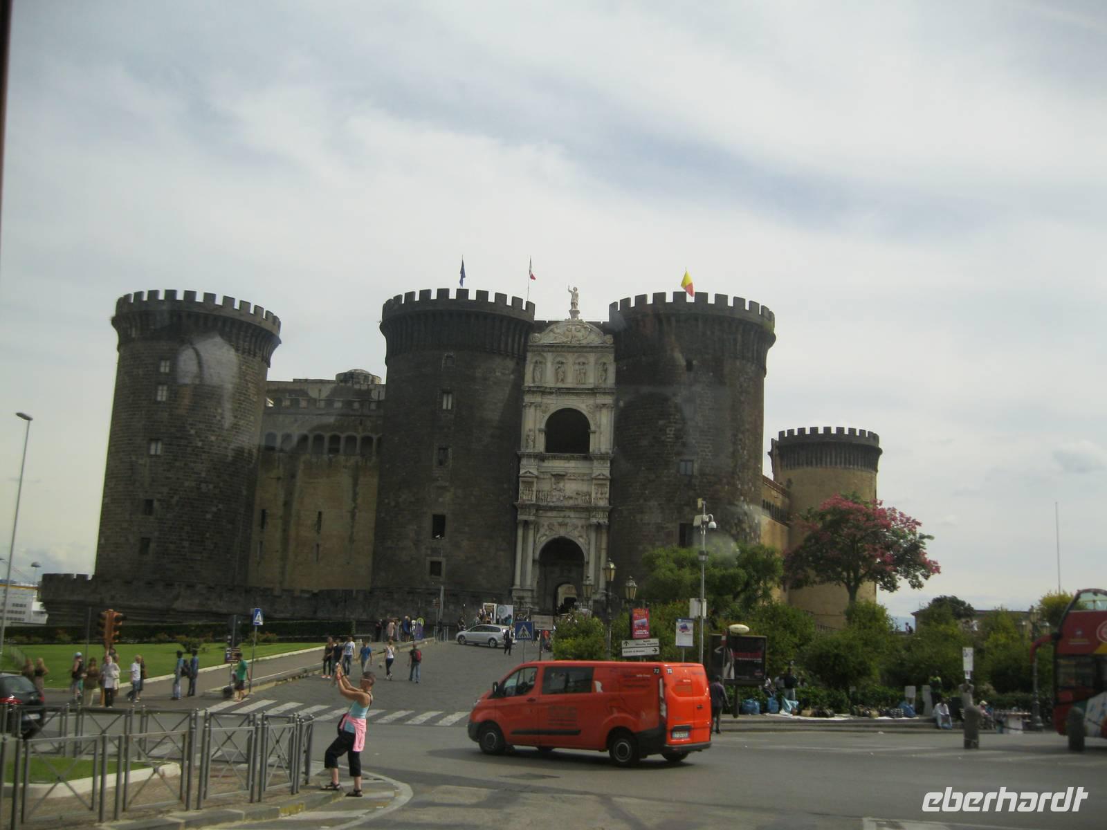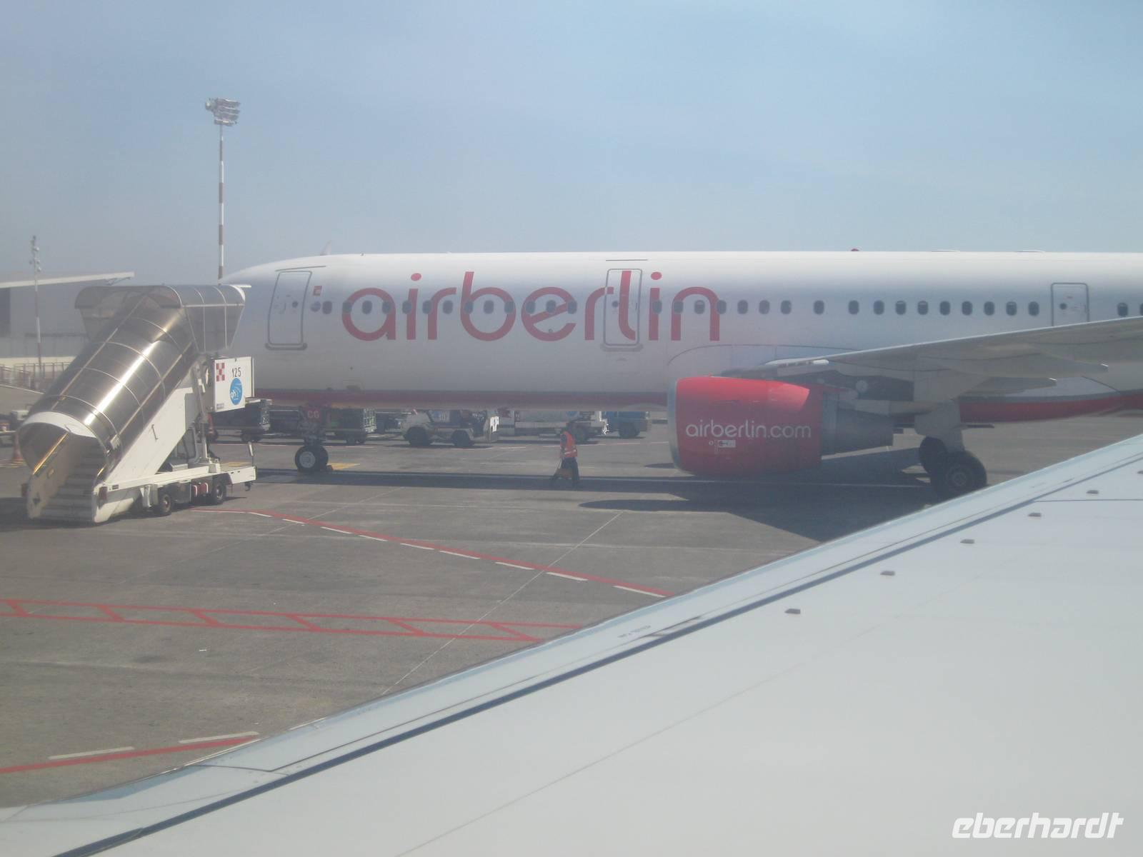 Die Reiseleiterin, Kerstin Veit, kam hinzu und begrüßte die Teilnehmer und kontrollierte die Namen. Zusammen liefen wir zu den Abfertigungsschaltern im Terminal C und passierten die Sicherheitskontrolle. Mit 30 Minuten Verspätung hob endlich unsere Maschine Richtung Neapel ab. Die Reiseleiterin hatte uns vor dem Abflug den Hinweis gegeben, dass die Air Berlin bei der Versorgung der Passagiere mit der "Verpflegung" sehr sparsam sei. Getränke und "Knabbereien" wurden uns aber gereicht. In Neapel wurden wir vom Busfahrer abgeholt und da wir Wandersleute waren, mussten wir noch ca. 500 Meter zum Busparkplatz laufen.