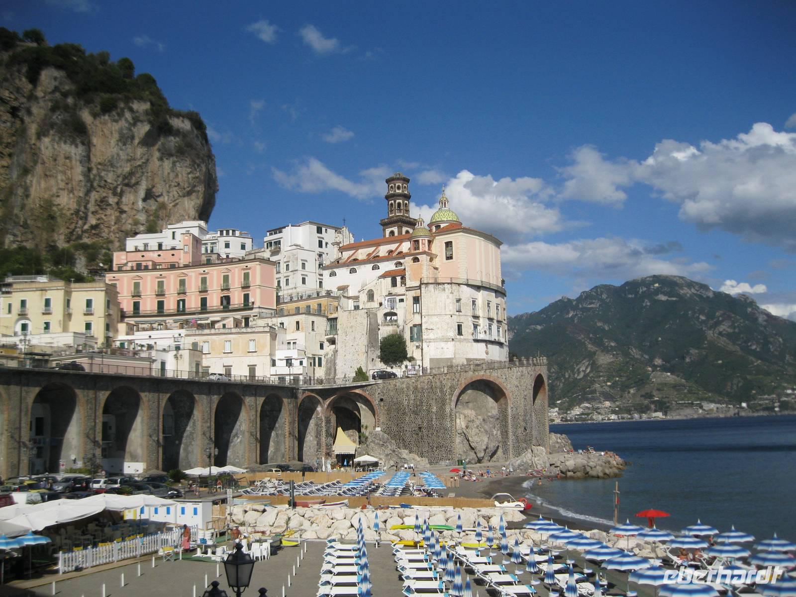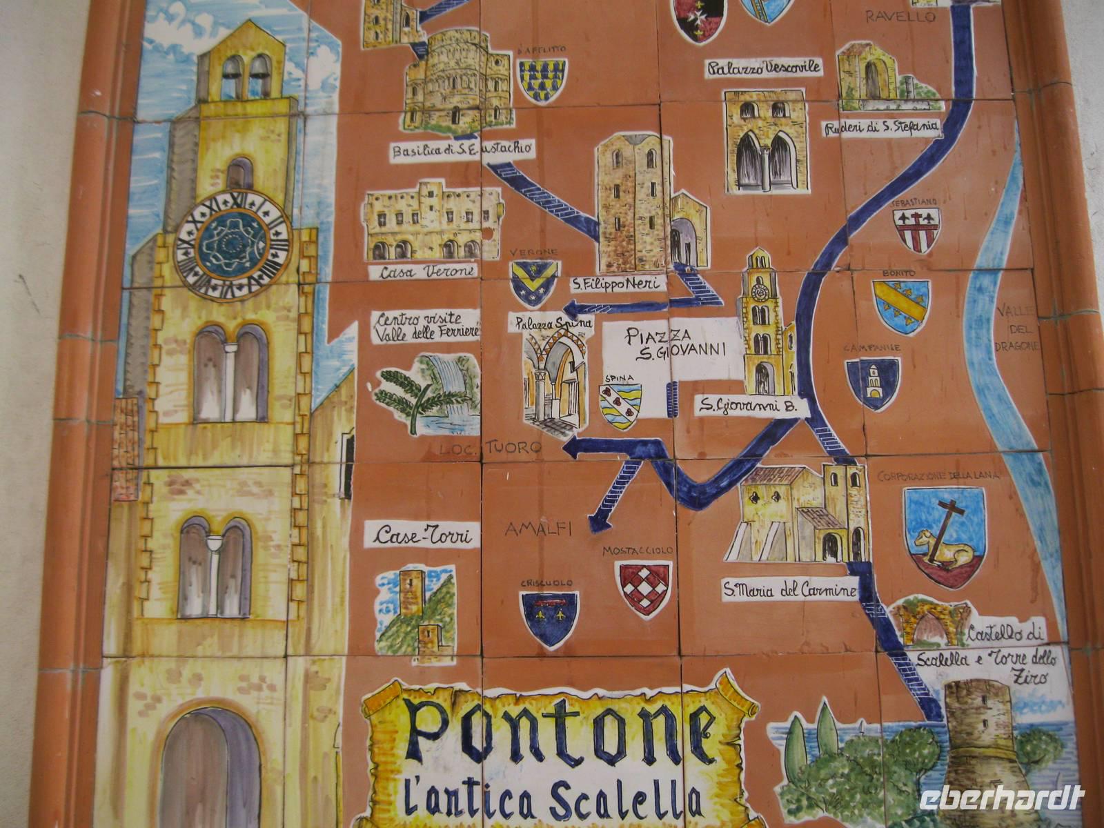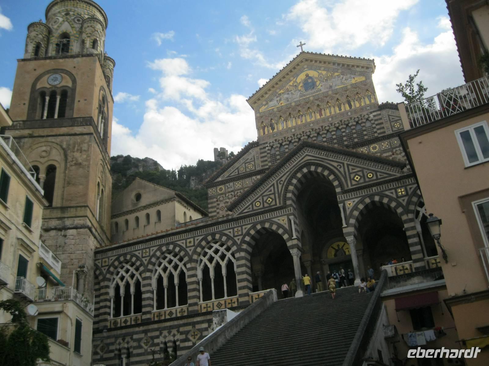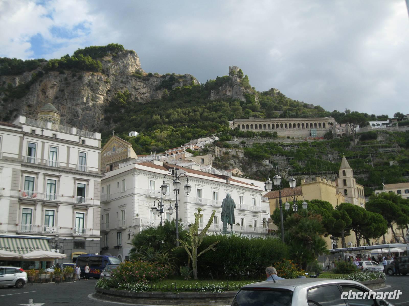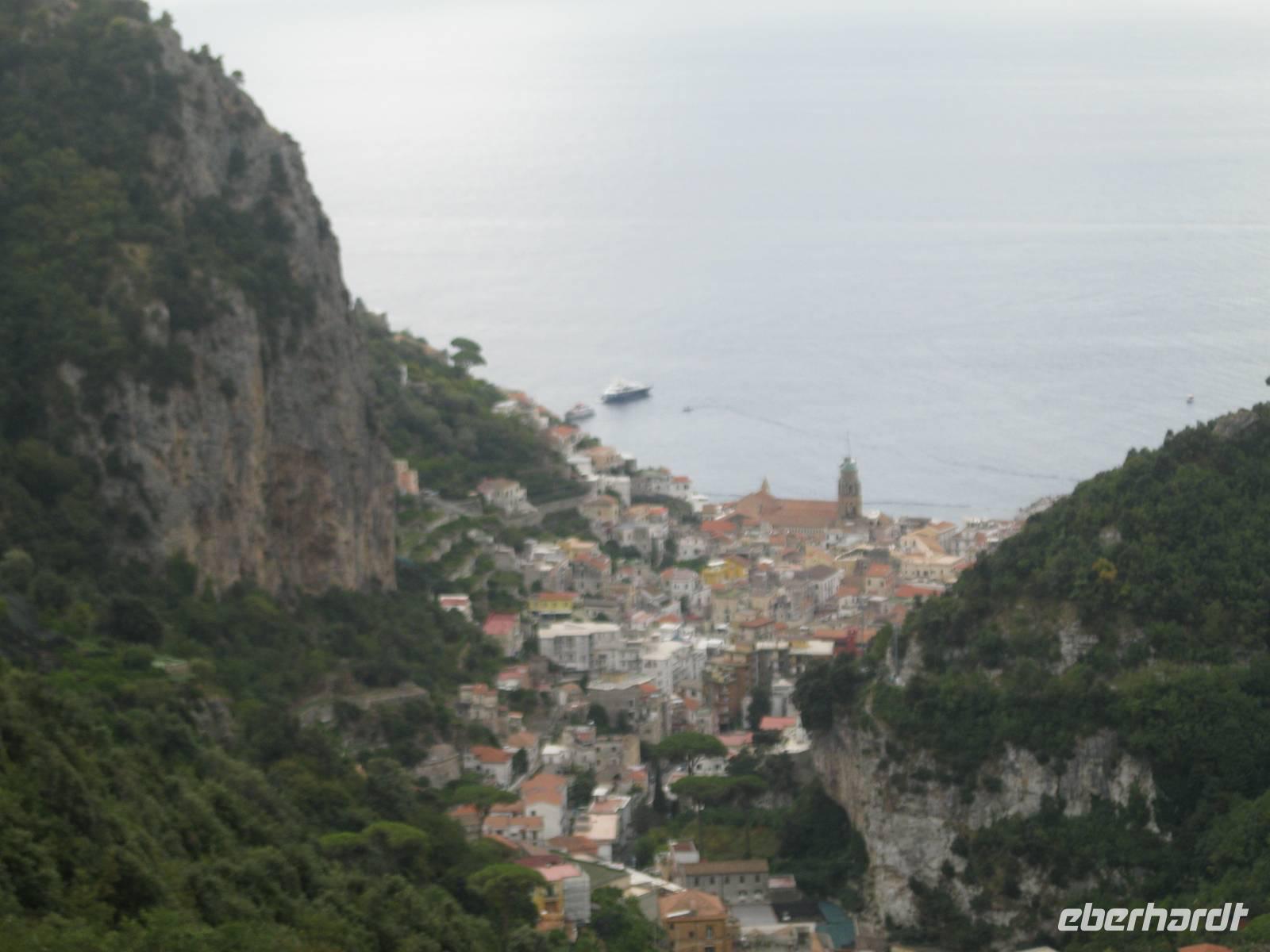 Gegen 09.00 Uhr verließen wir das Hotel in Richtung Hafen und trafen unsere Wanderreiseleiterin Anna. Mit dem Bus fuhren wir ins Zentrum von Amalfi und am Denkmal von Flavio Gioia, dem vermeintlichen Erfinder des Kompasses, stiegen wir aus. Anna führte uns vom Hafen über den Domplatz, weiter durch die engen Gassen, wo sich die vielen Geschäfte aneinanderreihten, zur Papiermühle. Es wurden uns alle historischen Arbeitsschritte der Papierherstellung vorgeführt. Es gäbe heute noch Aufträge vom Papst für dieses handgeschöpfte Papier. Abschließend stiegen wir auf einem Treppenweg, Richtung Pontone bergan. Unterwegs tranken wir in einer Hazienda Zitronenwasser auf Eis. Lecker! Am Wasserfall (mit der Beschilderung zum Naturschutzgebiet) wurde kurz Rast gemacht. Wir erreichten die Piazza in Pontone und stärkten uns mit Hausmannskost. Teilweise über steile Treppen und Wege passierten wir die Brücke (Ponte) und erreichten wieder Amalfi. Der Domplatz und die Domtreppen luden zum Verweilen ein. Vorher wollten wir den imposanten Dom von innen betrachten und Anna übernahm die Führung. Unsere Wanderschuhe wurden von einigen Leuten belächelt. Trotzdem hatten wir einen schönen ersten Wandertag. Beim Abendessen gaben wir eine Sammelbestellung für Getränke und Speisen auf und regelten auch die Abkassierung. Dieses "System" behielten wir die ganze Woche bei und einigten uns auf ein freundschaftliches DU. Dieses wurde mit einem Feuerwerk besiegelt.